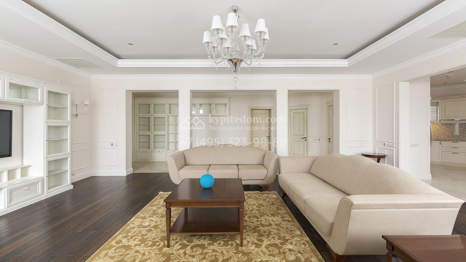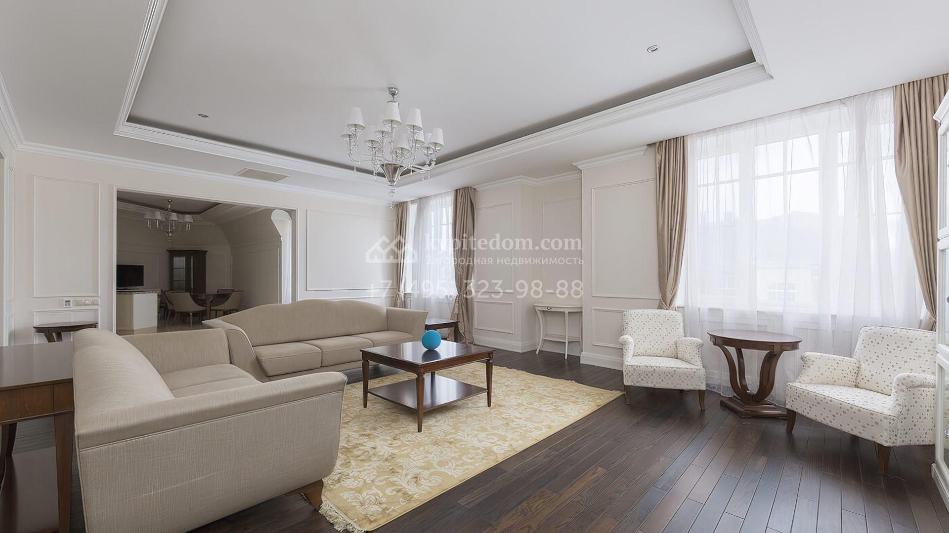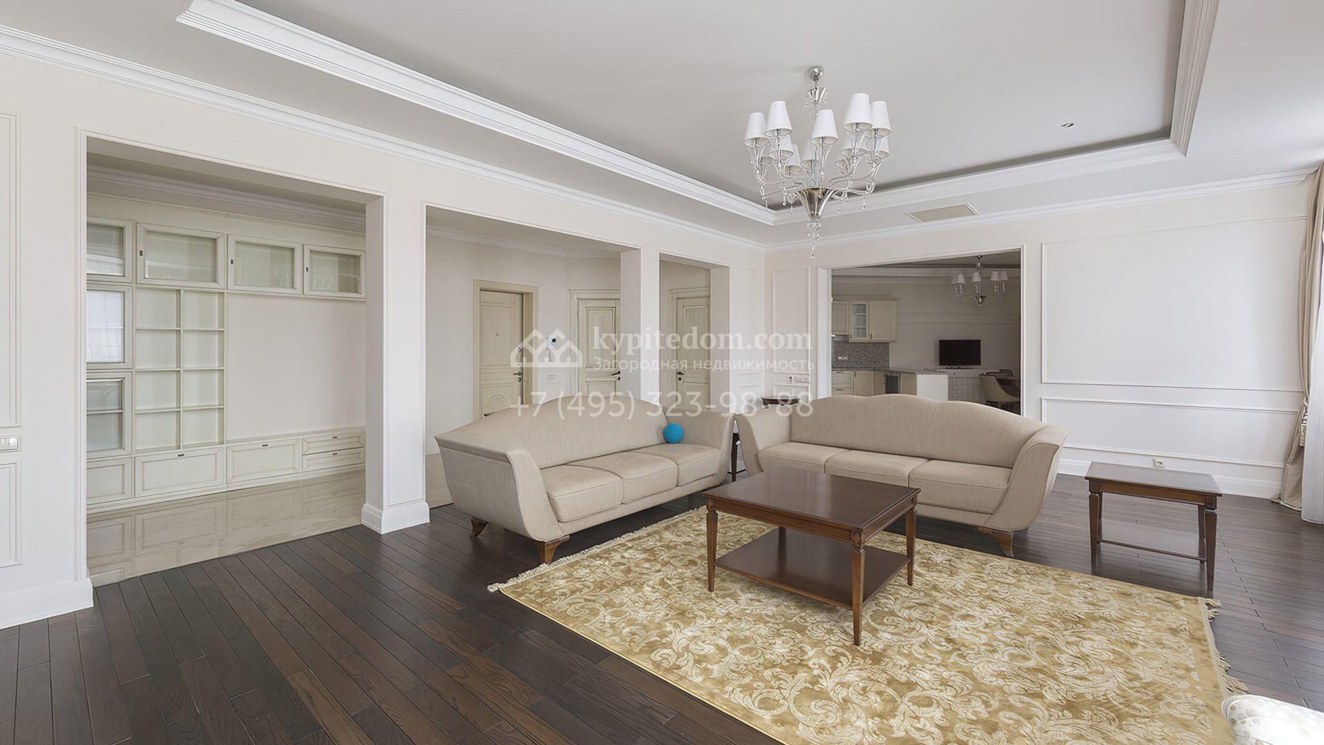Просторные апартаменты с 2-мя спальнями в поселке премиум-класса Agalarov Estate. Апартаменты общей площадью 167,3 м² расположены на 2-м этаже в корпусе 2. Интерьер, выполненный в современном классическом стиле, гармонично сочетает нежные пастельные оттенки с глубокими деревянными акцентами, создавая атмосферу уюта и легкости.