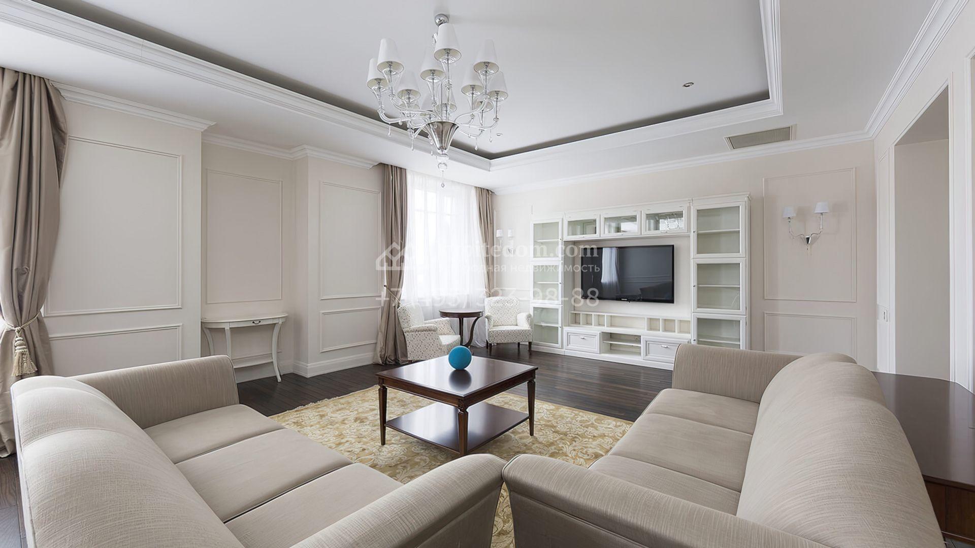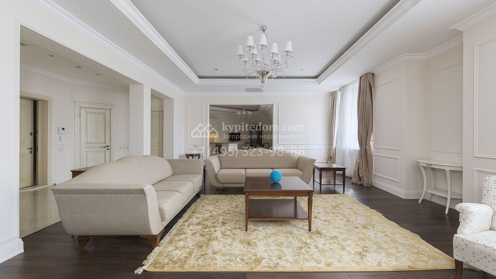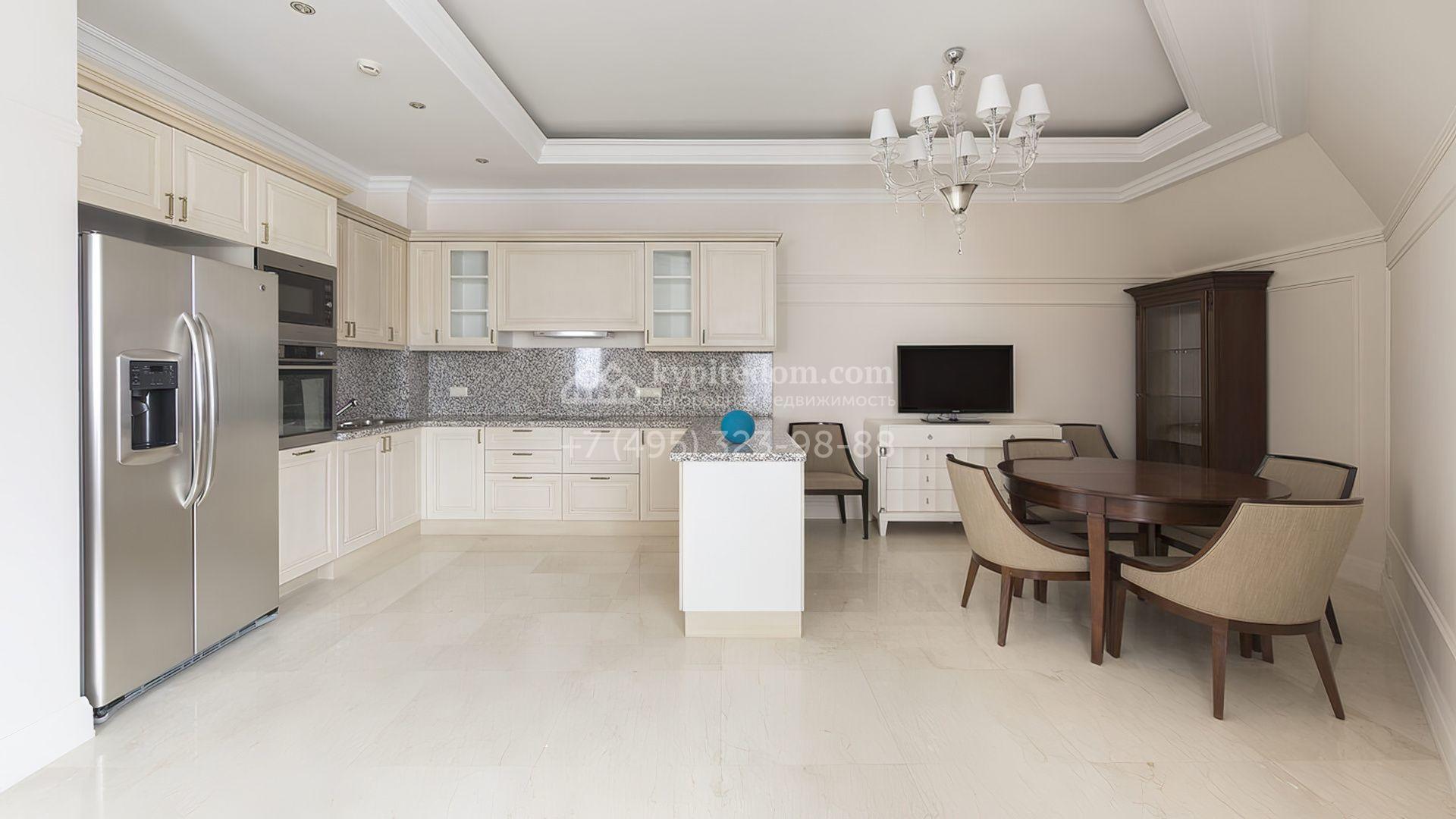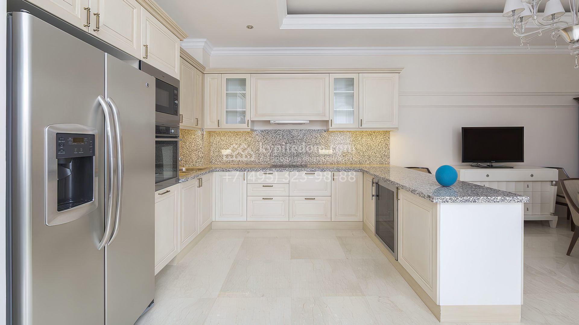 Стены украшены декоративными молдингами, а полы отделаны паркетной доской и керамогранитом, придавая пространству завершенный вид. Мебель и техника представлены от ведущих производителей Италии и США. Удобная планировка включает светлую гостиную, кухню-столовую, 2 спальни, гардеробную и 3 санузла.