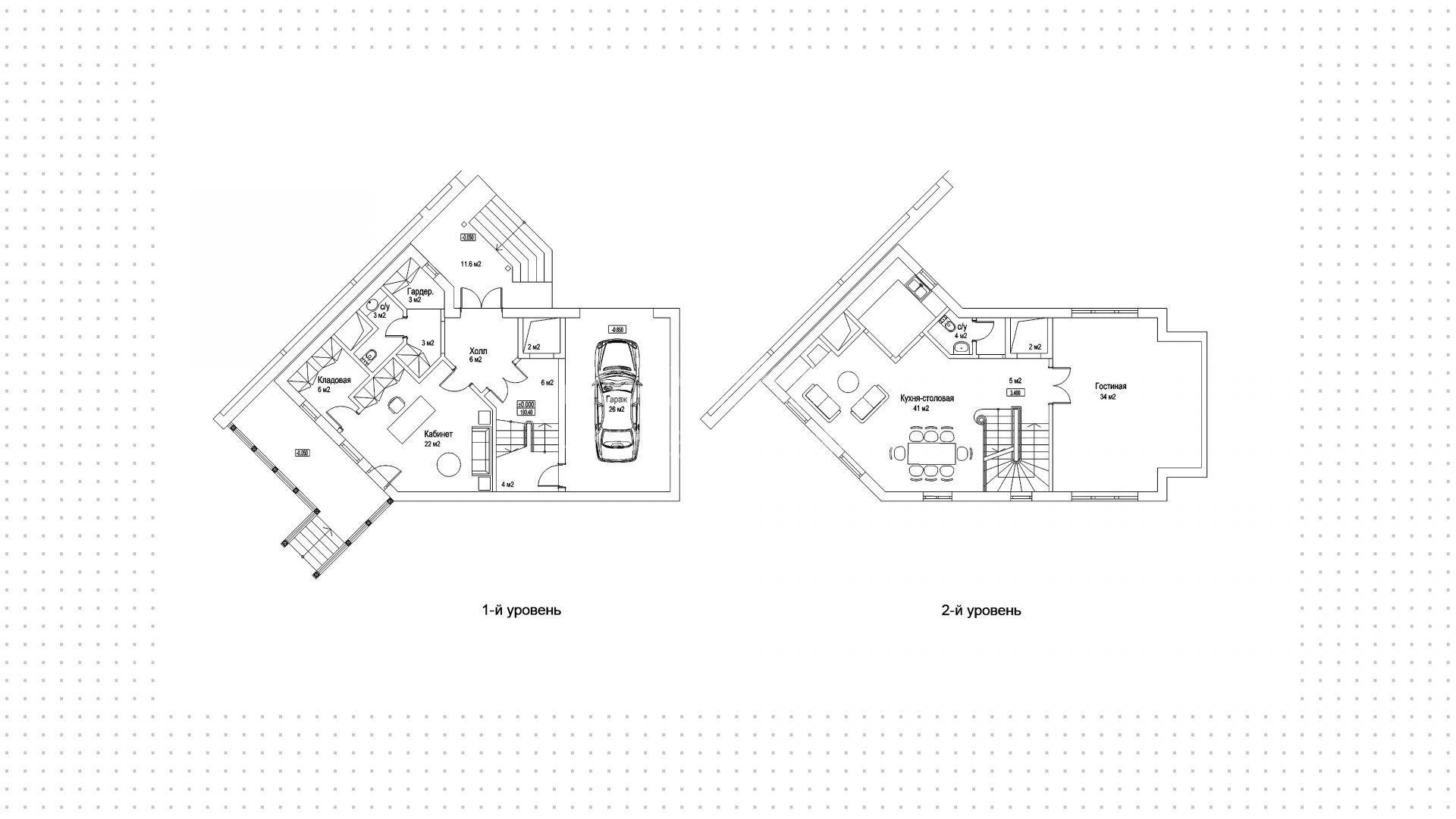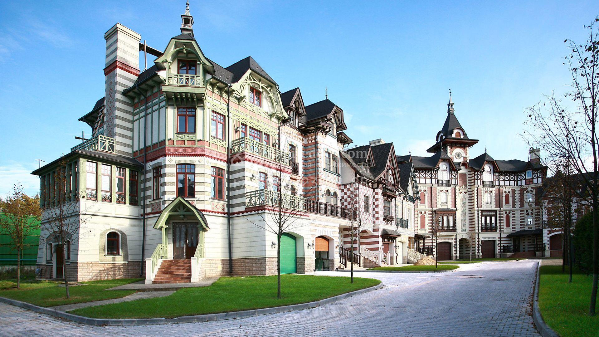 Семейный четырехэтажный таунхаус во фламандском стиле площадью 385 м² без отделки расположен в правой части здания с башенкой. Фасад богато украшен рустовкой, декоративными балками в стиле «фахверк», мозаикой и клинкером. На первом этаже расположен гараж для машины и технические помещения. На втором этаже кухня-столовая и гостиная. Два верхних этажа занимают 4 спальни с санузлами и гардеробными. К таунхаусу примыкает участок 5,7 соток с газоном, где можно разместить зону барбекю.
