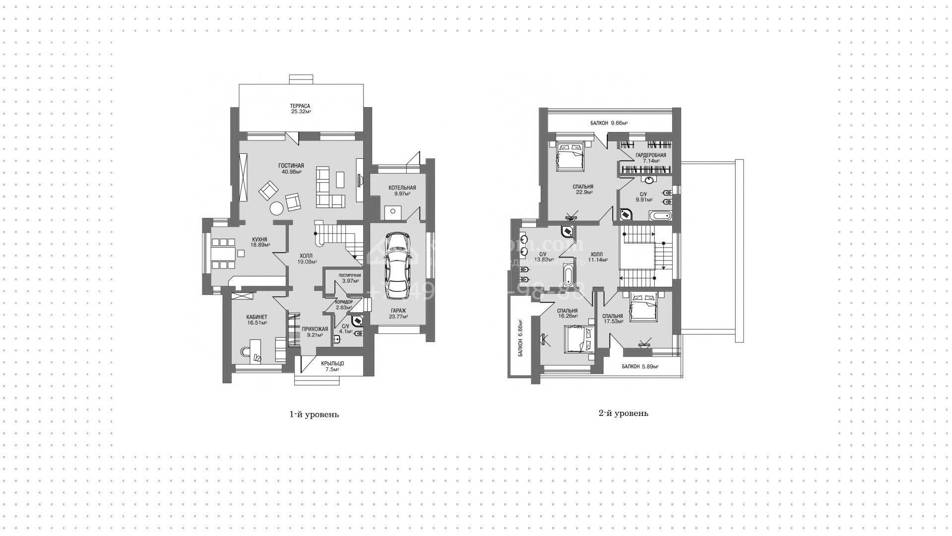 Двухэтажный загородный дом со встроенным гаражом продается без отделки. На первом этаже спланирована гостиная-столовая 42 м² с камином и выходом на террасу, кухня, кабинет и гараж с котельной. На втором этаже 2 спальни с выходами на балконы, санузел и спальня хозяев с санузлом, гардеробной и выходом на балкон. Общая площадь дома 334 м², площадь углового участка 13 соток.