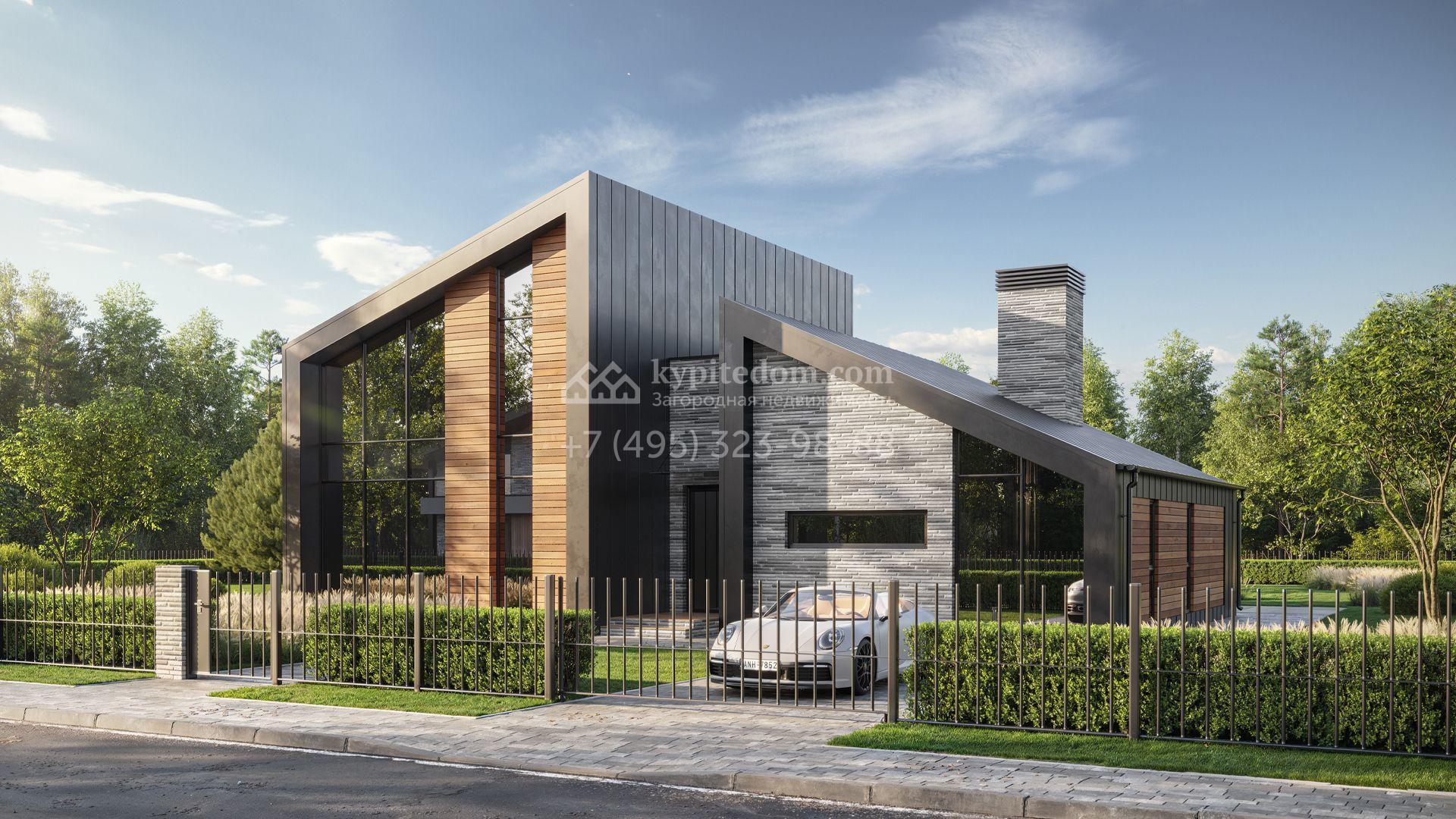 Загородный дом по проекту «Дэнфорд» площадью 248 м² построен на участке 11,6 соток. Фасад двухэтажного здания с асимметричной архитектурой и панорамным остеклением облицован серым камнем и планками с фактурой дерева. Планировка коттеджа включает 3 спальни, кухню-гостиную, сауну, тренажерный зал и террасу с камином. На участке выполнен ландшафтный дизайн, вымощены дорожки и засеян газон.