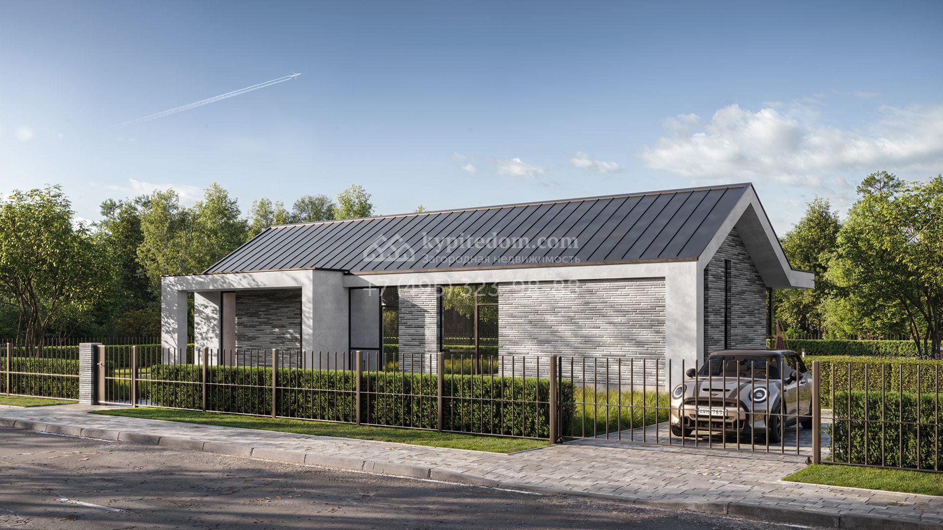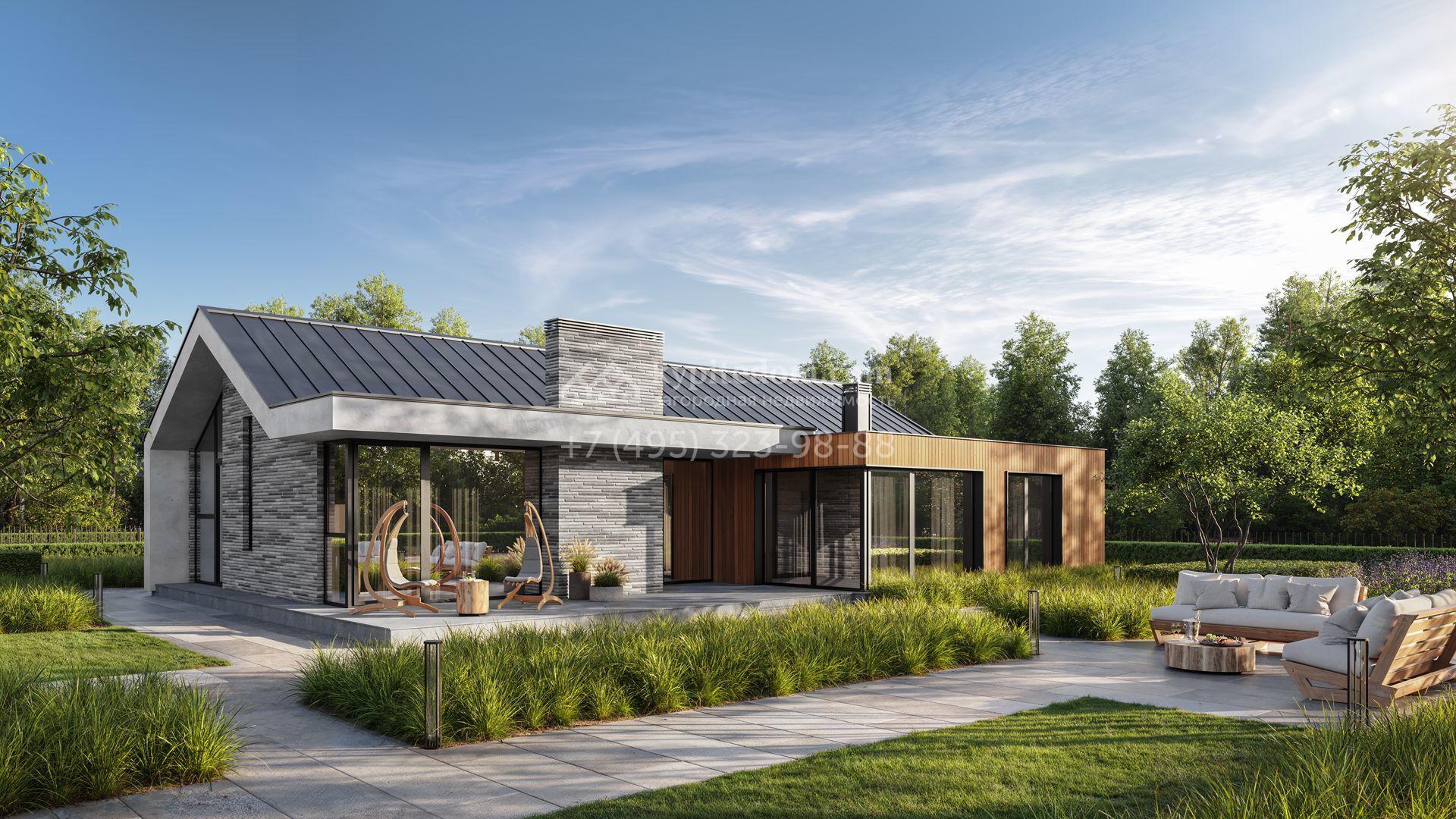 Загородный дом по проекту «Гардиан» площадью 193 м² построен на участке 8,6 соток. Фасад одноэтажного здания с панорамным остеклением облицован серым камнем и планками с фактурой дерева. Планировка коттеджа включает 3 спальни, включая мастер-спальню с кабинетом, гардеробной и санузлом, кухню-гостиную, сауну, тренажерный зал и террасу с камином. На участке выполнен ландшафтный дизайн, вымощены дорожки и засеян газон.