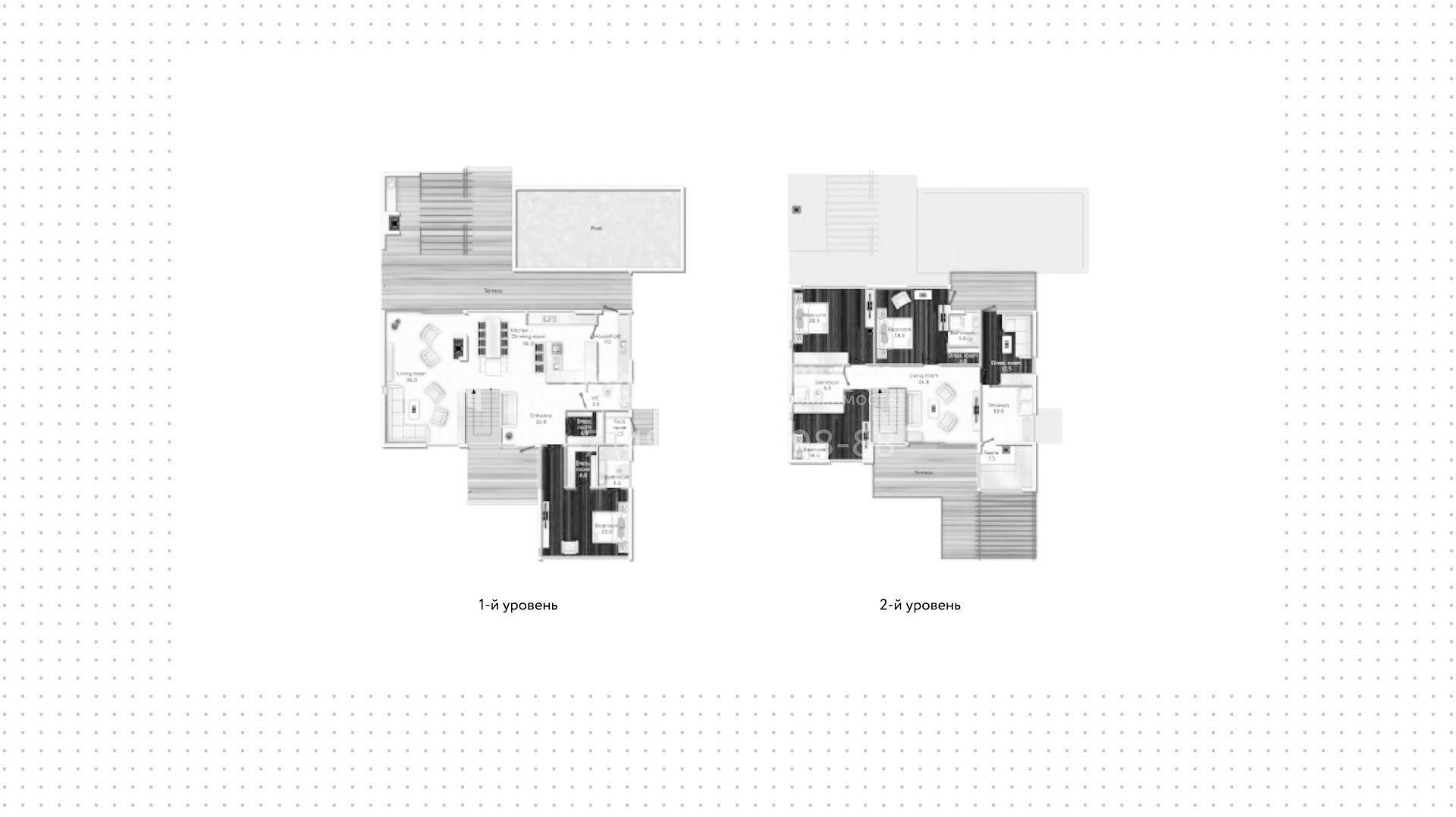 1-й уровень: кухня-гостиная-столовая, котельная, санузел, гардеробная-кладовая, спальня с санузлом и гардеробной, терраса с бассейном.