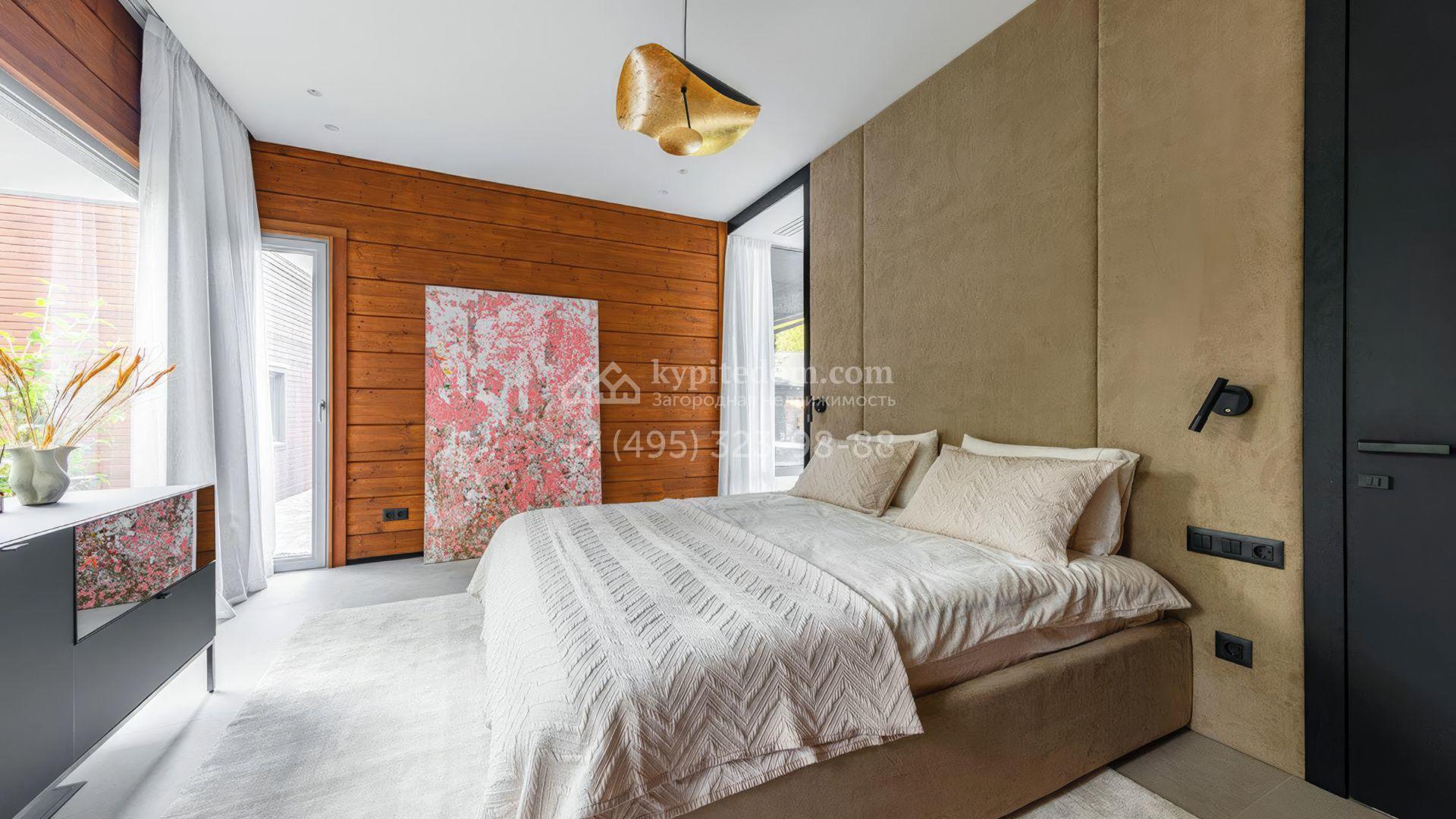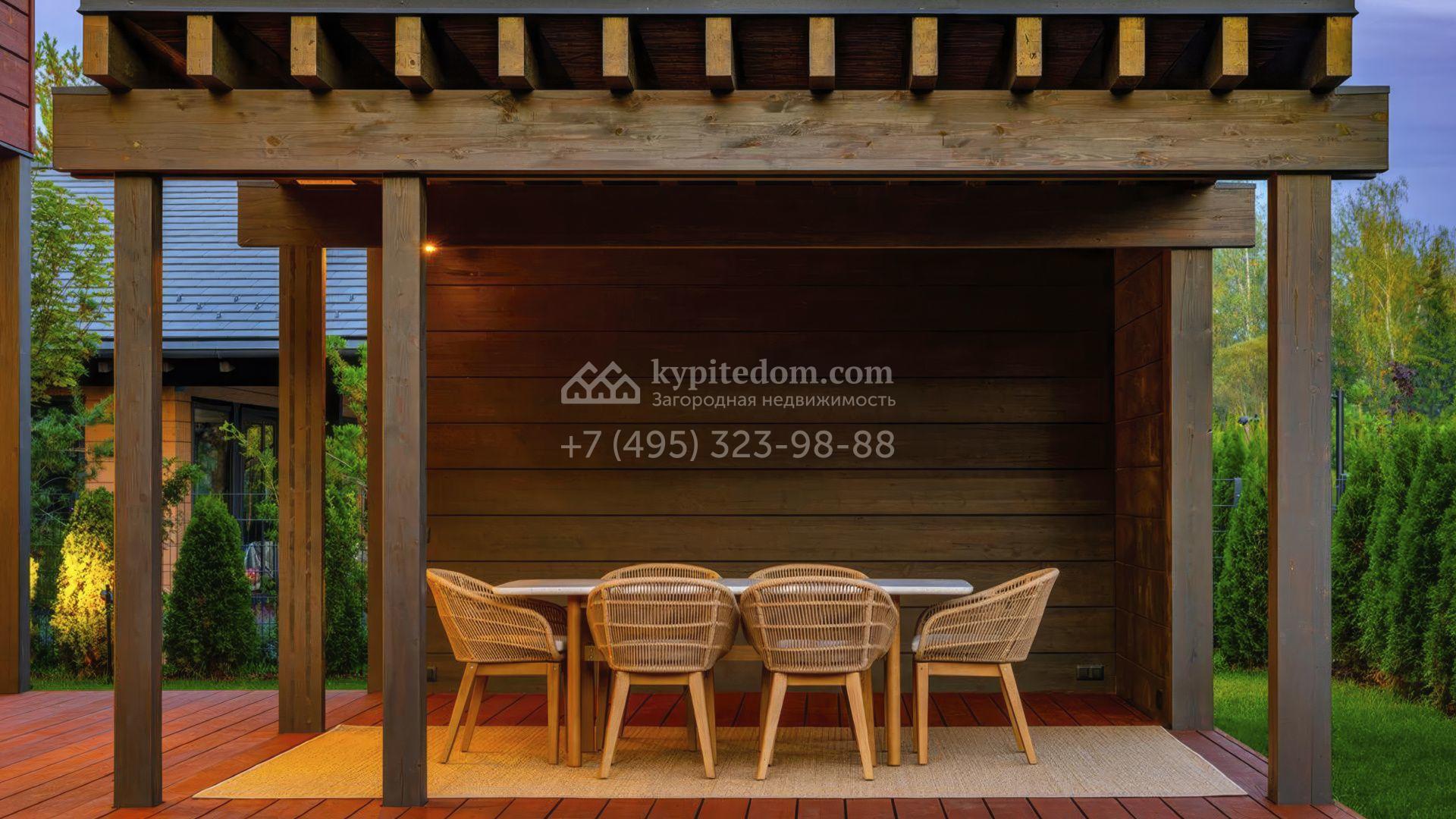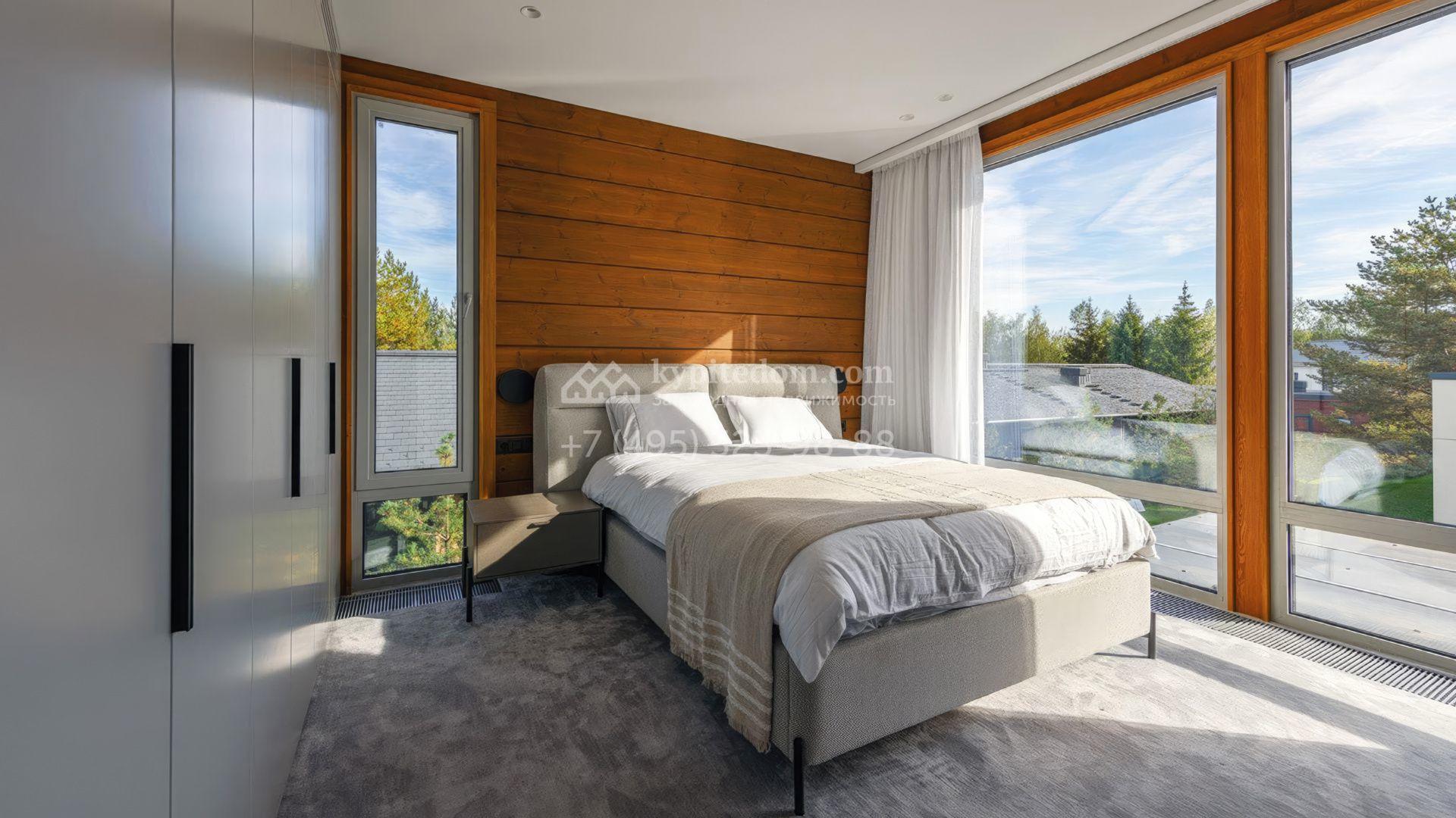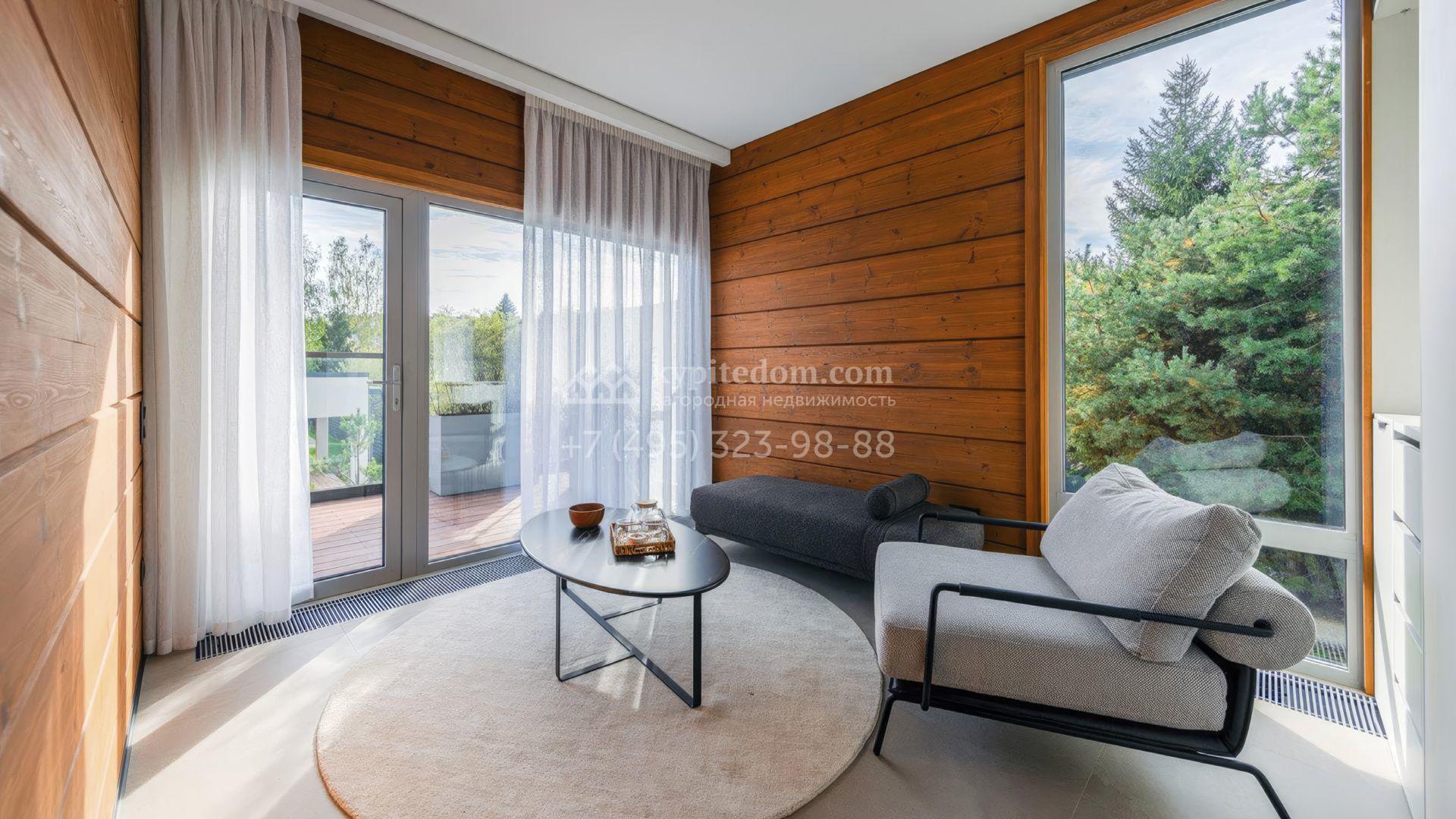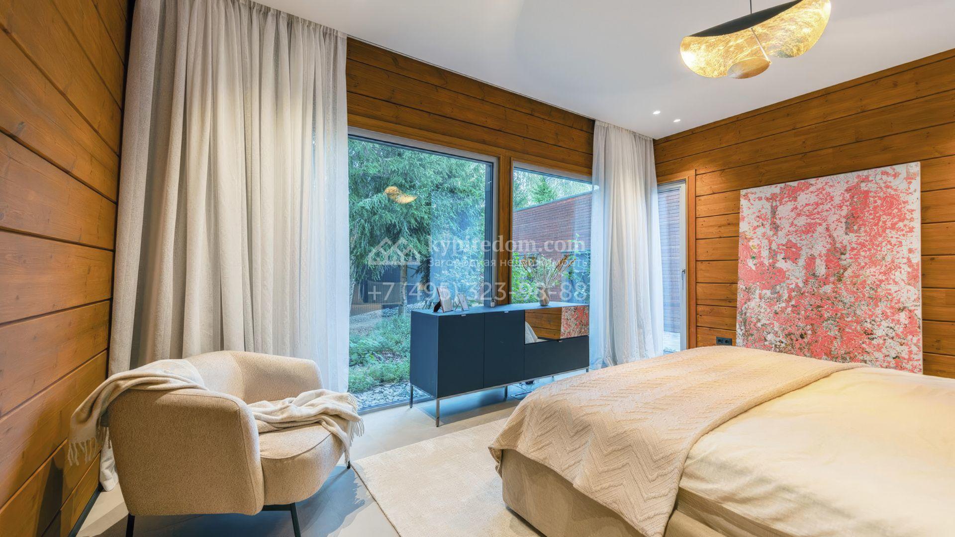 Загородный дом площадью 529 м² расположен на участке 11 соток. Автором концепции выступил финский архитектор Матти Иирамо, интерьерное решение принадлежит итальянскому дизайнеру Фабиано Видусси. Фасад из безусадочного клееного бруса с панорамными окнами Schuco и просторными террасами выглядит сдержанно и выразительно, а подсветка от компании Markevich Lighting подчёркивает линии здания в вечернее время.