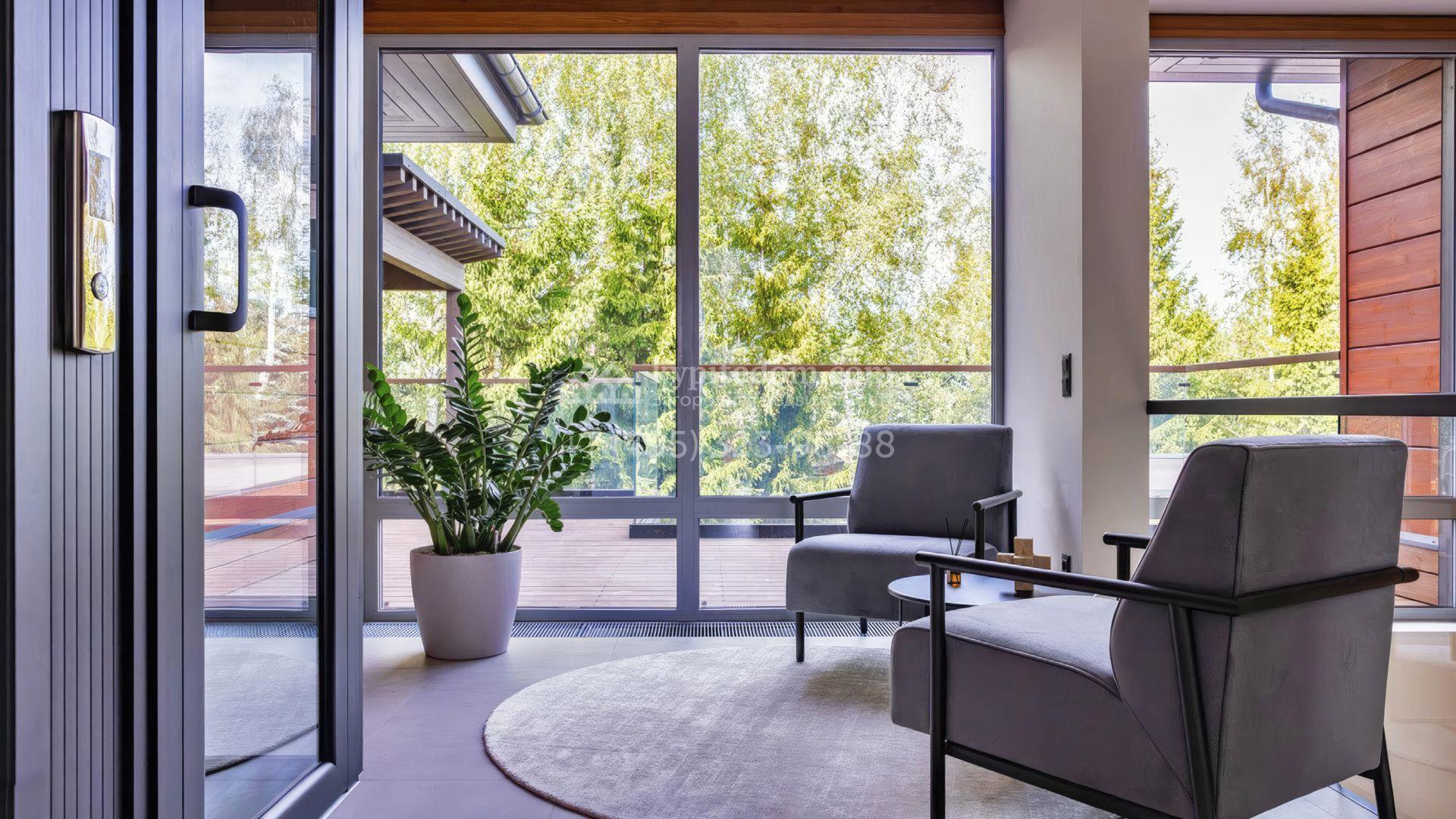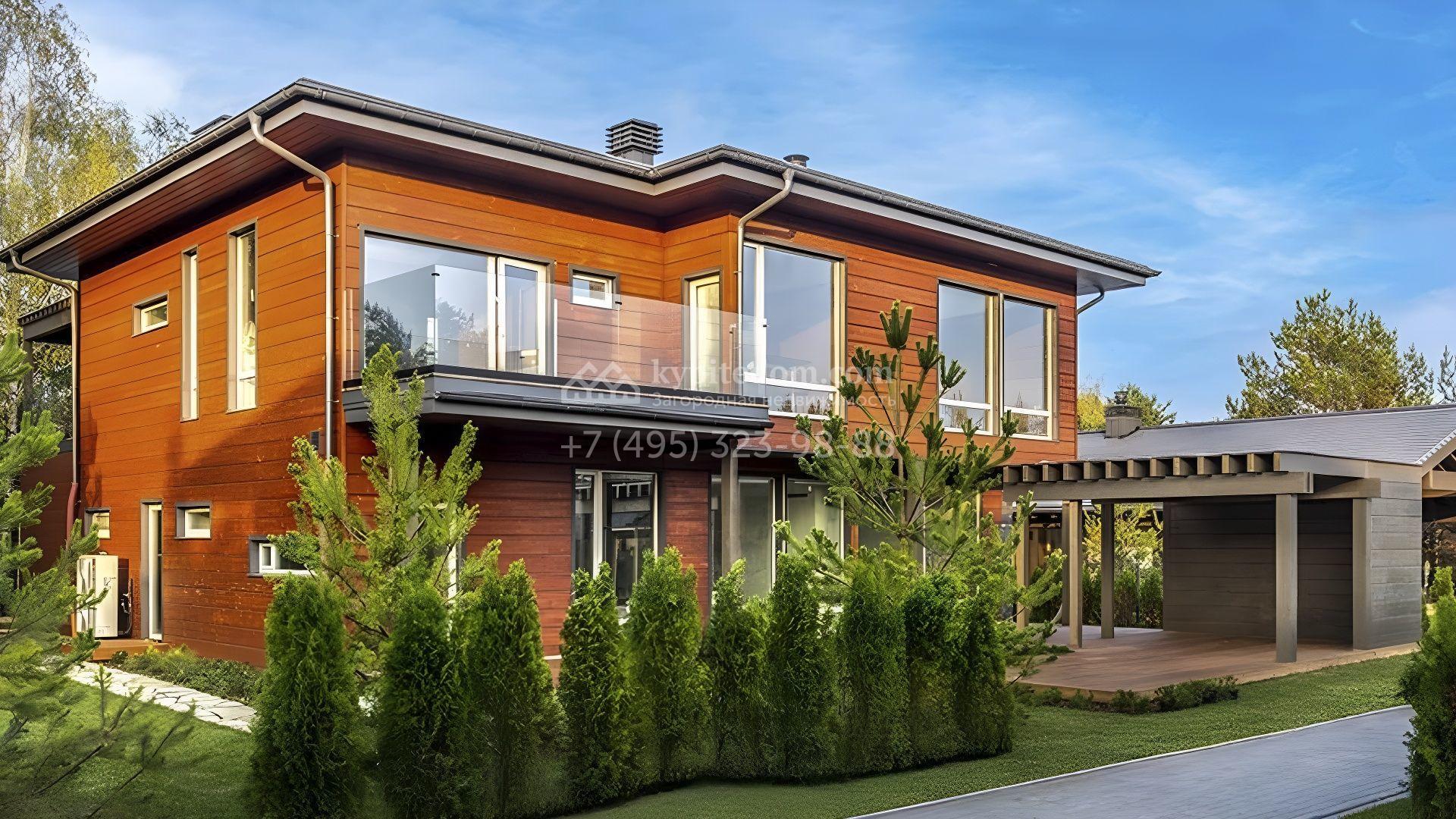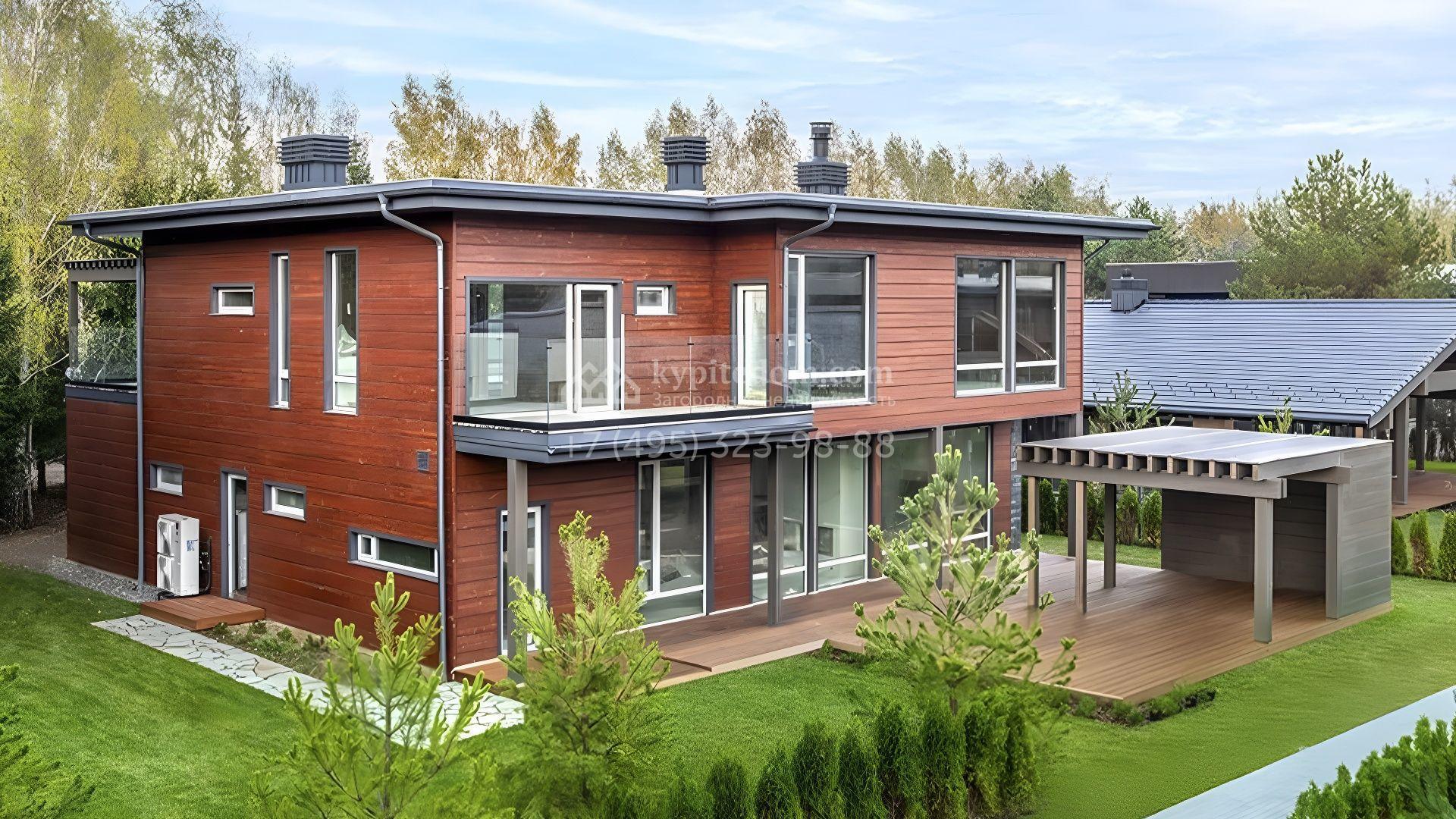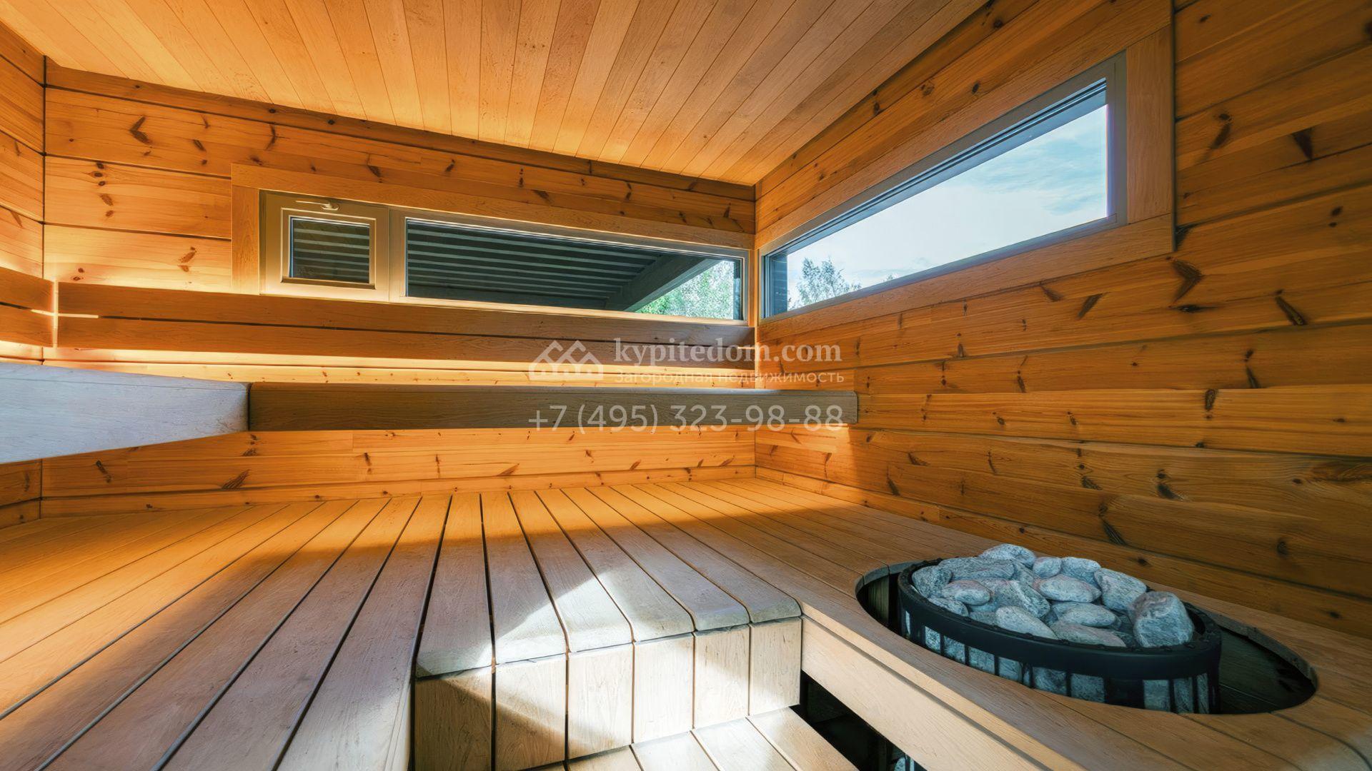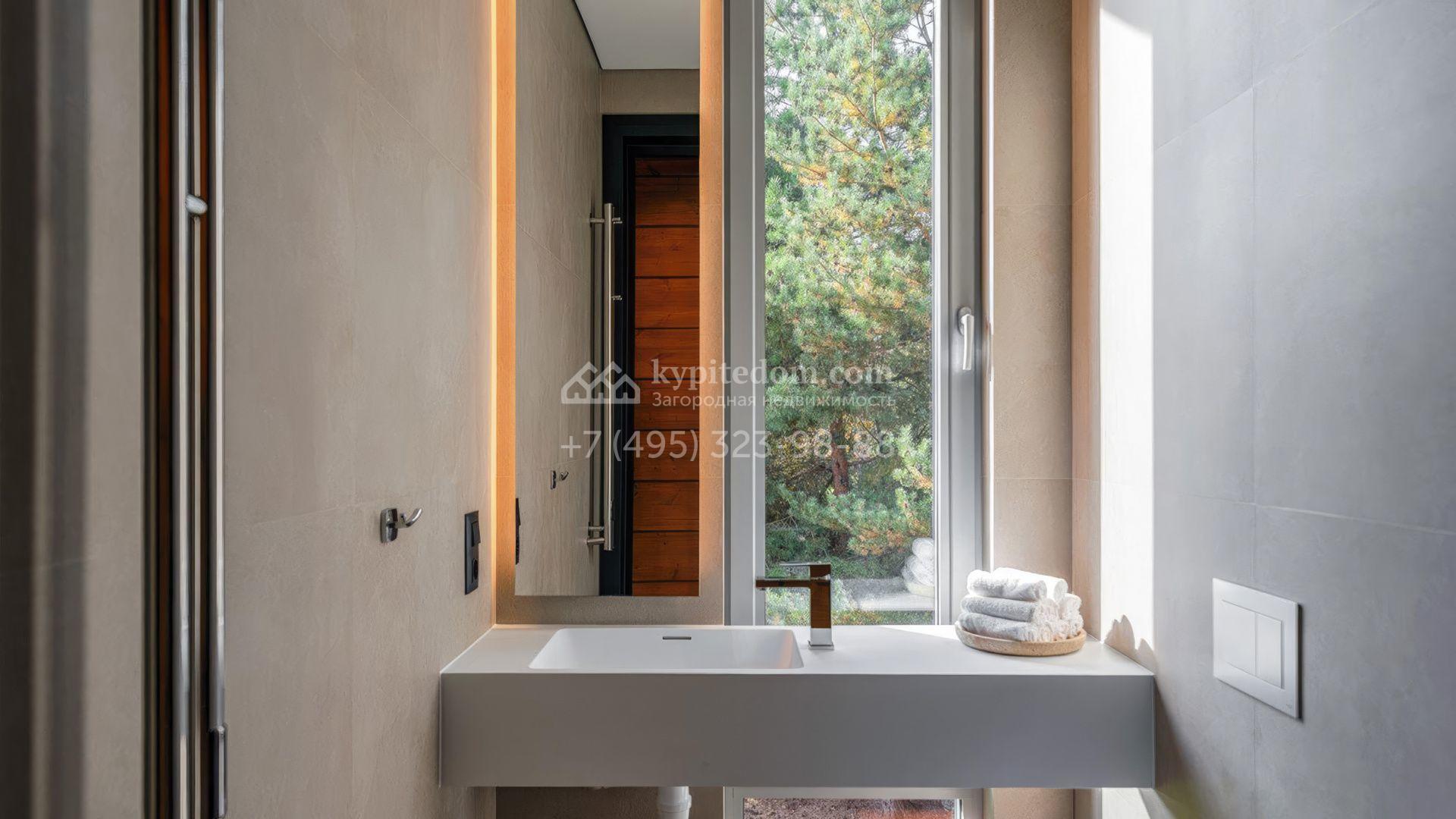 Загородный дом площадью 529 м² расположен на участке 11 соток. Автором концепции выступил финский архитектор Матти Иирамо, интерьерное решение принадлежит итальянскому дизайнеру Фабиано Видусси. Фасад из безусадочного клееного бруса с панорамными окнами Schuco и просторными террасами выглядит сдержанно и выразительно, а подсветка от компании Markevich Lighting подчёркивает линии здания в вечернее время.