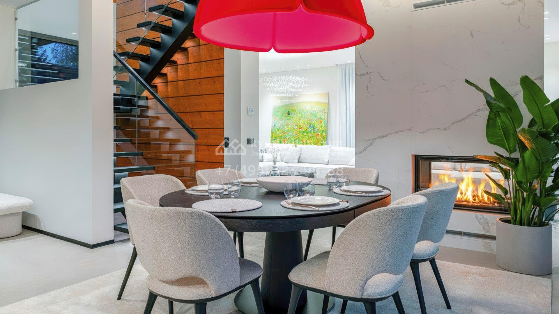Планировка включает кухню-гостиную с двухсторонним камином, мастер-спальню с гардеробной и ванной комнатой, 3 спальни, кабинет, 4 санузла и SPA-зону с сауной и комнатой отдыха с выходом на балкон. Дополнительным преимуществом является лифт, обеспечивающий удобство перемещений между этажами.