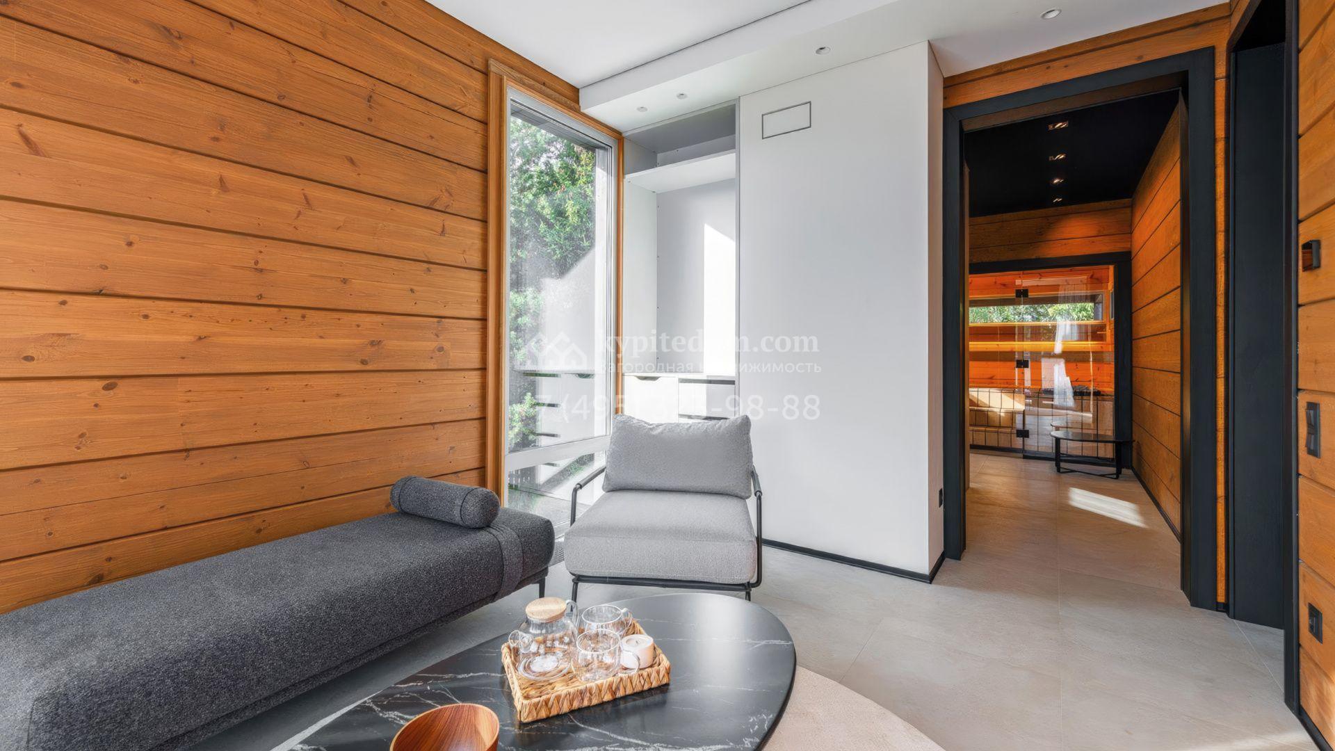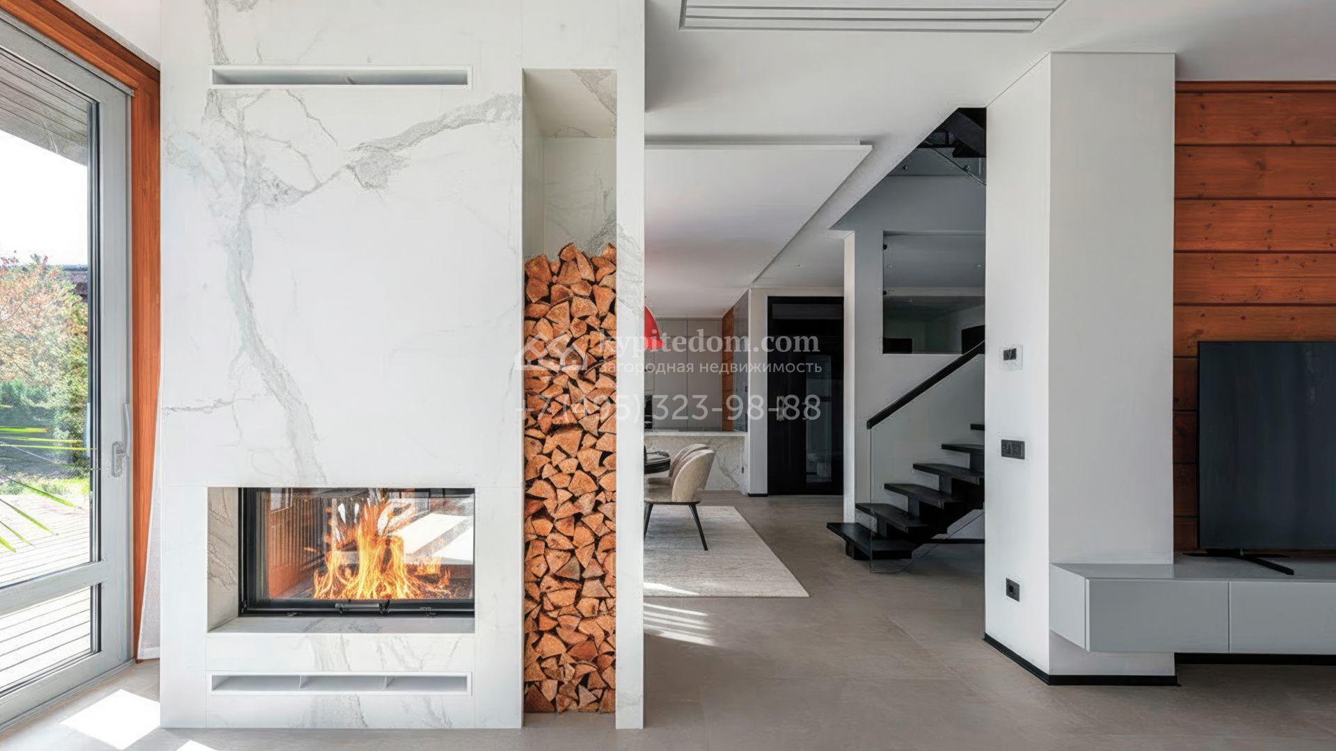 Внутри пространство оформлено с применением натурального дерева, камня и крупноформатной плитки. Кухня оснащена техникой Neff и Asko, мебель подобрана от европейских фабрик. Продуманное сочетание материалов и света создаёт атмосферу современного уюта. Инженерия коттеджа объединяет систему «умный дом», видеонаблюдение и домофонию Hikvision, а также пожарную сигнализацию.