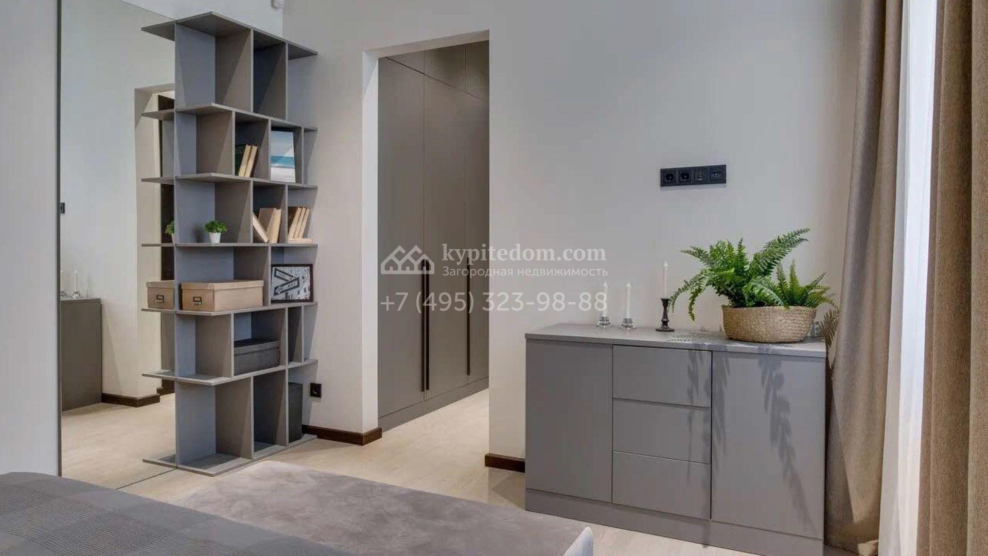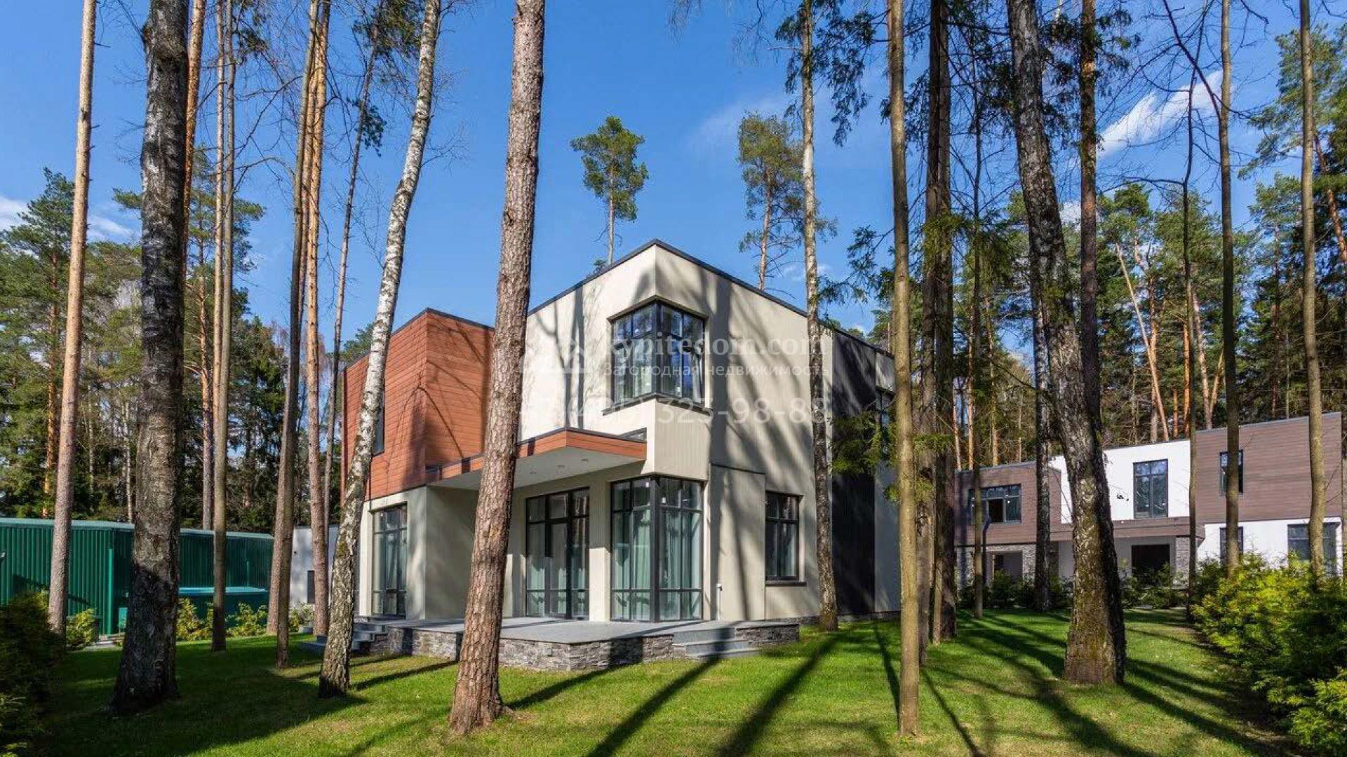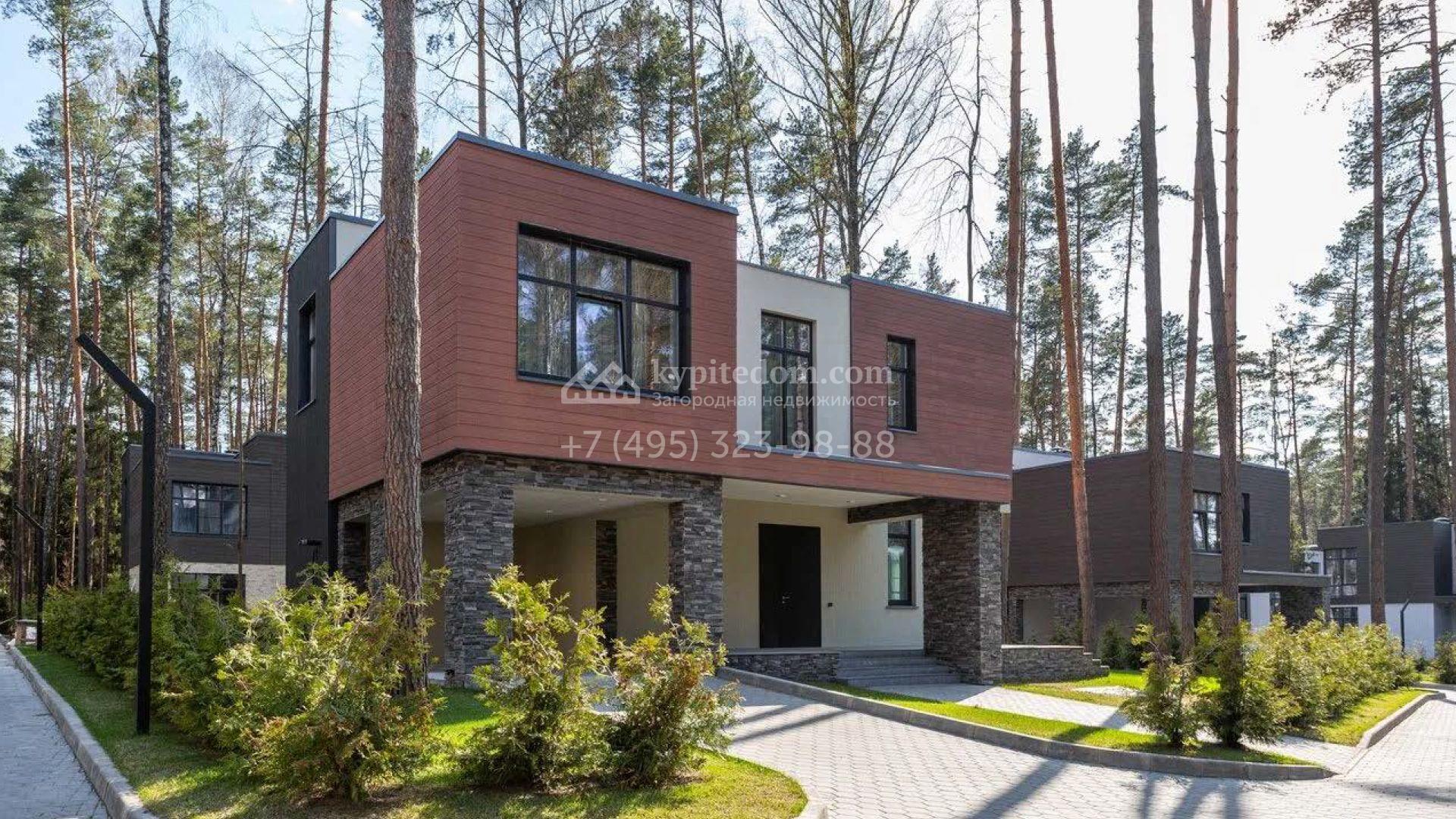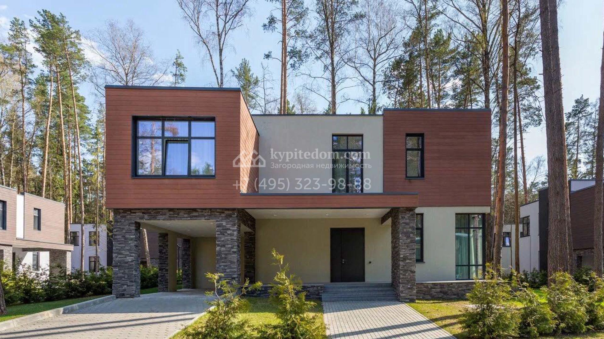 Дом по проекту «Комфорт» с белым фасадом в современном стиле расположен на угловом участке 8 соток у въезда в поселок. Дом площадью 303 м² облицован штукатуркой, натуральным деревом темного оттенка и искусственным серым камнем. Интерьер «под ключ» в современном стиле выполнили в серо-бело-бежевых оттенках — к нему легко подобрать акцентные цвета и мебель в любом стиле. В доме установлена кухня со встроенной техникой, оборудованы санузлы, развешаны светильники и бра. На двух этажах спланировано 5 спален, или 4 спальни и кабинет. На участке машину можно припарковать под навесом, рядом — постелить газон и поставить шезлонги в тени корабельных сосен.