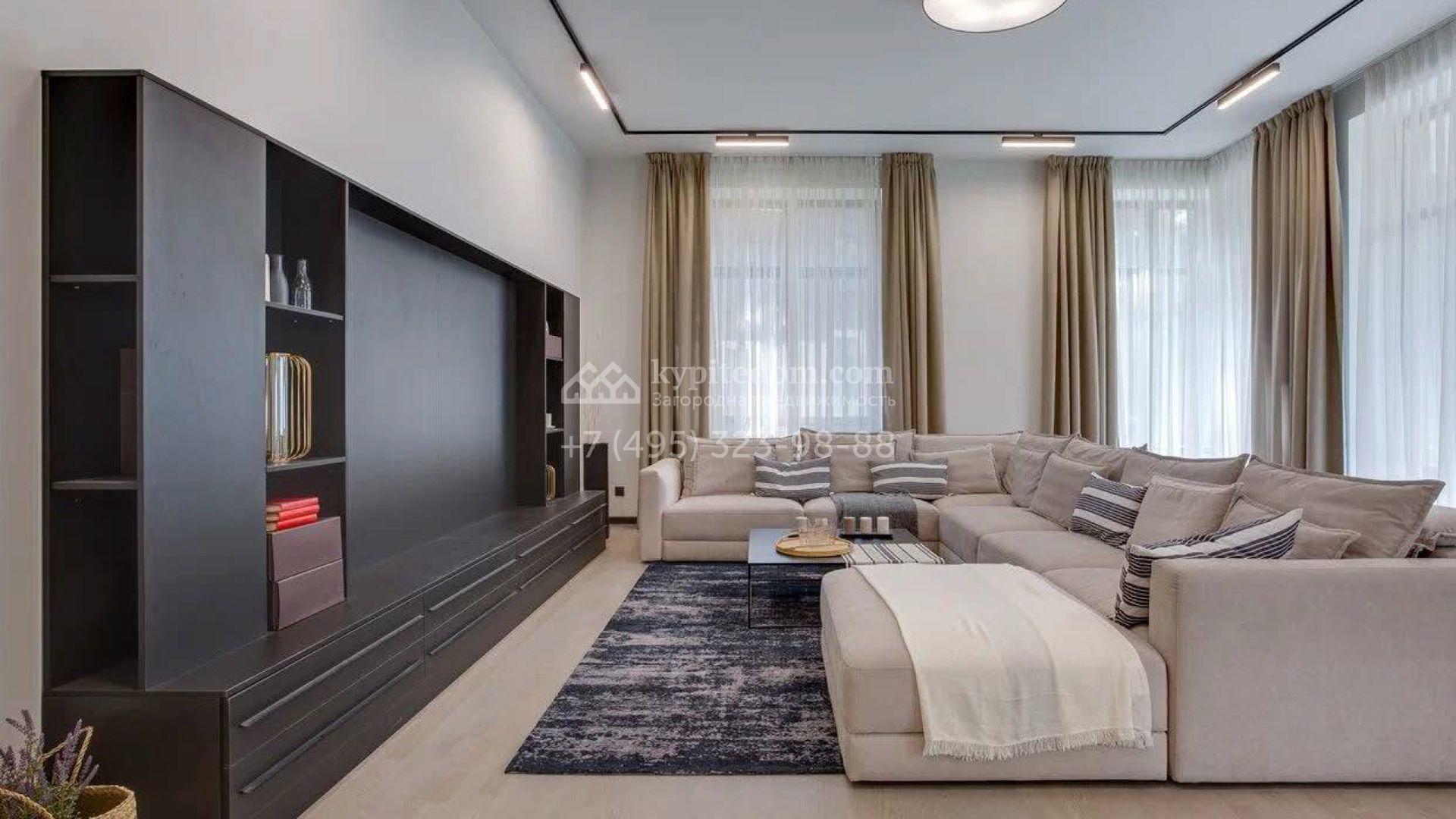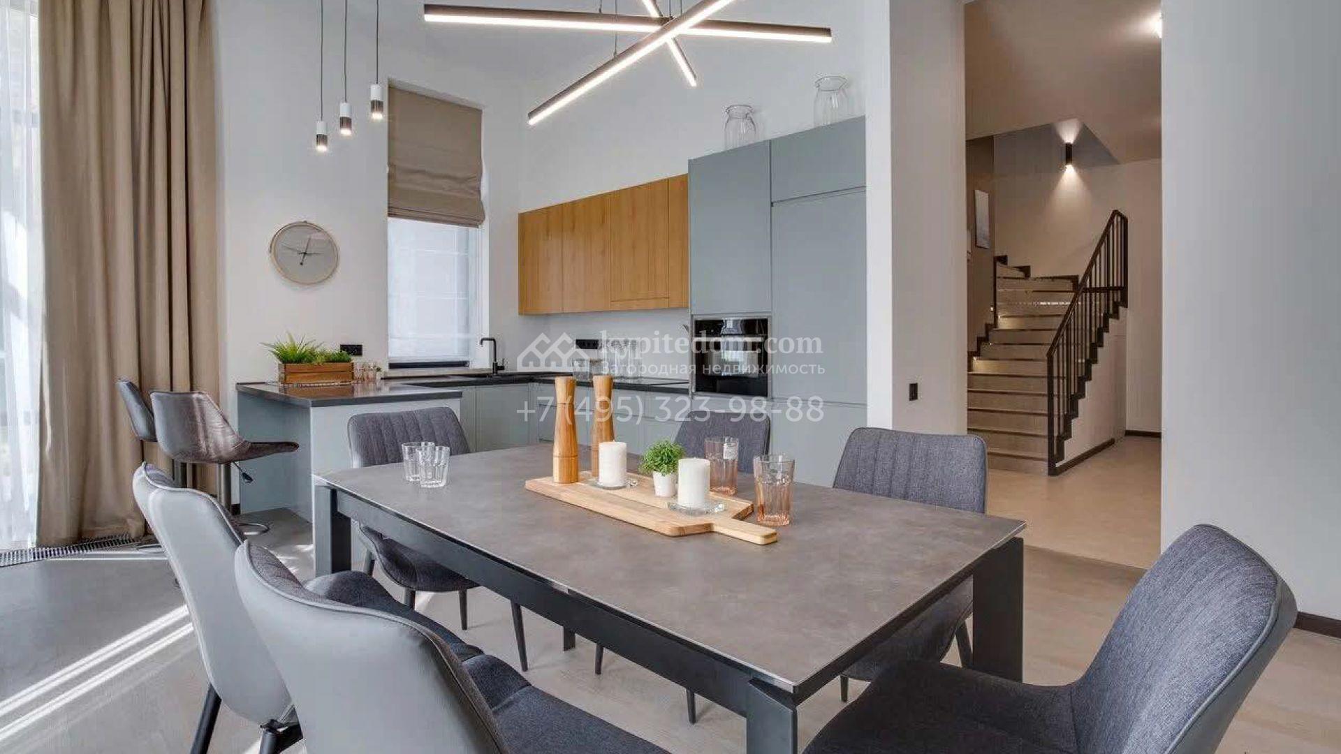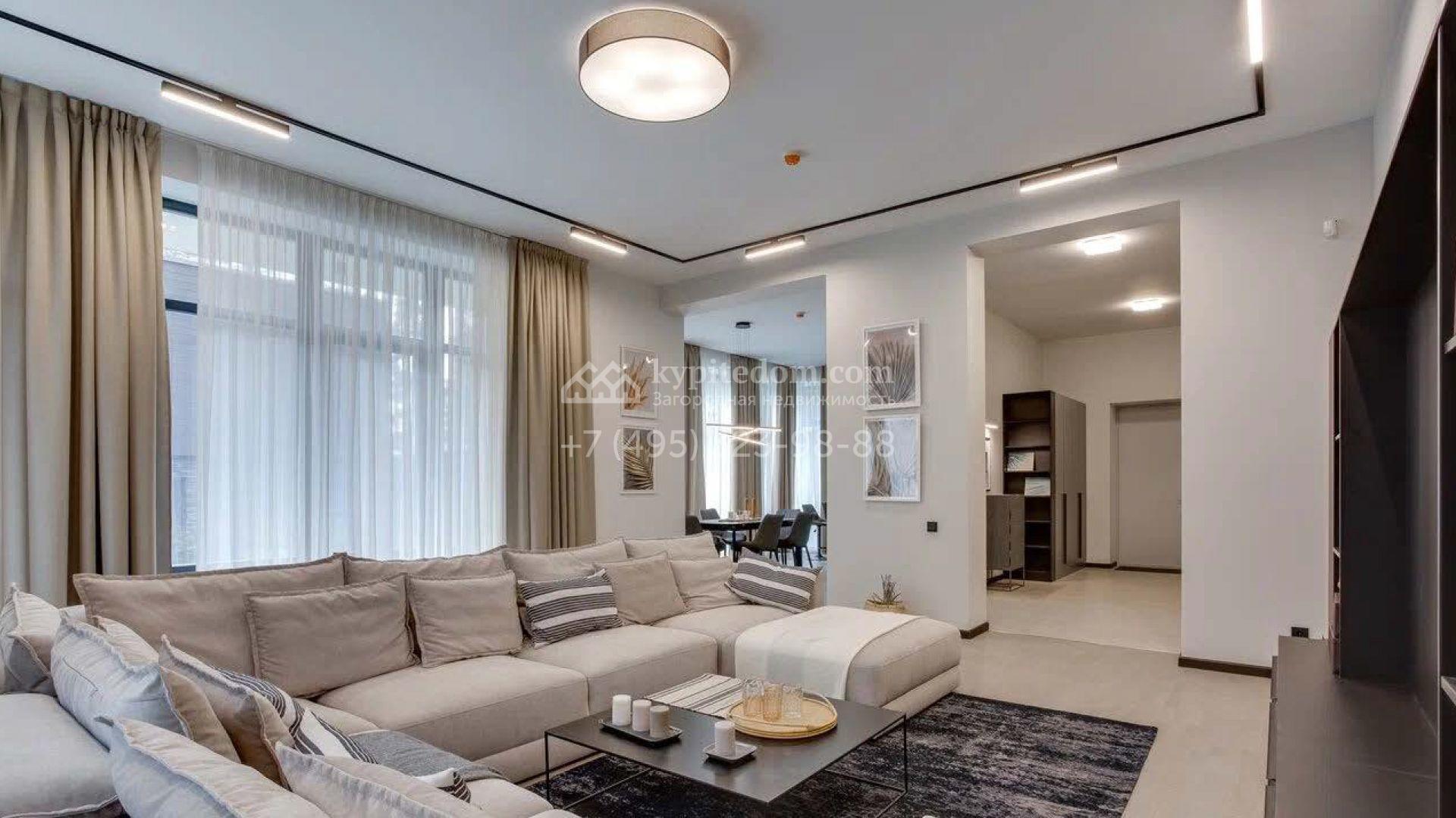 Дом по проекту «Комфорт» с белым фасадом в современном стиле расположен на угловом участке 8 соток у въезда в поселок. Дом площадью 303 м² облицован штукатуркой, натуральным деревом темного оттенка и искусственным серым камнем. Интерьер «под ключ» в современном стиле выполнили в серо-бело-бежевых оттенках — к нему легко подобрать акцентные цвета и мебель в любом стиле. В доме установлена кухня со встроенной техникой, оборудованы санузлы, развешаны светильники и бра. На двух этажах спланировано 5 спален, или 4 спальни и кабинет. На участке машину можно припарковать под навесом, рядом — постелить газон и поставить шезлонги в тени корабельных сосен.