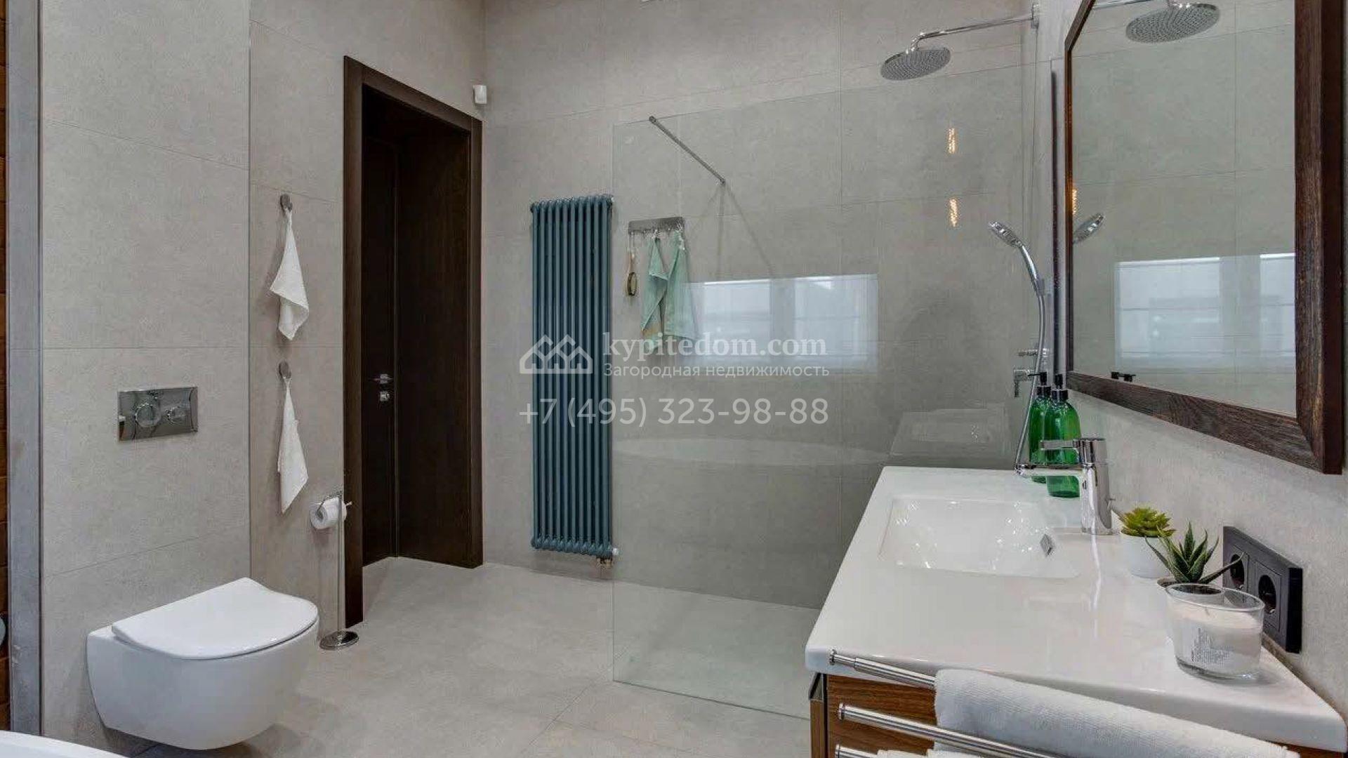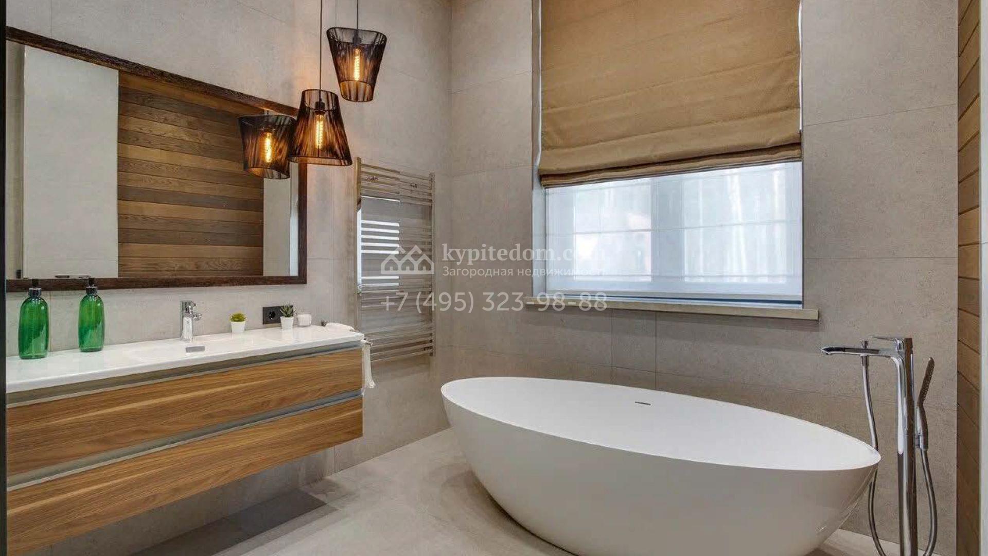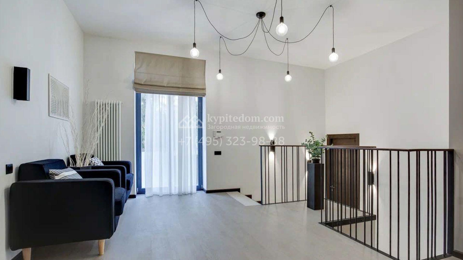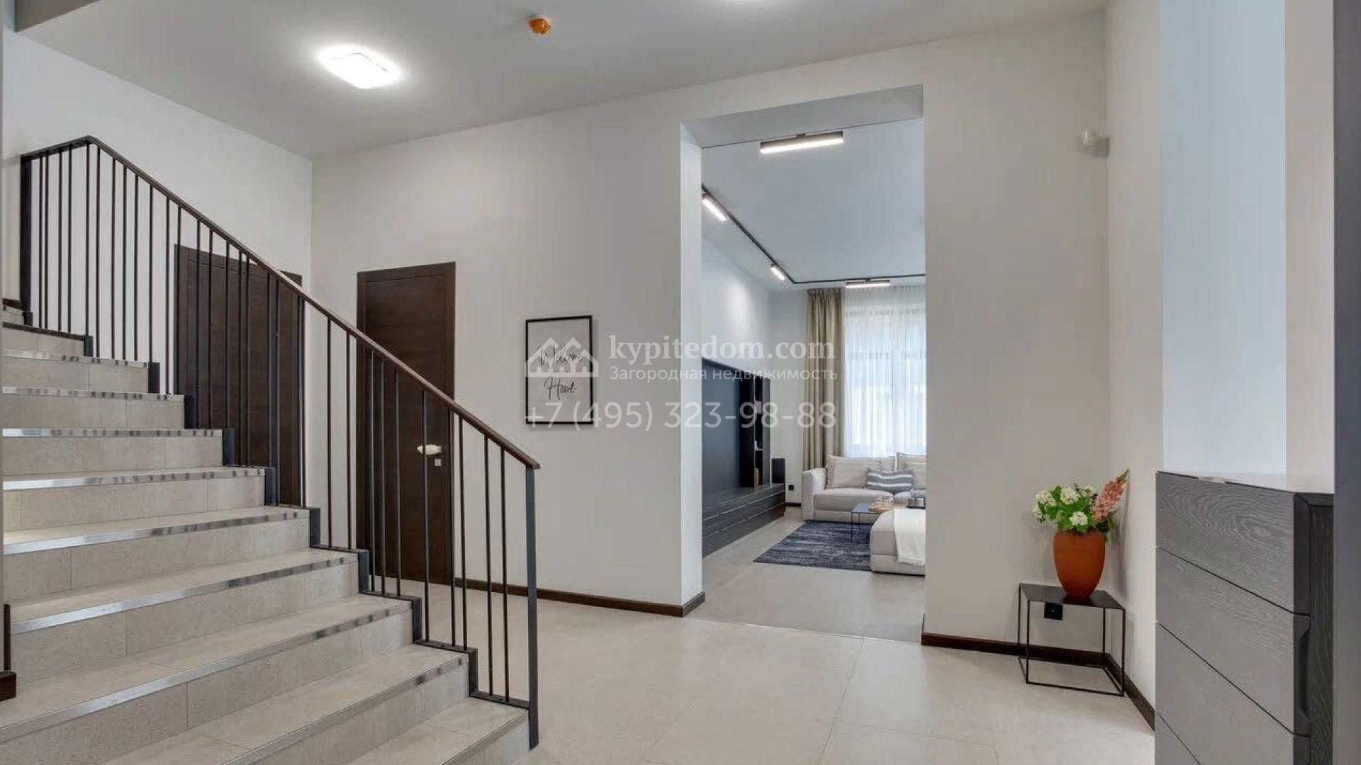 Дом по проекту «Комфорт» с белым фасадом в современном стиле расположен на угловом участке 8 соток у въезда в поселок. Дом площадью 303 м² облицован штукатуркой, натуральным деревом темного оттенка и искусственным серым камнем. Интерьер «под ключ» в современном стиле выполнили в серо-бело-бежевых оттенках — к нему легко подобрать акцентные цвета и мебель в любом стиле. В доме установлена кухня со встроенной техникой, оборудованы санузлы, развешаны светильники и бра. На двух этажах спланировано 5 спален, или 4 спальни и кабинет. На участке машину можно припарковать под навесом, рядом — постелить газон и поставить шезлонги в тени корабельных сосен.