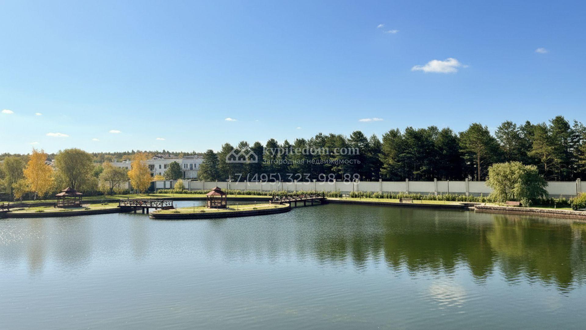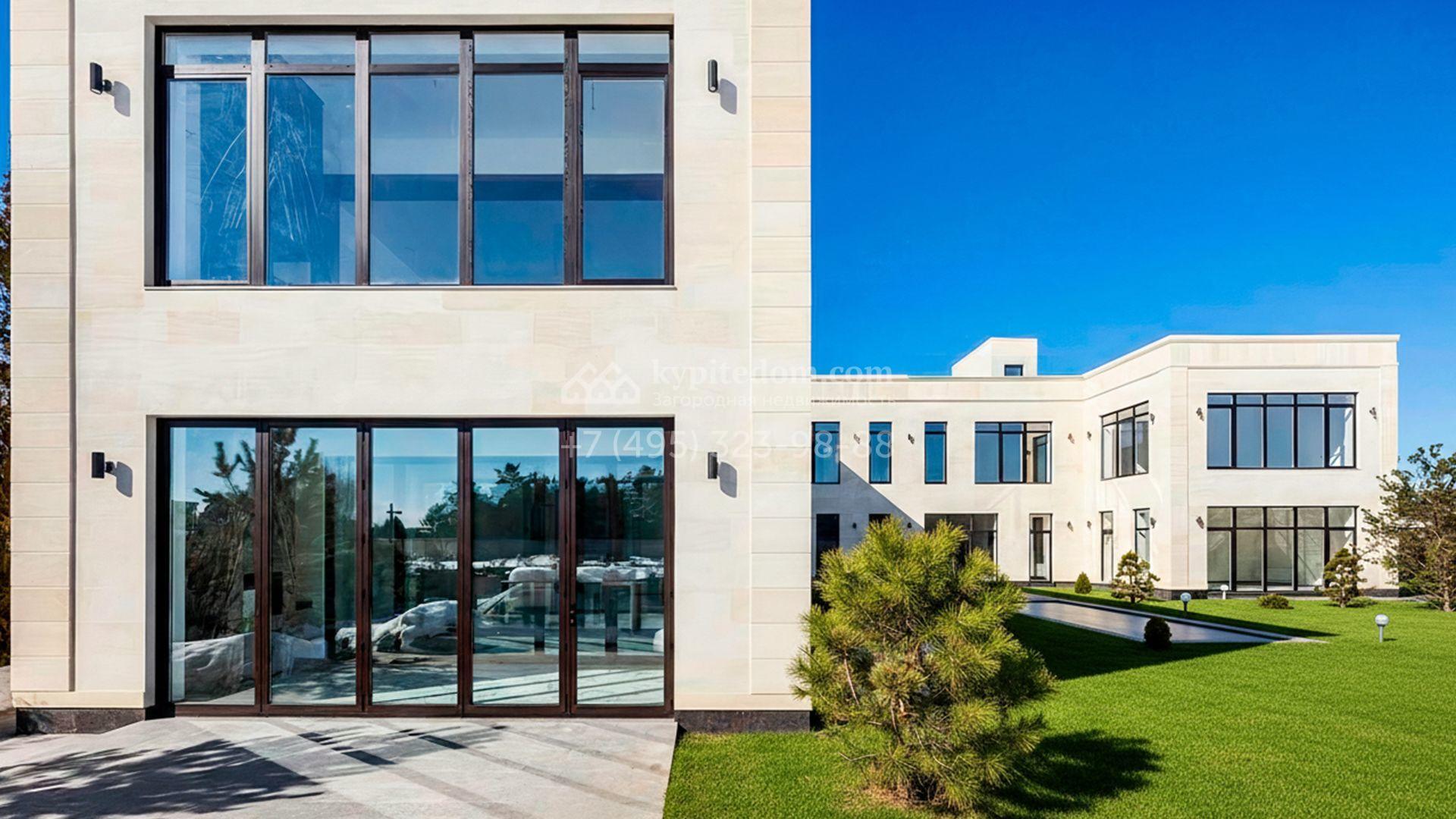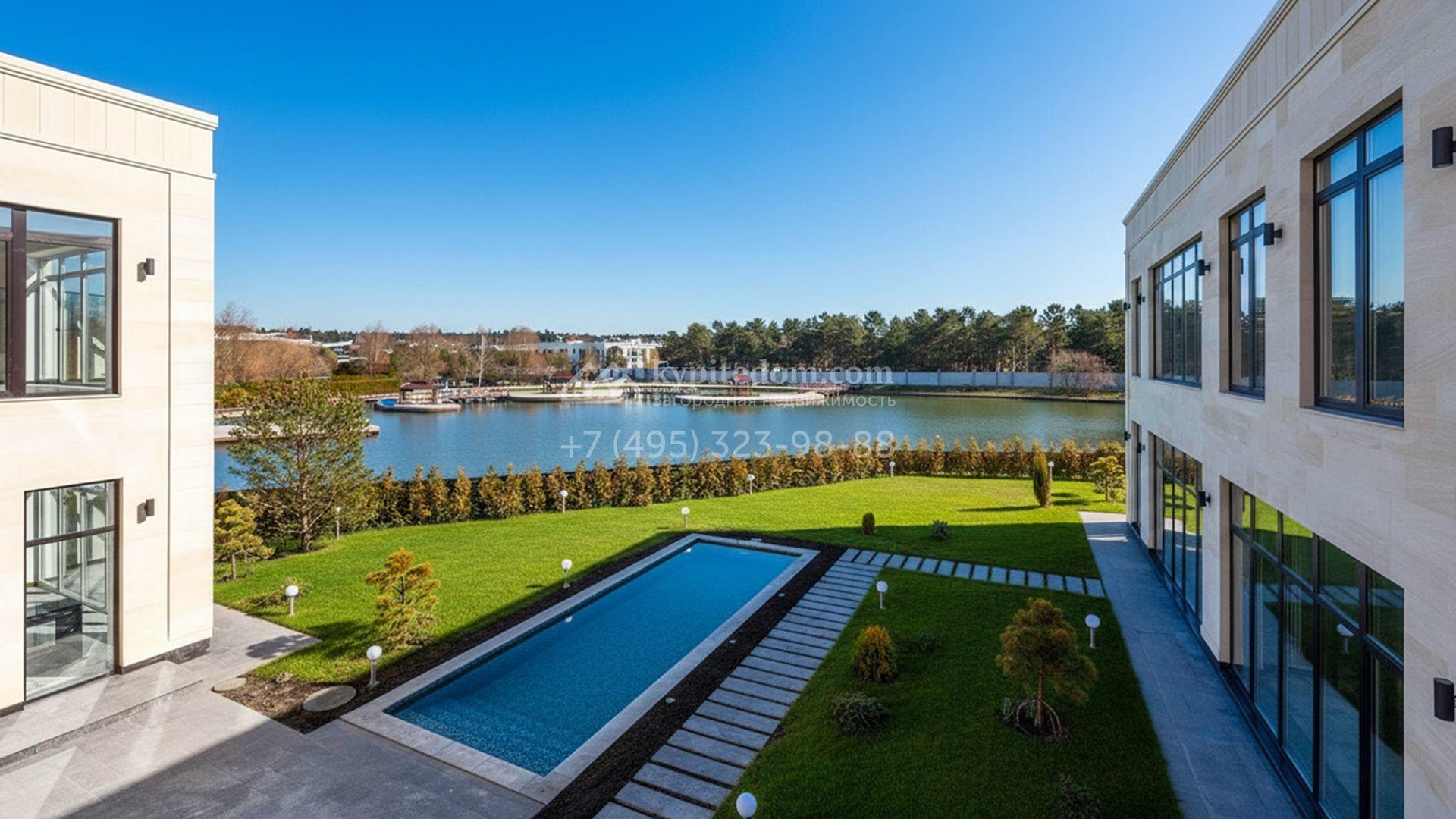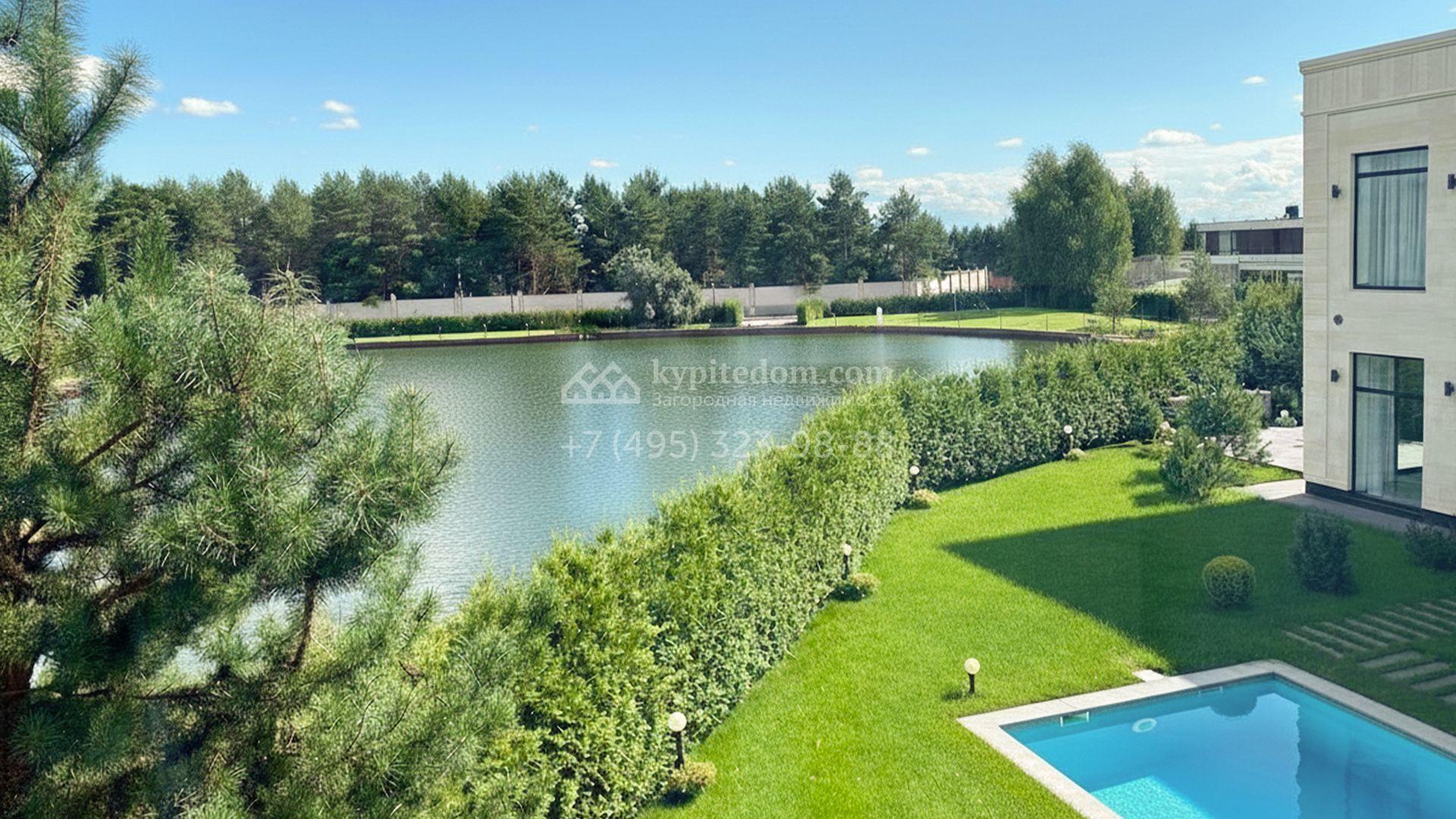 Загородный дом в современном стиле площадью 1150 м² построен на участке 16 соток на берегу озера. Светло-бежевый фасад украсили рустовкой и подсветкой, установлено панорамное остекление. Интерьер выполнен в светлых оттенках с использованием в оформлении натуральных материалов. В коттедже спланировали восемь спален, кухню, гостиную с камином, столовую, спа-зону с хаммамом, сауной, джакузи и выходом к открытому бассейну с подогревом. Предусмотрены квартира для персонала и два гаража на две машины каждый. На участке выполнен ландшафтный дизайн, высажены деревья, выложены дорожки и оборудовано уличное освещение.