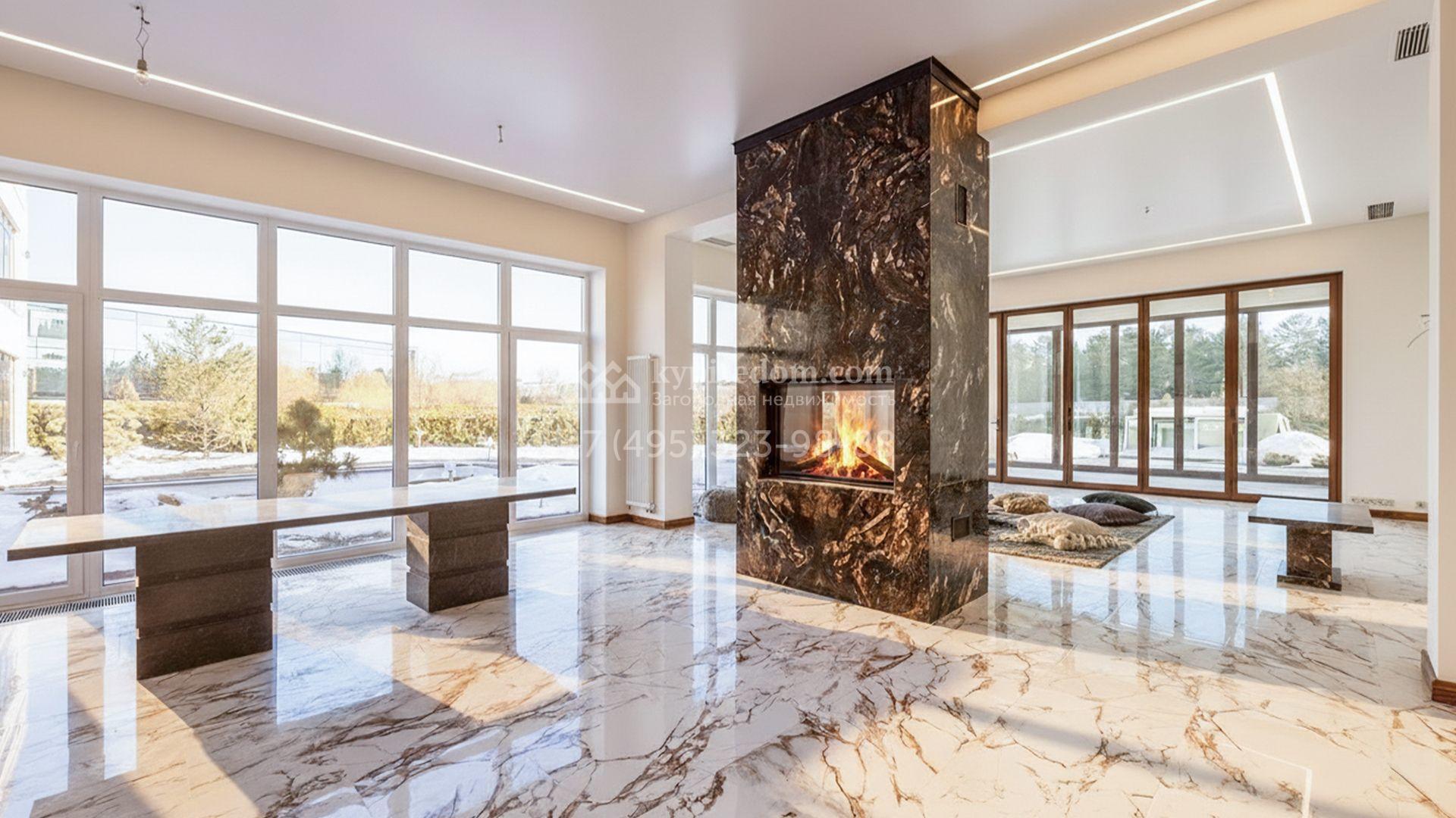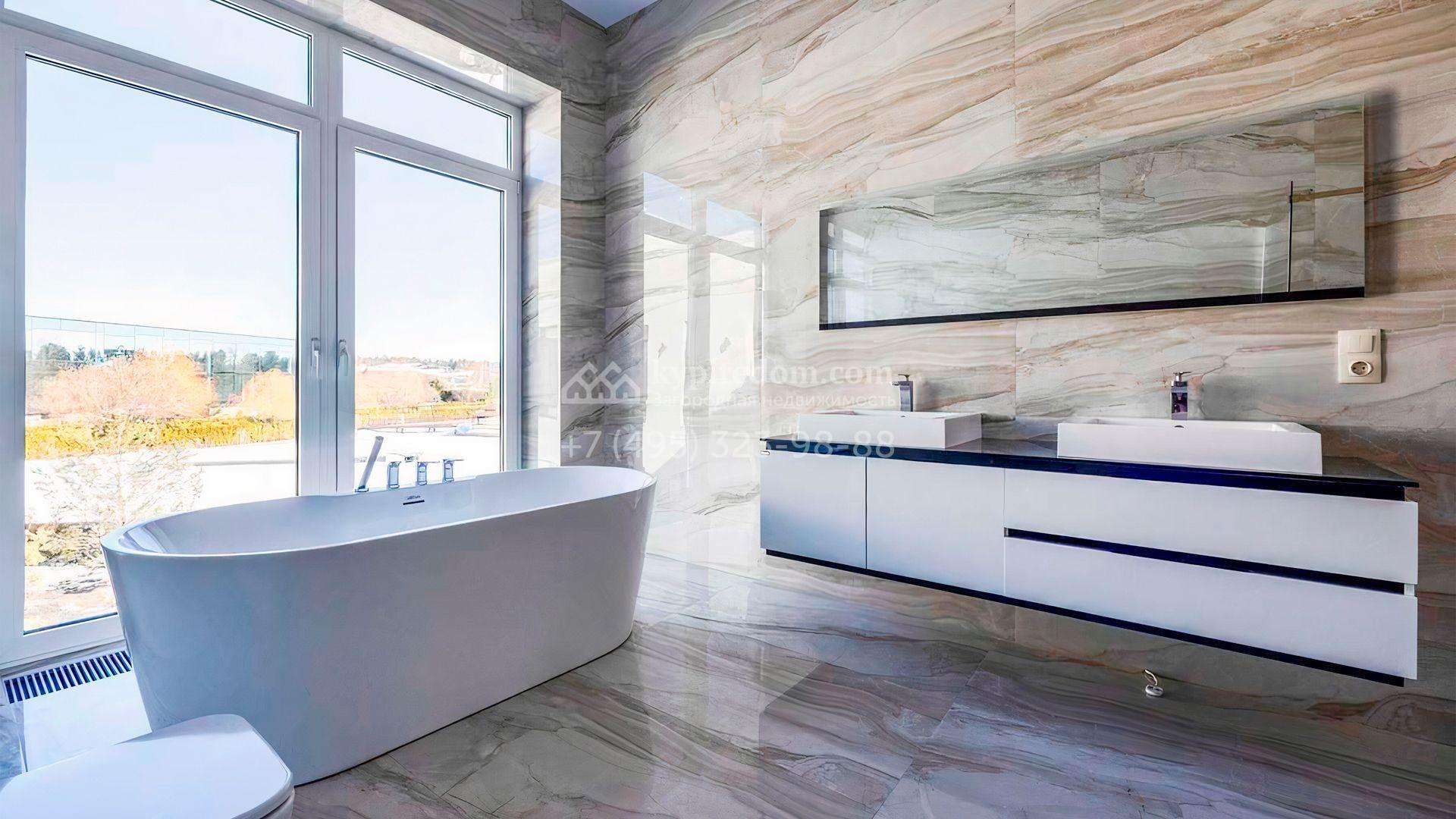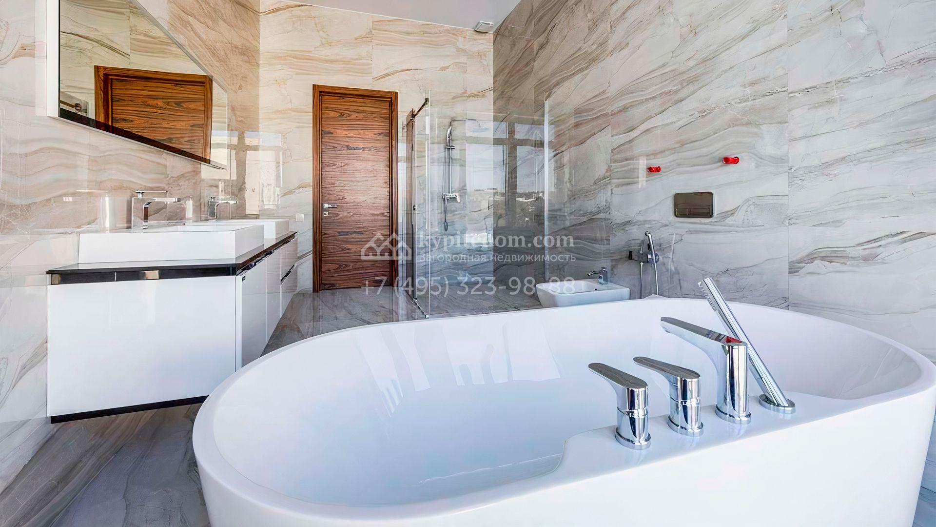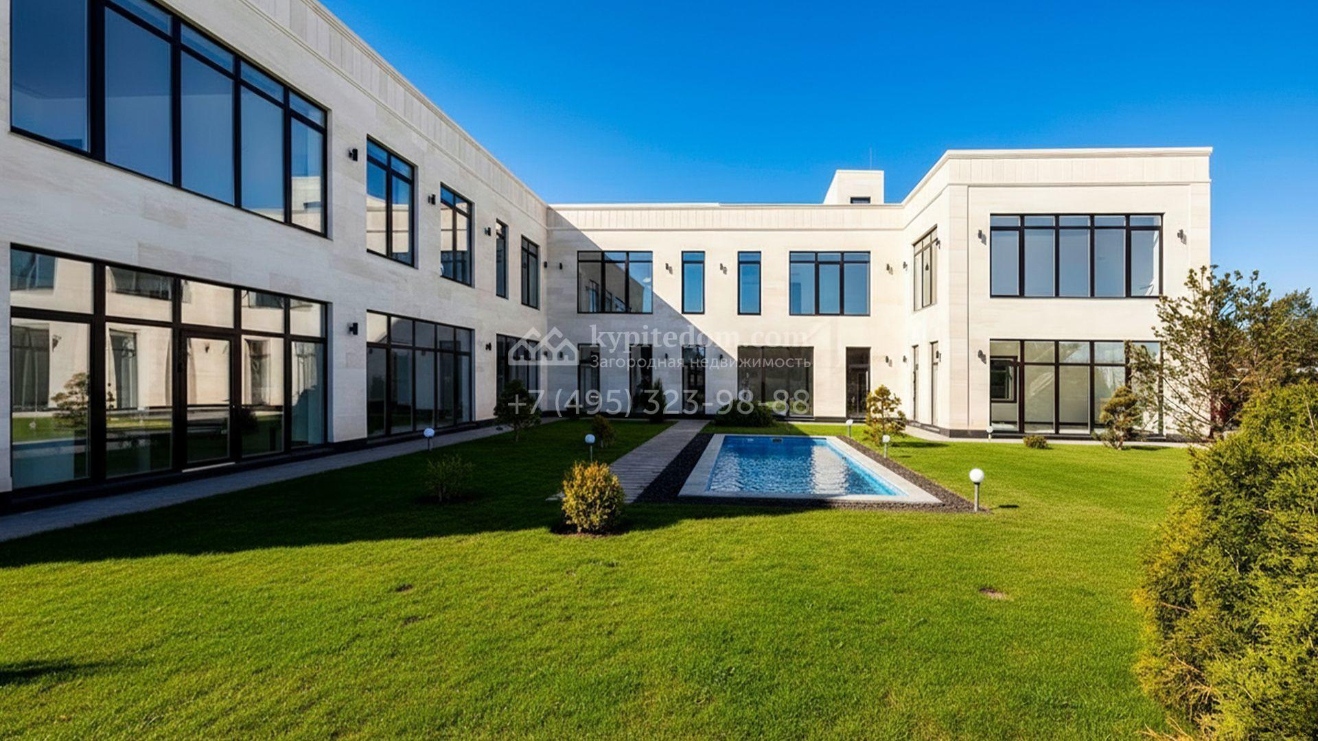 Загородный дом в современном стиле площадью 1150 м² построен на участке 16 соток на берегу озера. Светло-бежевый фасад украсили рустовкой и подсветкой, установлено панорамное остекление. Интерьер выполнен в светлых оттенках с использованием в оформлении натуральных материалов. В коттедже спланировали восемь спален, кухню, гостиную с камином, столовую, спа-зону с хаммамом, сауной, джакузи и выходом к открытому бассейну с подогревом. Предусмотрены квартира для персонала и два гаража на две машины каждый. На участке выполнен ландшафтный дизайн, высажены деревья, выложены дорожки и оборудовано уличное освещение.