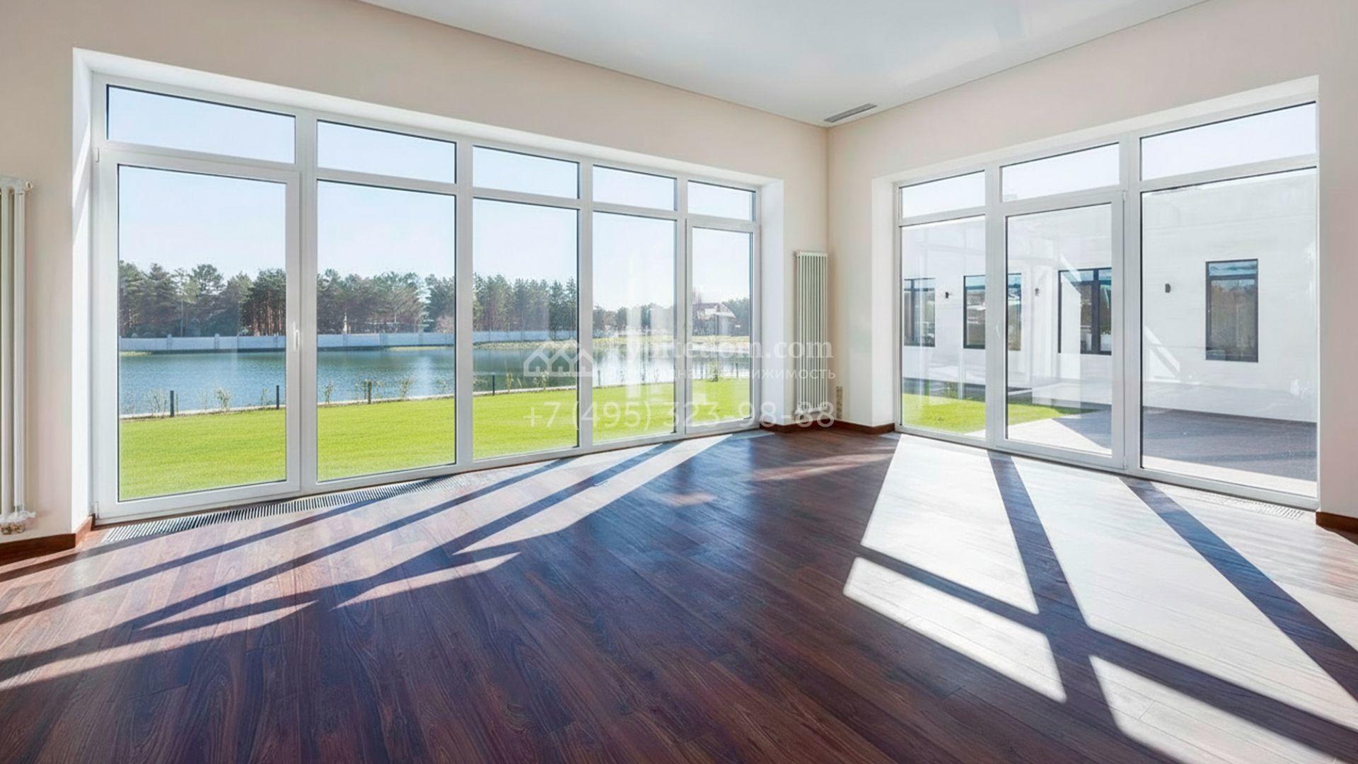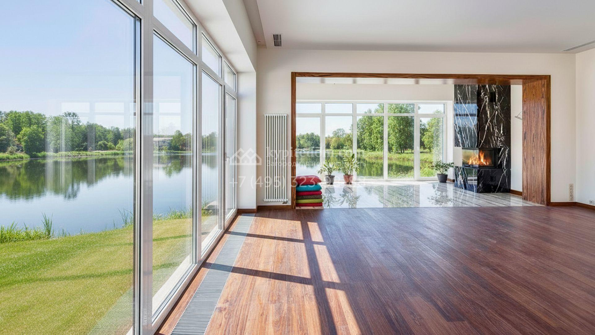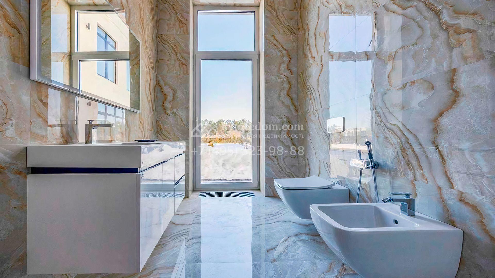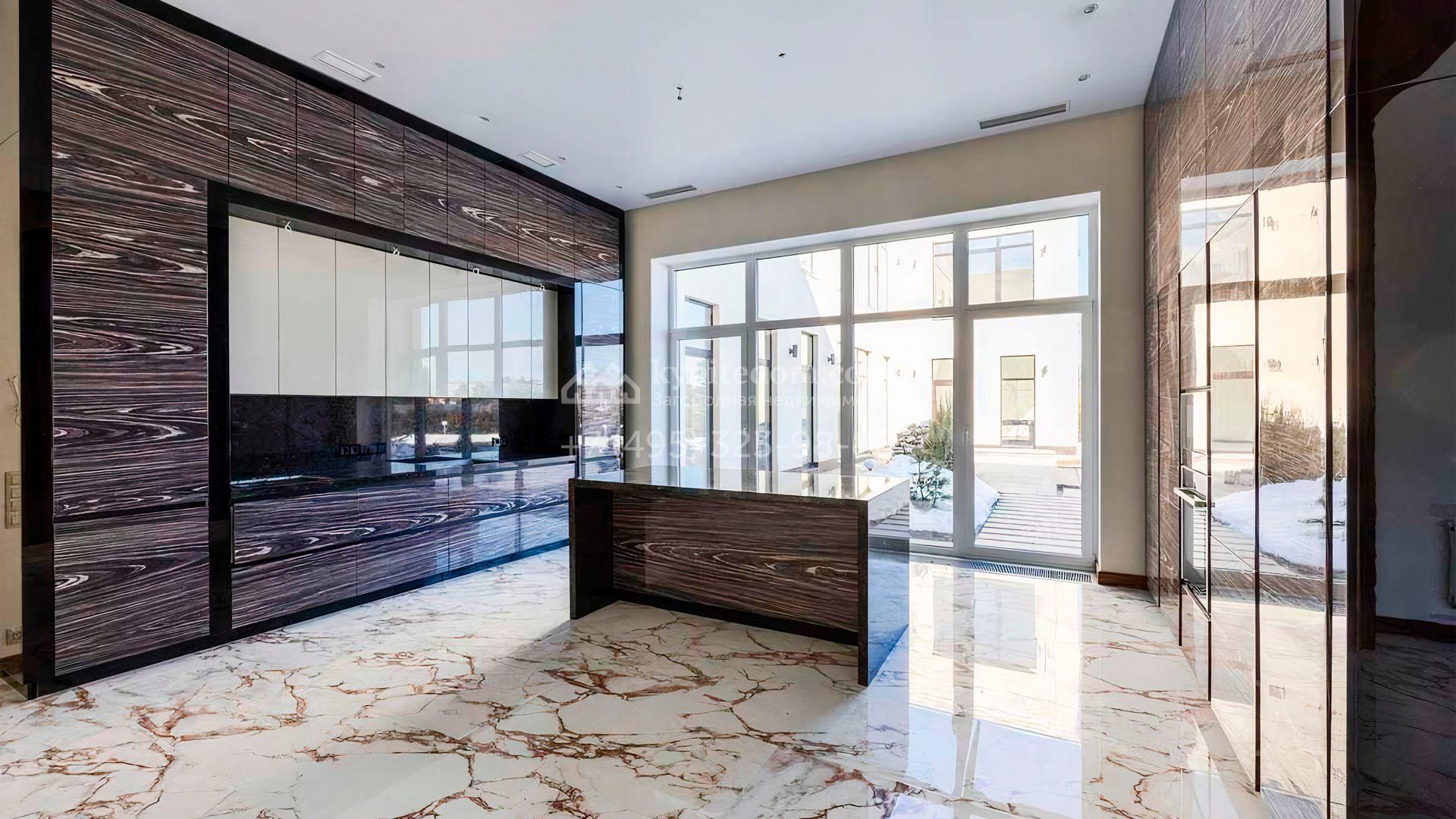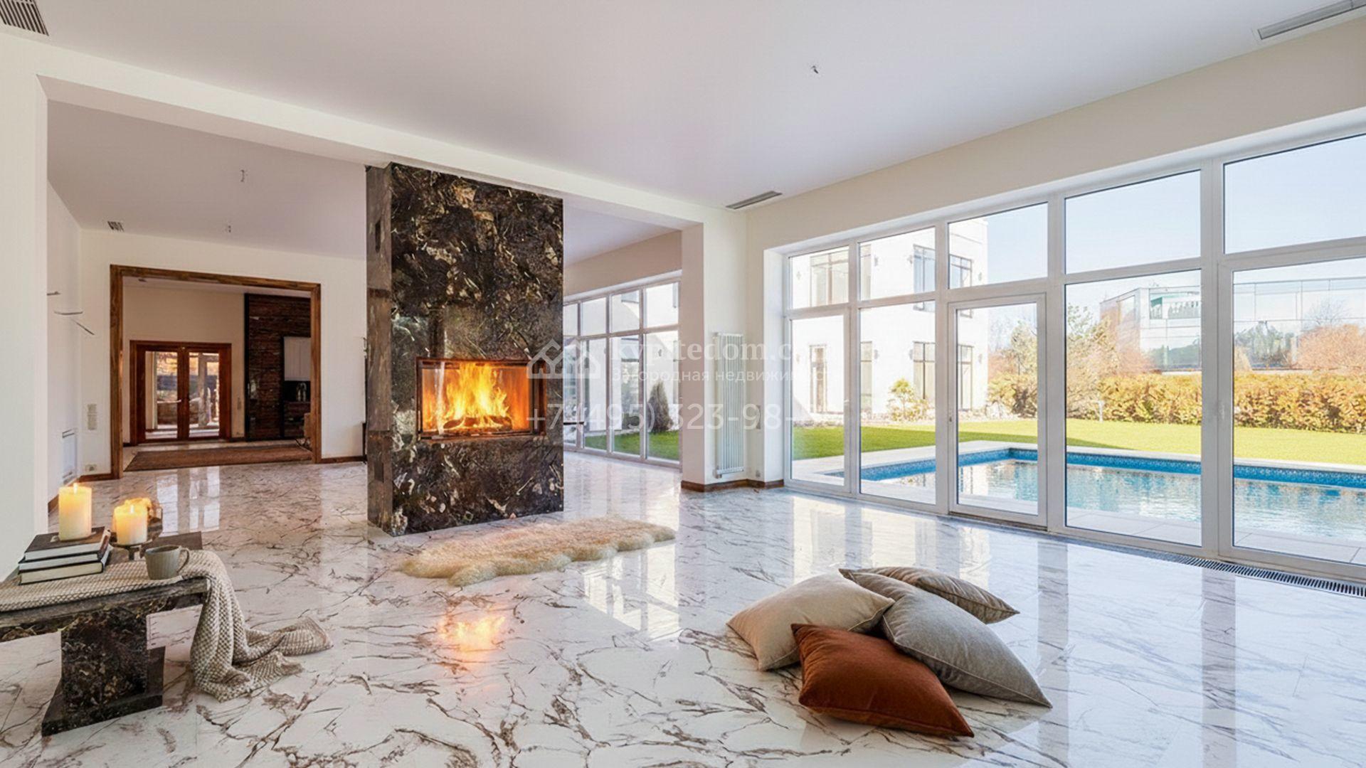 Загородный дом в современном стиле площадью 1150 м² построен на участке 16 соток на берегу озера. Светло-бежевый фасад украсили рустовкой и подсветкой, установлено панорамное остекление. Интерьер выполнен в светлых оттенках с использованием в оформлении натуральных материалов. В коттедже спланировали восемь спален, кухню, гостиную с камином, столовую, спа-зону с хаммамом, сауной, джакузи и выходом к открытому бассейну с подогревом. Предусмотрены квартира для персонала и два гаража на две машины каждый. На участке выполнен ландшафтный дизайн, высажены деревья, выложены дорожки и оборудовано уличное освещение.