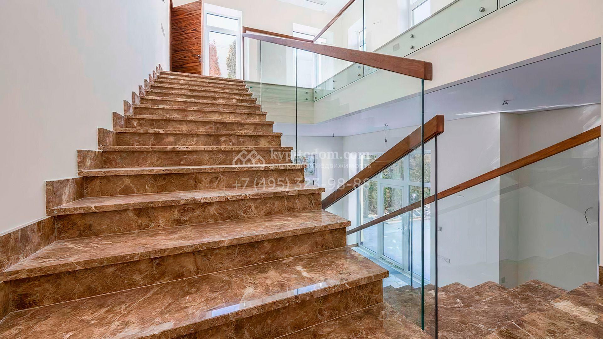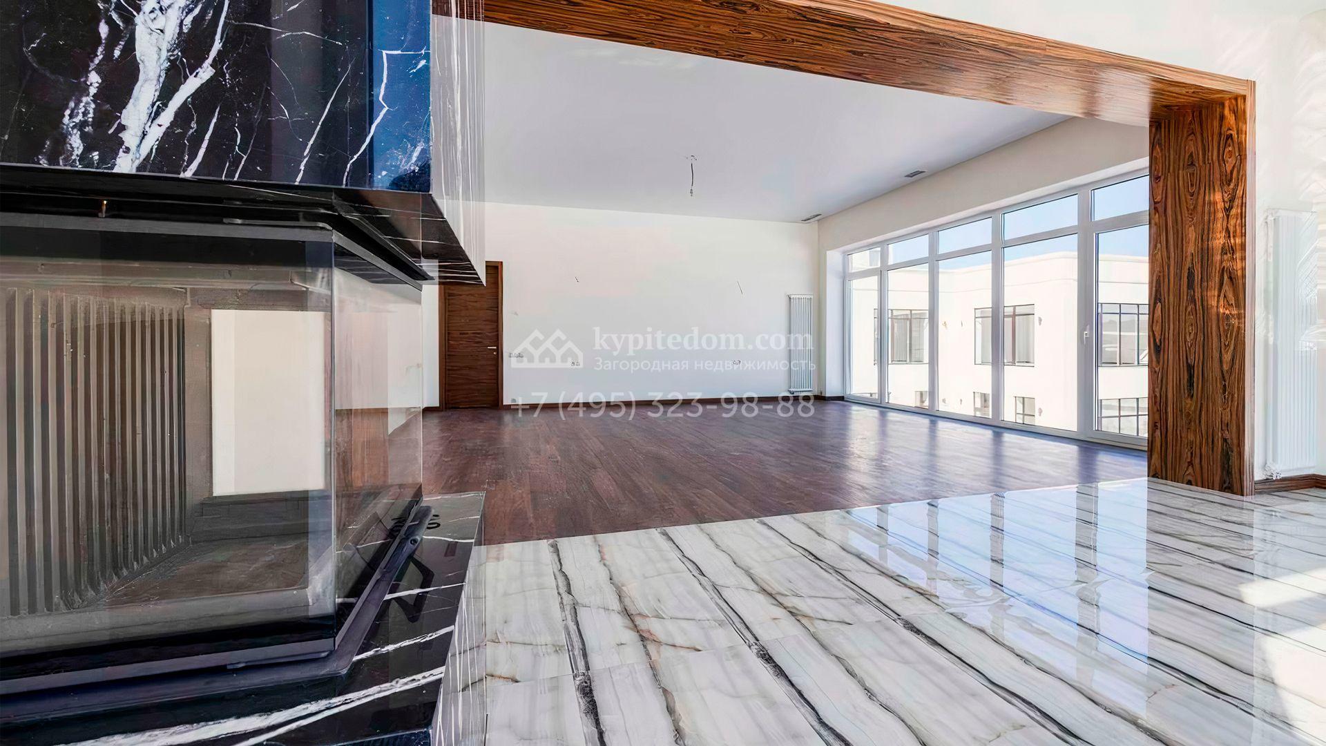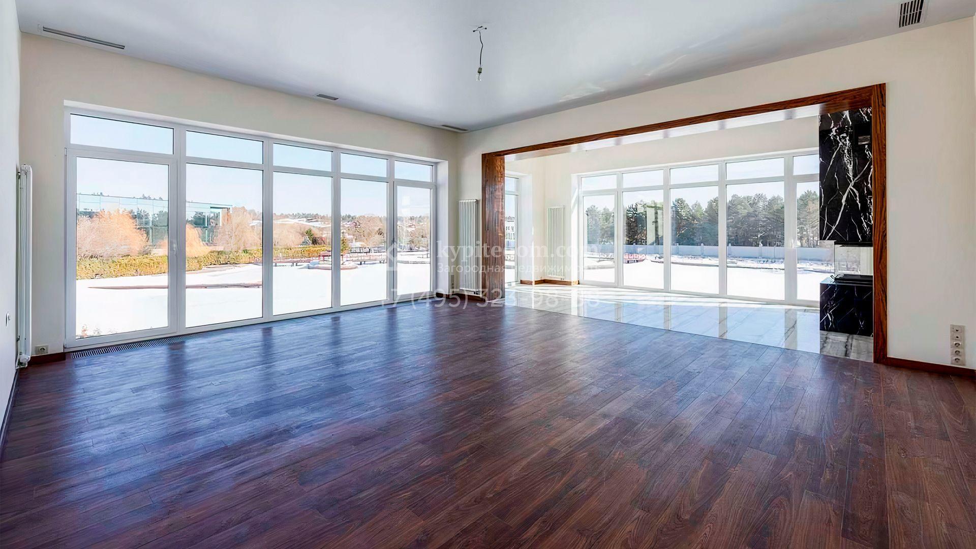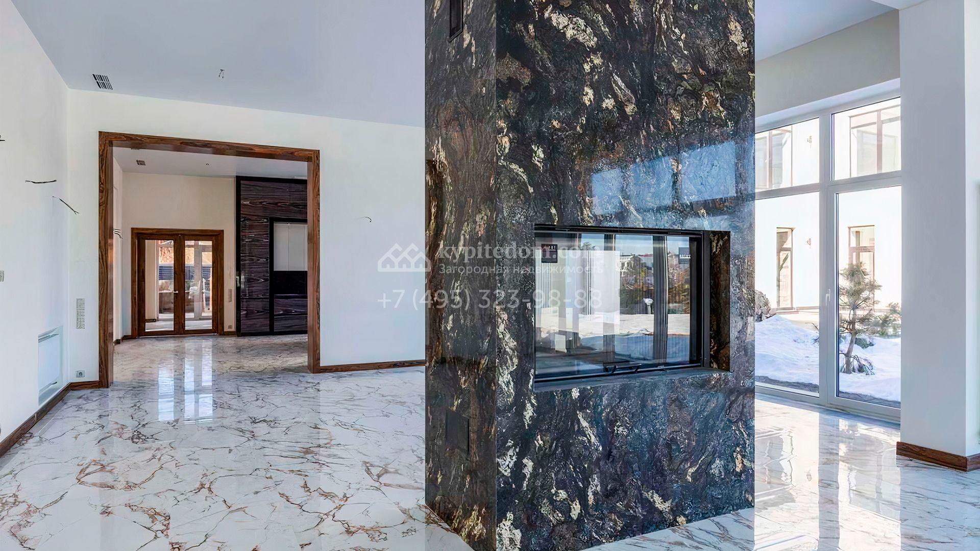 Загородный дом в современном стиле площадью 1150 м² построен на участке 16 соток на берегу озера. Светло-бежевый фасад украсили рустовкой и подсветкой, установлено панорамное остекление. Интерьер выполнен в светлых оттенках с использованием в оформлении натуральных материалов. В коттедже спланировали восемь спален, кухню, гостиную с камином, столовую, спа-зону с хаммамом, сауной, джакузи и выходом к открытому бассейну с подогревом. Предусмотрены квартира для персонала и два гаража на две машины каждый. На участке выполнен ландшафтный дизайн, высажены деревья, выложены дорожки и оборудовано уличное освещение.