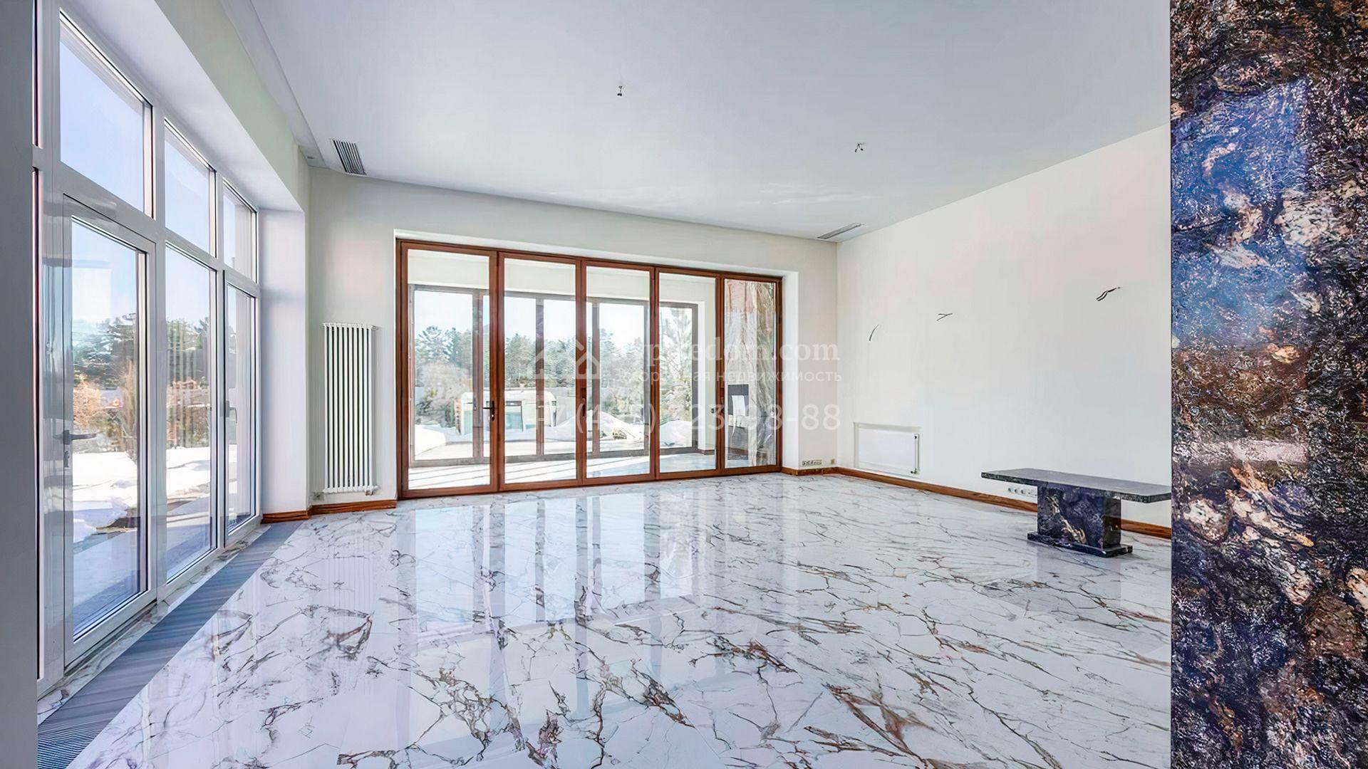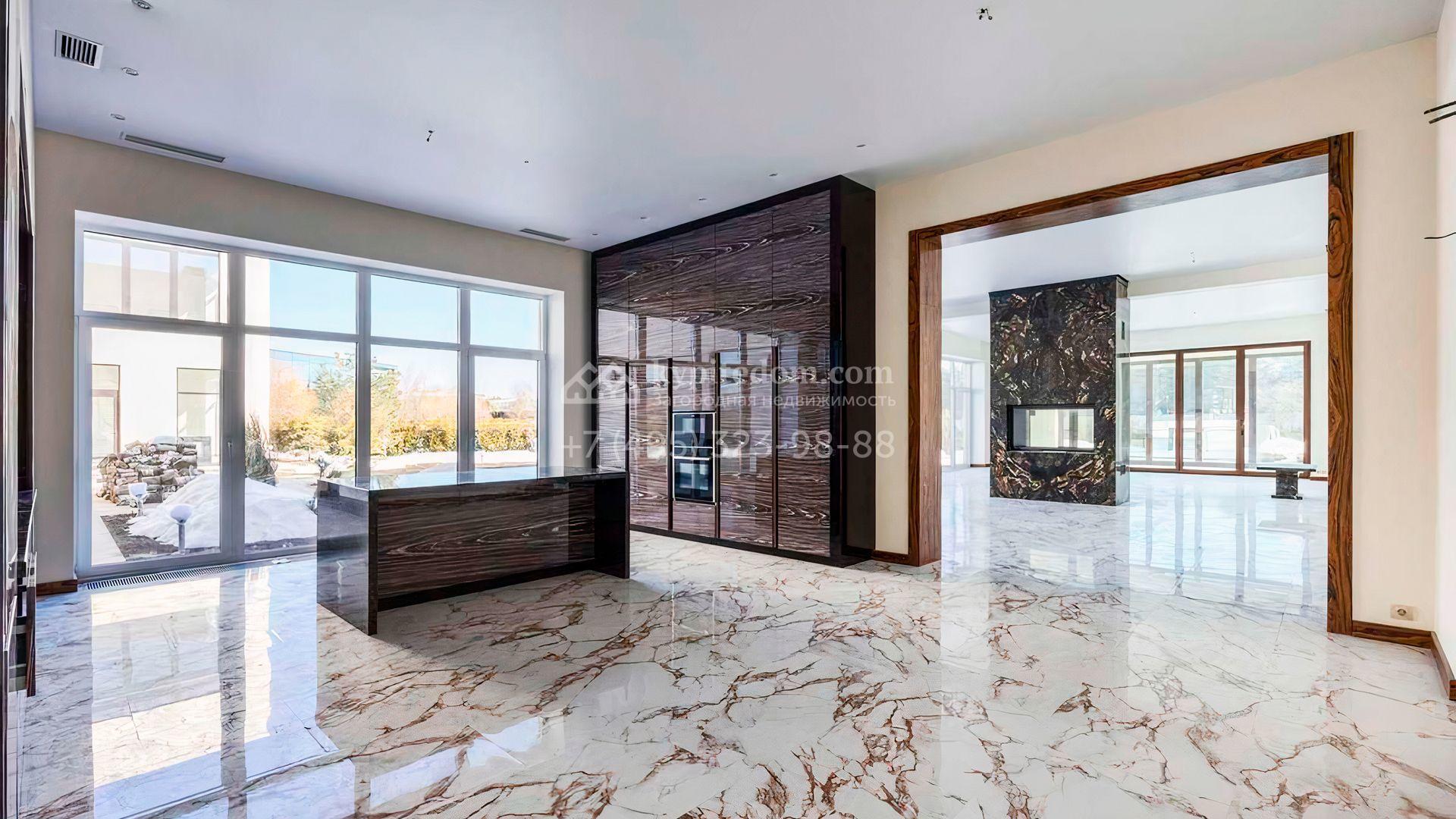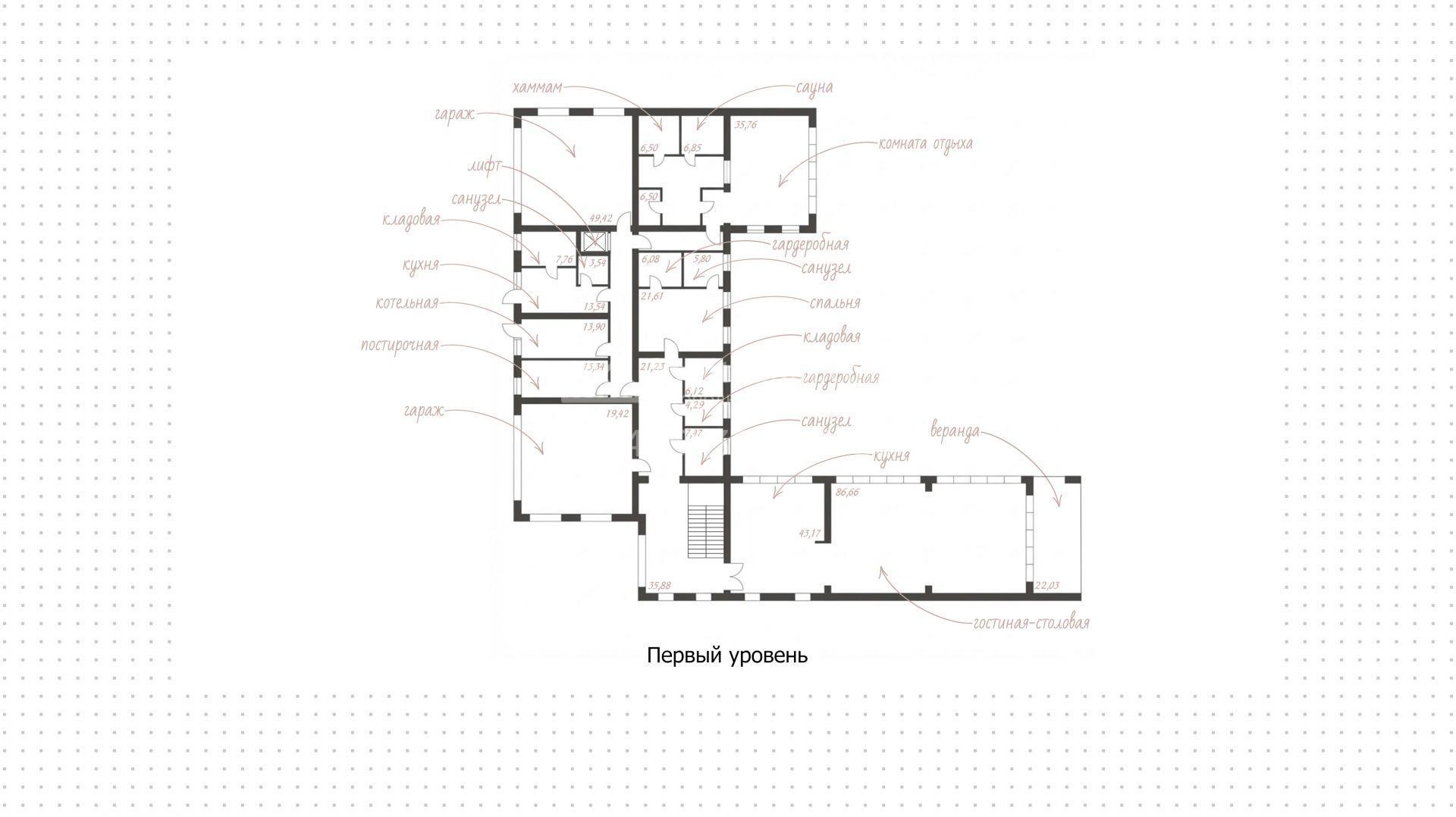 1-й уровень: гостиная, кухня, закрытая терраса, постирочная, 2 гардеробные, гостевой санузел, квартира для персонала, 2 гаража, бойлерная, SPA-зона — хамам, сауна, джакузи, выход к открытому бассейну с подогревом, зона отдыха.