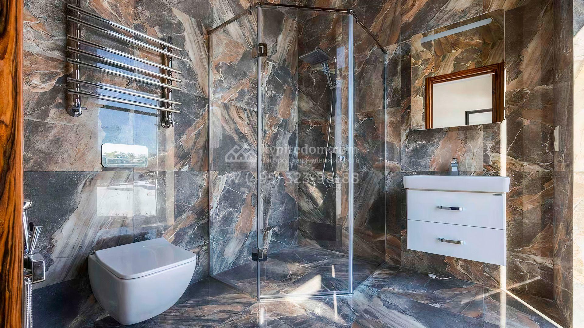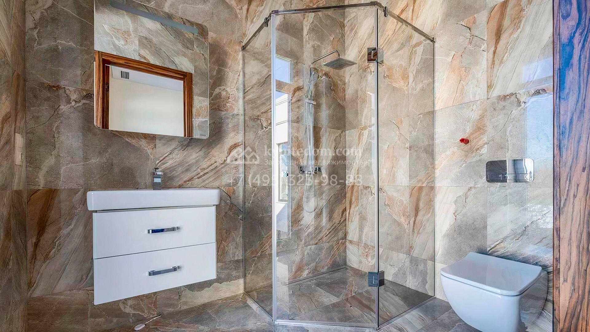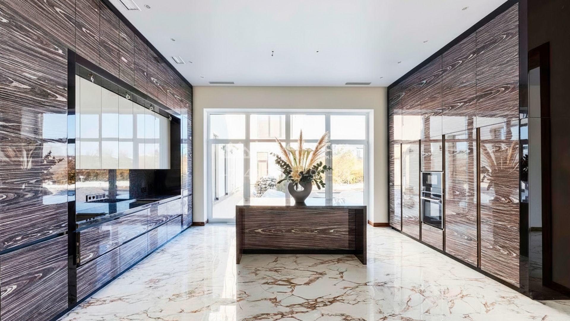 1-й уровень: гостиная, кухня, закрытая терраса, постирочная, 2 гардеробные, гостевой санузел, квартира для персонала, 2 гаража, бойлерная, SPA-зона — хамам, сауна, джакузи, выход к открытому бассейну с подогревом, зона отдыха.