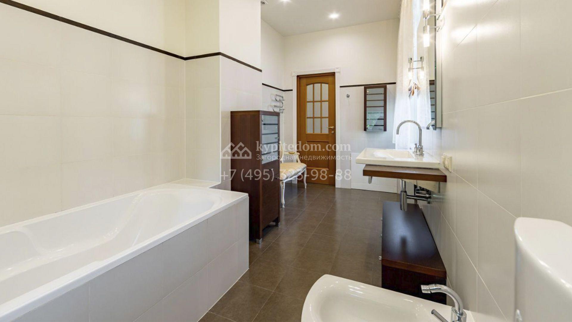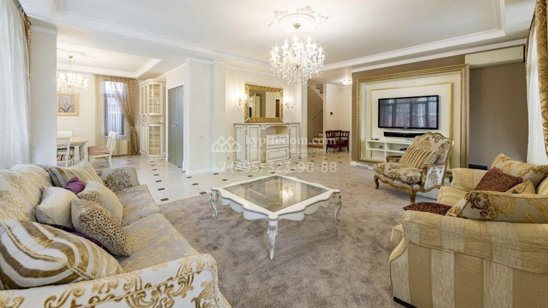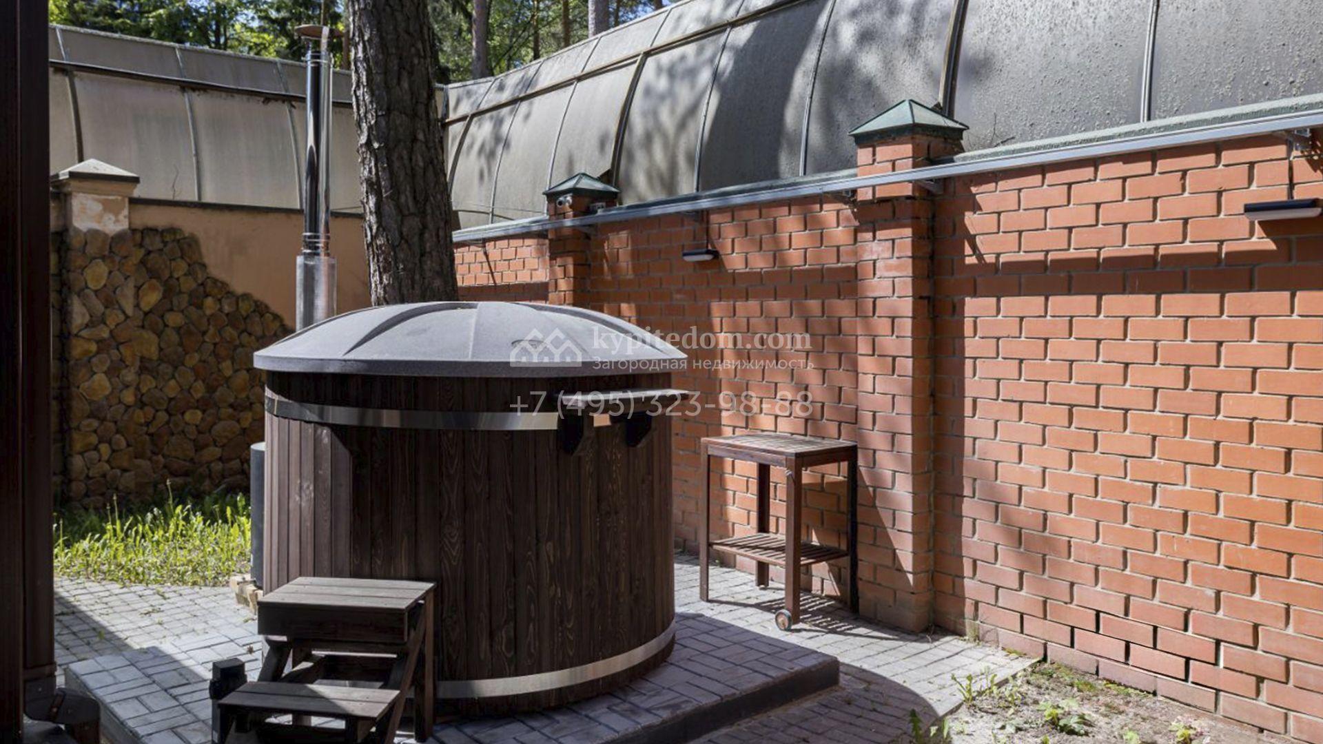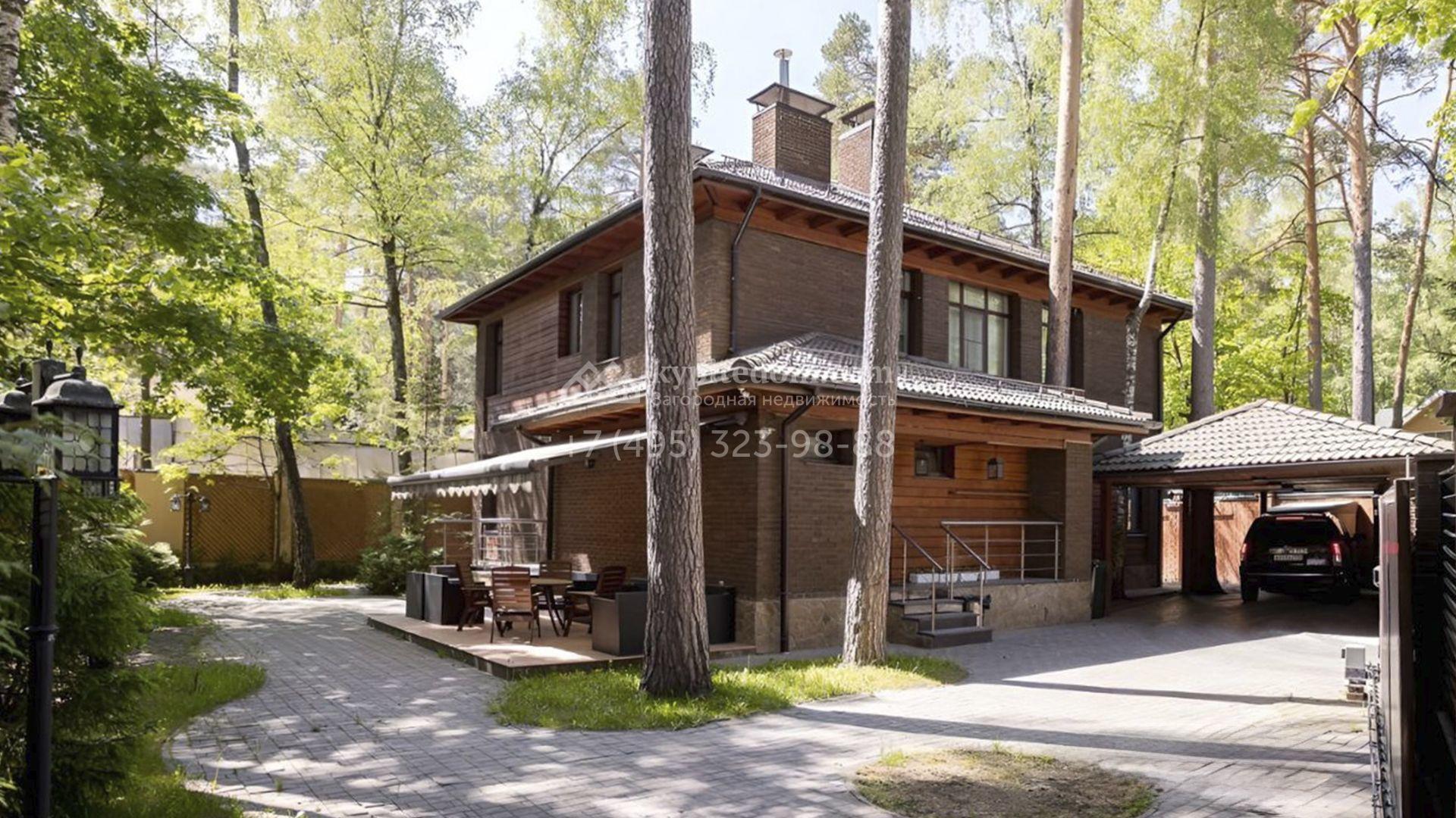 Загородный дом площадью 300 м² расположен на лесном участке 12 соток. Современный фасад облицован темной клинкерной плиткой и деревом. Интерьер выполнен в классическом стиле в светлых тонах, декорирован лепниной, позолотой, ажурными светильниками. В коттедже разместили 3 спальни, уютную гостиную с выходом в зимний сад, кухню, столовую, кабинет и тренажерный зал. На участке построен деревянный гостевой дом, выполнен ландшафтный дизайн, вымощены дорожки и оборудовано уличное освещение.