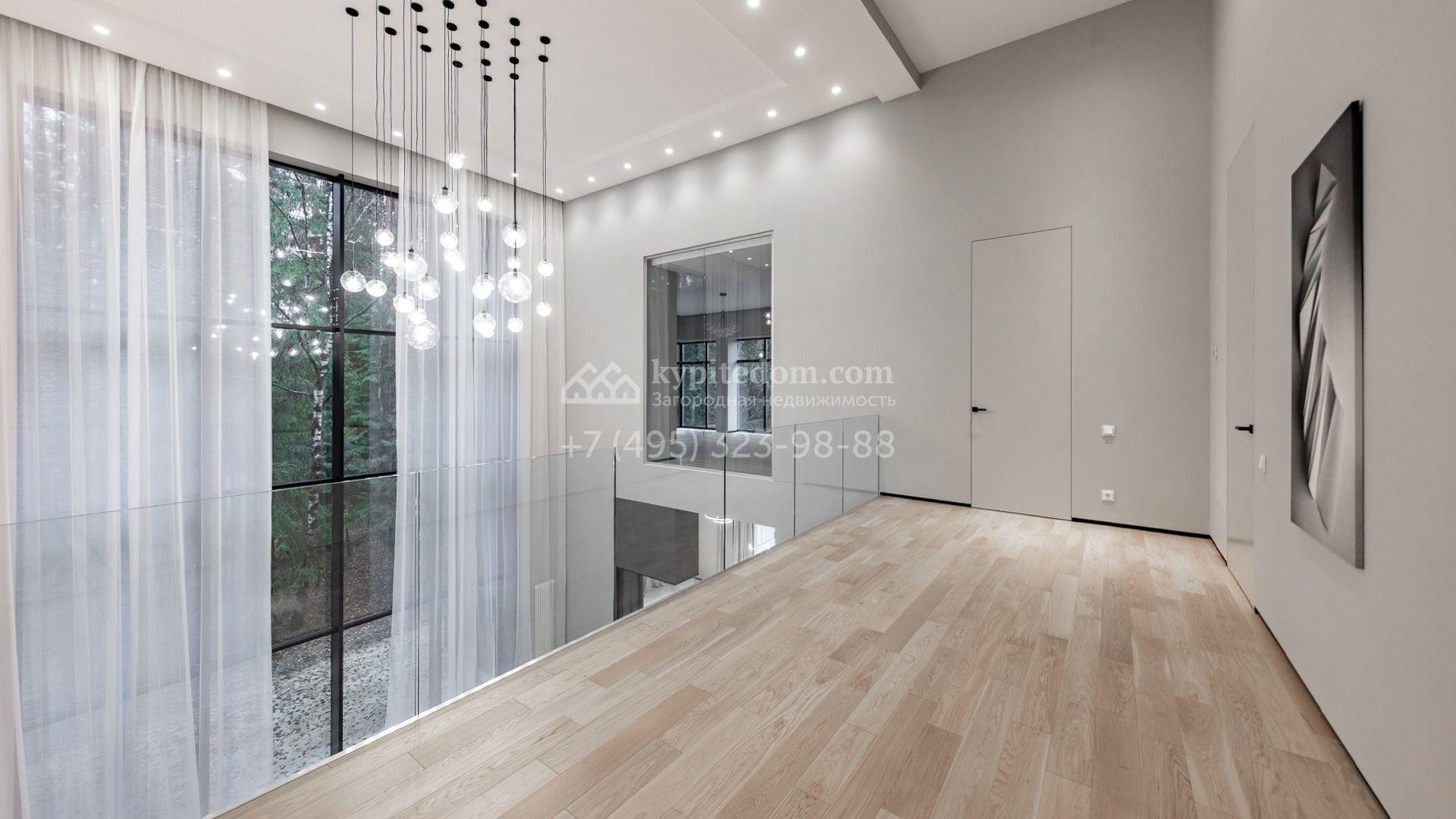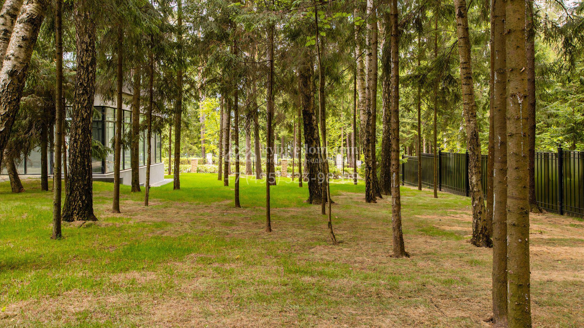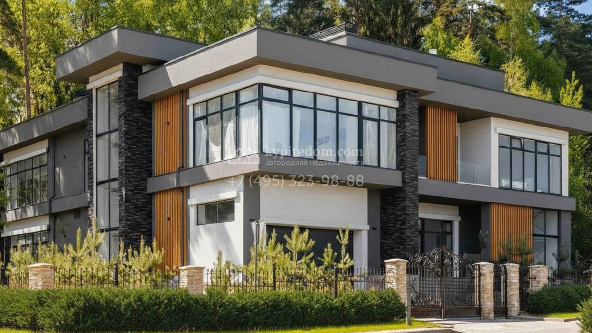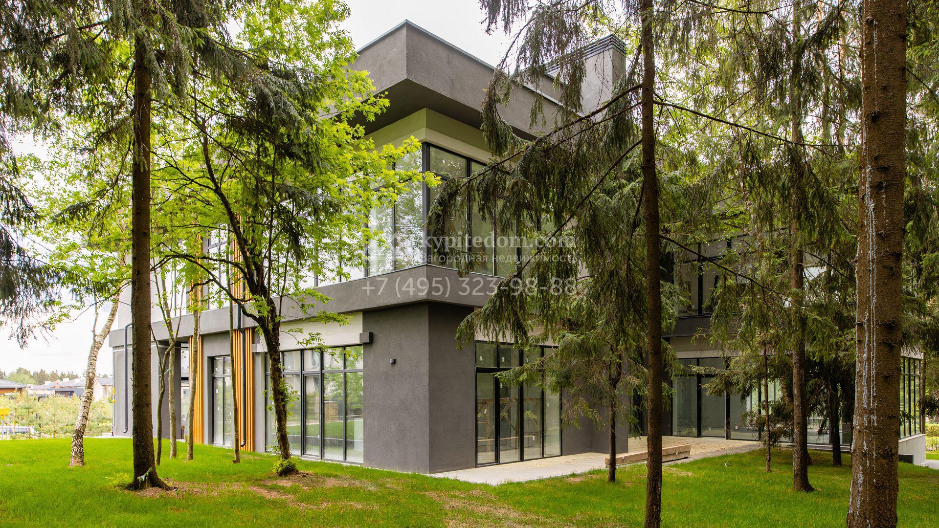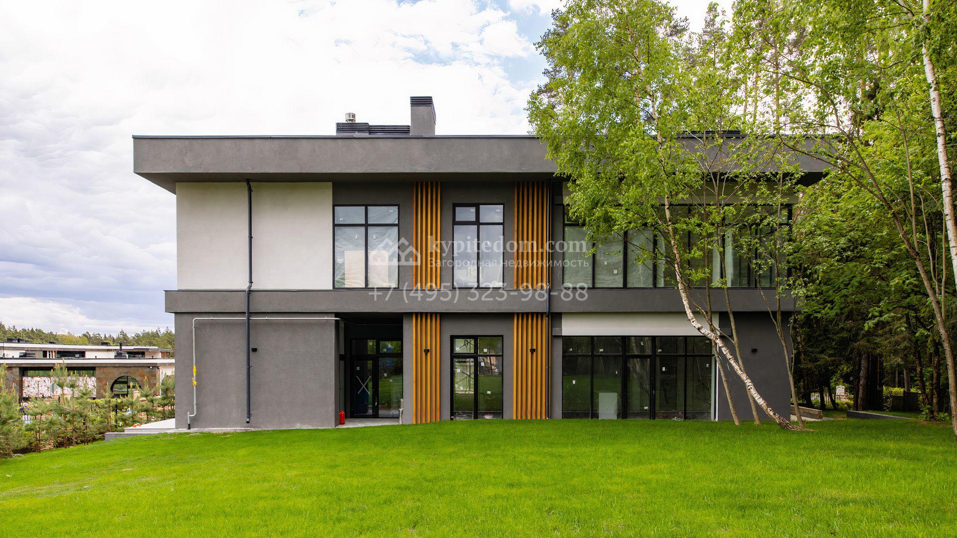 Загородный особняк площадью 600 м² расположен на просторном участке 24 сотки с многолетними соснами. Фасад с панорамными окнами выполнен в современном стиле и облицован штукатуркой, серой плиткой и декорирован вставками из дерева. В коттедже выполнена отделка «под ключ». Планировка дома включает 5 спален, гостиную, кухню, столовую, кабинет, тренажерный зал и SPA-зону с сауной. В контуре дома расположен двухместный гараж с квартирой для персонала. На участке можно выполнить ландшафтный дизайн и обустроить беседку с зоной барбекю.