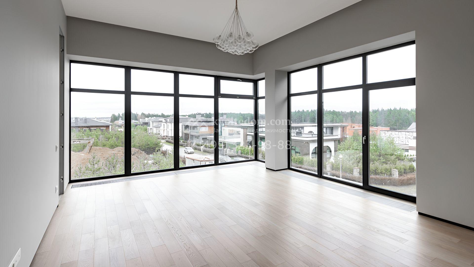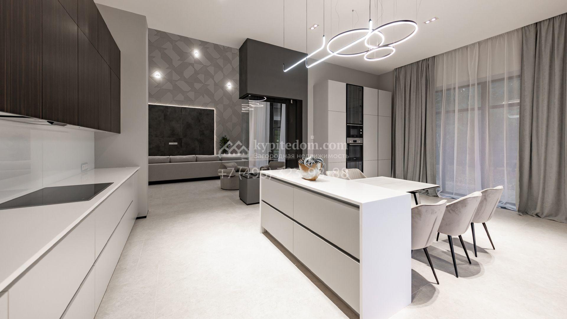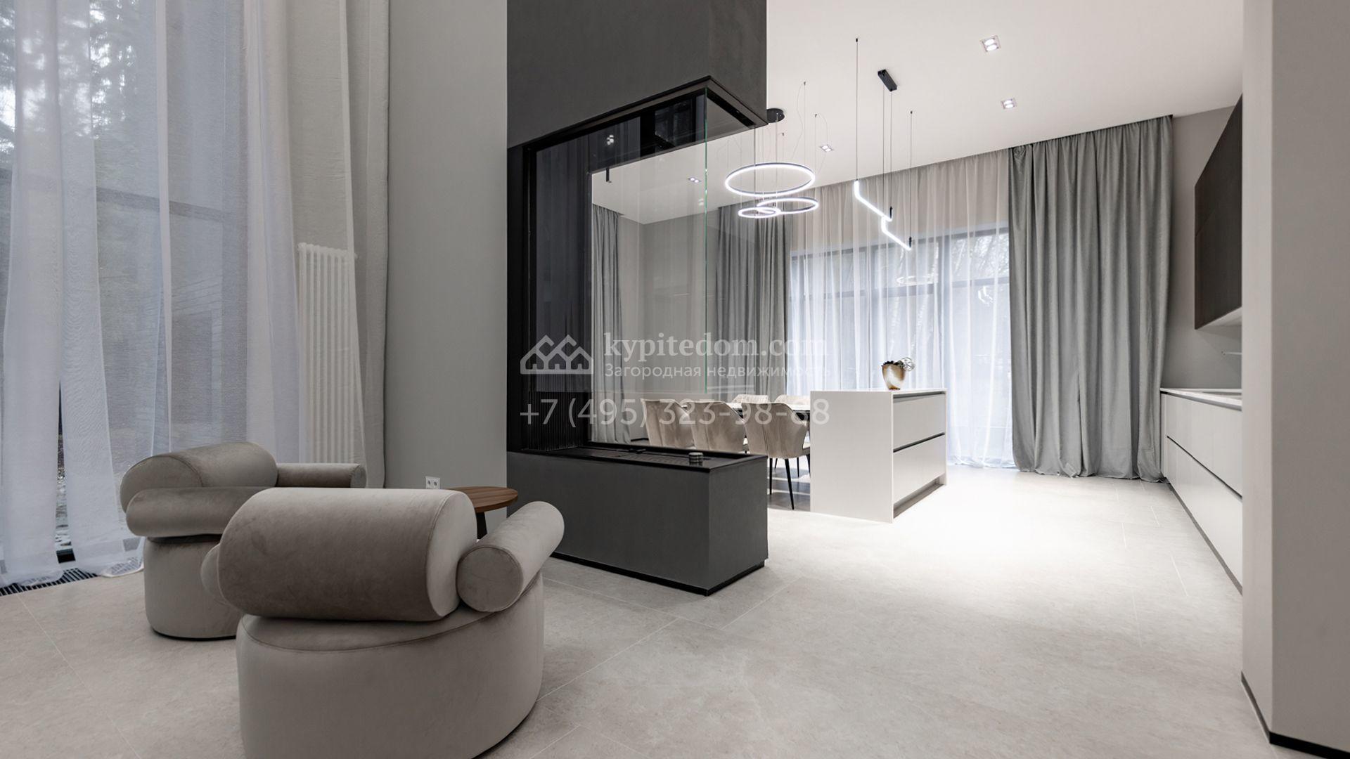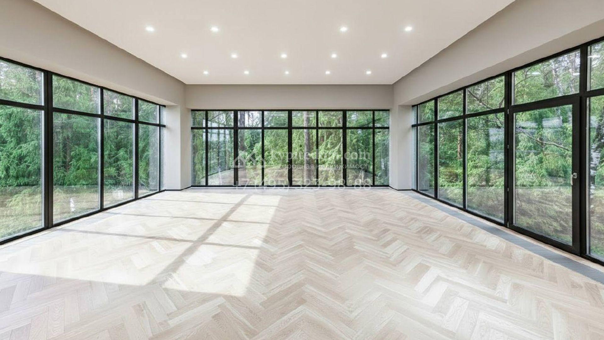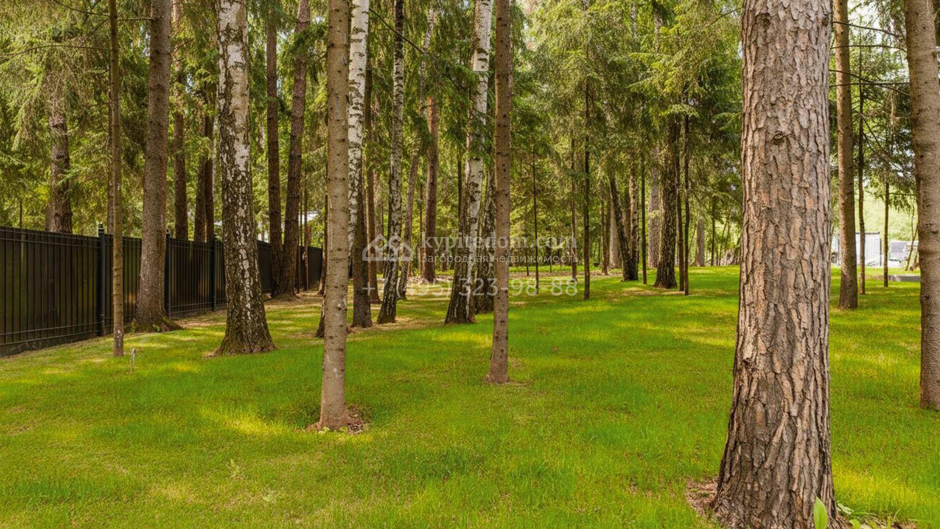 Загородный особняк площадью 600 м² расположен на просторном участке 24 сотки с многолетними соснами. Фасад с панорамными окнами выполнен в современном стиле и облицован штукатуркой, серой плиткой и декорирован вставками из дерева. В коттедже выполнена отделка «под ключ». Планировка дома включает 5 спален, гостиную, кухню, столовую, кабинет, тренажерный зал и SPA-зону с сауной. В контуре дома расположен двухместный гараж с квартирой для персонала. На участке можно выполнить ландшафтный дизайн и обустроить беседку с зоной барбекю.
