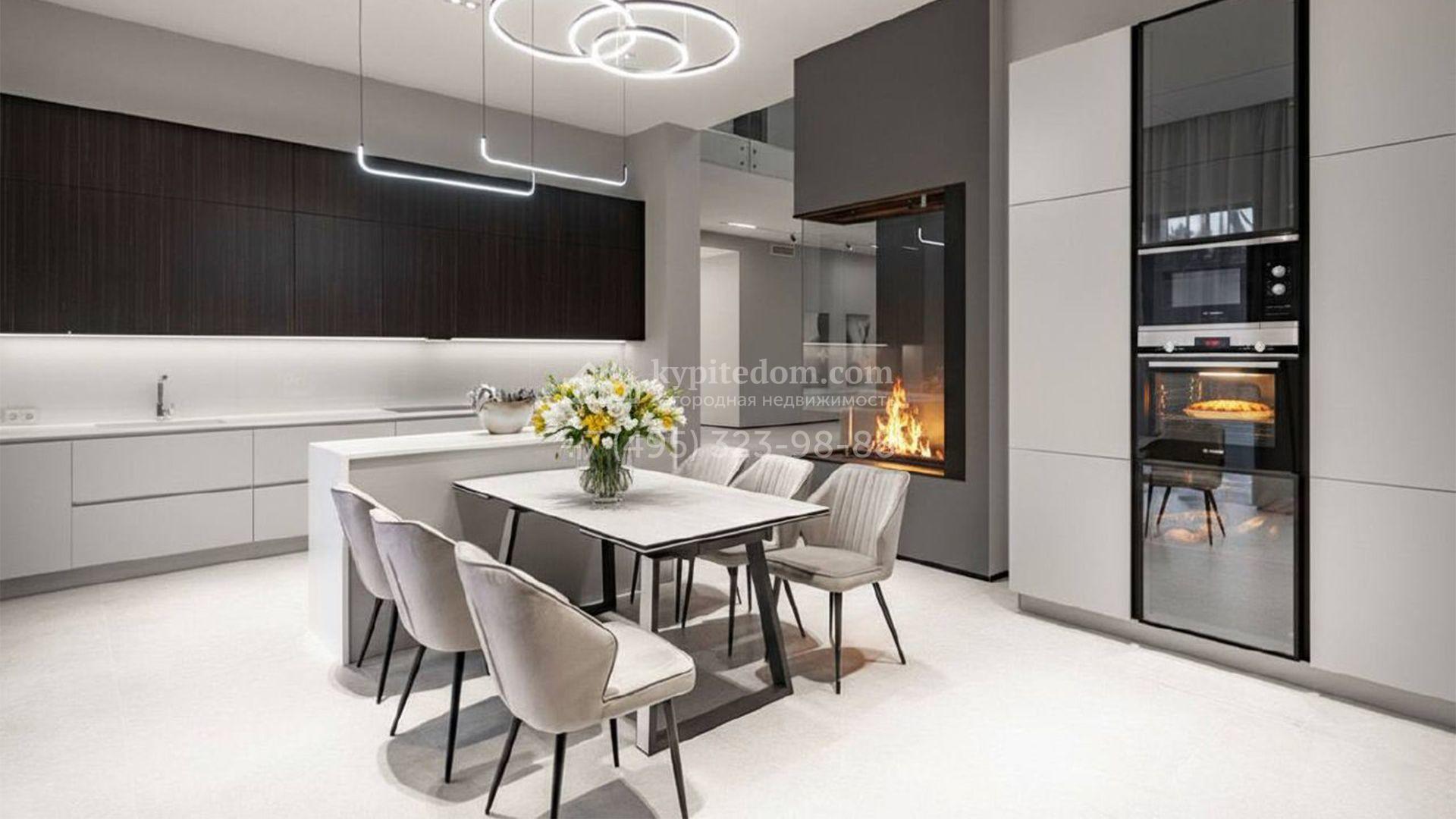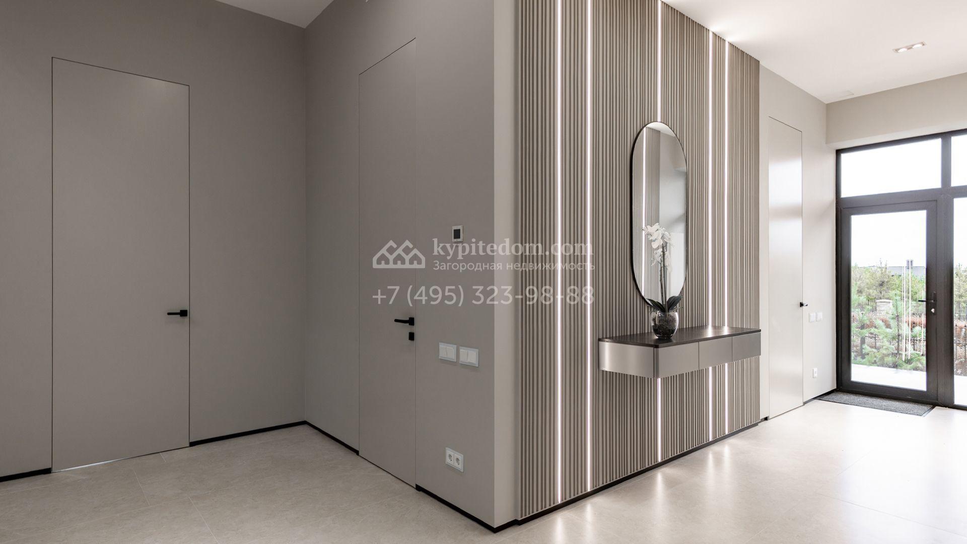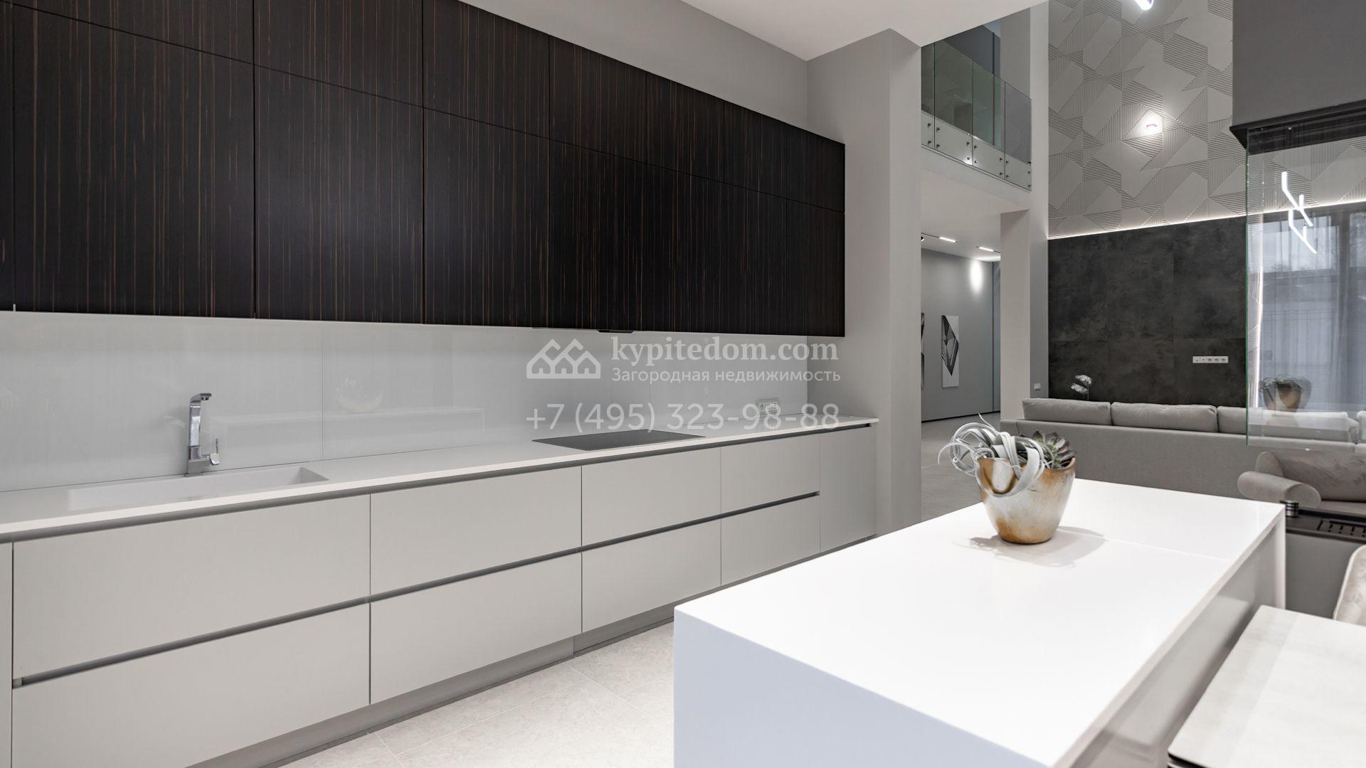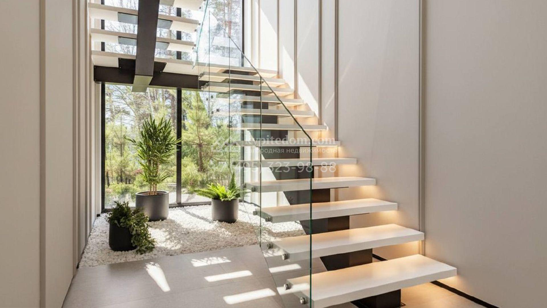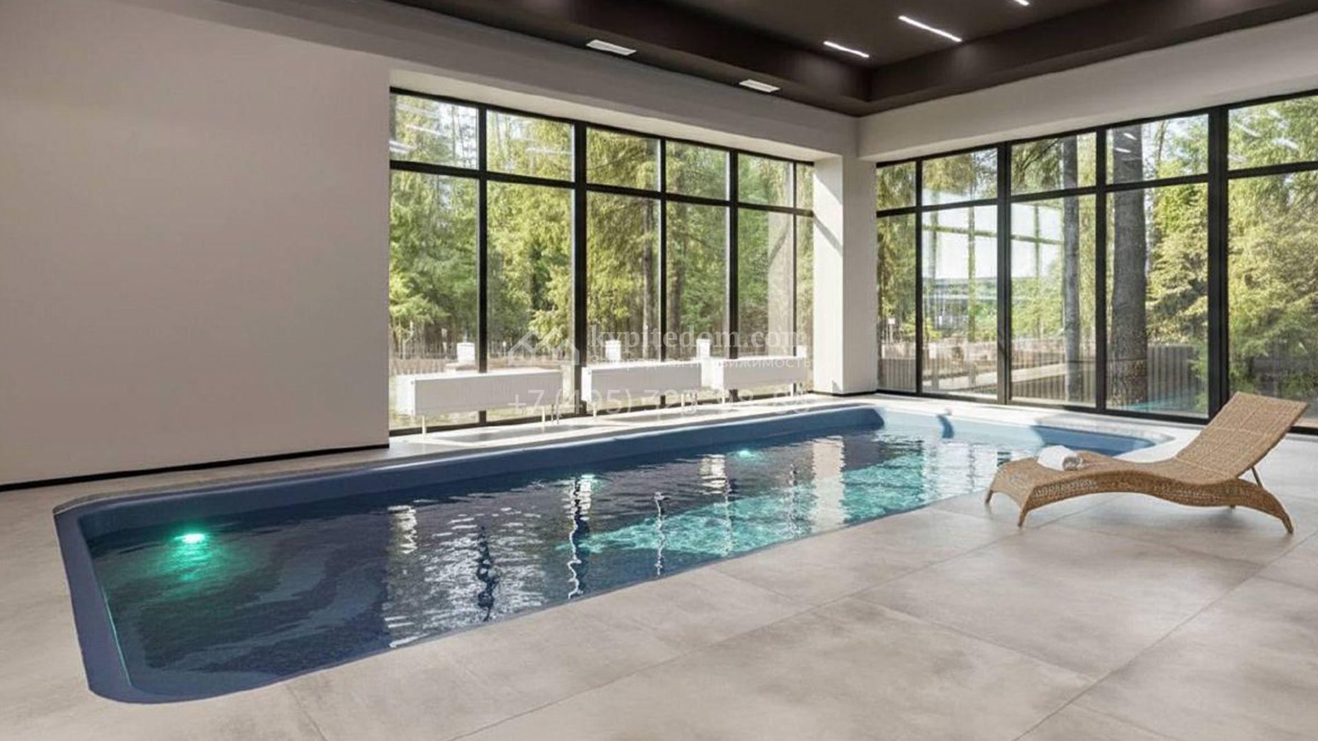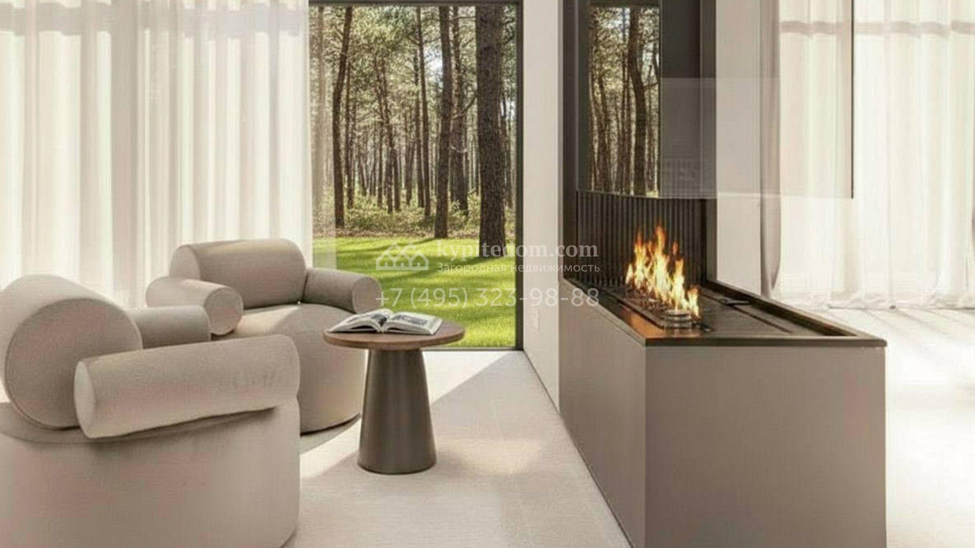 Загородный особняк площадью 600 м² расположен на просторном участке 24 сотки с многолетними соснами. Фасад с панорамными окнами выполнен в современном стиле и облицован штукатуркой, серой плиткой и декорирован вставками из дерева. В коттедже выполнена отделка «под ключ». Планировка дома включает 5 спален, гостиную, кухню, столовую, кабинет, тренажерный зал и SPA-зону с сауной. В контуре дома расположен двухместный гараж с квартирой для персонала. На участке можно выполнить ландшафтный дизайн и обустроить беседку с зоной барбекю.