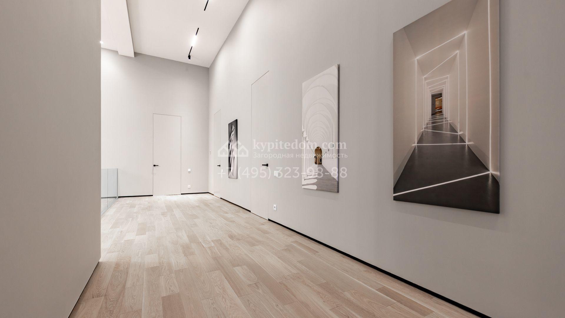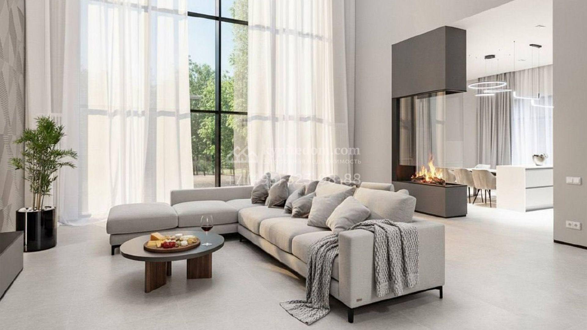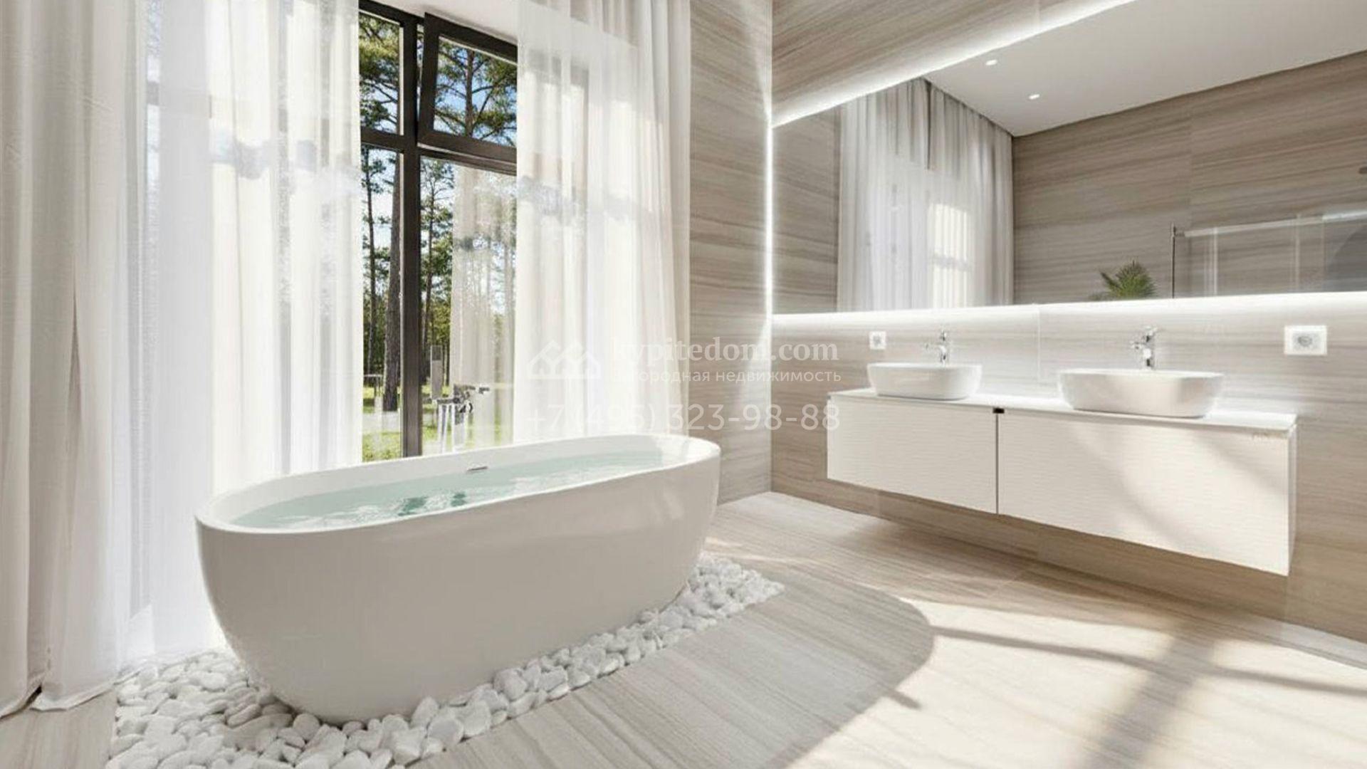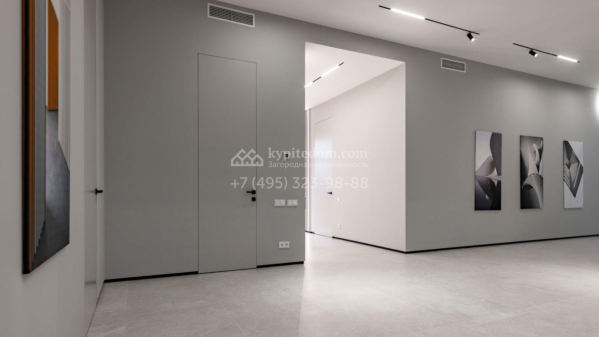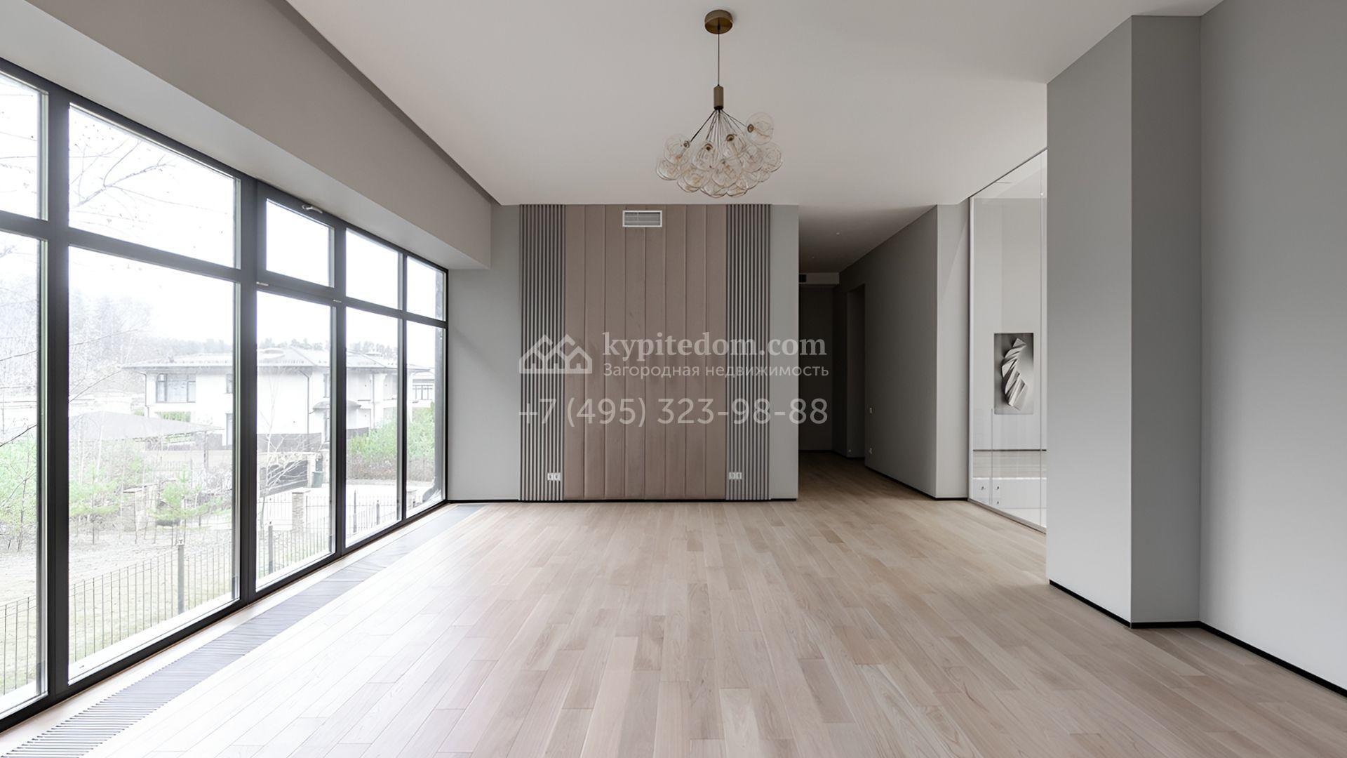 Загородный особняк площадью 600 м² расположен на просторном участке 24 сотки с многолетними соснами. Фасад с панорамными окнами выполнен в современном стиле и облицован штукатуркой, серой плиткой и декорирован вставками из дерева. В коттедже выполнена отделка «под ключ». Планировка дома включает 5 спален, гостиную, кухню, столовую, кабинет, тренажерный зал и SPA-зону с сауной. В контуре дома расположен двухместный гараж с квартирой для персонала. На участке можно выполнить ландшафтный дизайн и обустроить беседку с зоной барбекю.