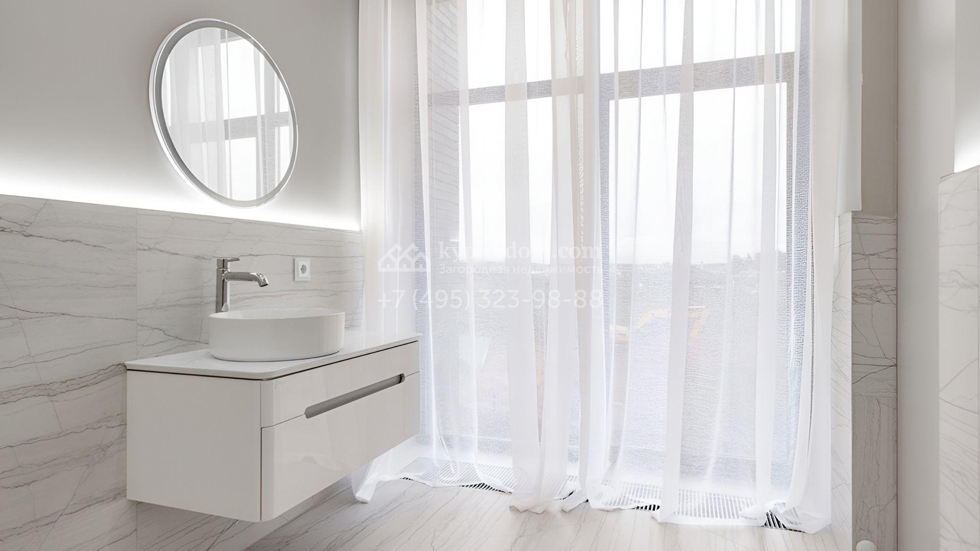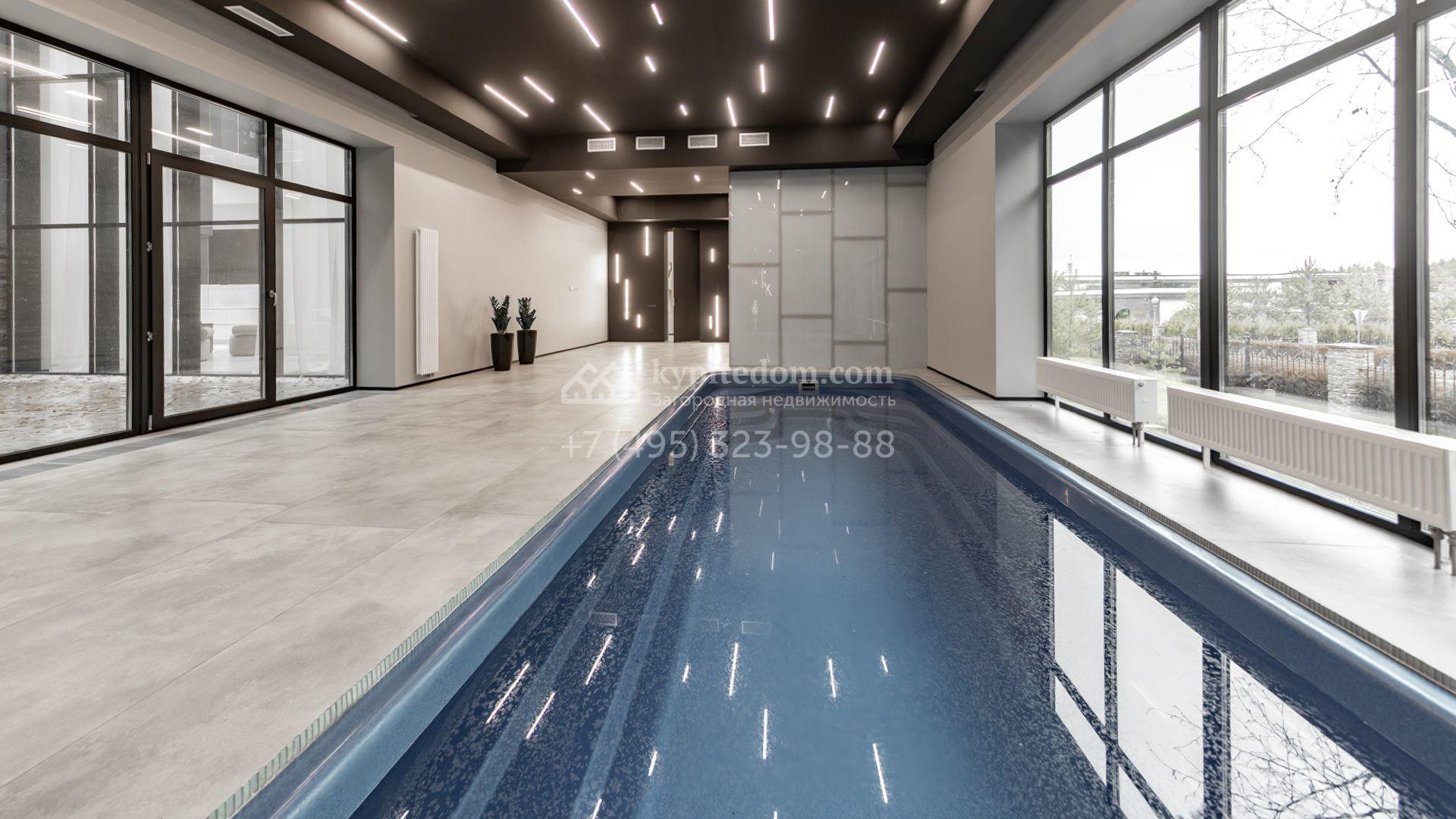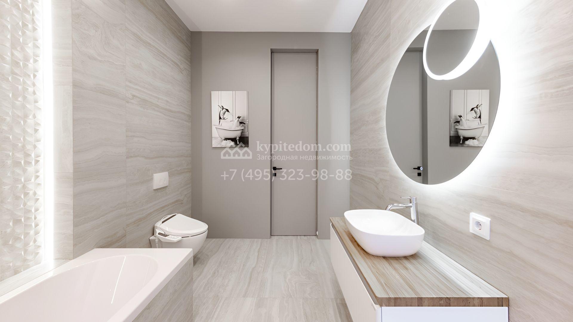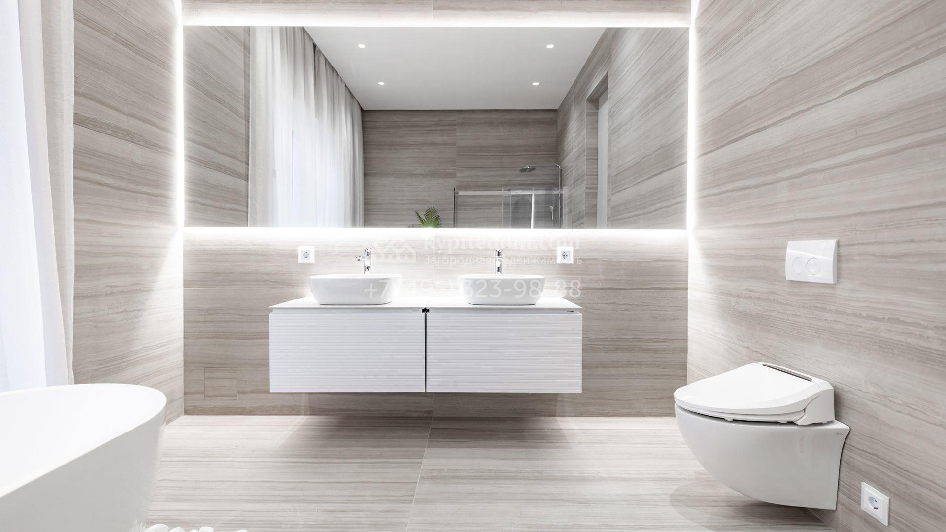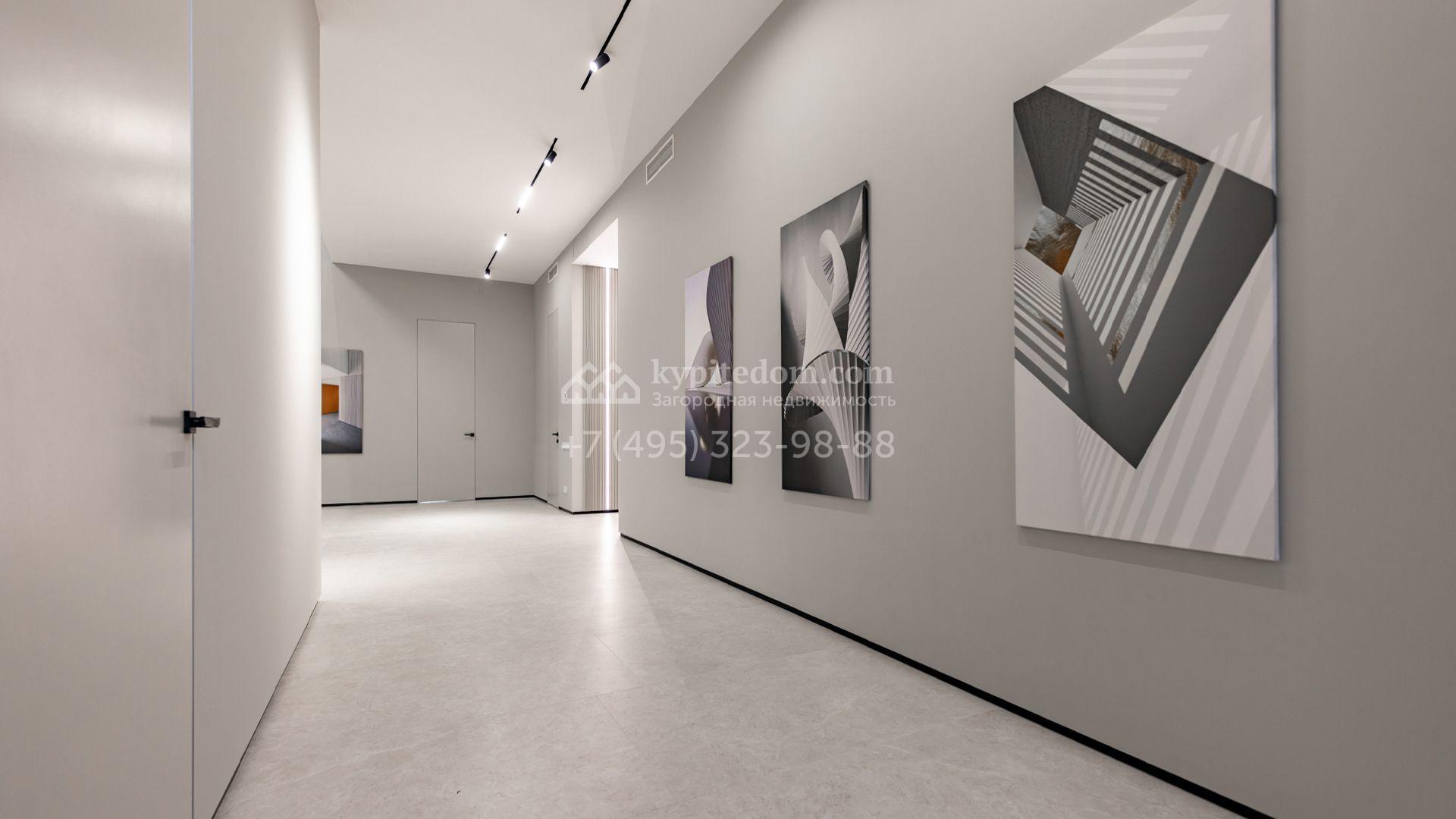 Загородный особняк площадью 600 м² расположен на просторном участке 24 сотки с многолетними соснами. Фасад с панорамными окнами выполнен в современном стиле и облицован штукатуркой, серой плиткой и декорирован вставками из дерева. В коттедже выполнена отделка «под ключ». Планировка дома включает 5 спален, гостиную, кухню, столовую, кабинет, тренажерный зал и SPA-зону с сауной. В контуре дома расположен двухместный гараж с квартирой для персонала. На участке можно выполнить ландшафтный дизайн и обустроить беседку с зоной барбекю.