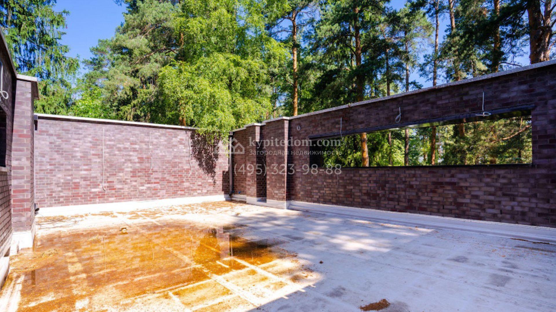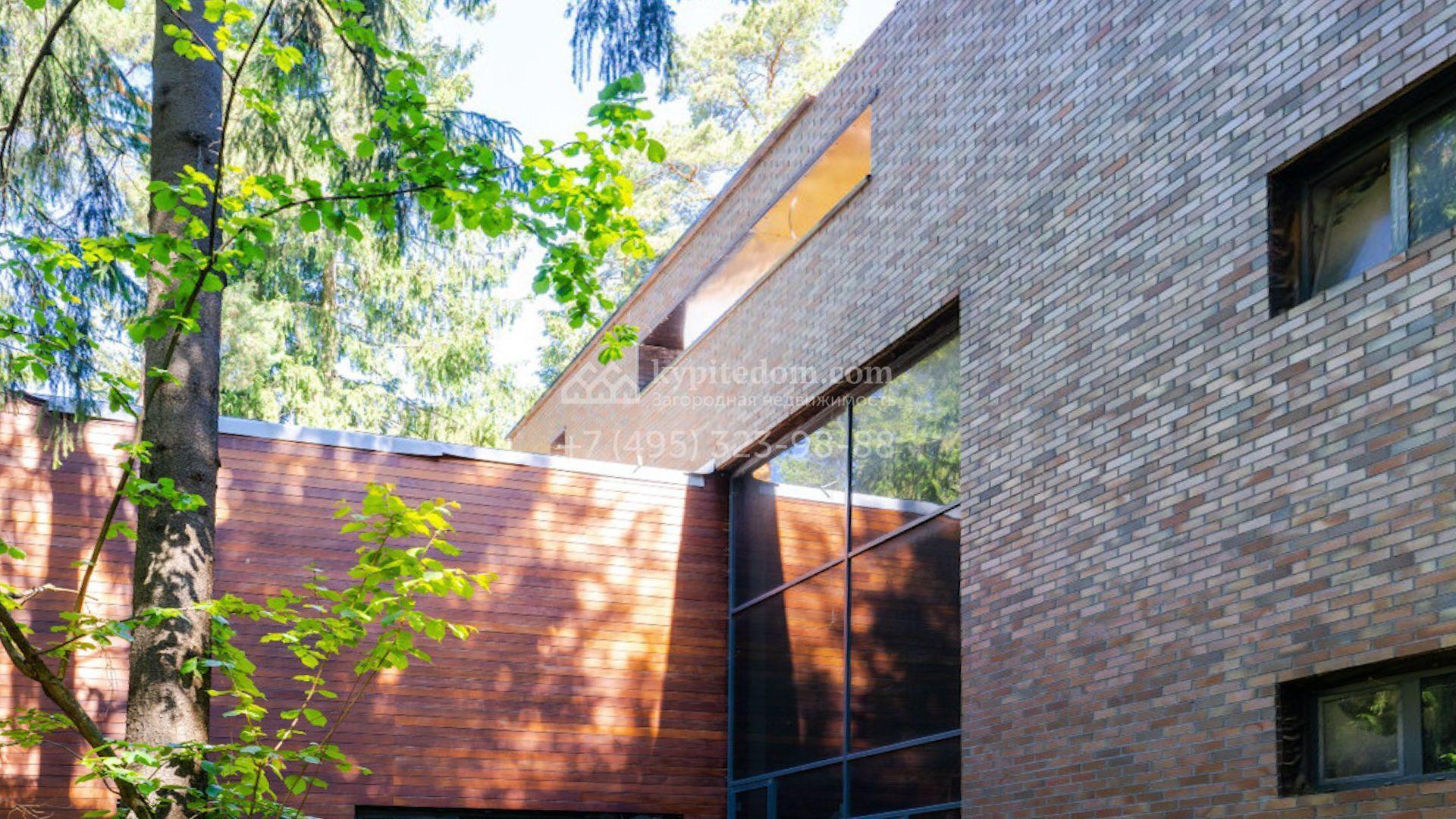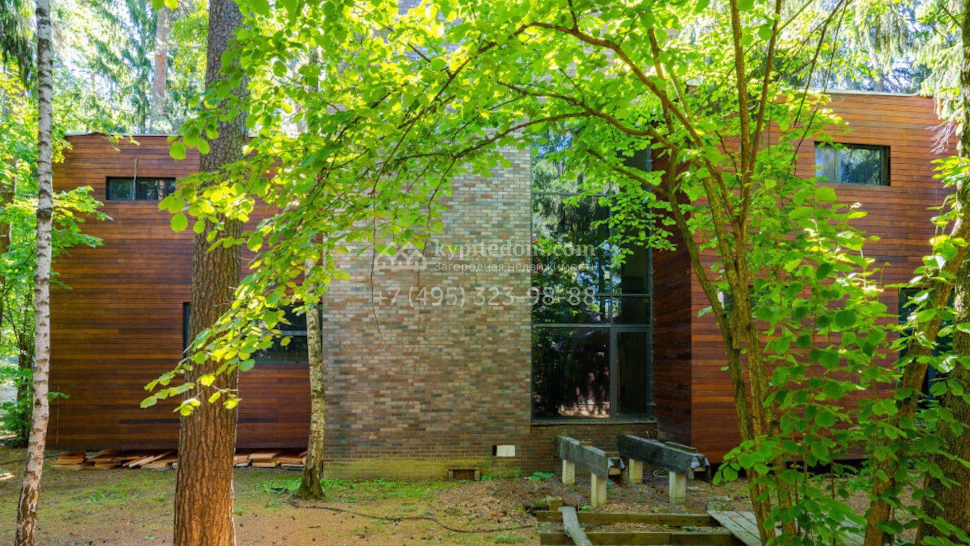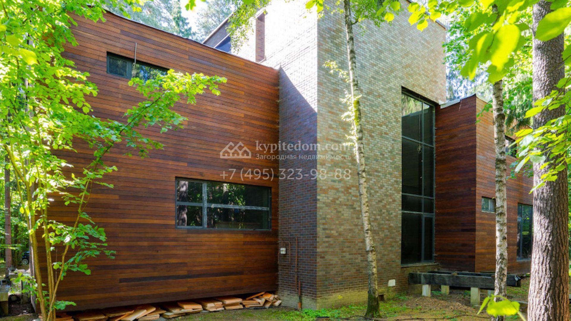 Загородный дом площадью 450 м² построен на участке 21 сотка с лесными деревьями без ландшафтного дизайна. Фасад в современном стиле с большой площадью остекления облицован красным клинкерным кирпичом и деревом. В коттедже без отделки можно реализовать индивидуальный дизайн-проект. Планировкой резиденции предусмотрены 5 спален, гостиная со вторым светом и выходом на террасу, кухня и SPA-зона с сауной. На территории расположен гараж на 2 машины.