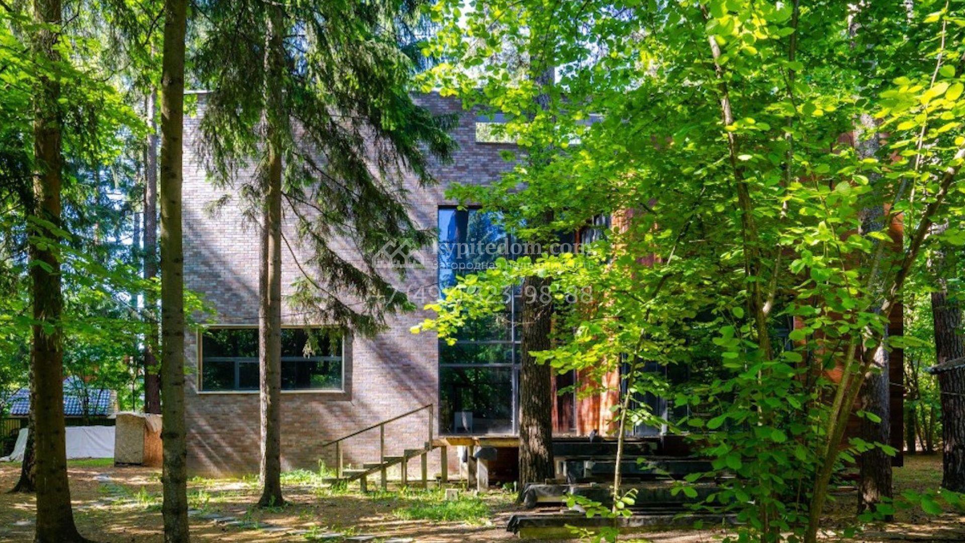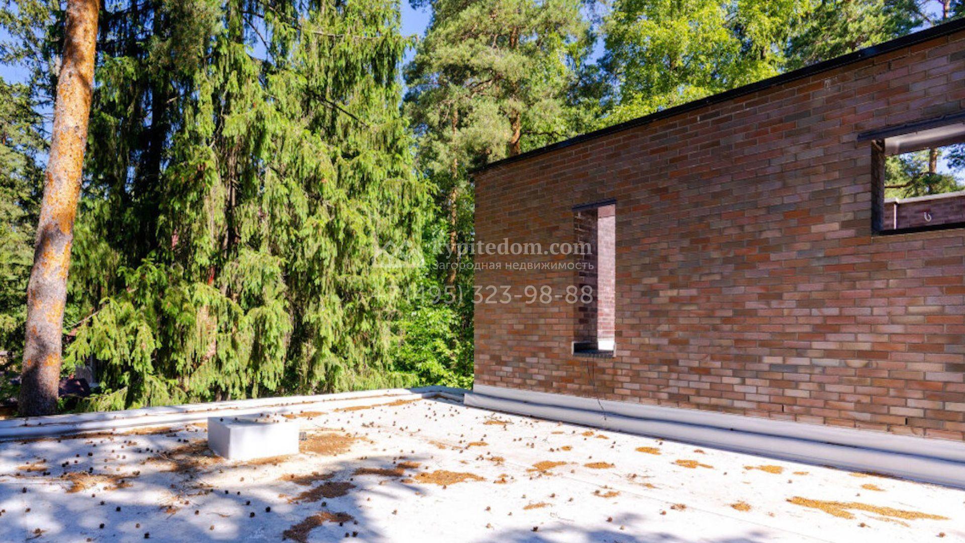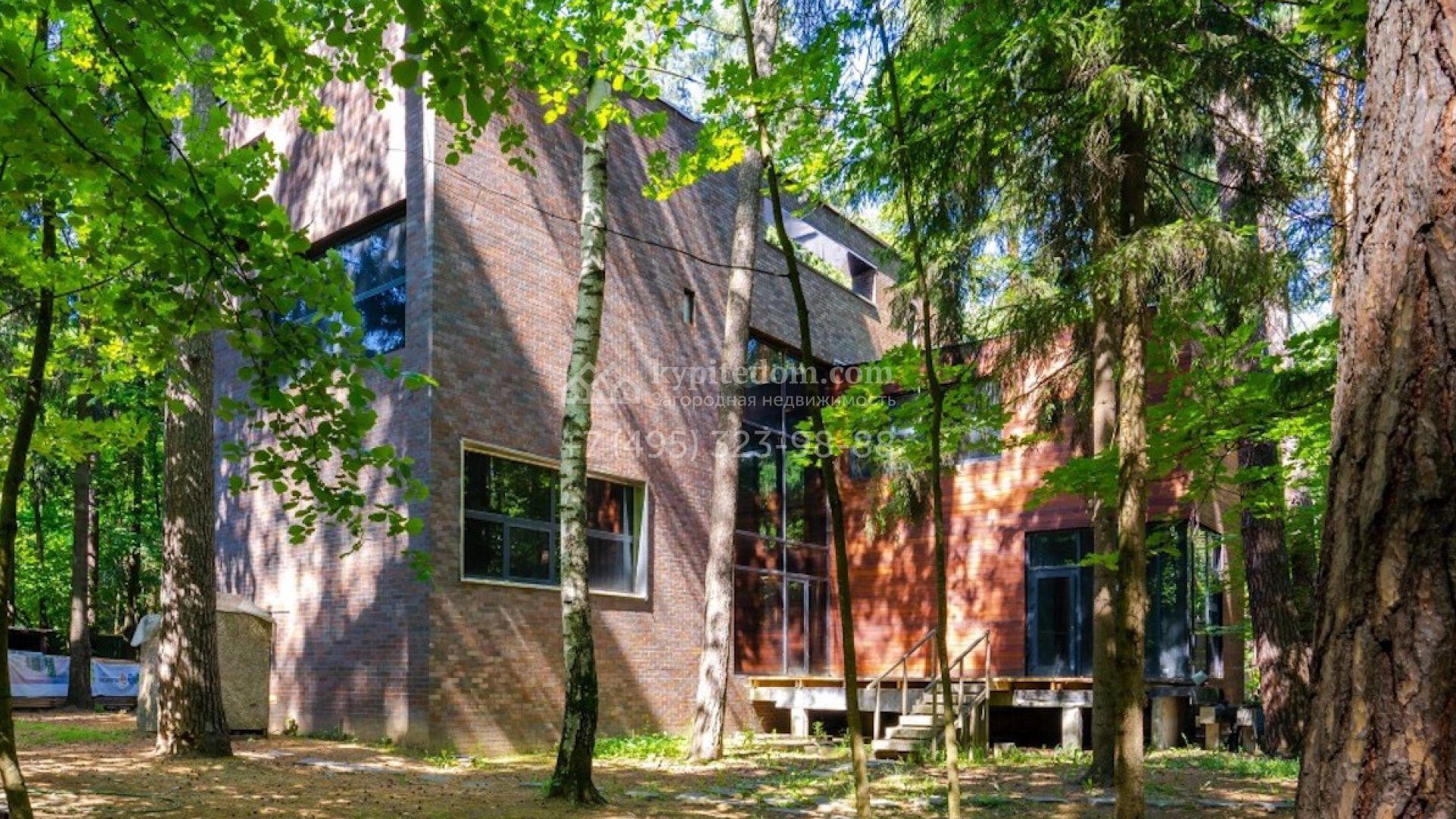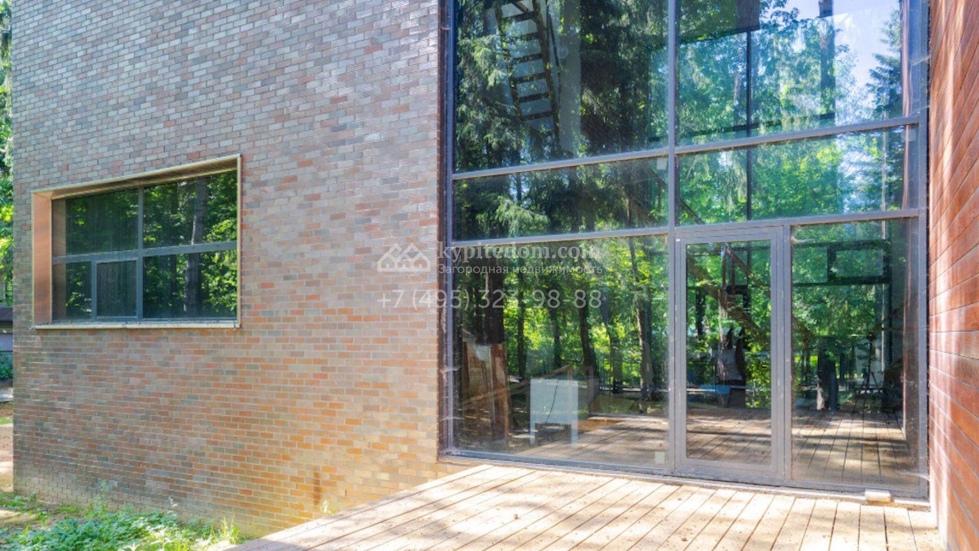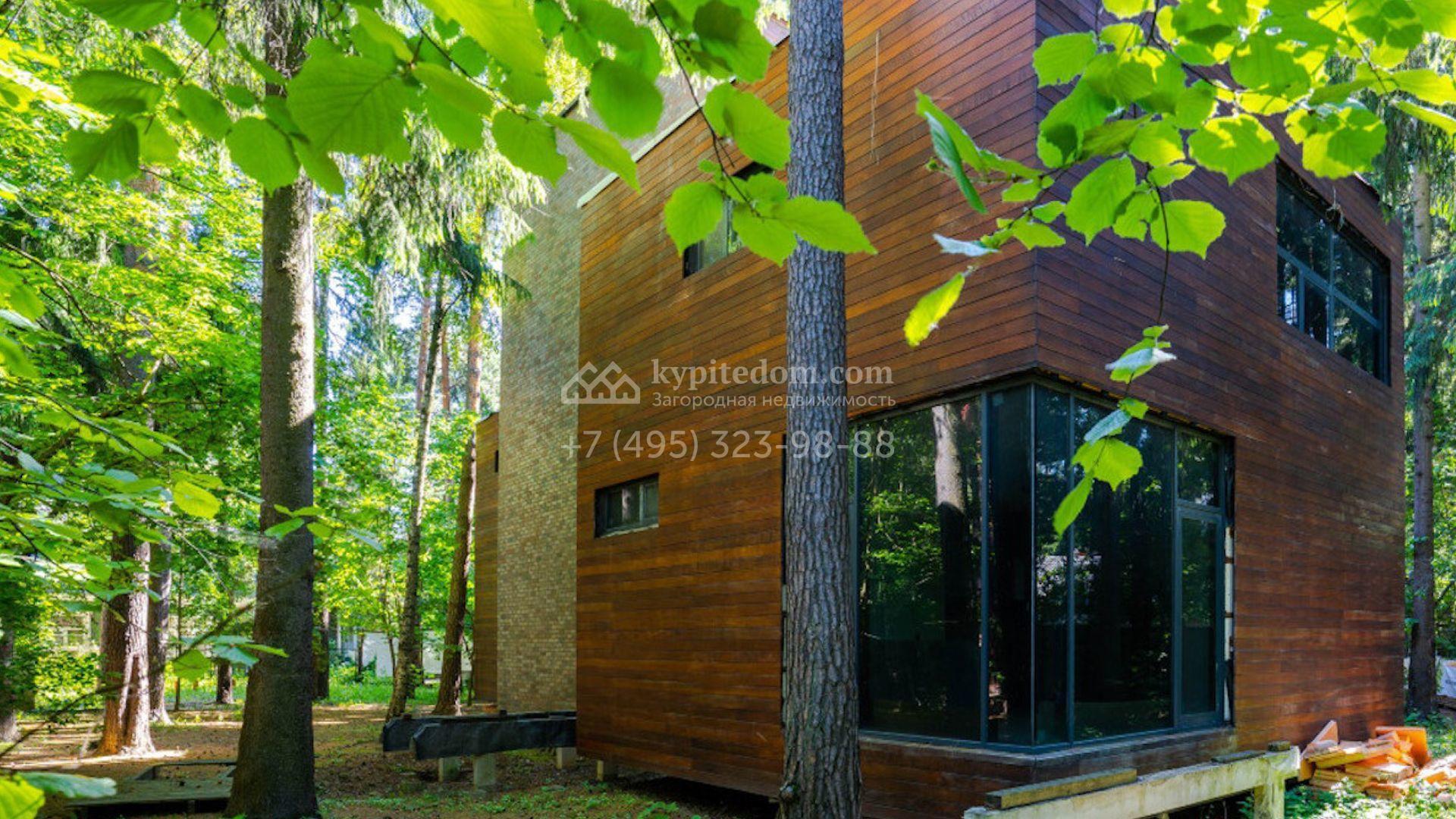 Загородный дом площадью 450 м² построен на участке 21 сотка с лесными деревьями без ландшафтного дизайна. Фасад в современном стиле с большой площадью остекления облицован красным клинкерным кирпичом и деревом. В коттедже без отделки можно реализовать индивидуальный дизайн-проект. Планировкой резиденции предусмотрены 5 спален, гостиная со вторым светом и выходом на террасу, кухня и SPA-зона с сауной. На территории расположен гараж на 2 машины.