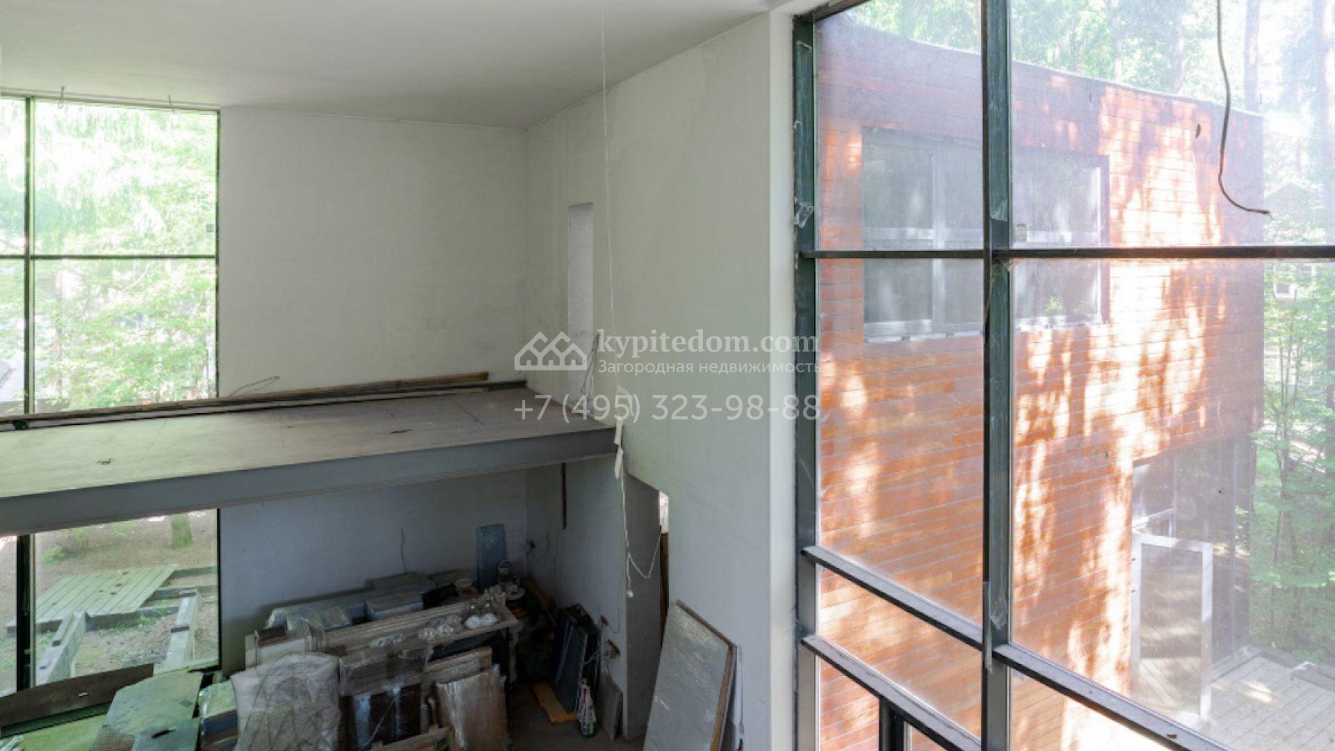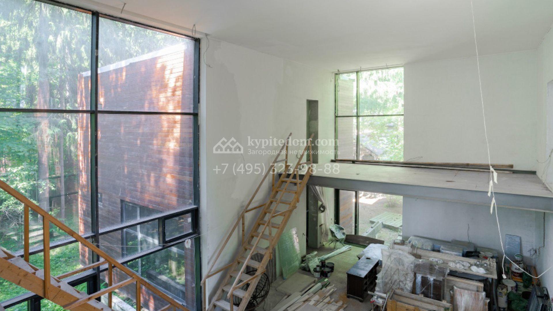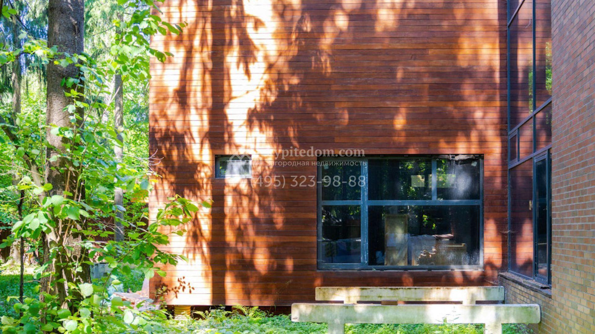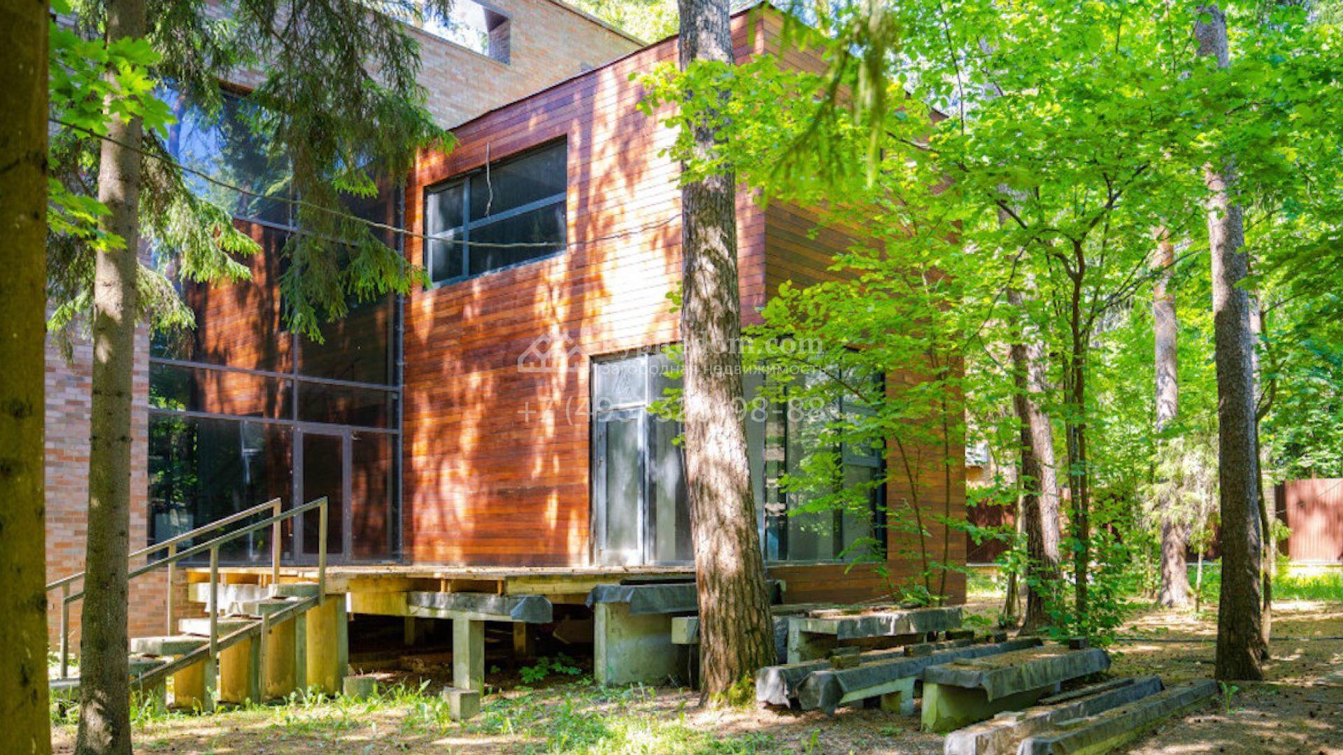 Загородный дом площадью 450 м² построен на участке 21 сотка с лесными деревьями без ландшафтного дизайна. Фасад в современном стиле с большой площадью остекления облицован красным клинкерным кирпичом и деревом. В коттедже без отделки можно реализовать индивидуальный дизайн-проект. Планировкой резиденции предусмотрены 5 спален, гостиная со вторым светом и выходом на террасу, кухня и SPA-зона с сауной. На территории расположен гараж на 2 машины.