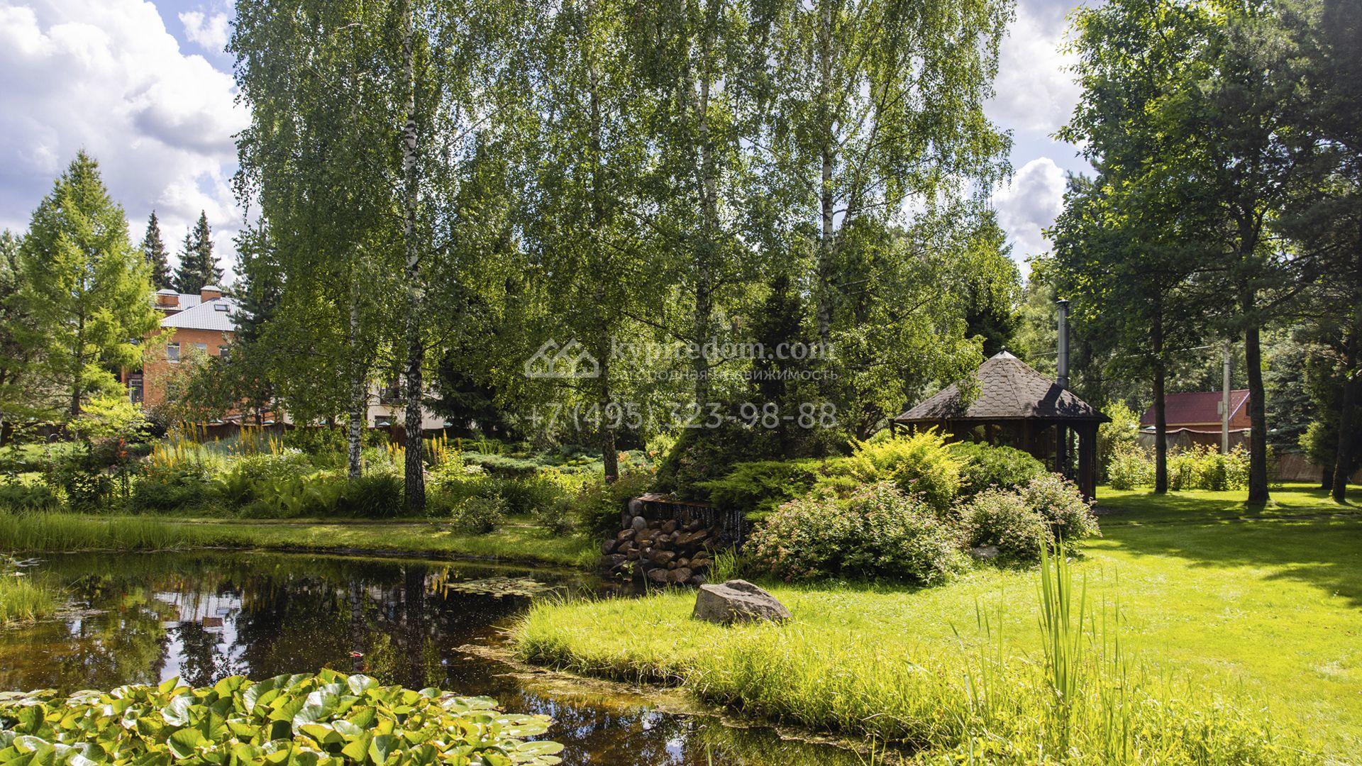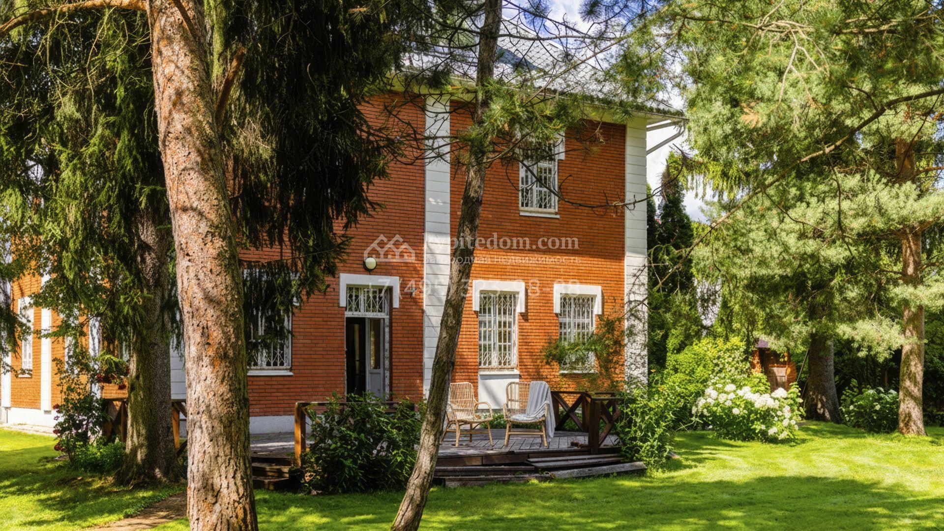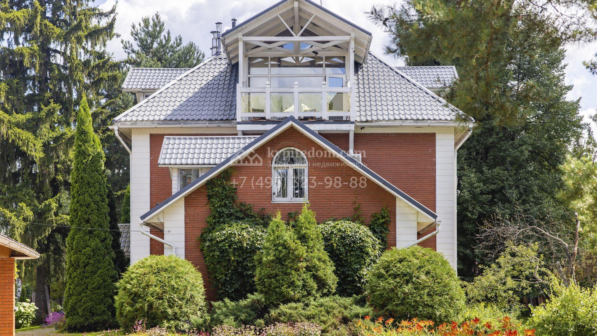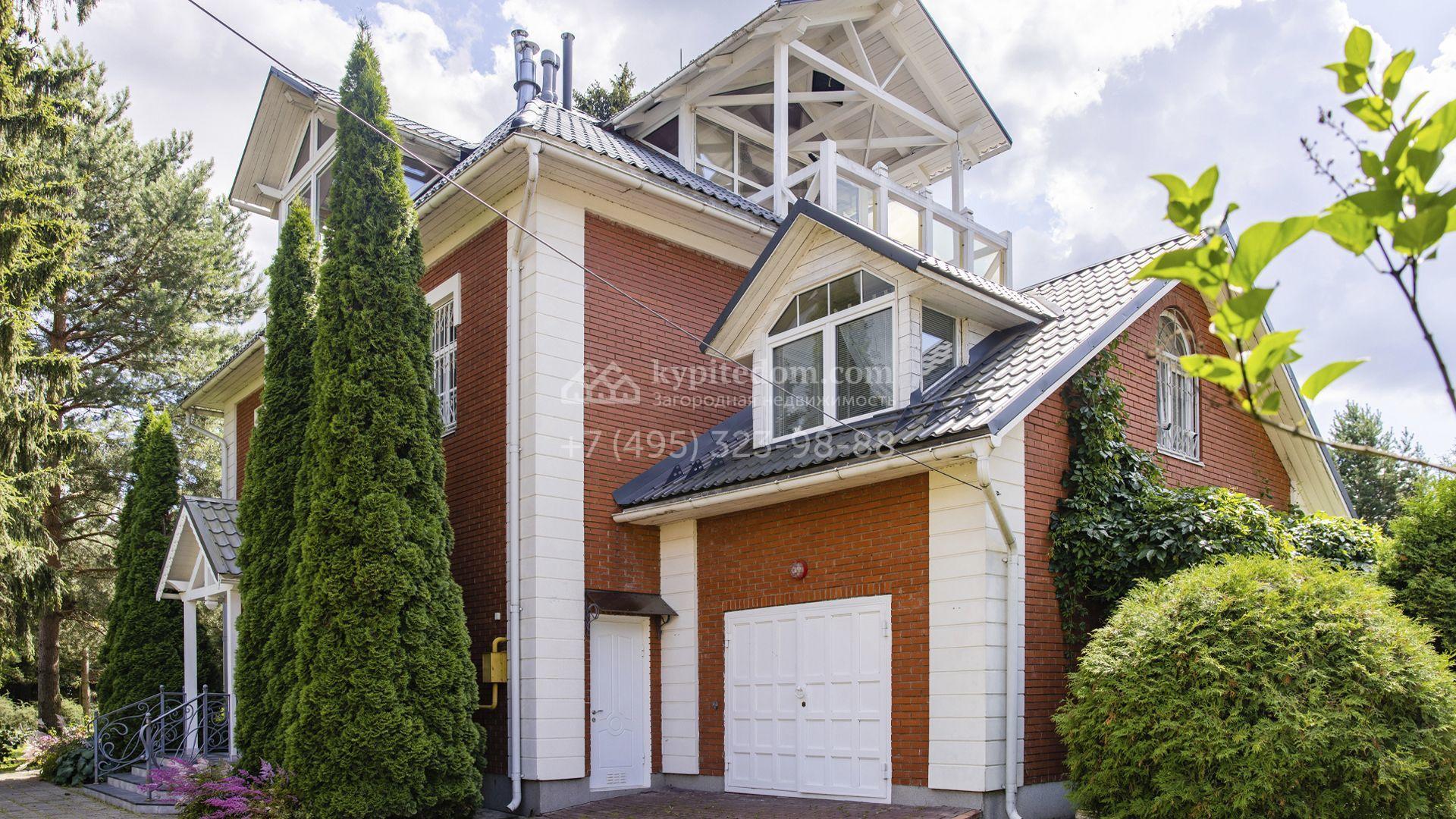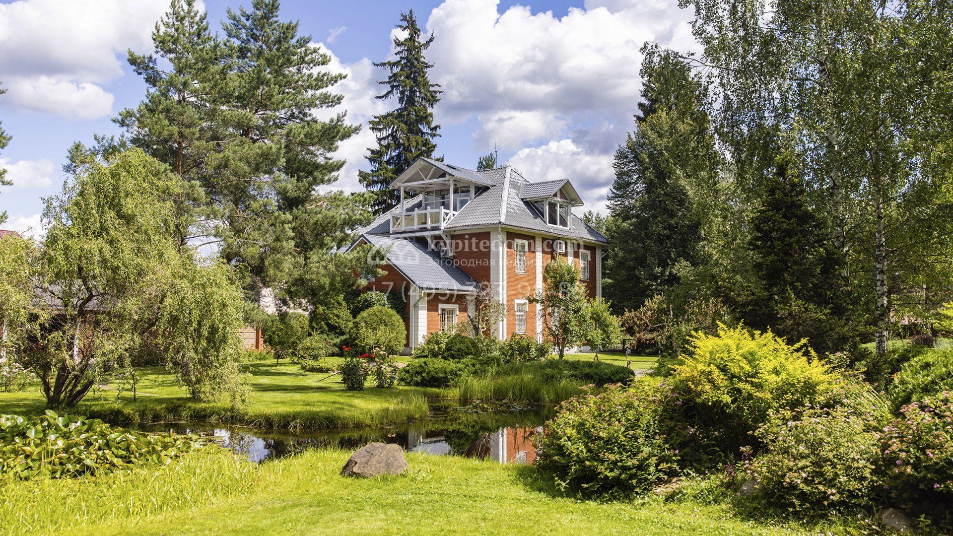 Загородный дом площадью 350 м² построен на просторном участке 66 соток с многолетними соснами и березами. Фасад здания облицован красным клинкерным кирпичом, декорирован белыми вставками и коваными элементами. Интерьер оформлен в пастельных оттенках, создающих атмосферу уюта. Планировка коттеджа включает 3 спальни, кухню-гостиную и пространство мансарды с хаммамом, кабинетом, зоной отдыха с бильярдной и мини-кухней. В контуре дома расположен гараж. Лесной участок облагорожен ландшафтным дизайном — вымощены дорожки, высажены цветы и кустарники, засеян газон, также на территории расположены теннисный корт и хозблок. Из деревянной беседки с дровяным камином открывается вид на собственный пруд с водопадом.
