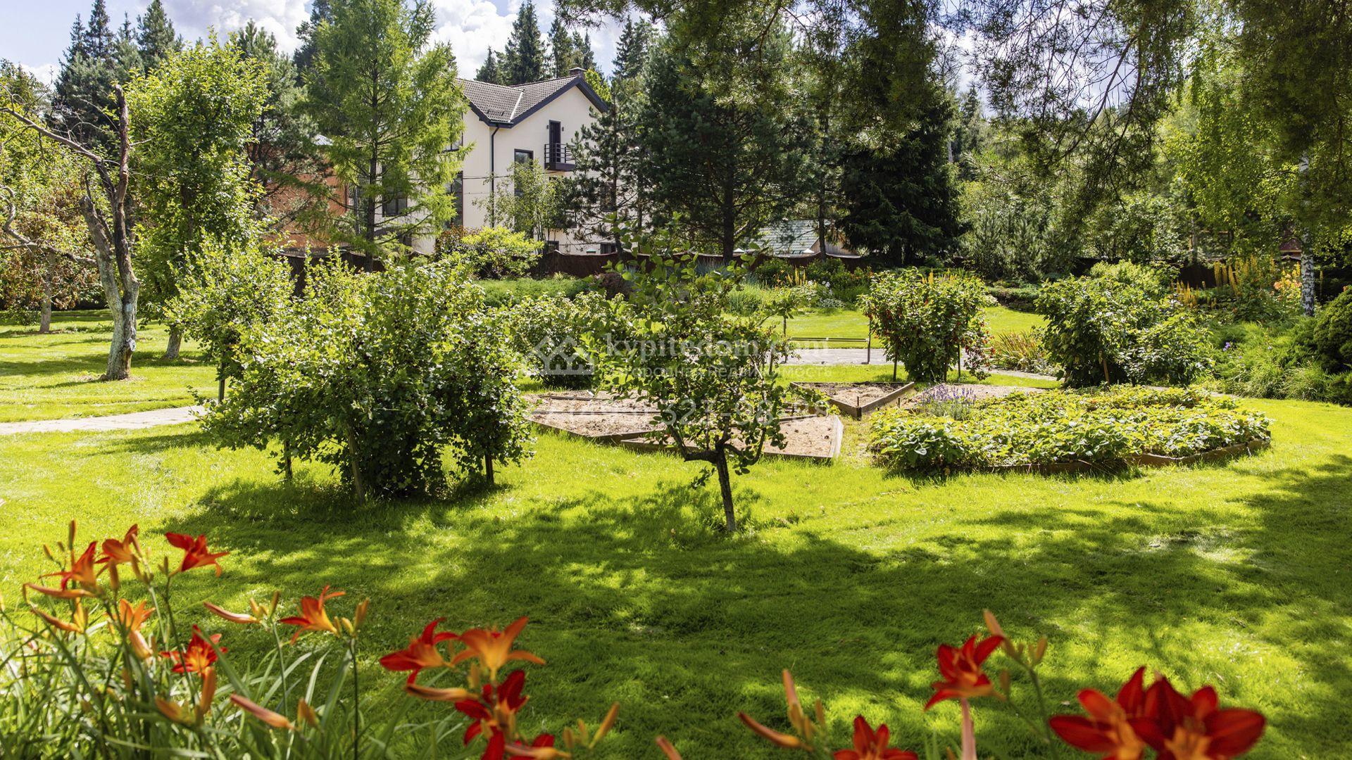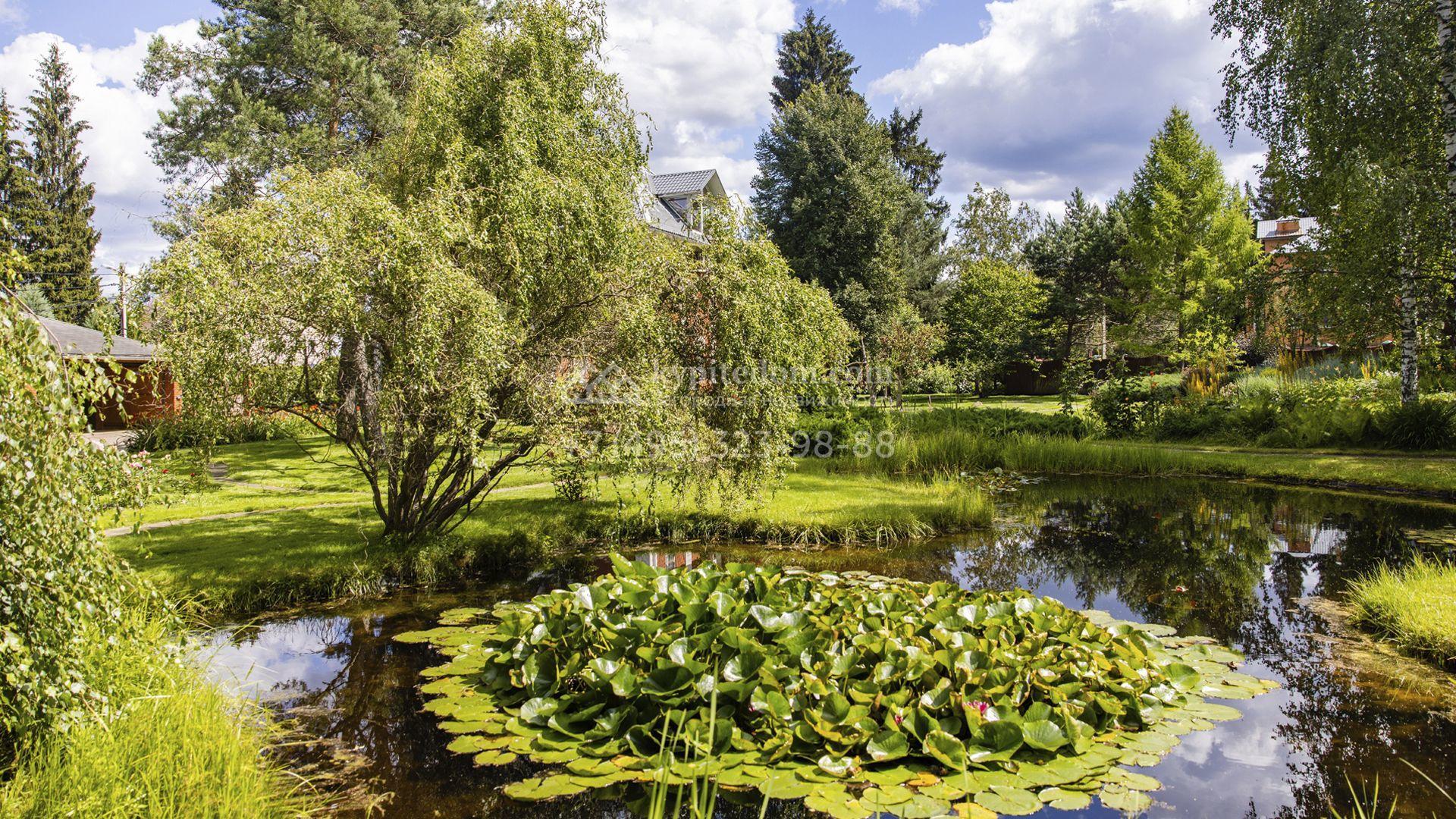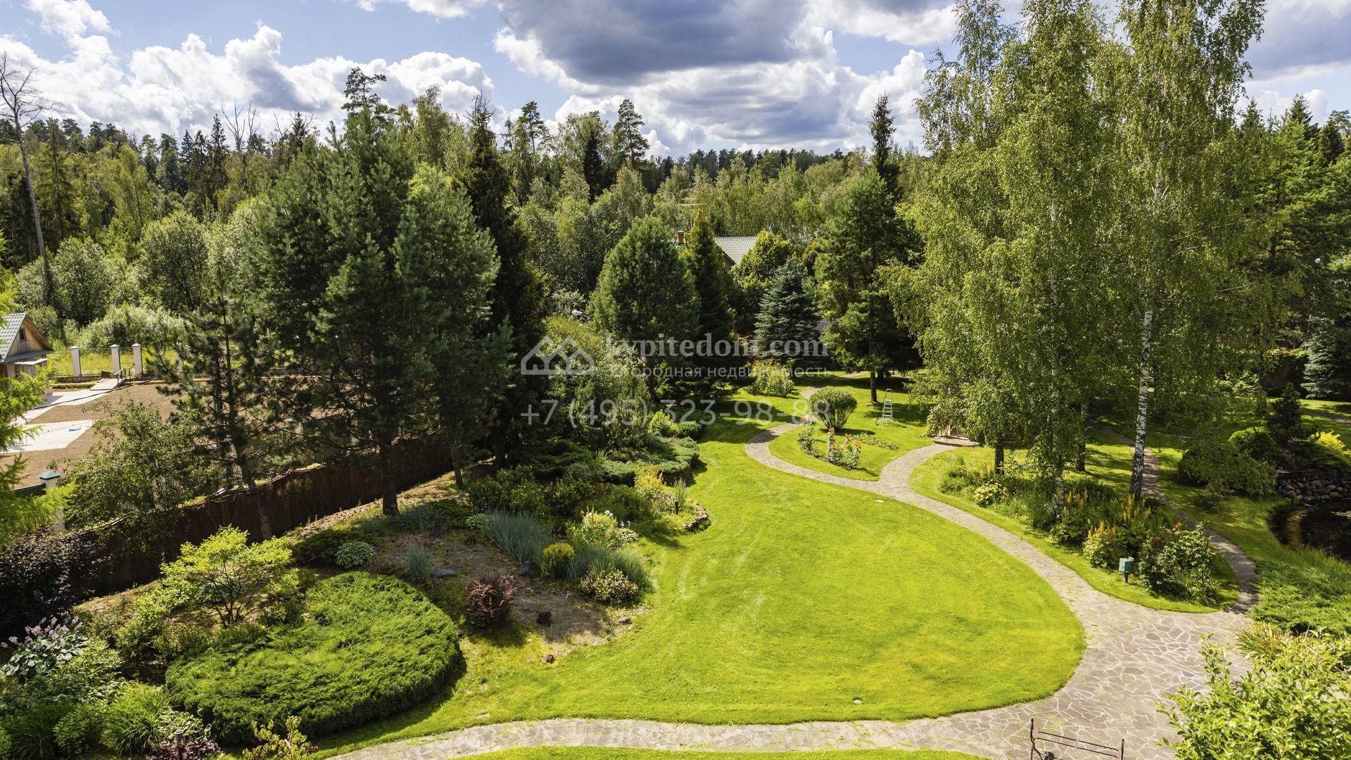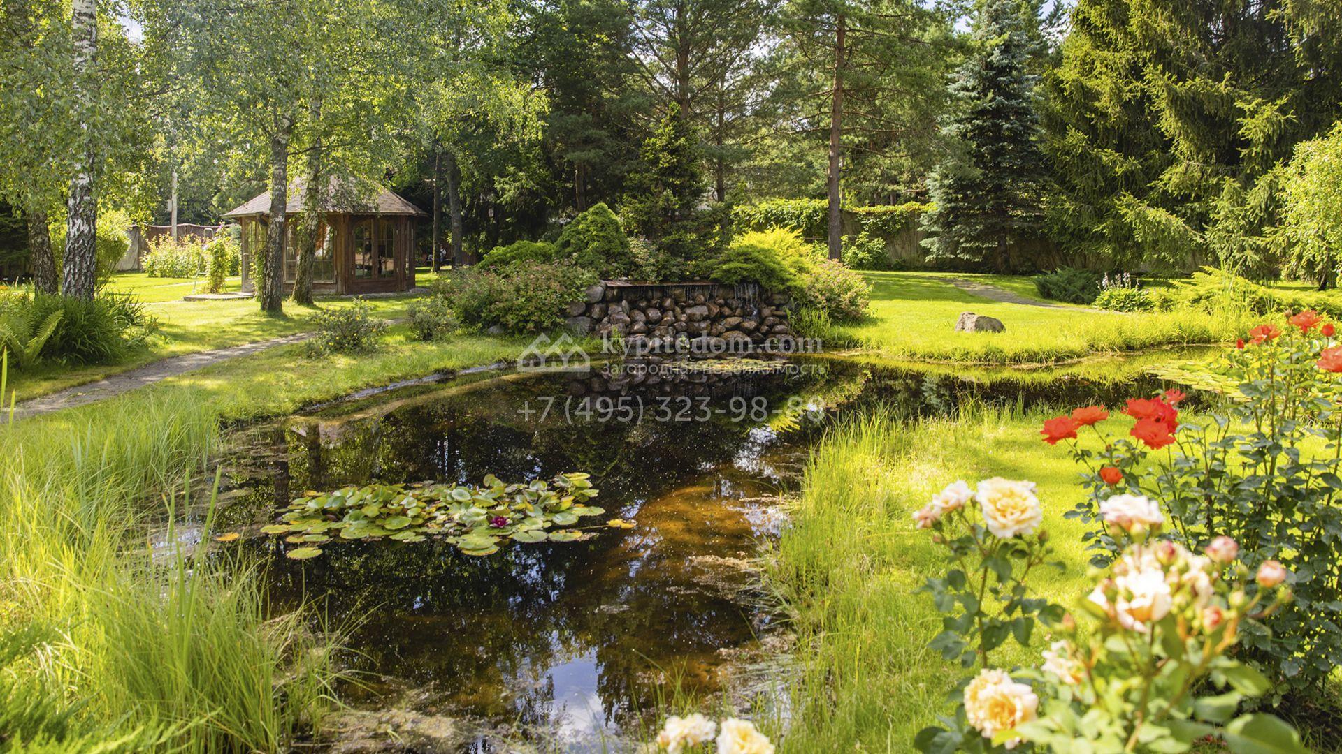 Загородный дом площадью 350 м² построен на просторном участке 66 соток с многолетними соснами и березами. Фасад здания облицован красным клинкерным кирпичом, декорирован белыми вставками и коваными элементами. Интерьер оформлен в пастельных оттенках, создающих атмосферу уюта. Планировка коттеджа включает 3 спальни, кухню-гостиную и пространство мансарды с хаммамом, кабинетом, зоной отдыха с бильярдной и мини-кухней. В контуре дома расположен гараж. Лесной участок облагорожен ландшафтным дизайном — вымощены дорожки, высажены цветы и кустарники, засеян газон, также на территории расположены теннисный корт и хозблок. Из деревянной беседки с дровяным камином открывается вид на собственный пруд с водопадом.