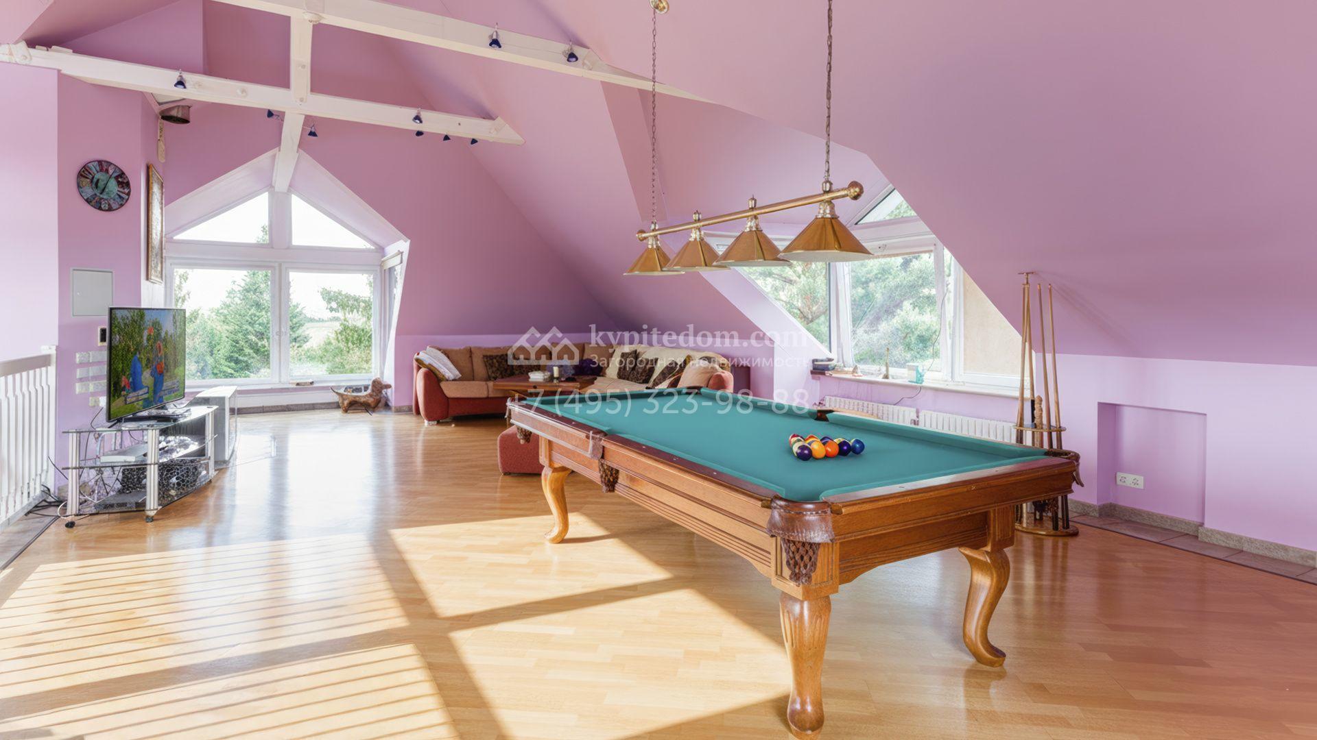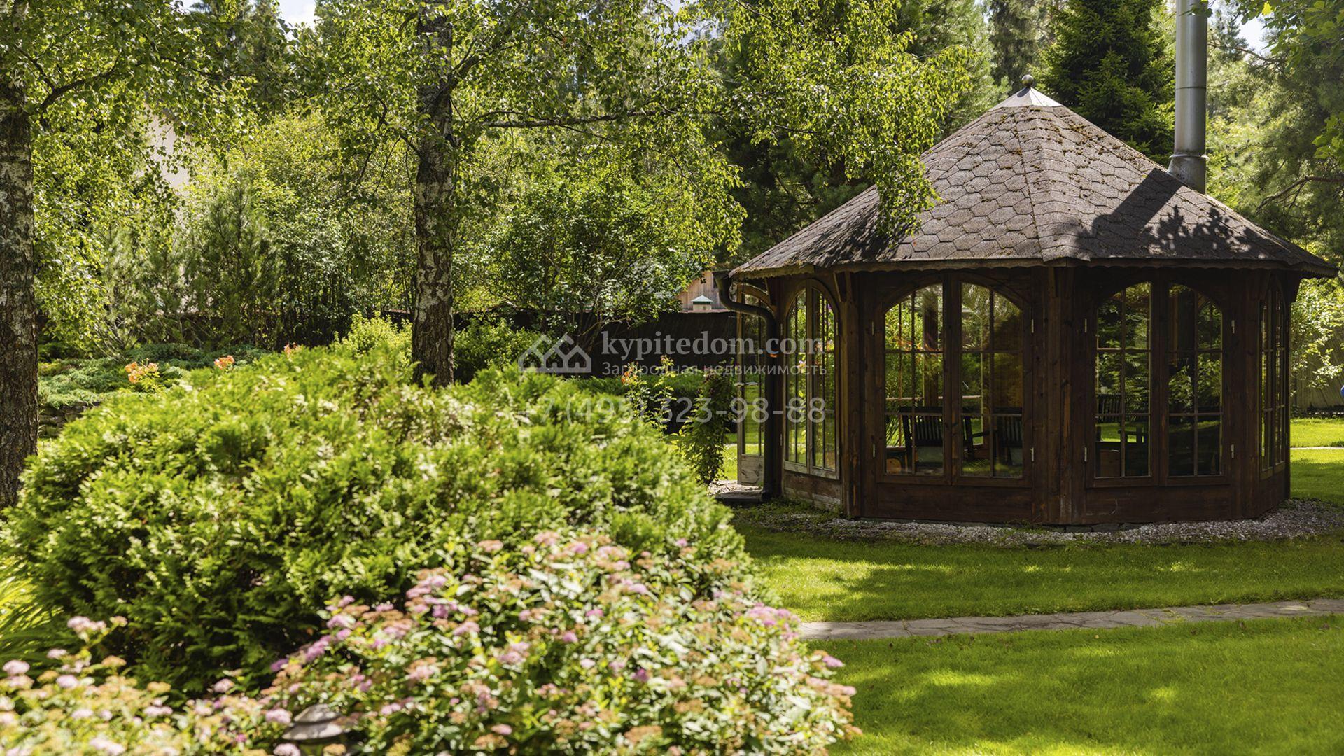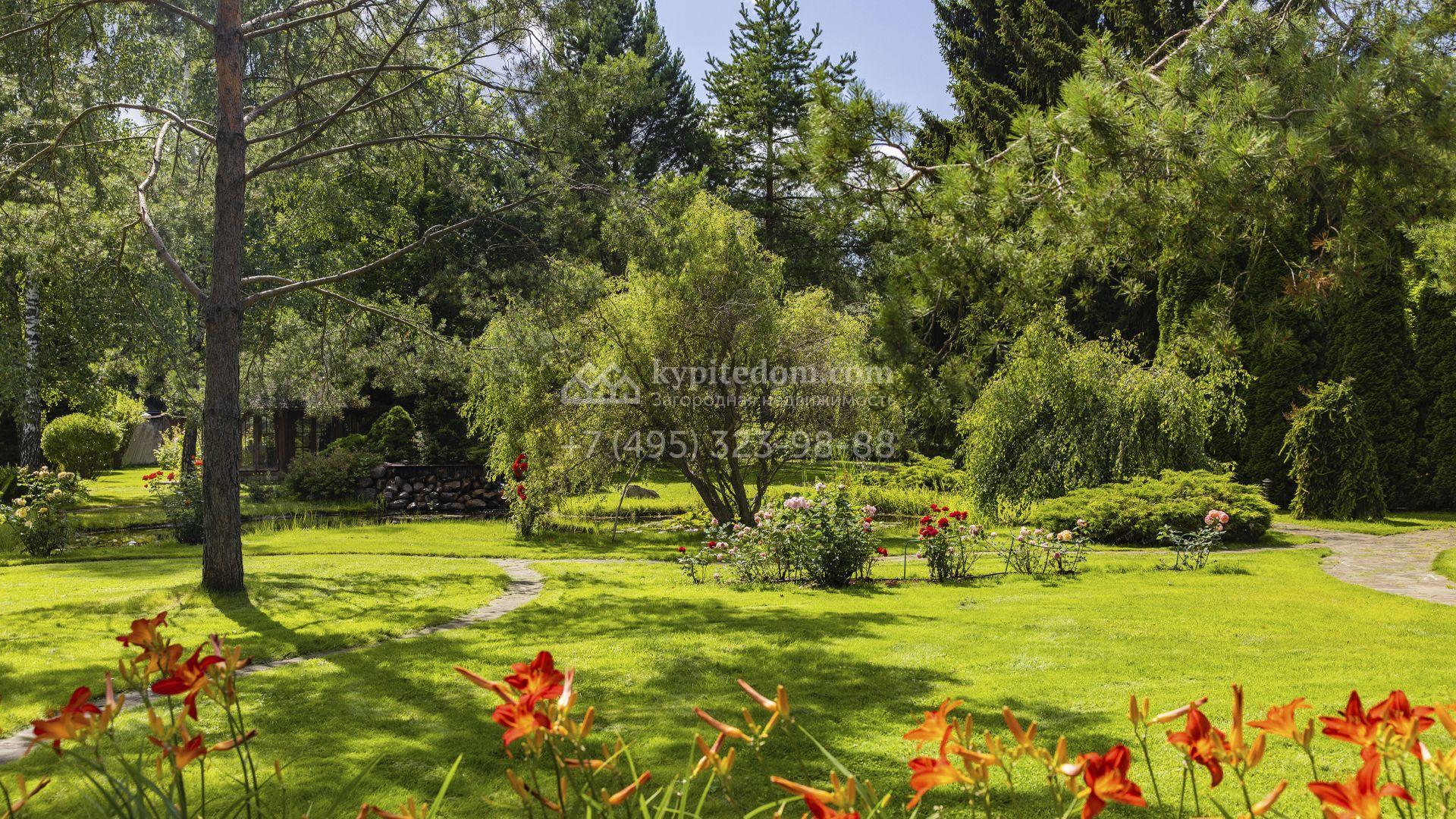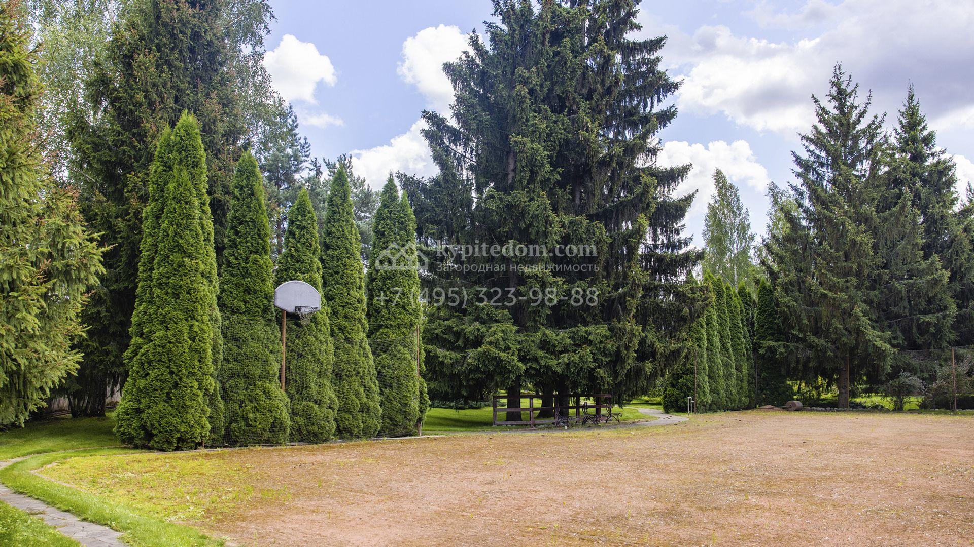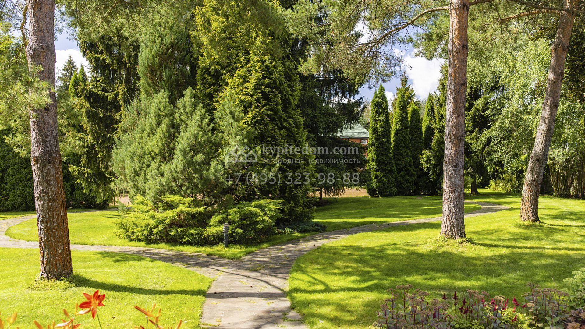 Загородный дом площадью 350 м² построен на просторном участке 66 соток с многолетними соснами и березами. Фасад здания облицован красным клинкерным кирпичом, декорирован белыми вставками и коваными элементами. Интерьер оформлен в пастельных оттенках, создающих атмосферу уюта. Планировка коттеджа включает 3 спальни, кухню-гостиную и пространство мансарды с хаммамом, кабинетом, зоной отдыха с бильярдной и мини-кухней. В контуре дома расположен гараж. Лесной участок облагорожен ландшафтным дизайном — вымощены дорожки, высажены цветы и кустарники, засеян газон, также на территории расположены теннисный корт и хозблок. Из деревянной беседки с дровяным камином открывается вид на собственный пруд с водопадом.