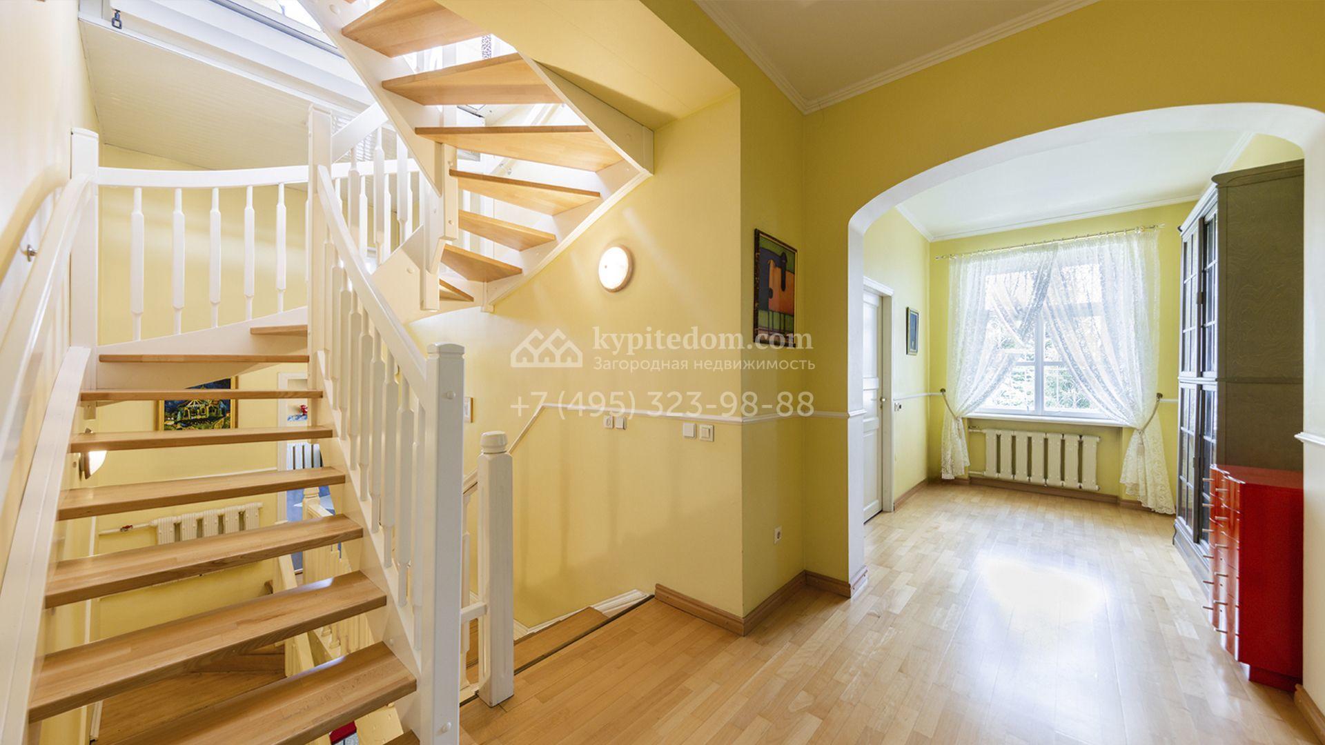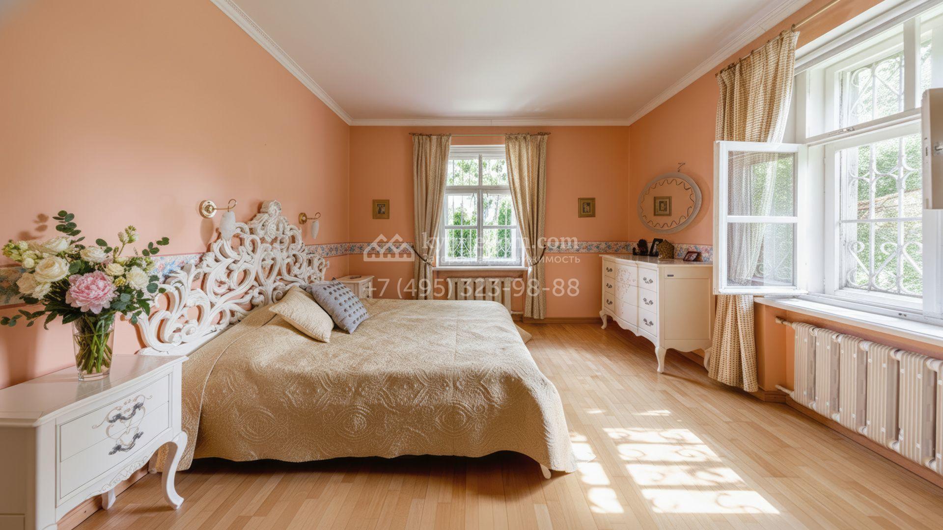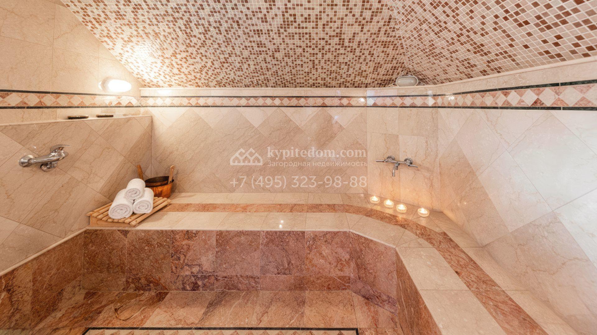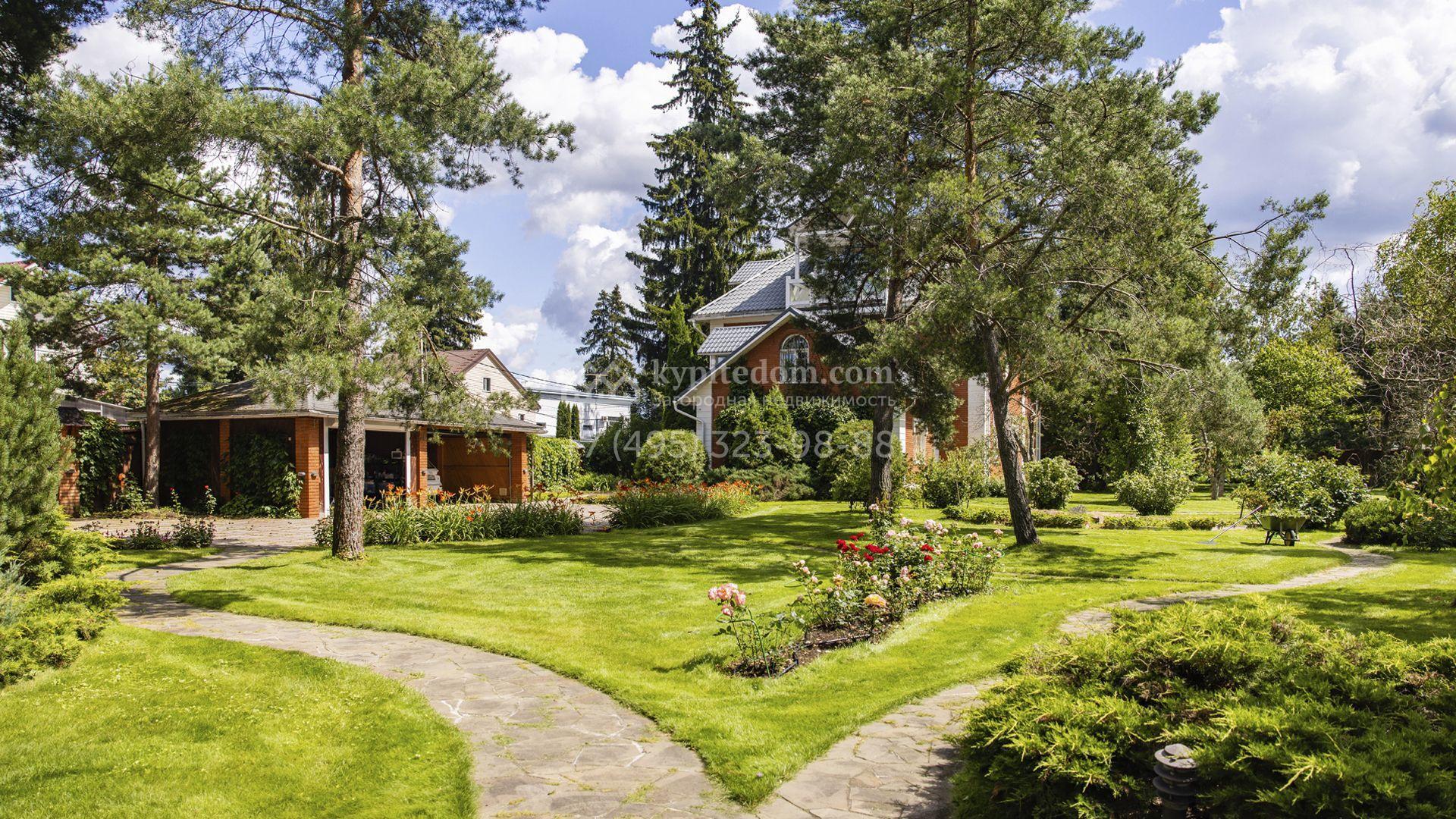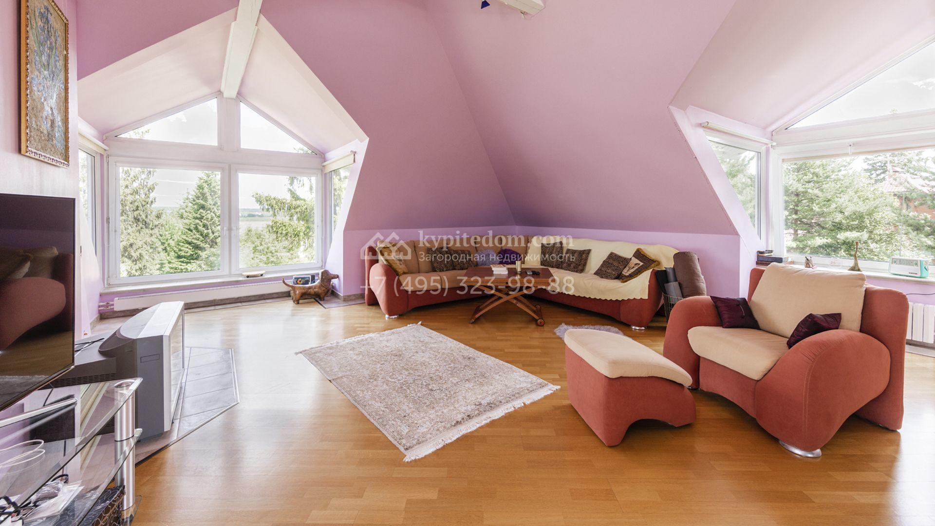 Загородный дом площадью 350 м² построен на просторном участке 66 соток с многолетними соснами и березами. Фасад здания облицован красным клинкерным кирпичом, декорирован белыми вставками и коваными элементами. Интерьер оформлен в пастельных оттенках, создающих атмосферу уюта. Планировка коттеджа включает 3 спальни, кухню-гостиную и пространство мансарды с хаммамом, кабинетом, зоной отдыха с бильярдной и мини-кухней. В контуре дома расположен гараж. Лесной участок облагорожен ландшафтным дизайном — вымощены дорожки, высажены цветы и кустарники, засеян газон, также на территории расположены теннисный корт и хозблок. Из деревянной беседки с дровяным камином открывается вид на собственный пруд с водопадом.