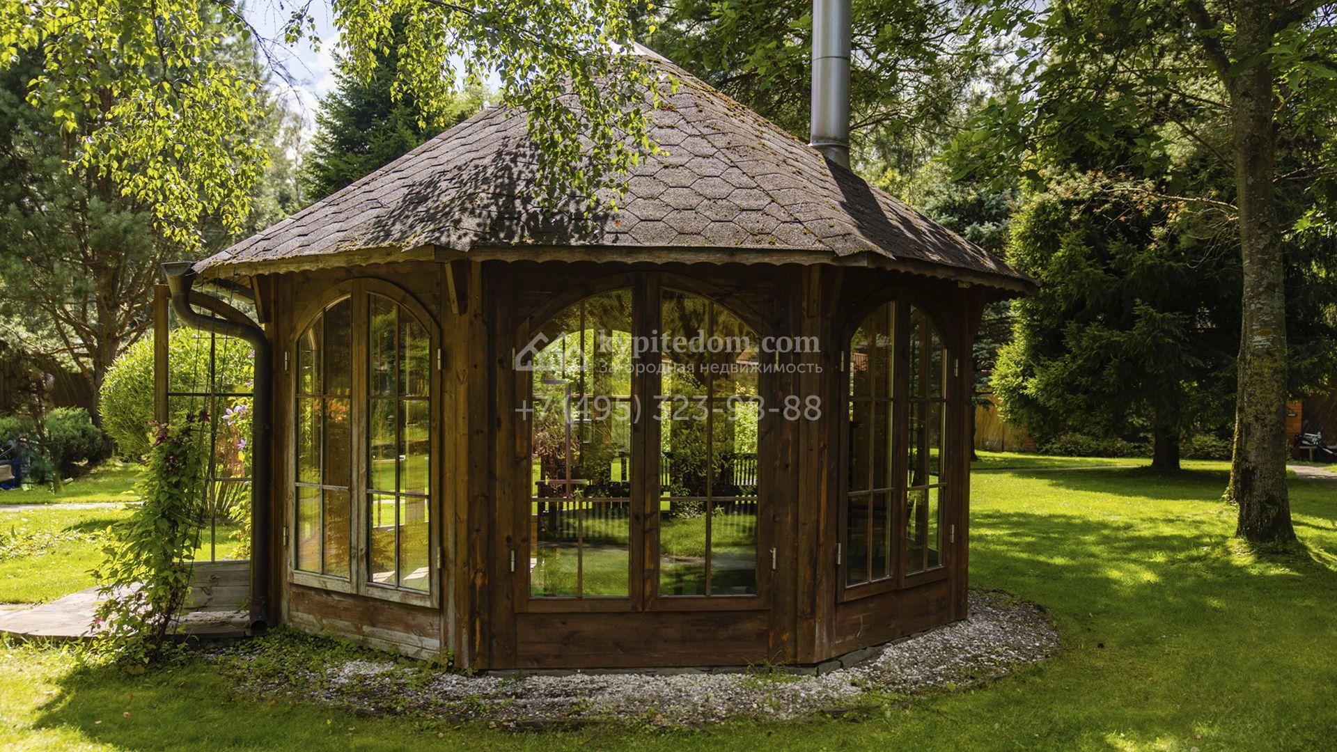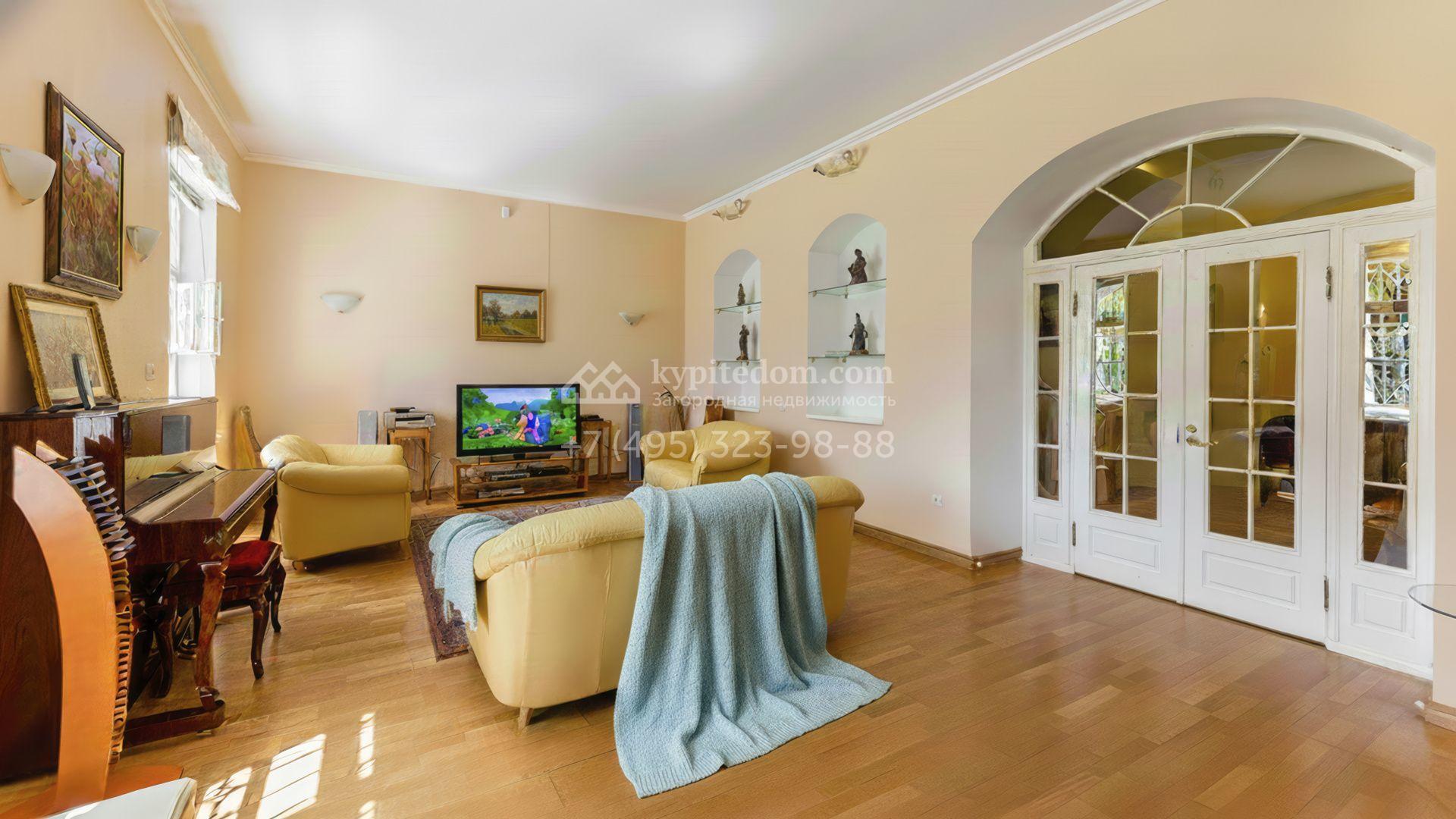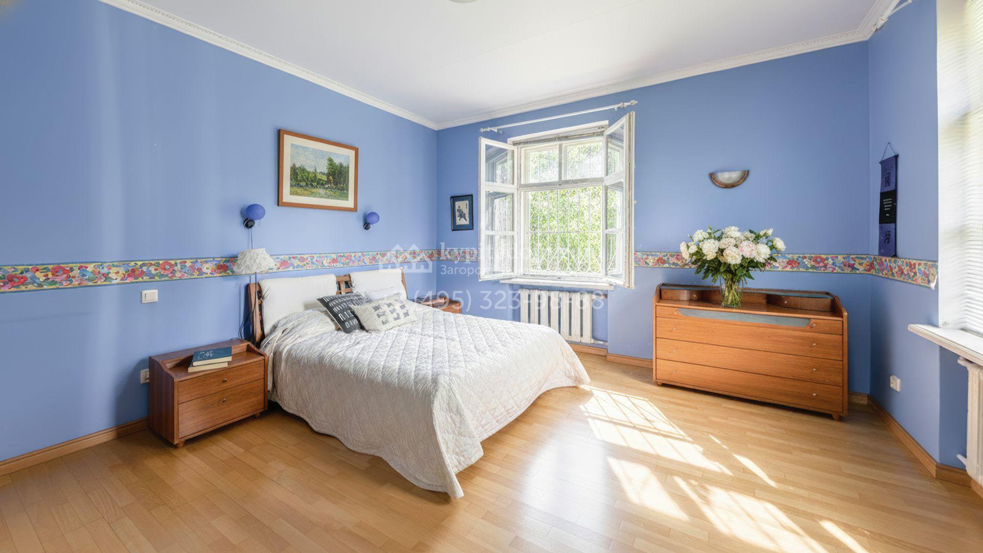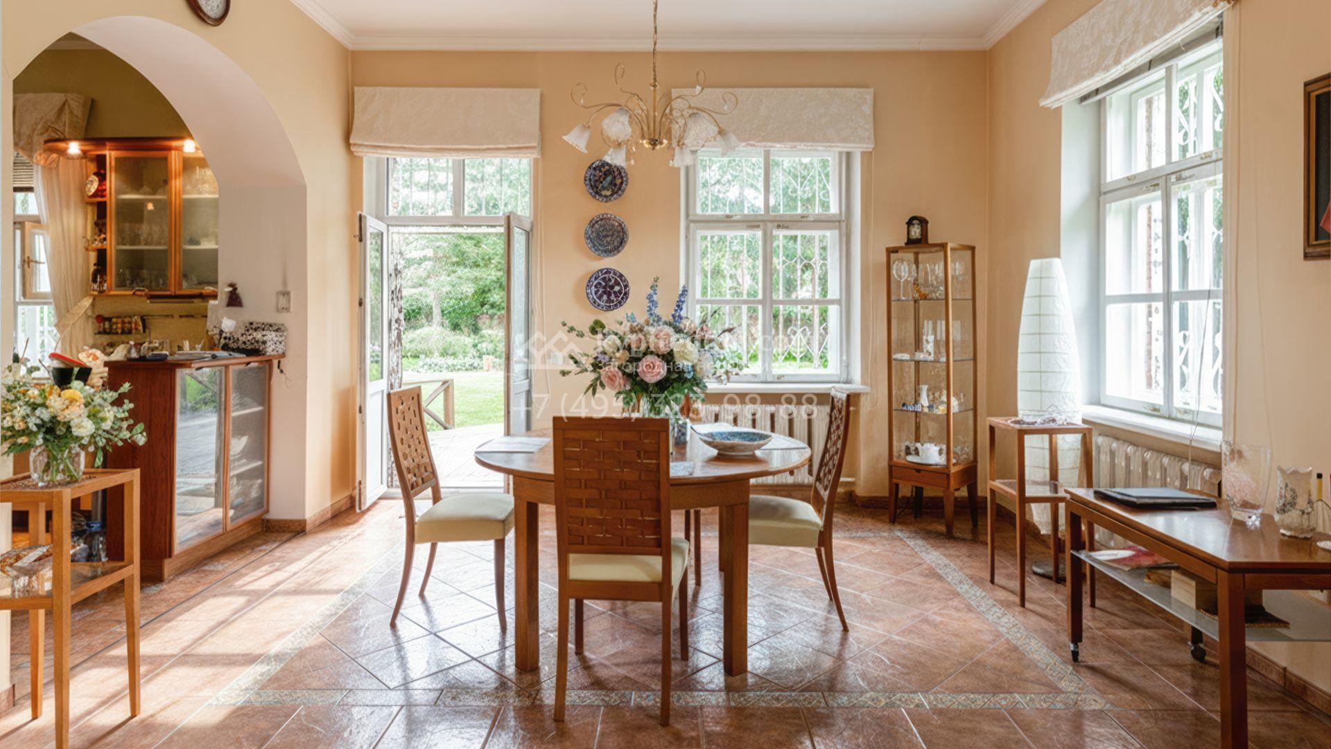 Загородный дом площадью 350 м² построен на просторном участке 66 соток с многолетними соснами и березами. Фасад здания облицован красным клинкерным кирпичом, декорирован белыми вставками и коваными элементами. Интерьер оформлен в пастельных оттенках, создающих атмосферу уюта. Планировка коттеджа включает 3 спальни, кухню-гостиную и пространство мансарды с хаммамом, кабинетом, зоной отдыха с бильярдной и мини-кухней. В контуре дома расположен гараж. Лесной участок облагорожен ландшафтным дизайном — вымощены дорожки, высажены цветы и кустарники, засеян газон, также на территории расположены теннисный корт и хозблок. Из деревянной беседки с дровяным камином открывается вид на собственный пруд с водопадом.