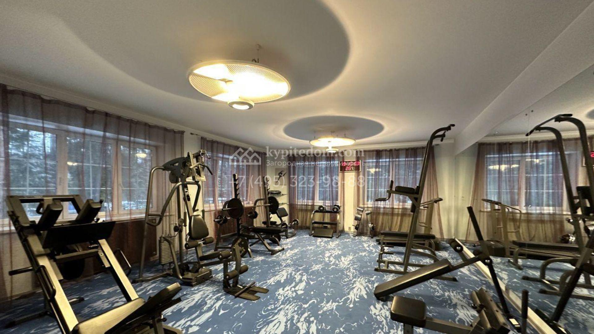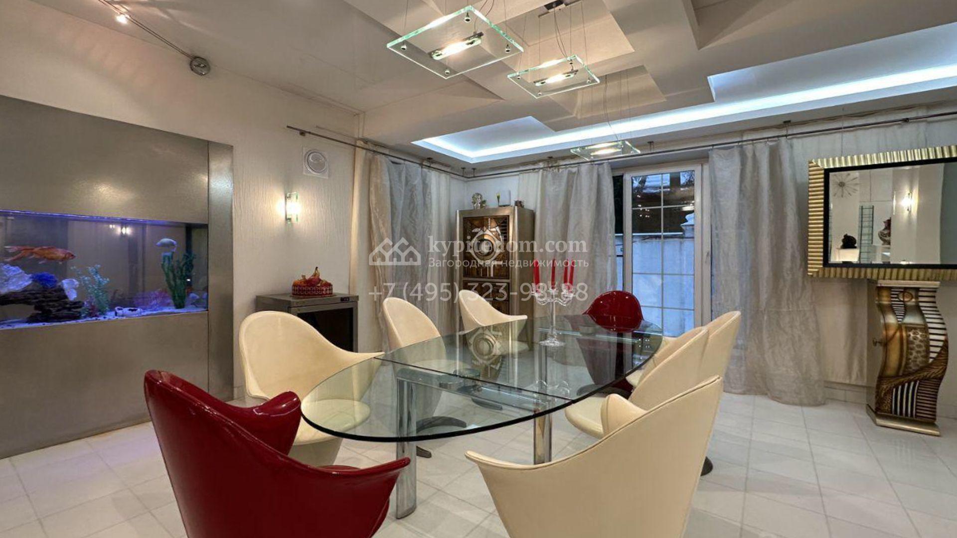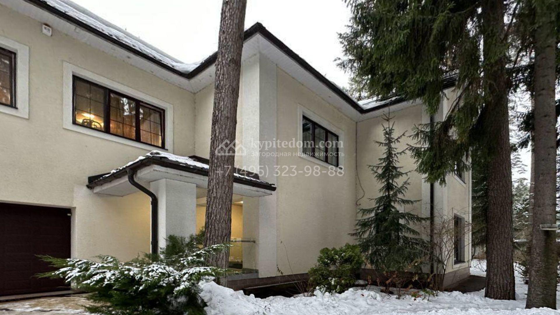 Загородный дом площадью 650 м² построен на просторном участке 40 соток с лесными деревьями. Фасад здания выполнен в современном стиле и облицован бежевой штукатуркой. В отделке интерьера преобладают мягкие оттенки в сочетании с яркими акцентами. Планировка резиденции включает 3 спальни, гостиную с камином, кухню, кабинет, зимний сад, тренажерный зал и игровую. Предусмотрен гараж на 2 машины с парковкой на 3 машины. На участке выполнен ландшафтный дизайн и расположен дом для охраны и персонала.