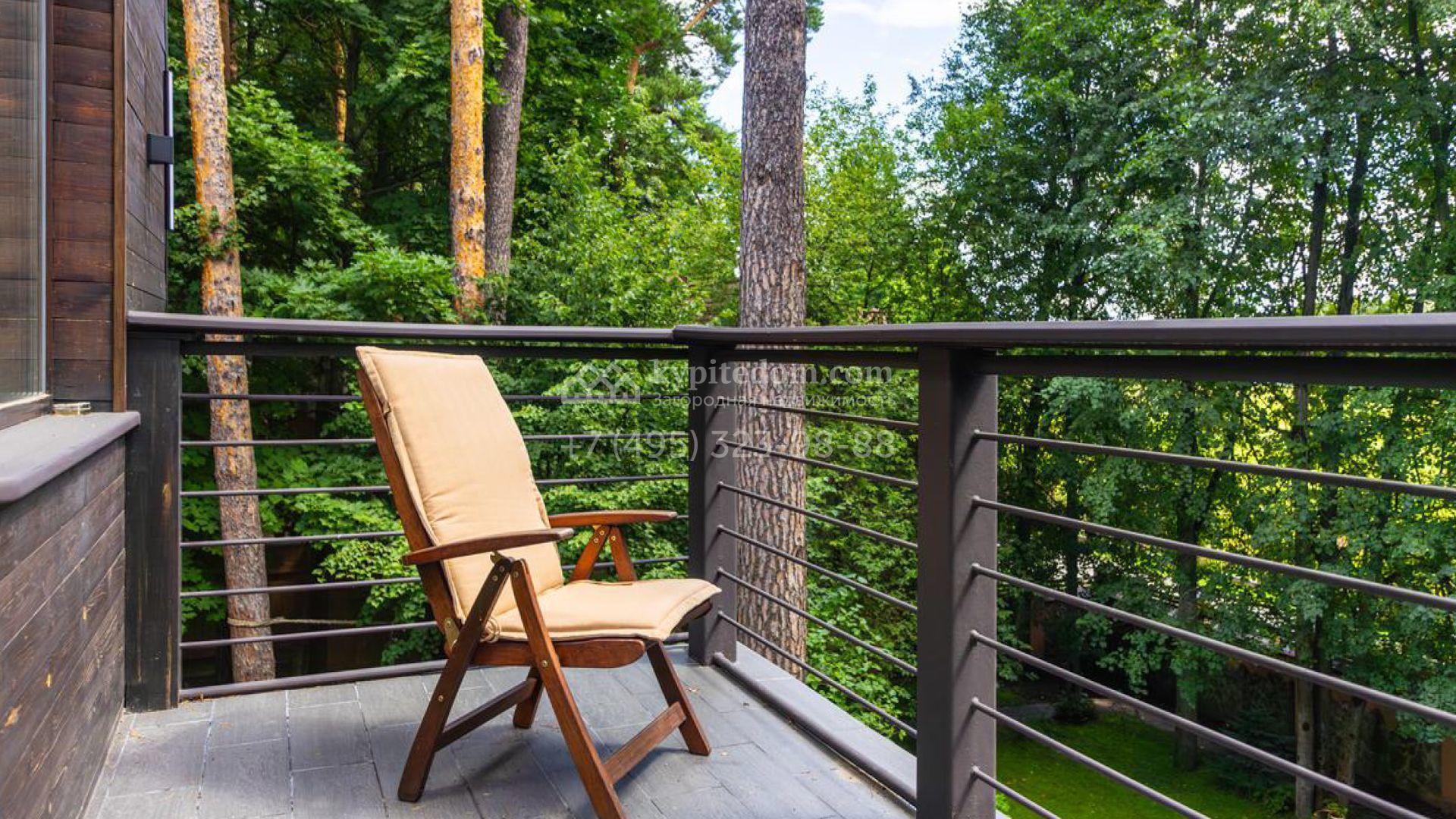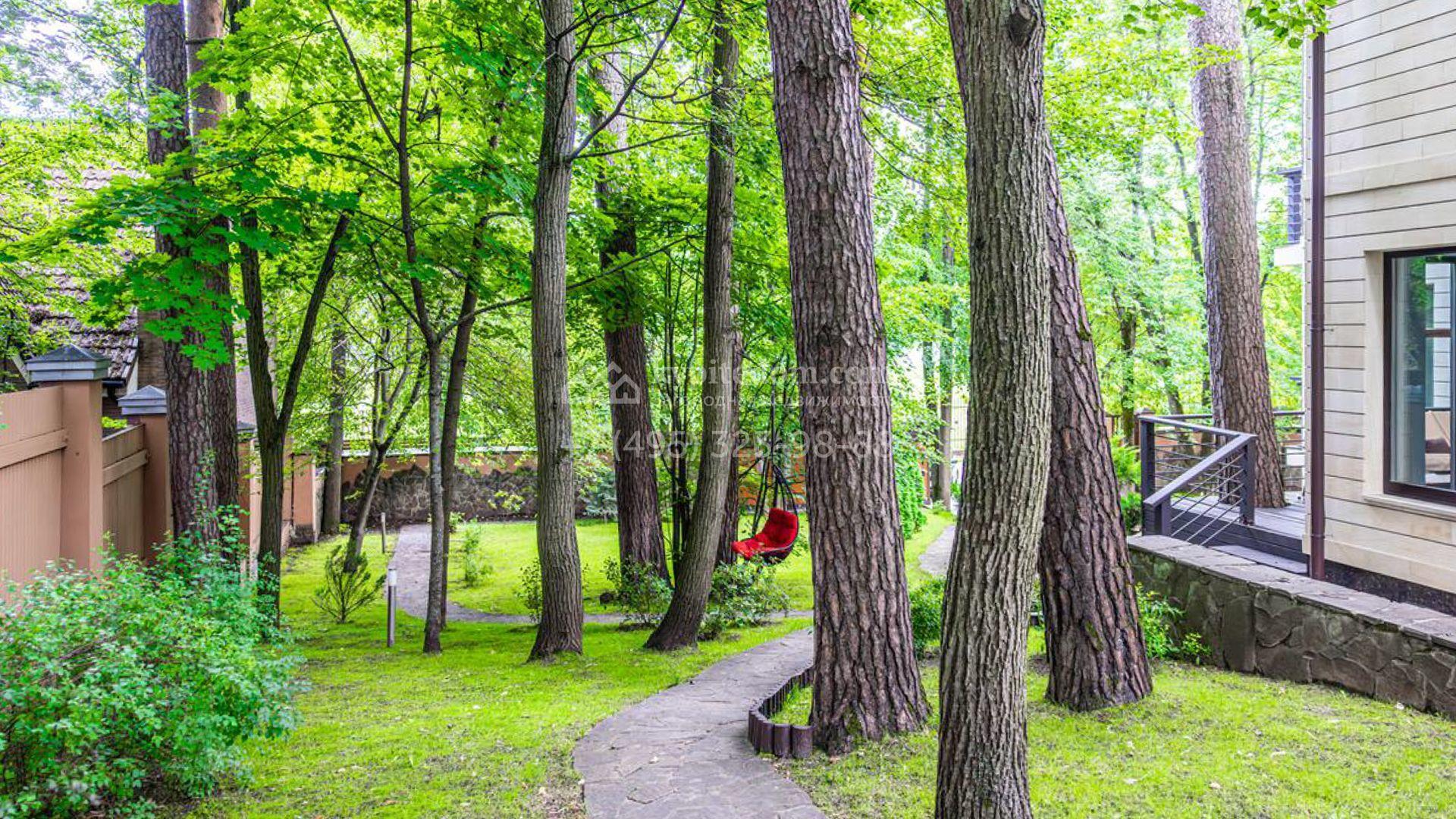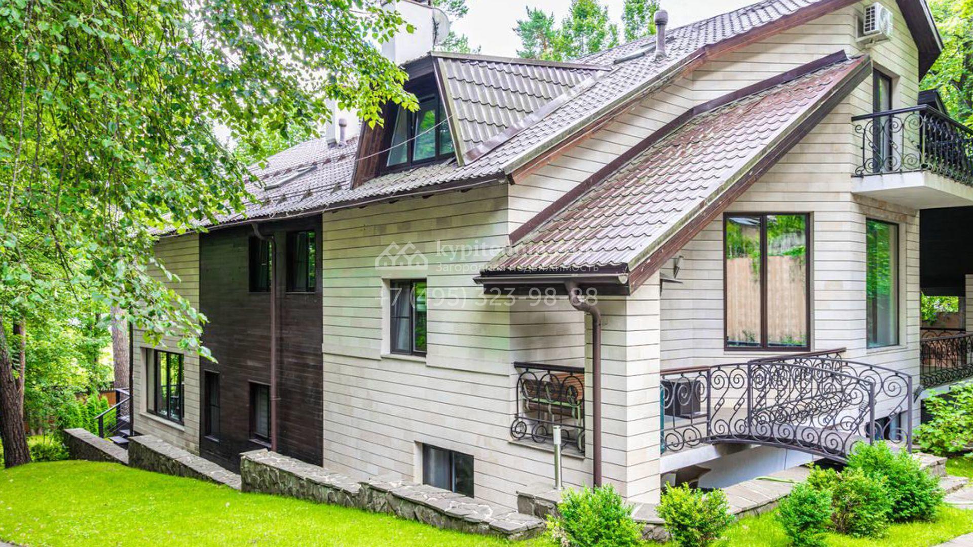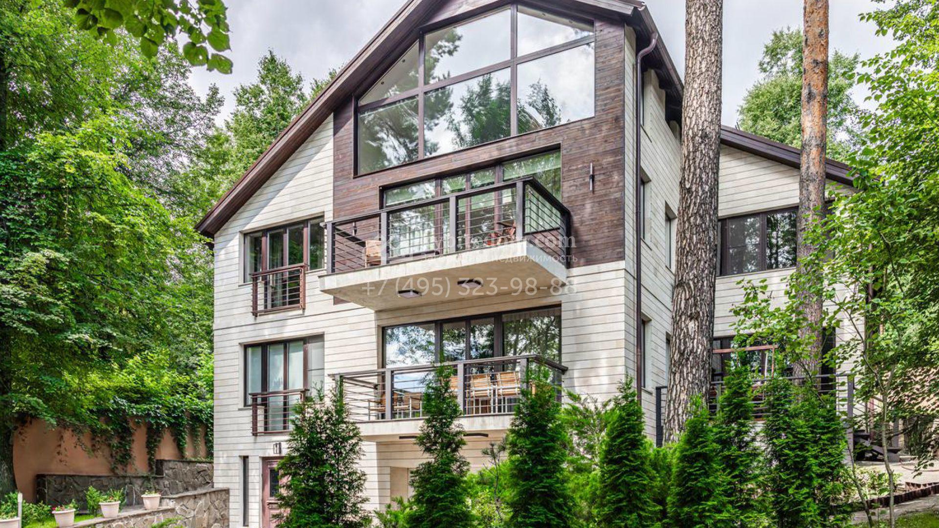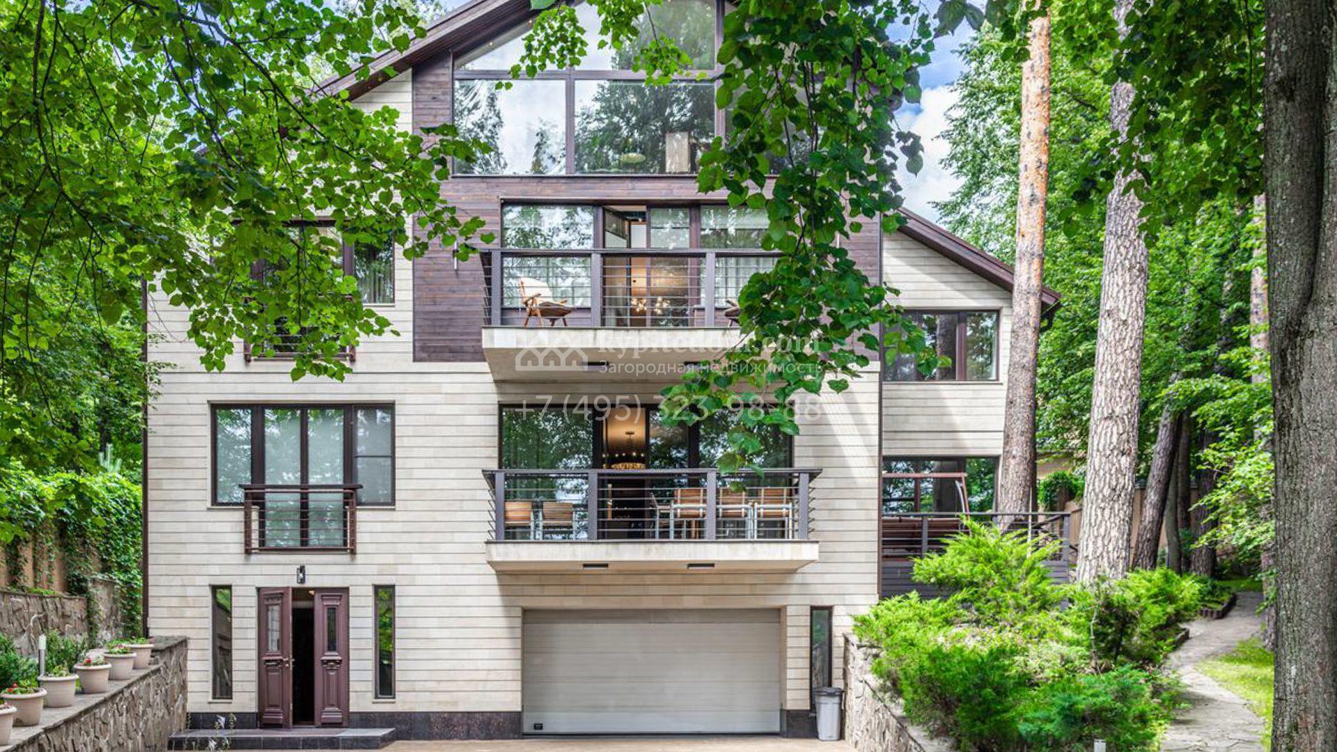 Большой двухэтажный дом 822 м² в современном стиле построен на лесном участке с сильным перепадом высот. Фасад с панорамными окнами и балконами облицован темным деревом и светлыми панелями. Цокольный этаж дома занимает бассейн и встроенный гараж с прямым выездом на лицу. В гостиной с камином спланировали второй свет — за счет этого помещение кажется очень просторным. На втором и мансардном этаже разместили спальни хозяев и тренажерный зал. Интерьер дома выдержан в современном стиле, каждая комната в своем цвете. На участке 15 соток растут вековые лесные деревья и декоративные туи, у дома в зоне патио установлен мангал.