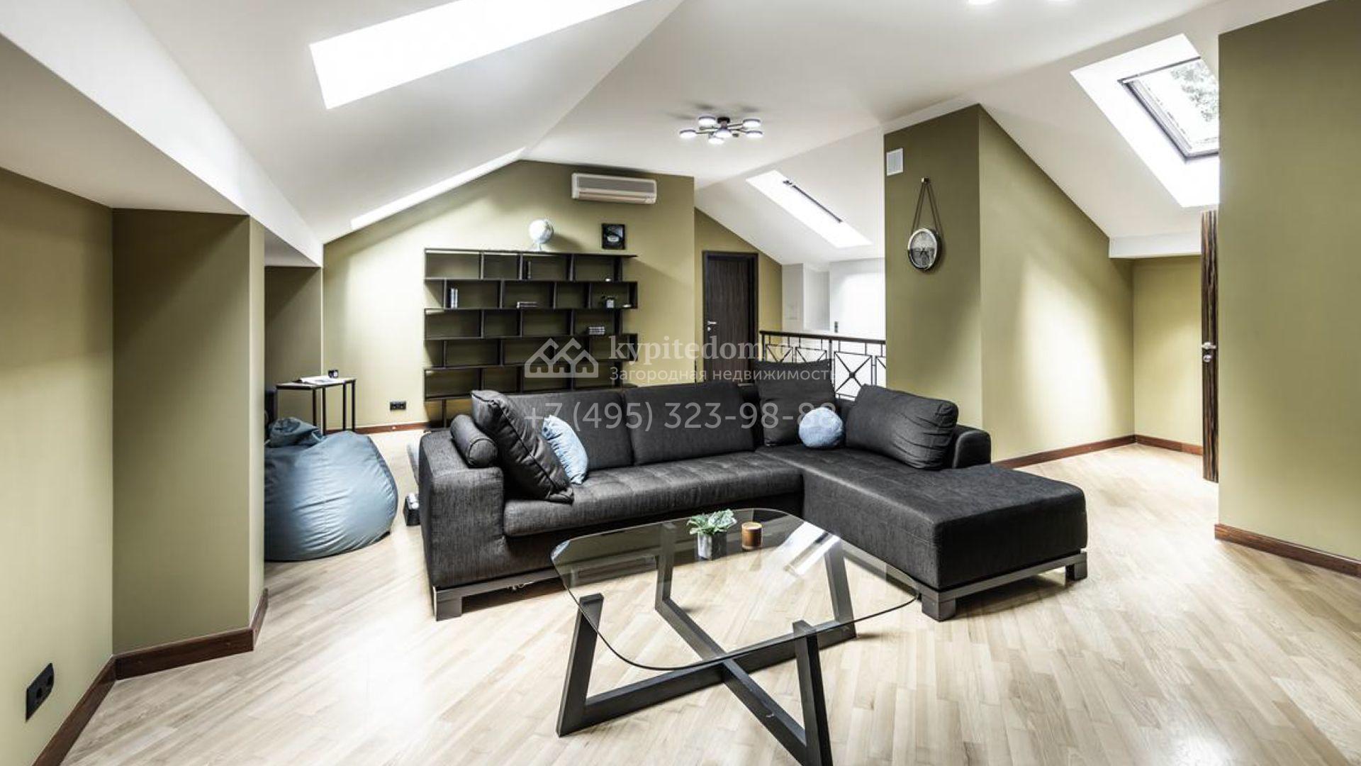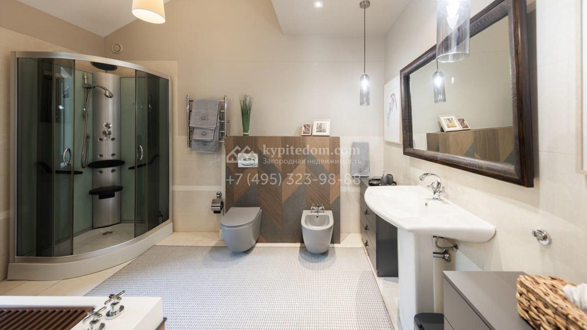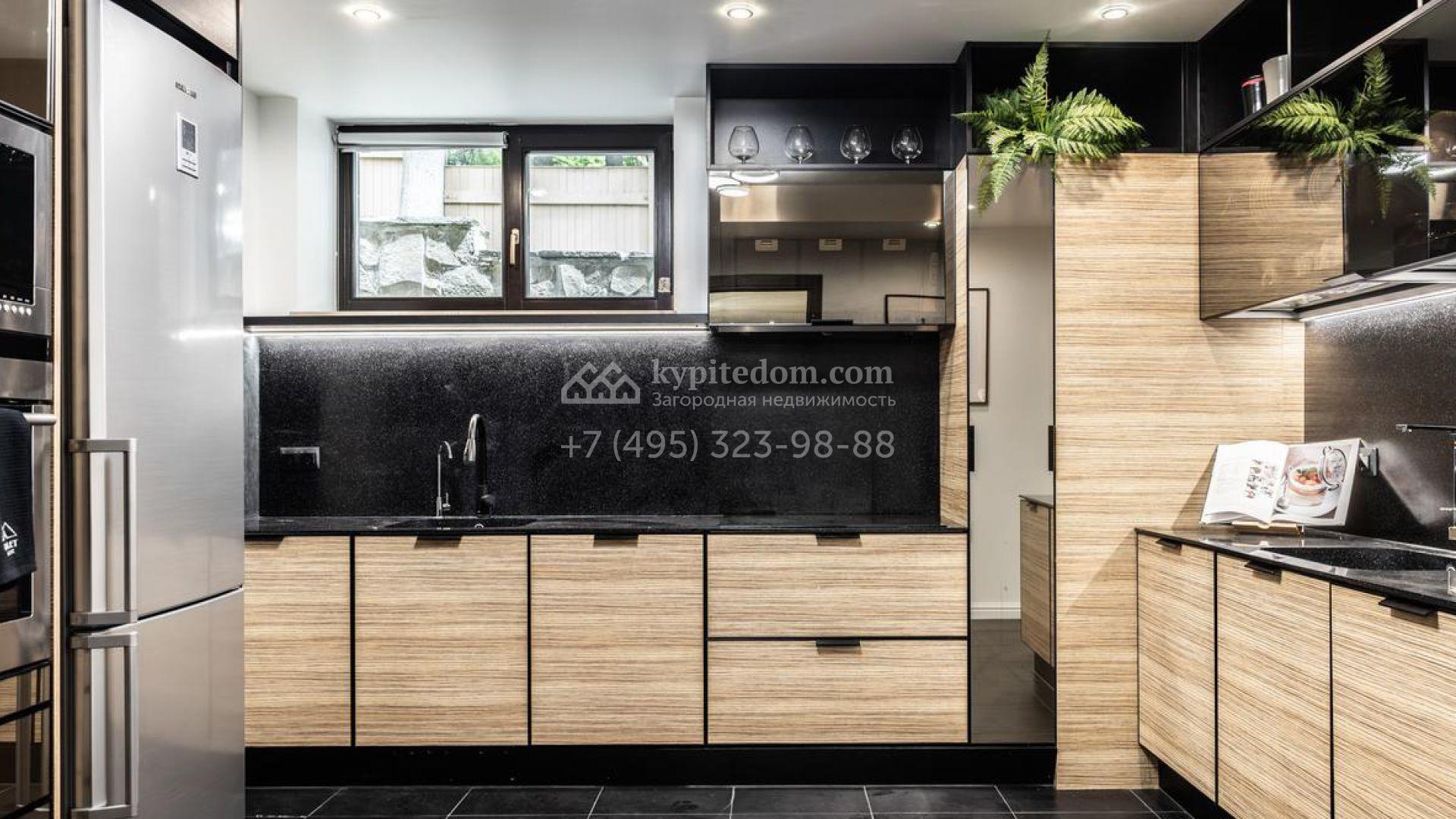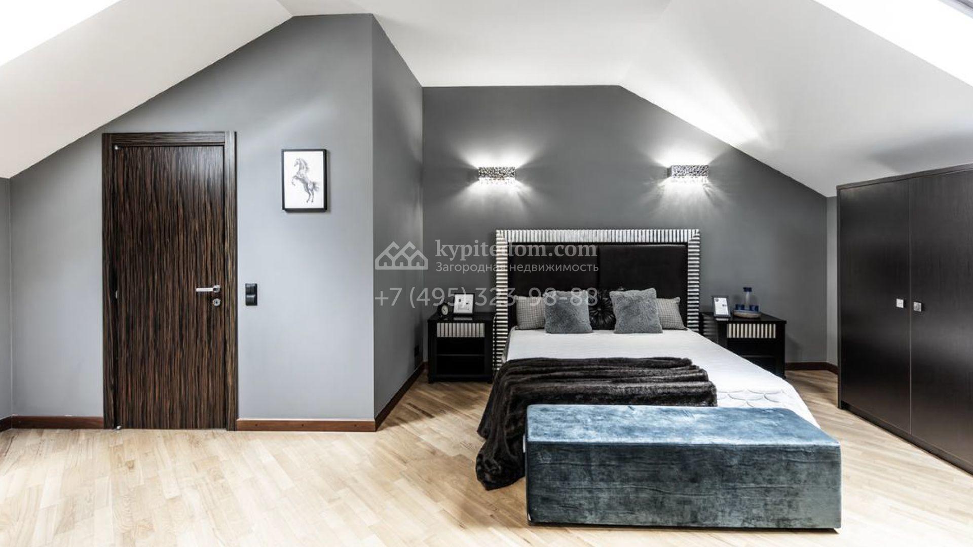 Большой двухэтажный дом 822 м² в современном стиле построен на лесном участке с сильным перепадом высот. Фасад с панорамными окнами и балконами облицован темным деревом и светлыми панелями. Цокольный этаж дома занимает бассейн и встроенный гараж с прямым выездом на лицу. В гостиной с камином спланировали второй свет — за счет этого помещение кажется очень просторным. На втором и мансардном этаже разместили спальни хозяев и тренажерный зал. Интерьер дома выдержан в современном стиле, каждая комната в своем цвете. На участке 15 соток растут вековые лесные деревья и декоративные туи, у дома в зоне патио установлен мангал.