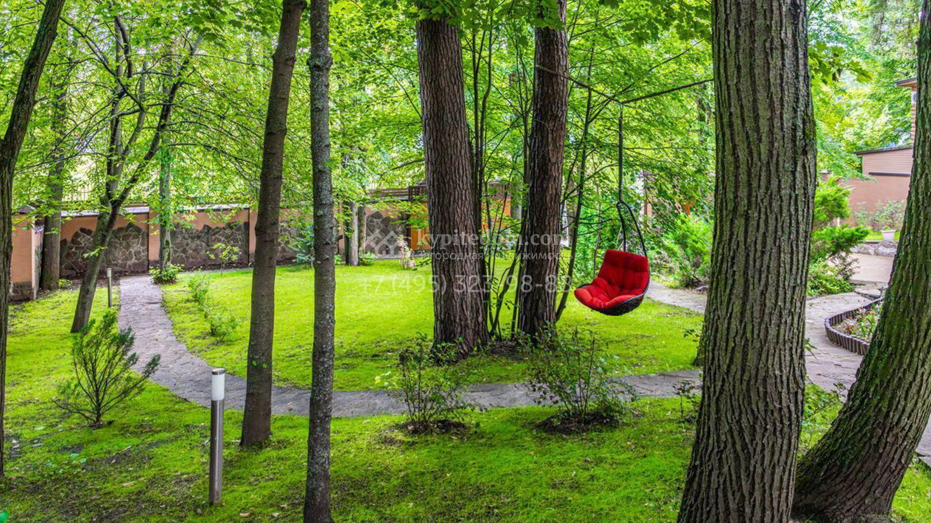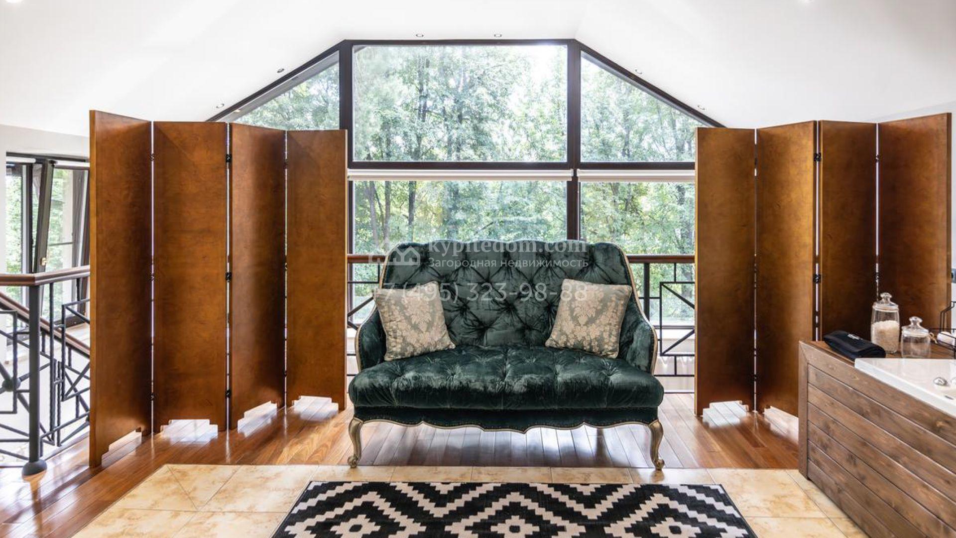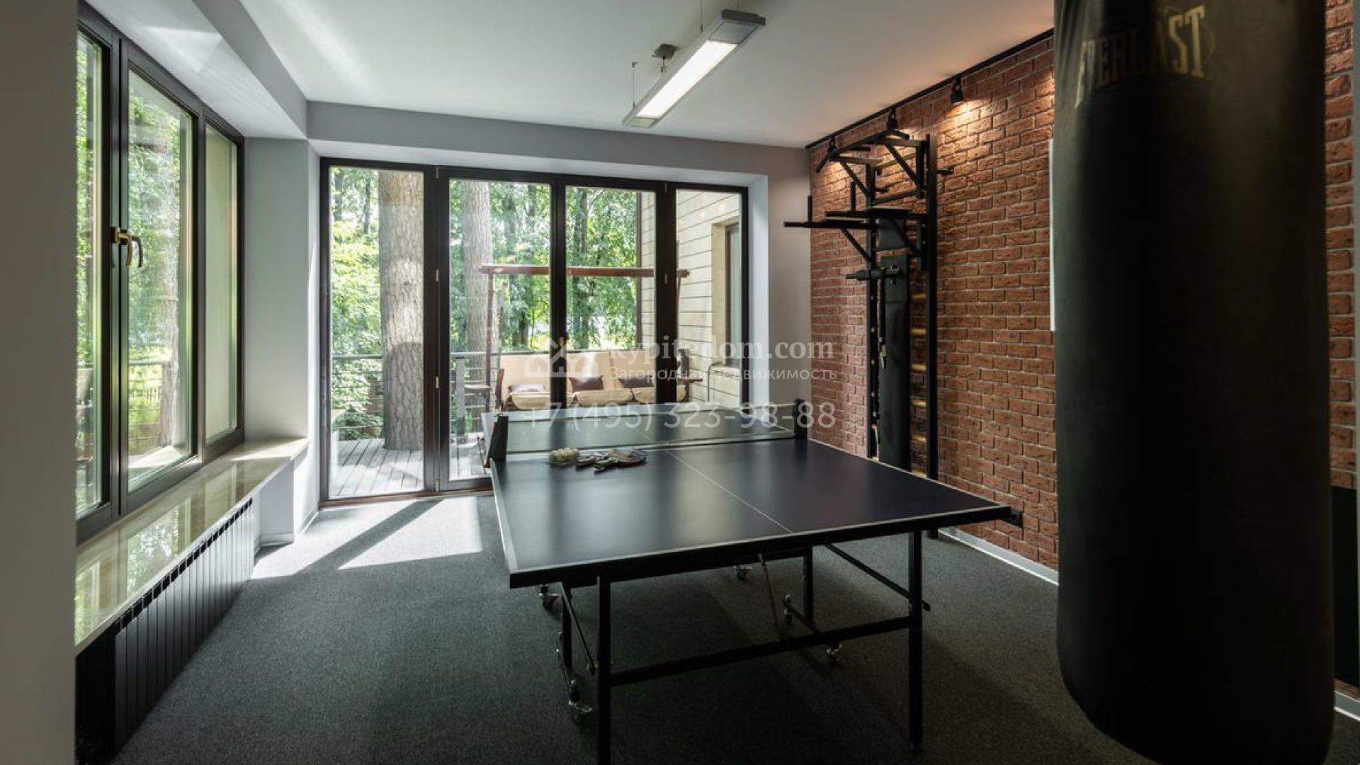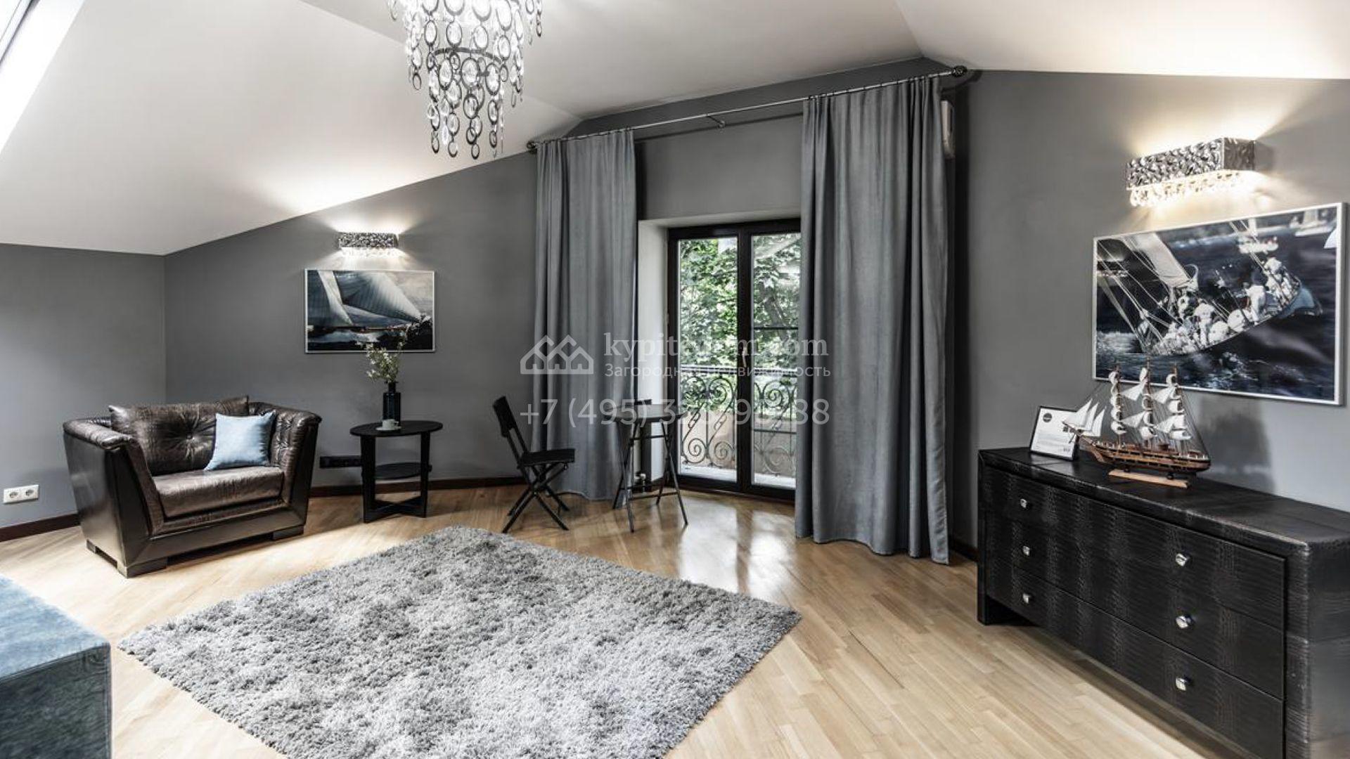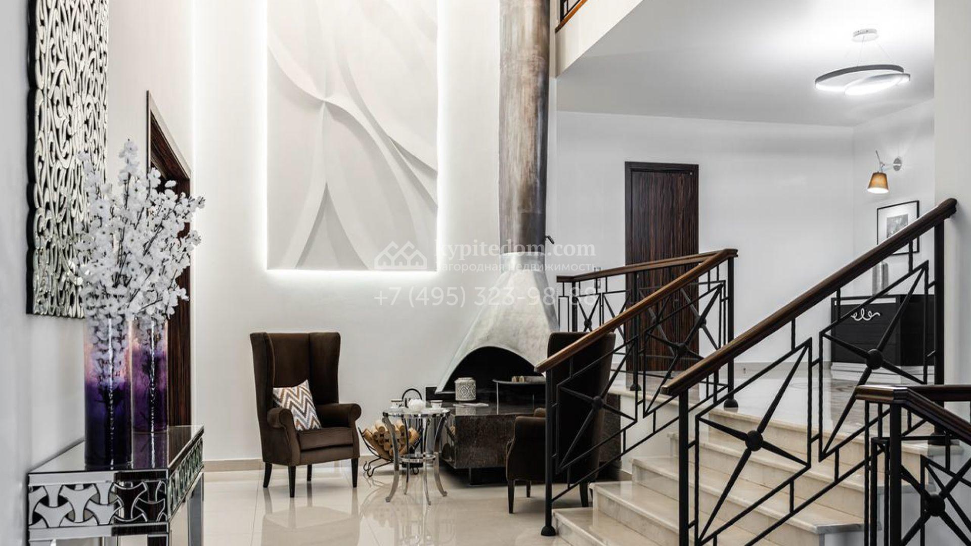 Большой двухэтажный дом 822 м² в современном стиле построен на лесном участке с сильным перепадом высот. Фасад с панорамными окнами и балконами облицован темным деревом и светлыми панелями. Цокольный этаж дома занимает бассейн и встроенный гараж с прямым выездом на лицу. В гостиной с камином спланировали второй свет — за счет этого помещение кажется очень просторным. На втором и мансардном этаже разместили спальни хозяев и тренажерный зал. Интерьер дома выдержан в современном стиле, каждая комната в своем цвете. На участке 15 соток растут вековые лесные деревья и декоративные туи, у дома в зоне патио установлен мангал.