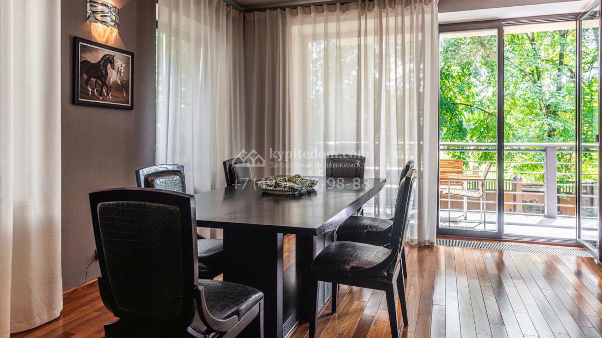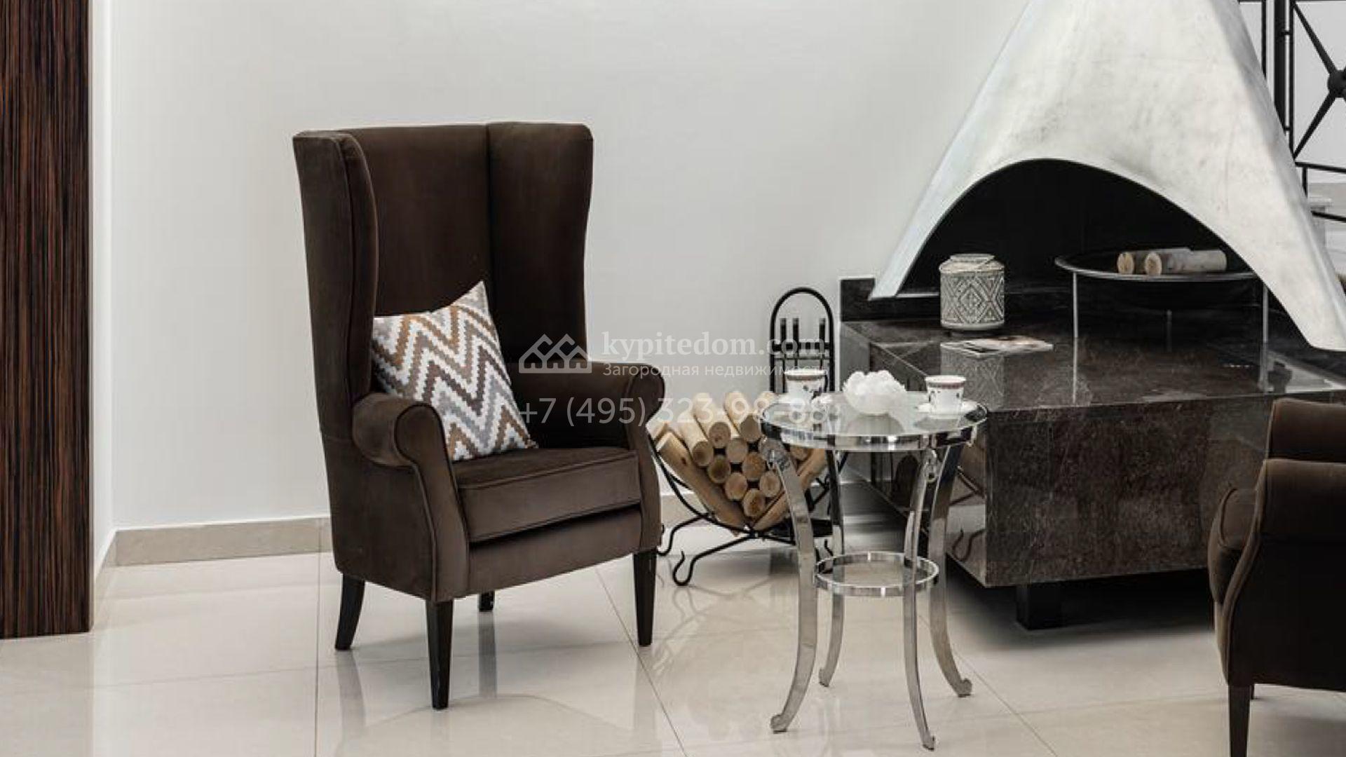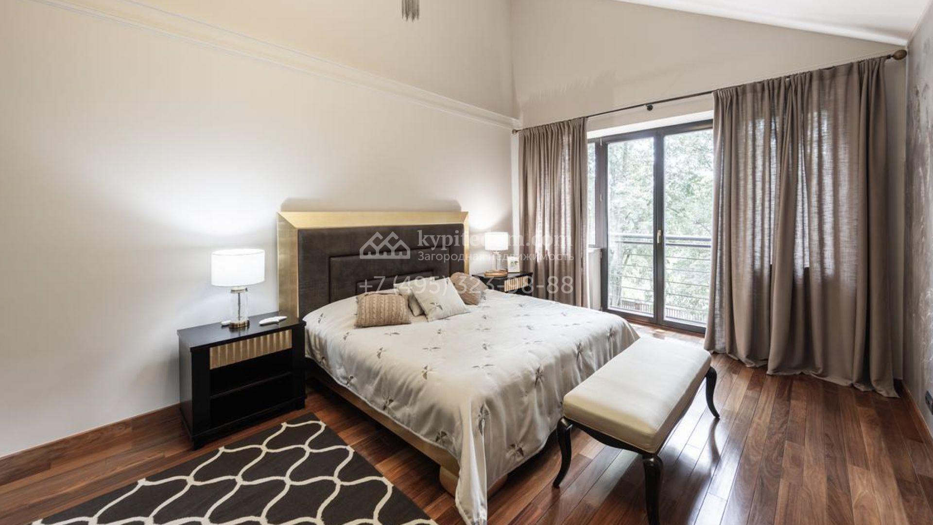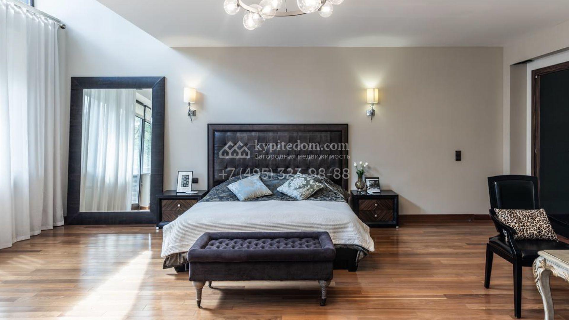 Большой двухэтажный дом 822 м² в современном стиле построен на лесном участке с сильным перепадом высот. Фасад с панорамными окнами и балконами облицован темным деревом и светлыми панелями. Цокольный этаж дома занимает бассейн и встроенный гараж с прямым выездом на лицу. В гостиной с камином спланировали второй свет — за счет этого помещение кажется очень просторным. На втором и мансардном этаже разместили спальни хозяев и тренажерный зал. Интерьер дома выдержан в современном стиле, каждая комната в своем цвете. На участке 15 соток растут вековые лесные деревья и декоративные туи, у дома в зоне патио установлен мангал.