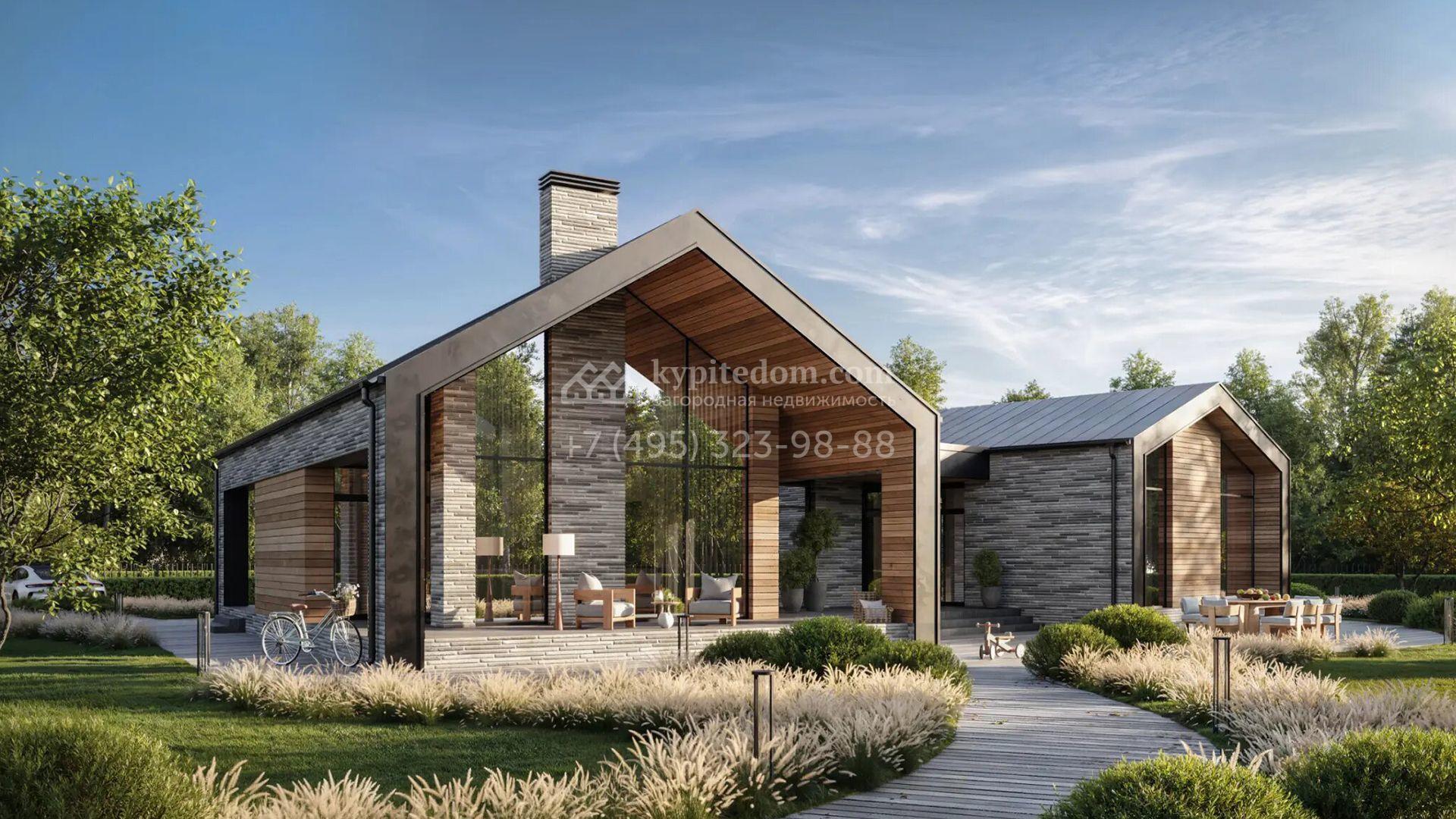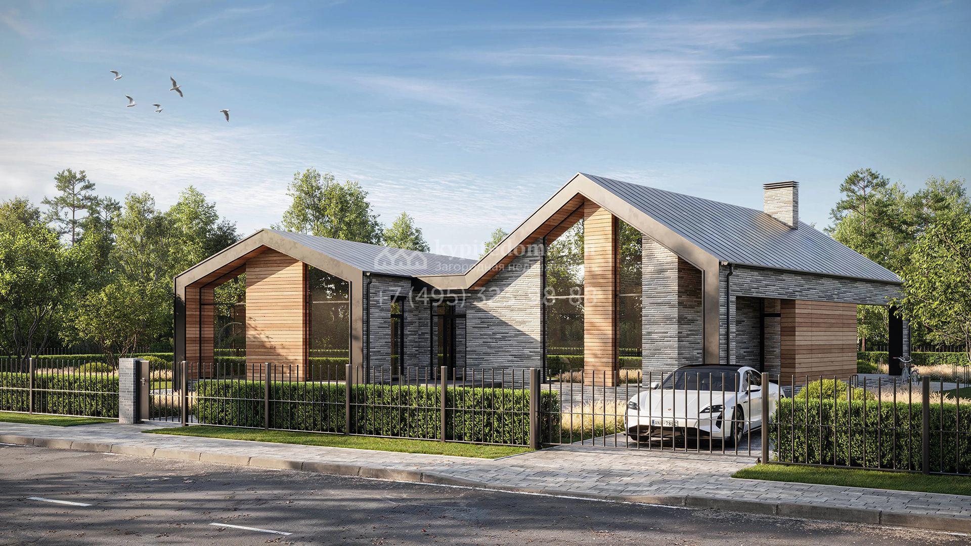 Загородный дом по проекту «Нортхилл» площадью 279 м² построен на участке 9,7 соток. Одноэтажный фасад здания с панорамными окнами облицован светло-серым камнем. Интерьер без отделки позволяет реализовать индивидуальный дизайн-проект. Планировка коттеджа включает 3 спальни, включая мастер-спальню с кабинетом, кухню-гостиную, сауну, тренажерный зал и уютную террасу с камином. На участке выполнен ландшафтный дизайн, вымощены дорожки и засеян газон.