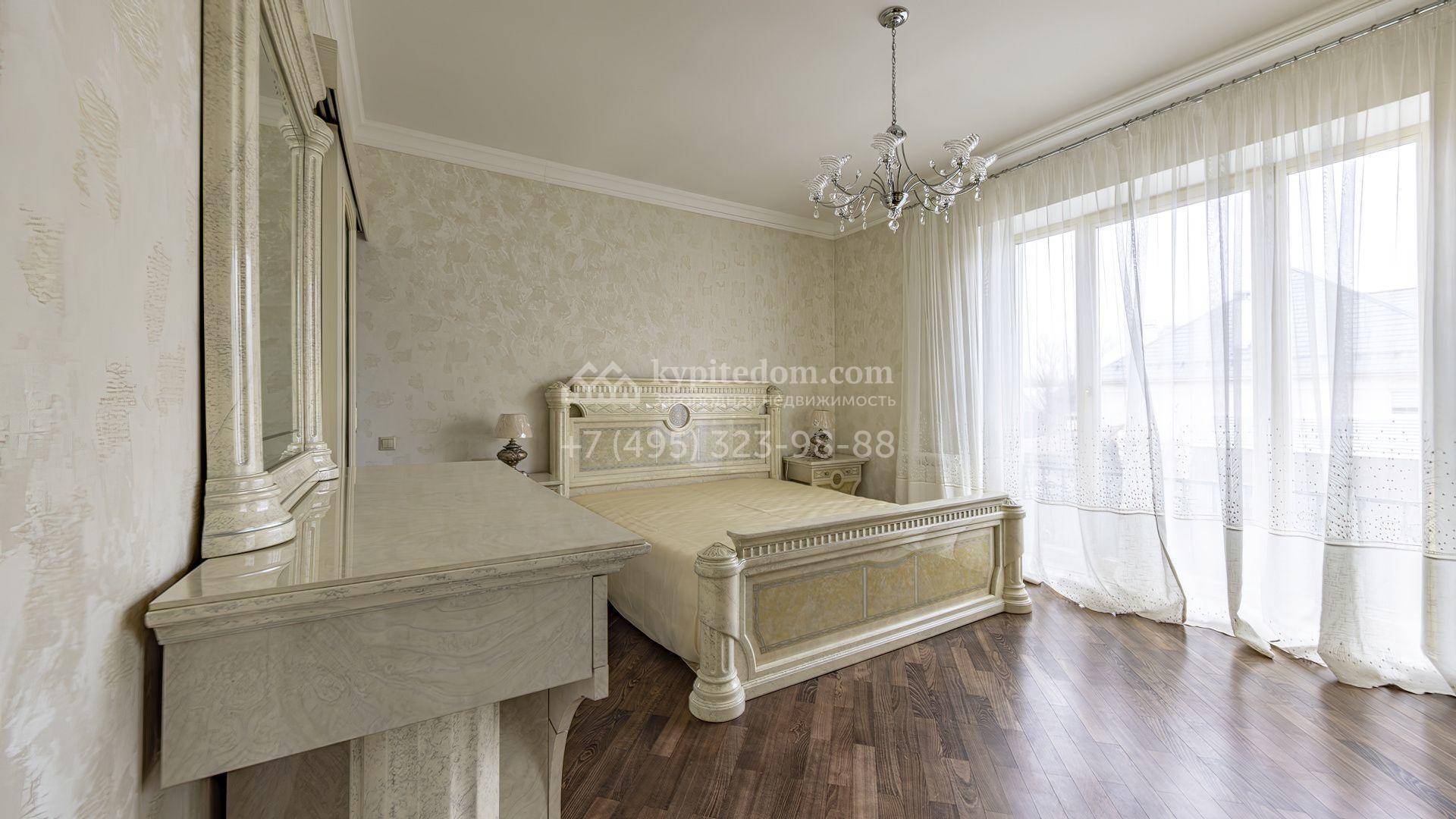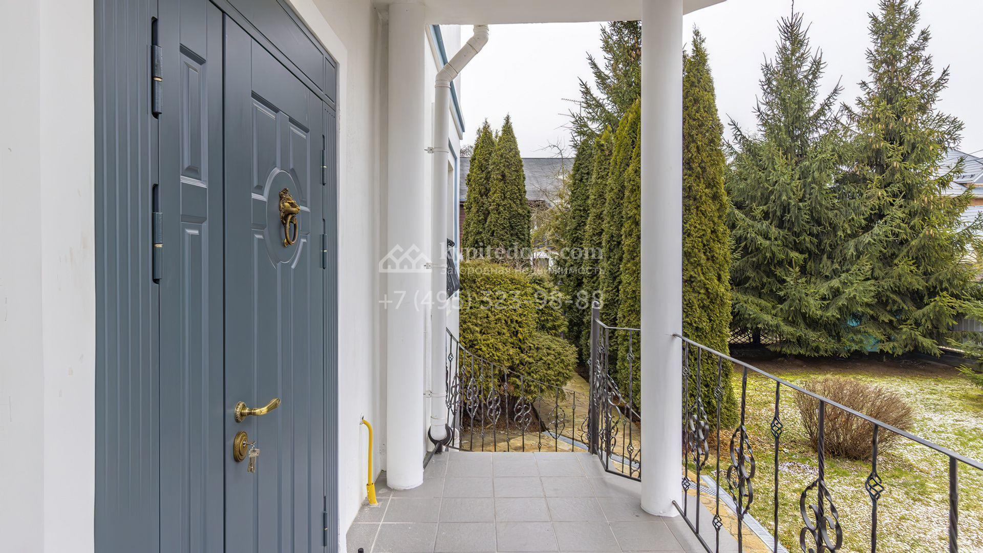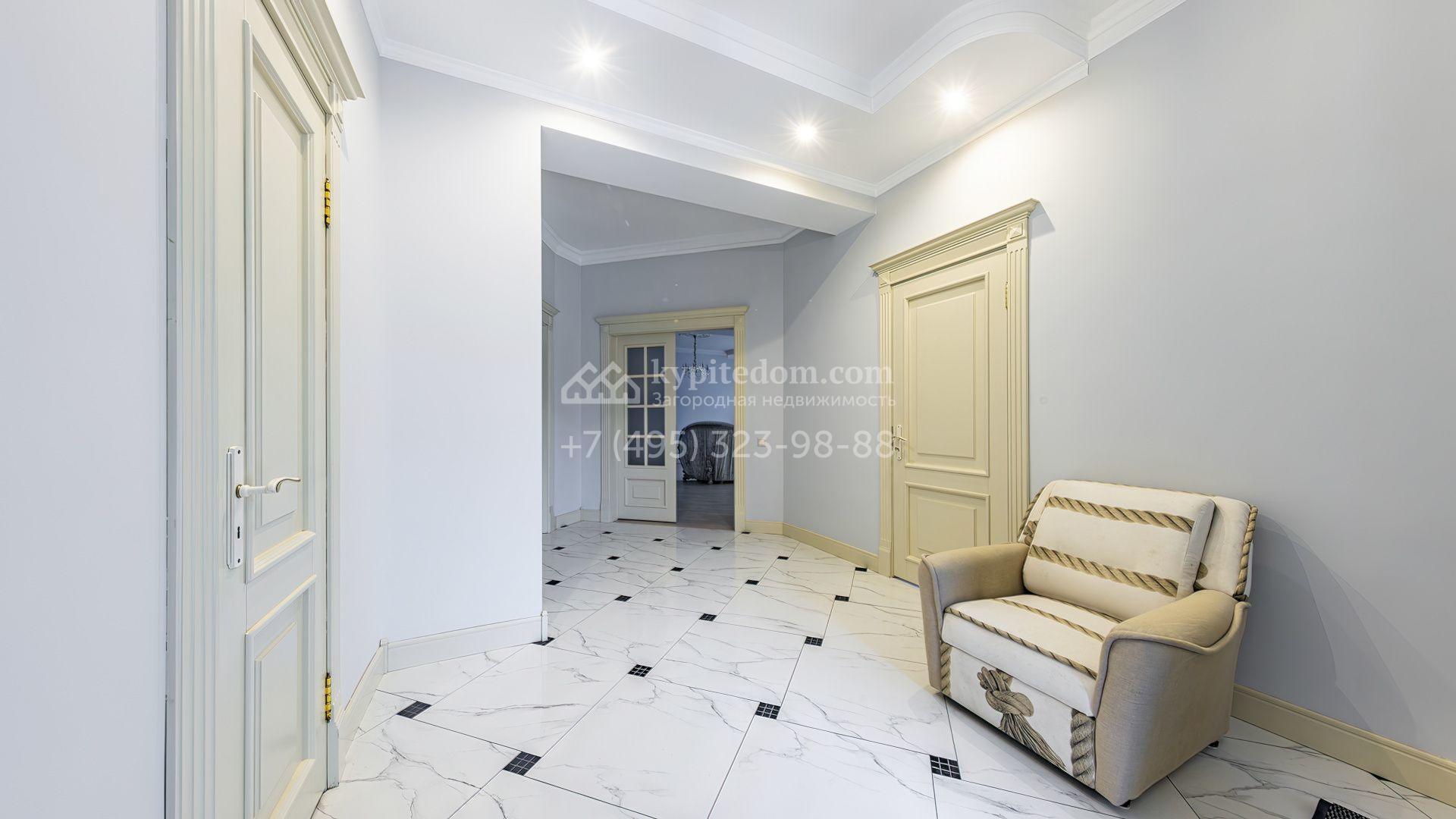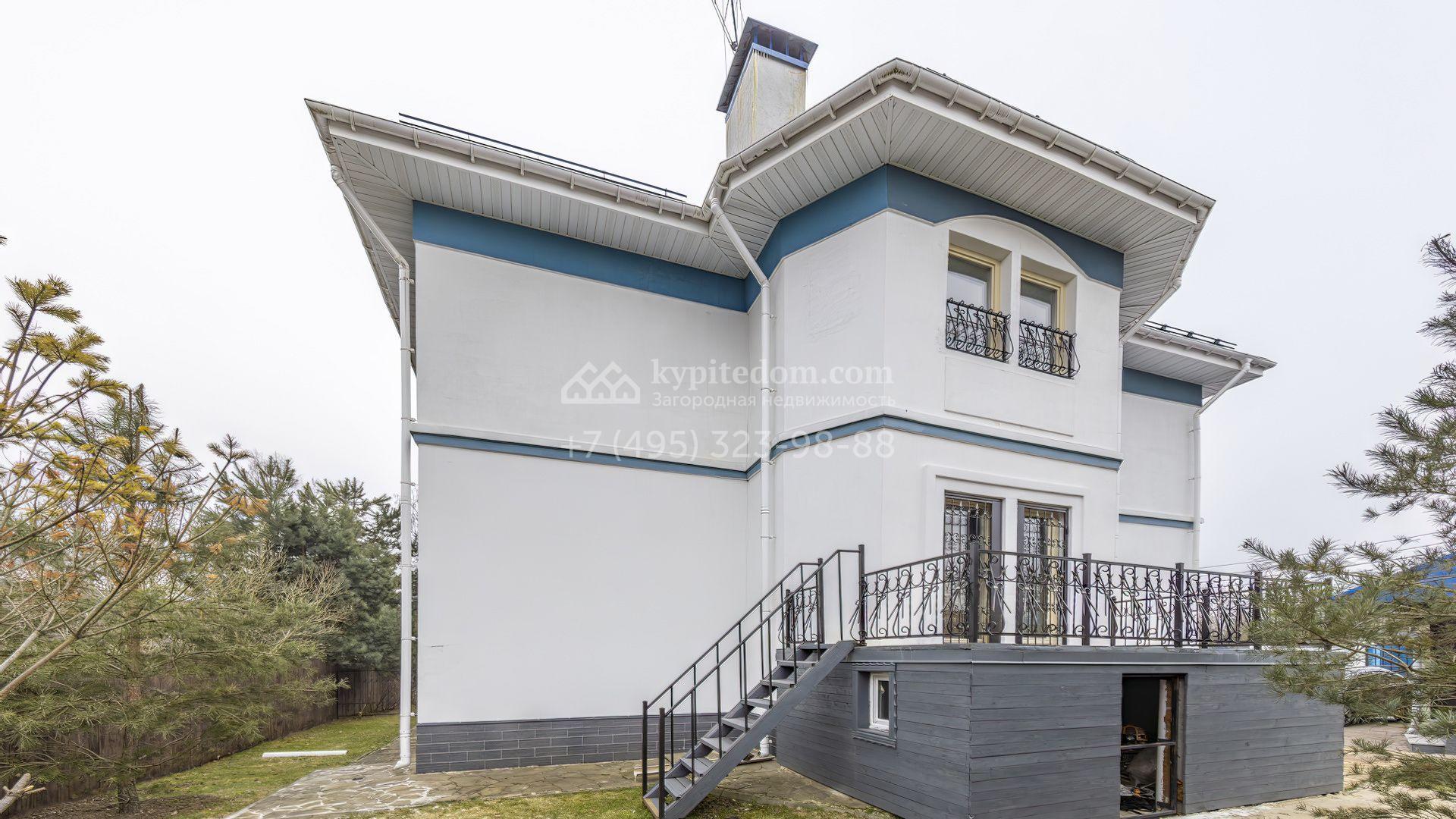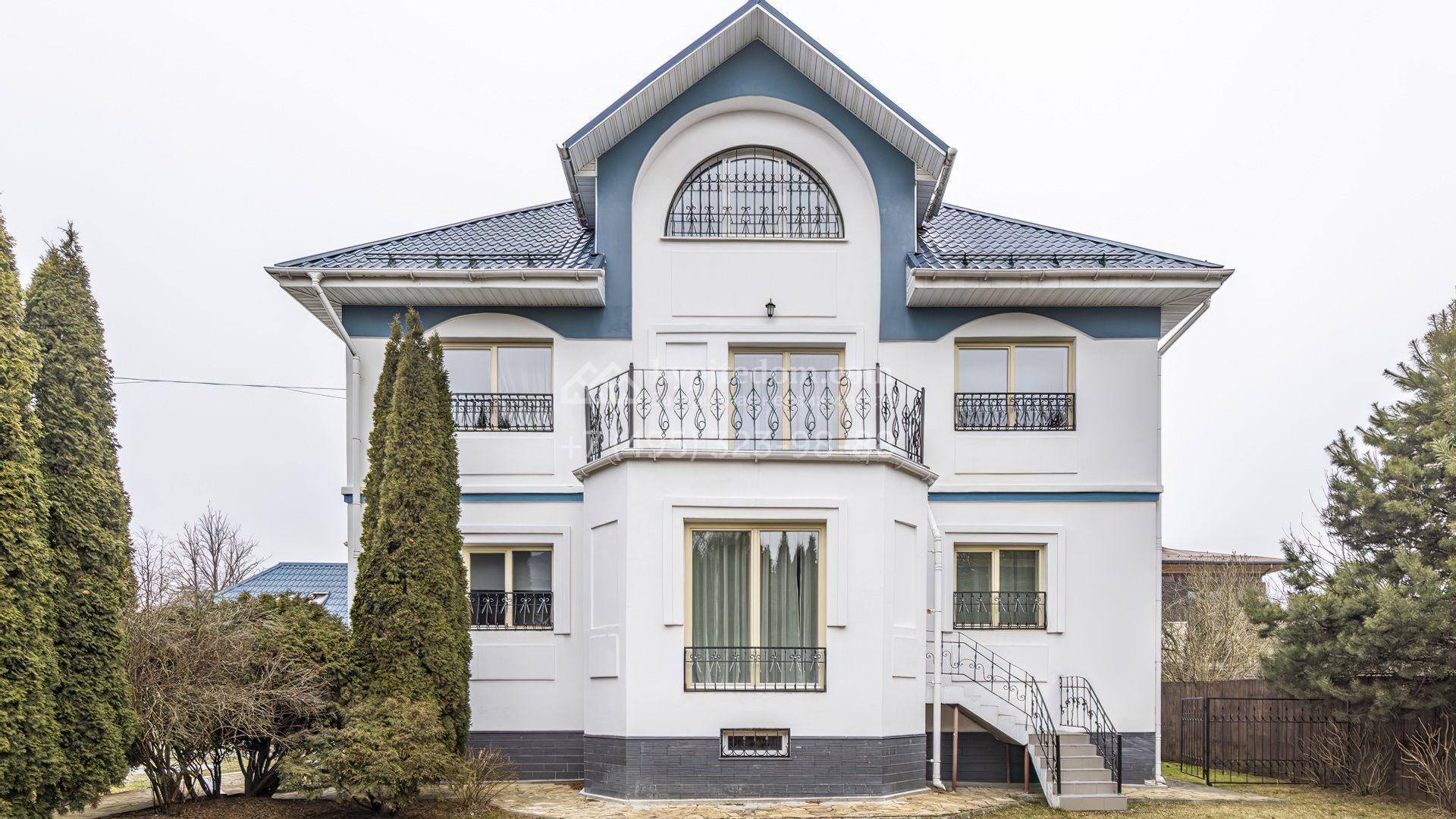 Загородный коттедж площадью 350 м² расположен на полевом участке 10 соток. Фасад выполнен в неоклассическом стиле, облицован штукатуркой и клинкерным кирпичом по цоколю, а также декорирован колоннами и изящными коваными ограждениями. Интерьер выдержан в общей стилистике с домом, отделан в светлых тонах, украшен лепниной на потолке и дополнен новой итальянской мебелью.