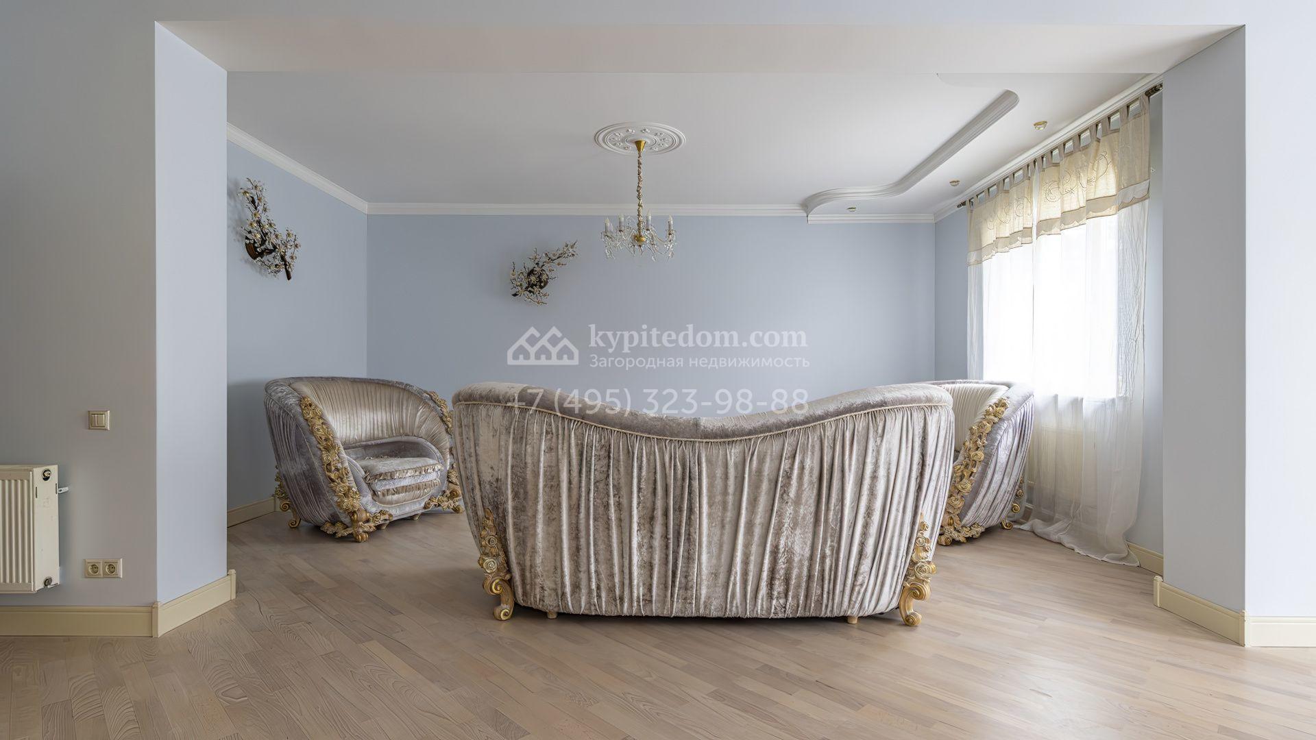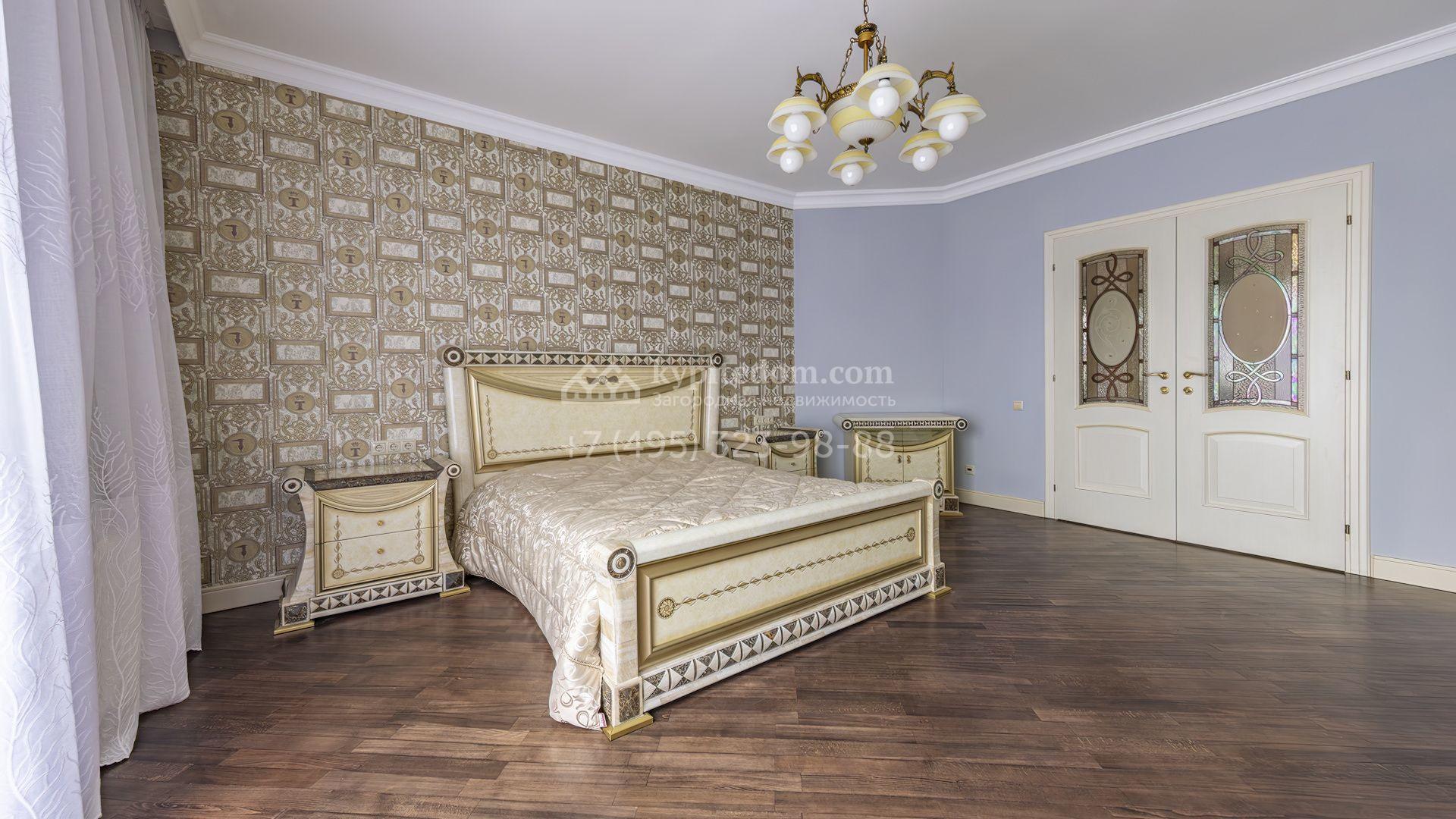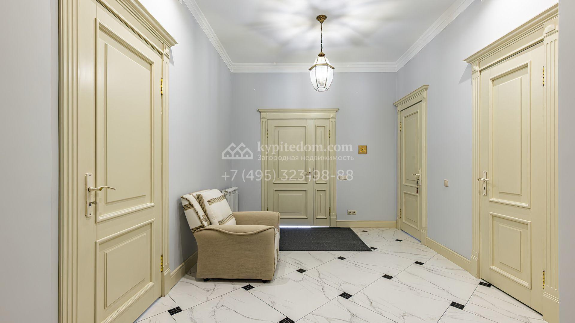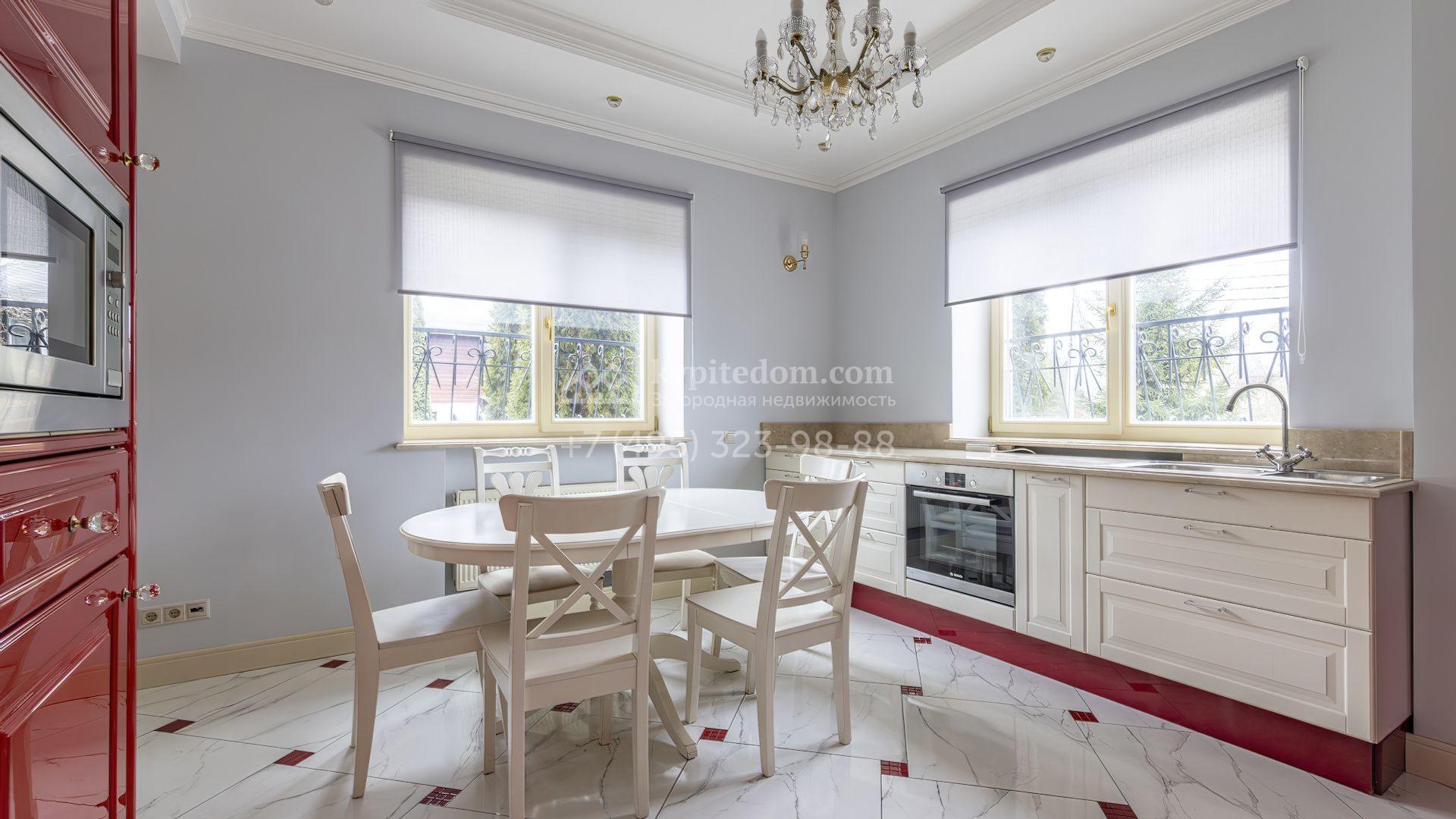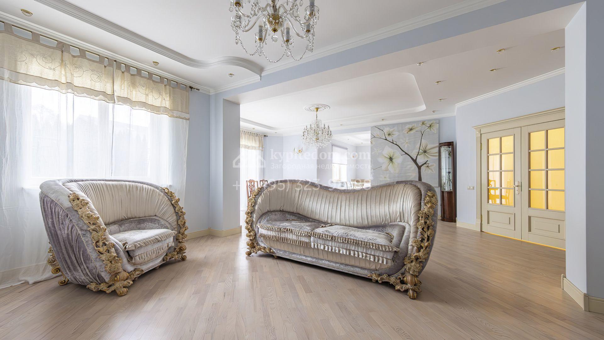 Загородный коттедж площадью 350 м² расположен на полевом участке 10 соток. Фасад выполнен в неоклассическом стиле, облицован штукатуркой и клинкерным кирпичом по цоколю, а также декорирован колоннами и изящными коваными ограждениями. Интерьер выдержан в общей стилистике с домом, отделан в светлых тонах, украшен лепниной на потолке и дополнен новой итальянской мебелью.