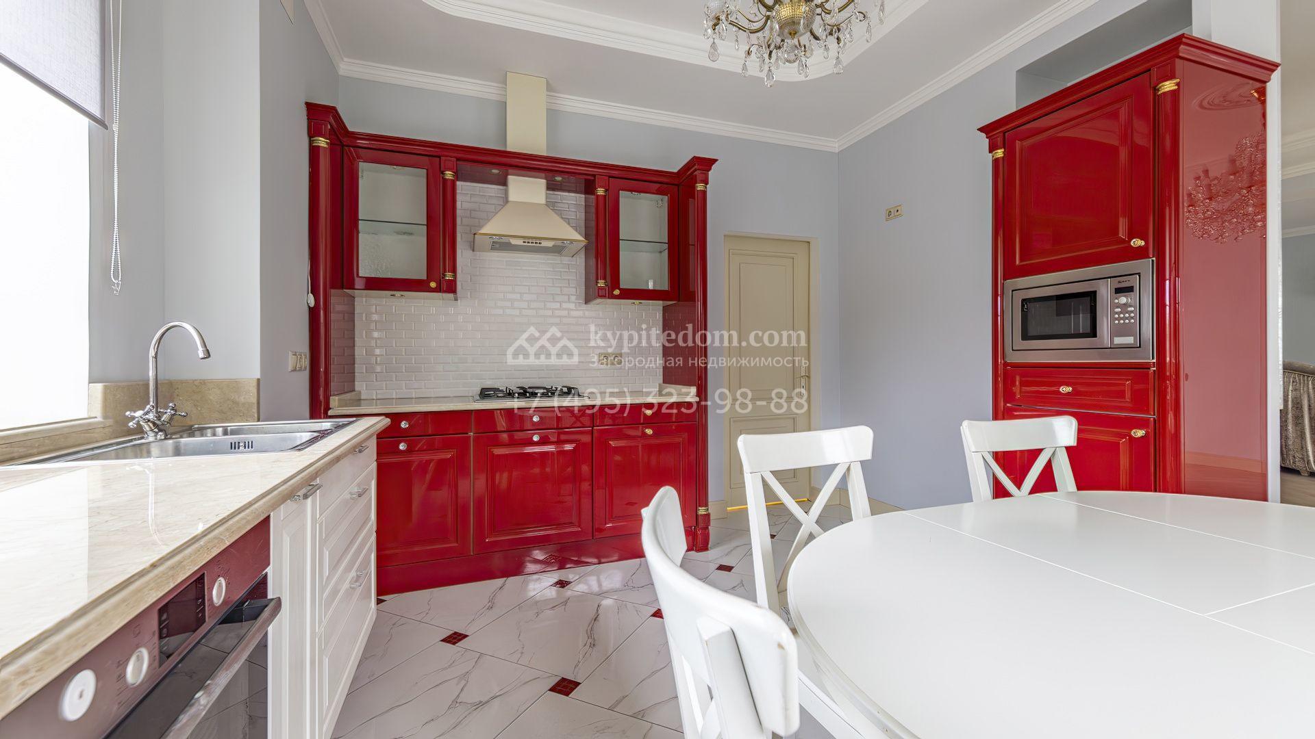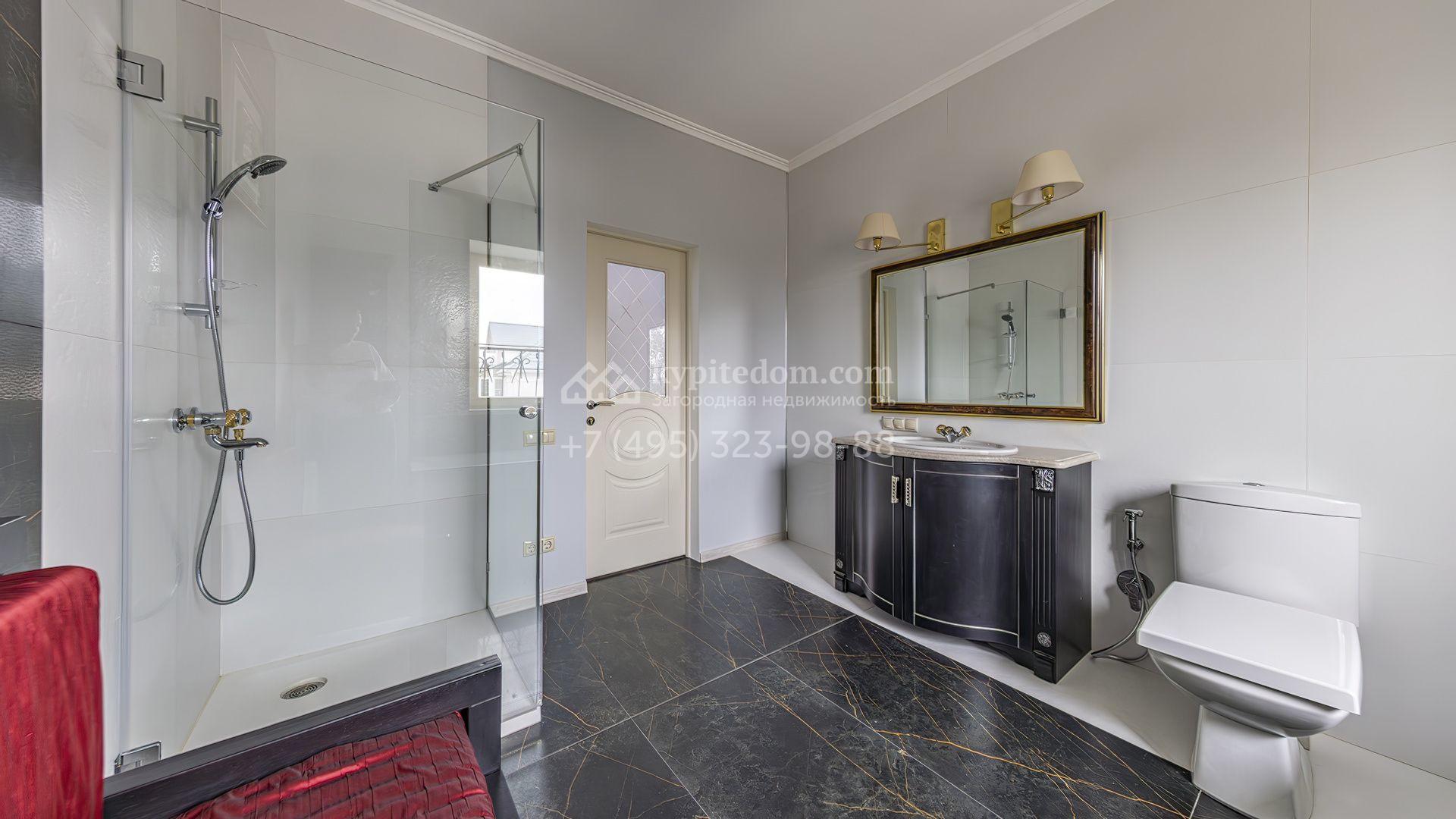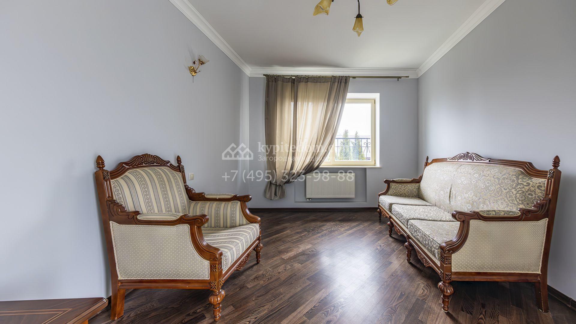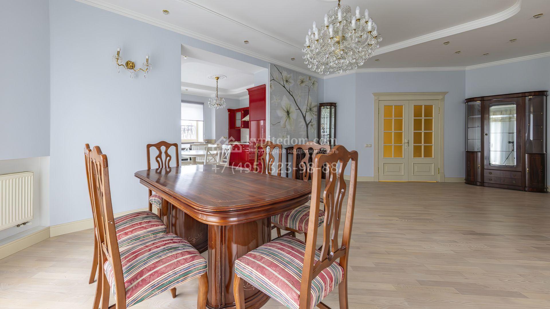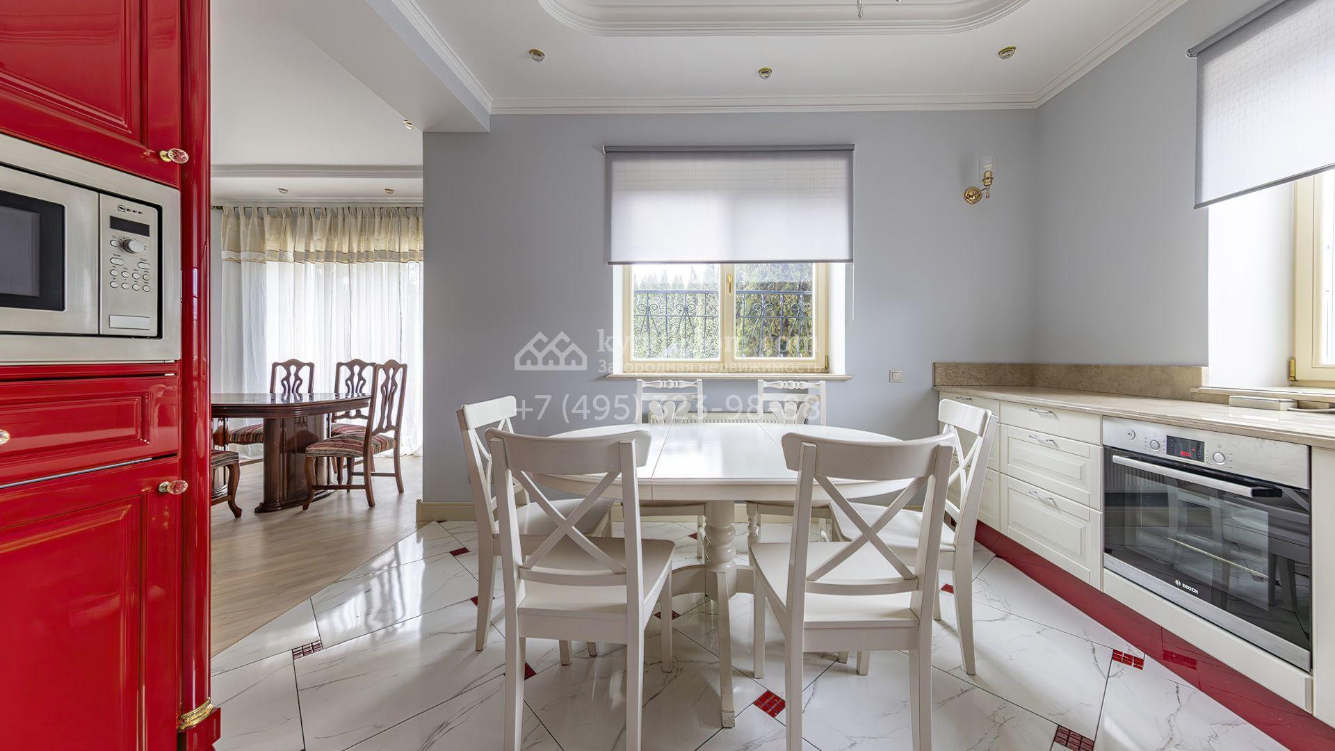 Загородный коттедж площадью 350 м² расположен на полевом участке 10 соток. Фасад выполнен в неоклассическом стиле, облицован штукатуркой и клинкерным кирпичом по цоколю, а также декорирован колоннами и изящными коваными ограждениями. Интерьер выдержан в общей стилистике с домом, отделан в светлых тонах, украшен лепниной на потолке и дополнен новой итальянской мебелью.