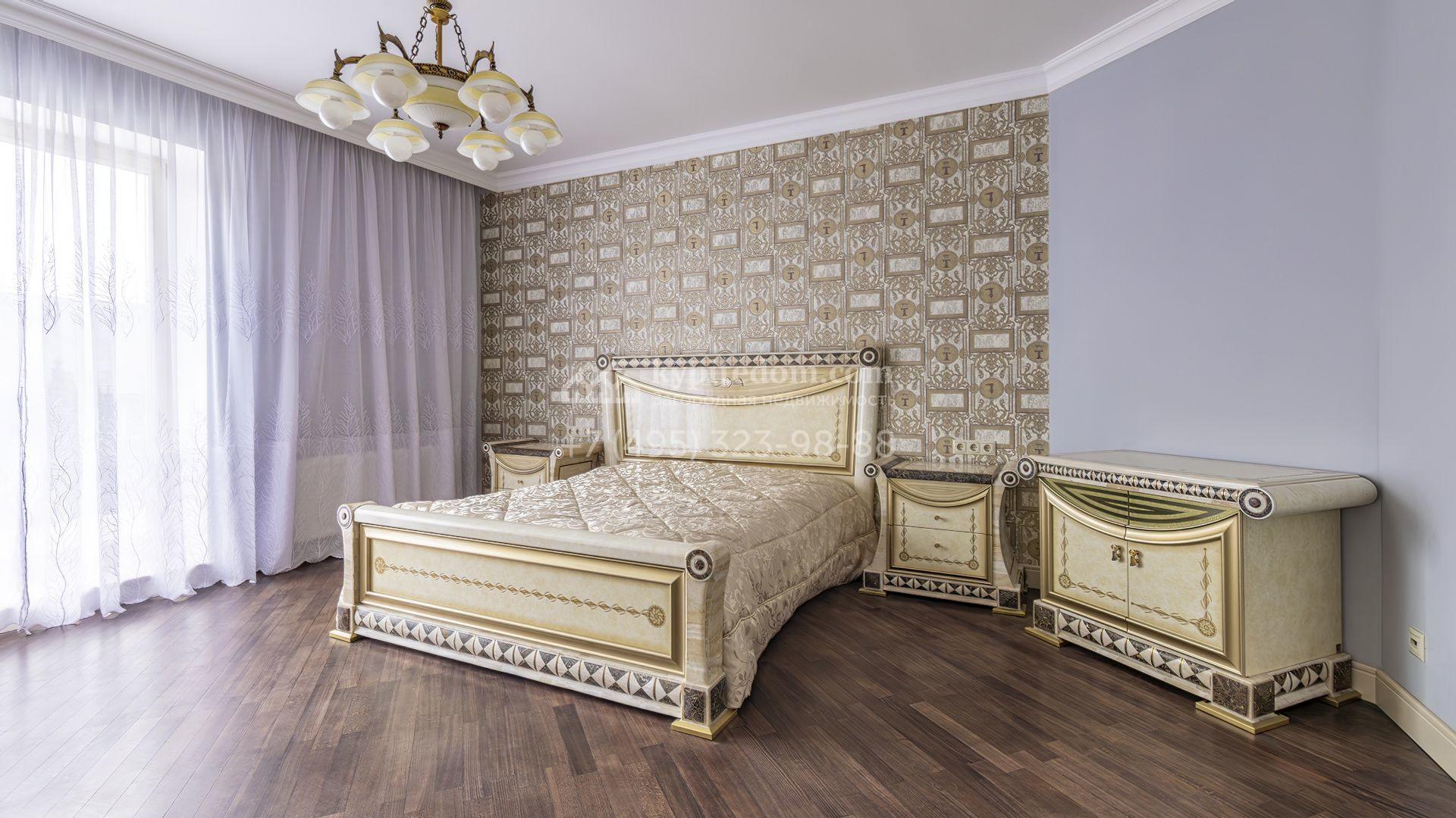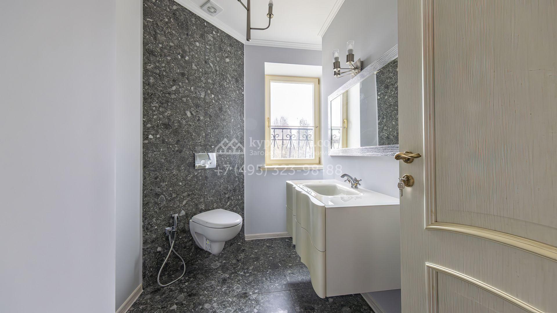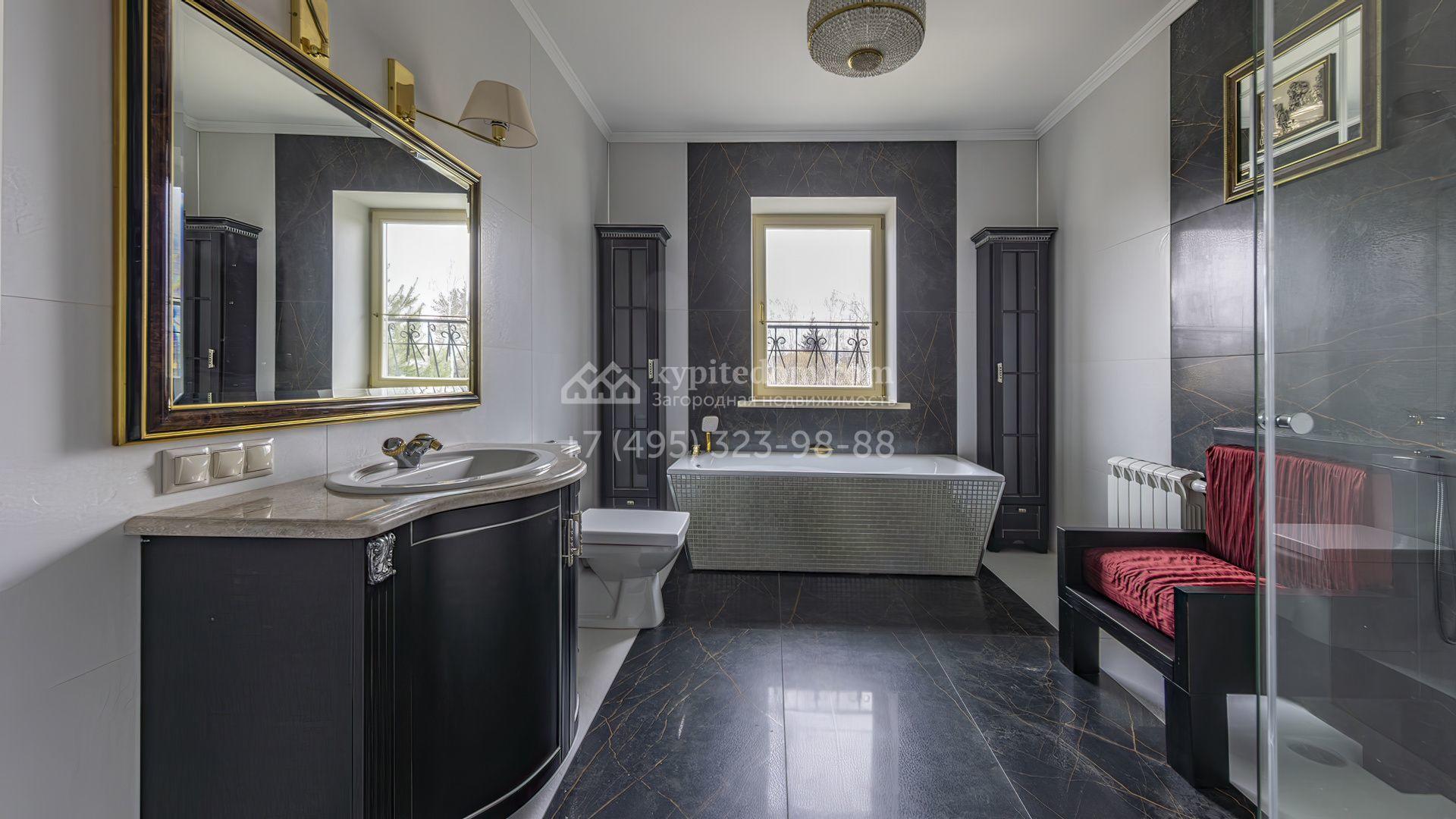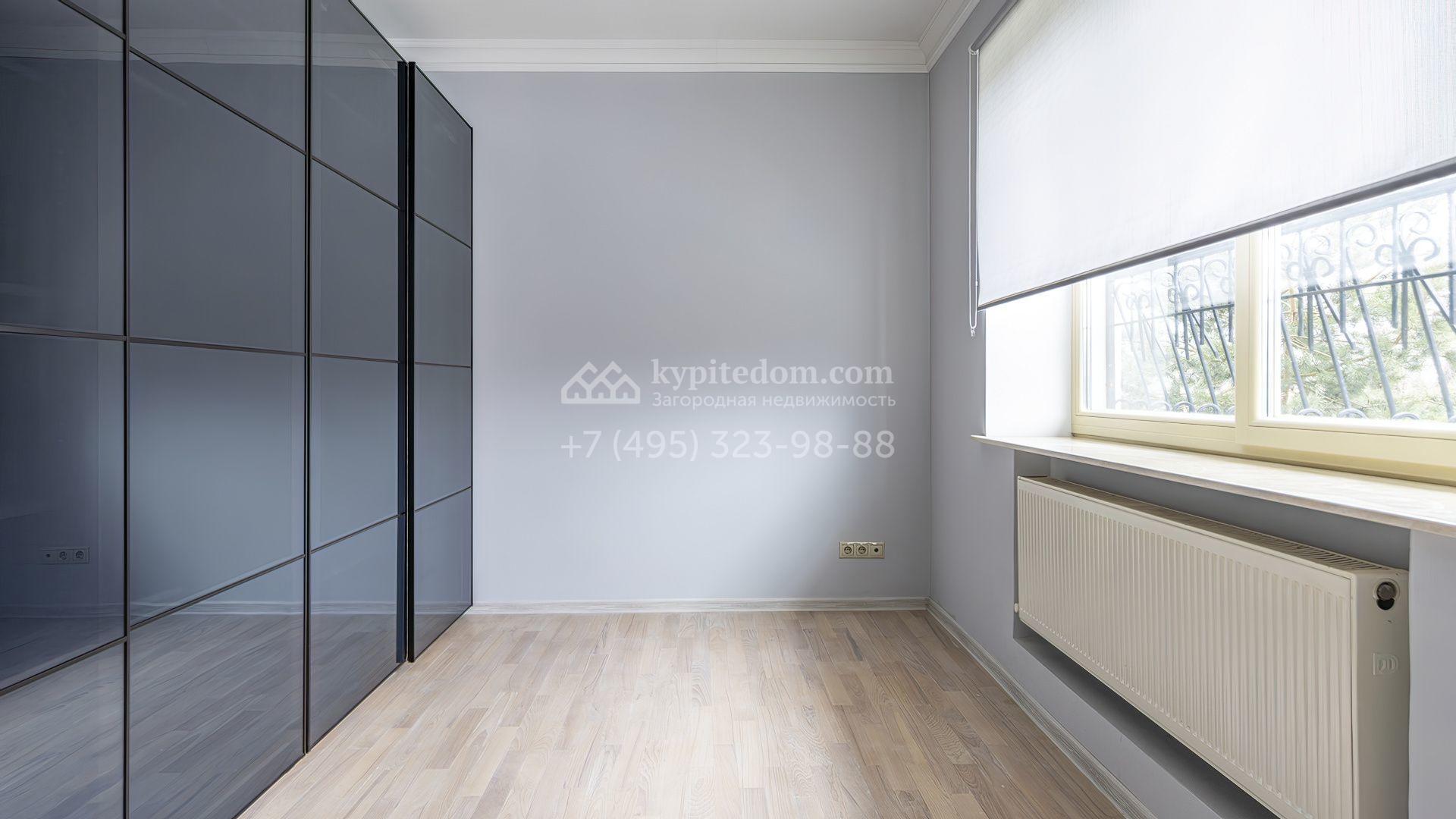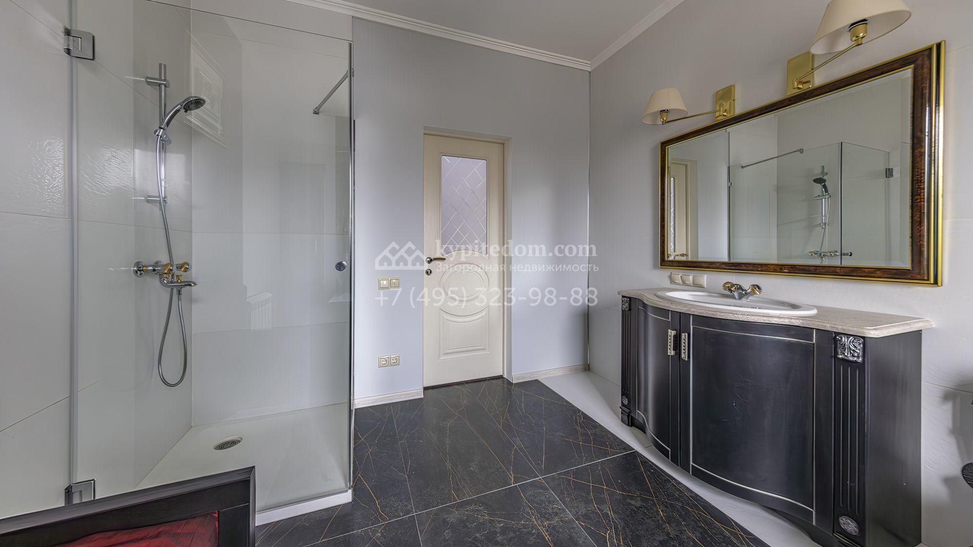 Загородный коттедж площадью 350 м² расположен на полевом участке 10 соток. Фасад выполнен в неоклассическом стиле, облицован штукатуркой и клинкерным кирпичом по цоколю, а также декорирован колоннами и изящными коваными ограждениями. Интерьер выдержан в общей стилистике с домом, отделан в светлых тонах, украшен лепниной на потолке и дополнен новой итальянской мебелью.