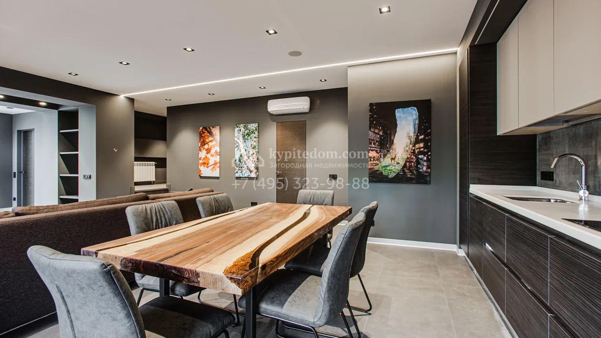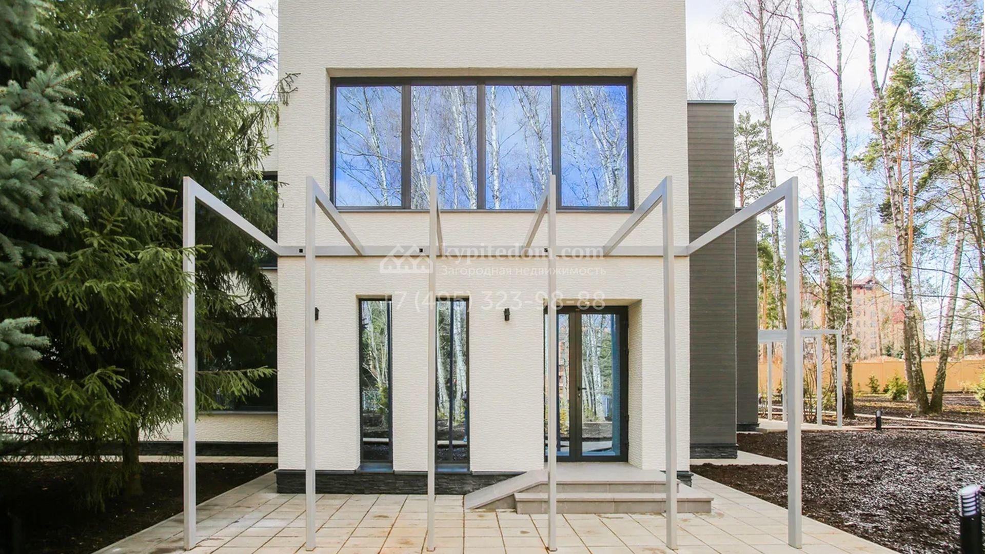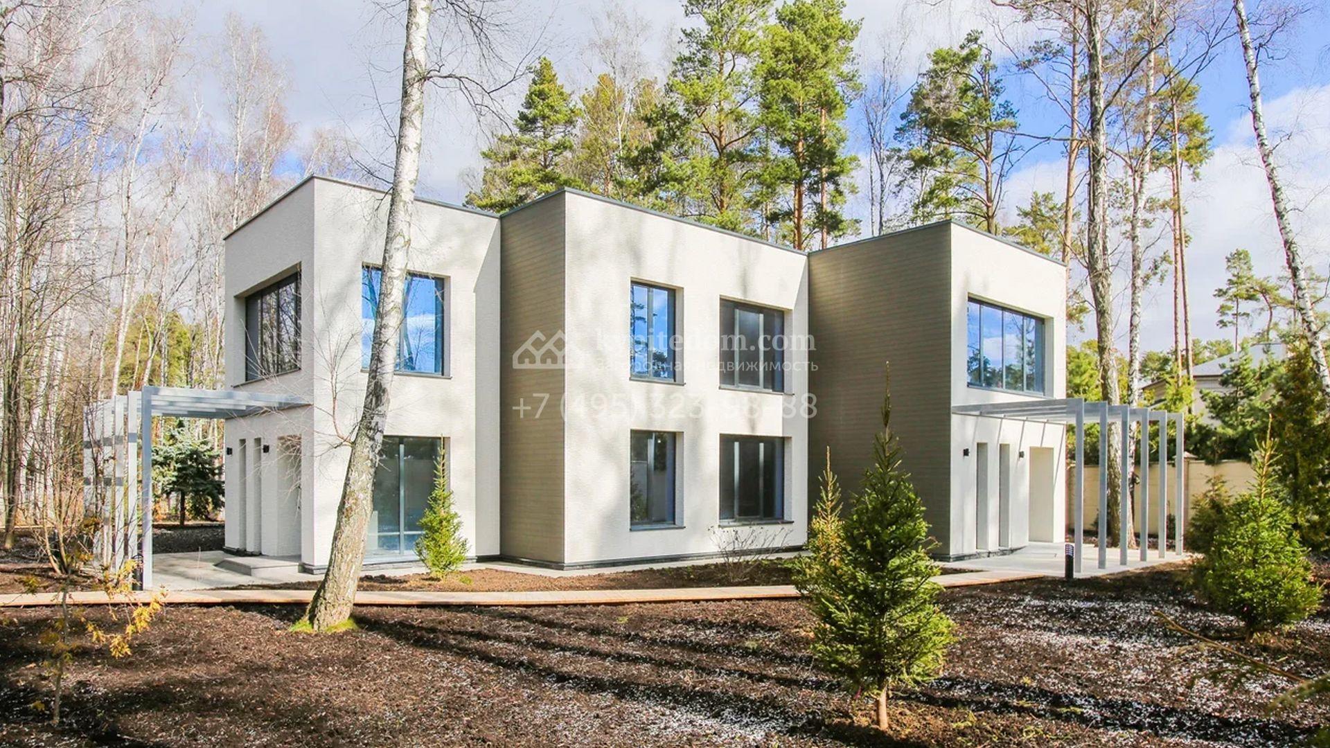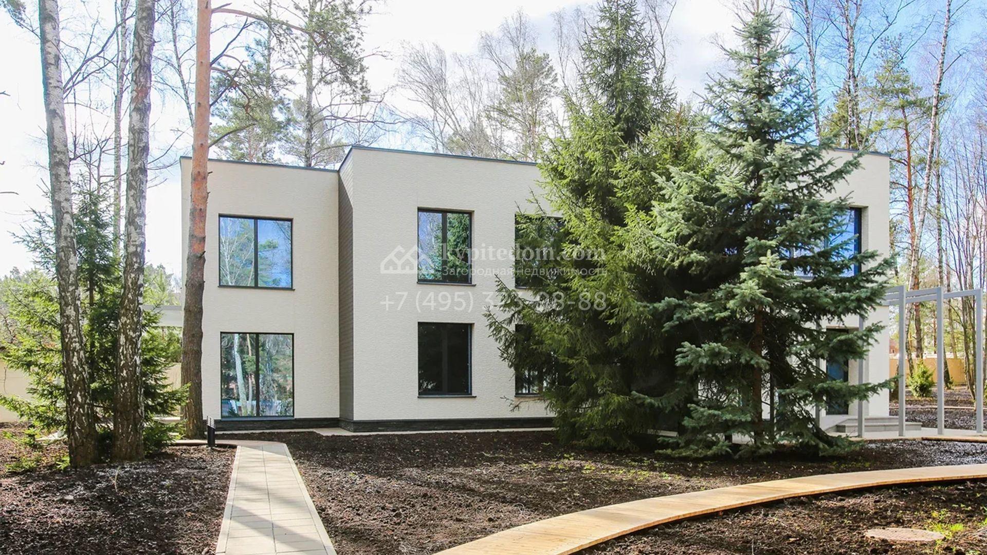 Уютный загородный дом площадью 140 м² в современном стиле расположен на просторном участке 85 соток с соснами, березами и елями. Лаконичный белый фасад дома «составлен» из простых геометрических форм и облицован штукатуркой. На первом этаже расположена кухня-гостиная-столовая в темных сдержанных тонах. На втором этаже 3 спальни в едином современном стиле. Дом полностью меблирован, оборудован выстроенной бытовой техникой и сантехникой. На участке вымостили дорожки, провели уличное освещение. Для детей установили игровую площадку. Машину можно оставить на одном из восьми парковочных мест на территории участка.