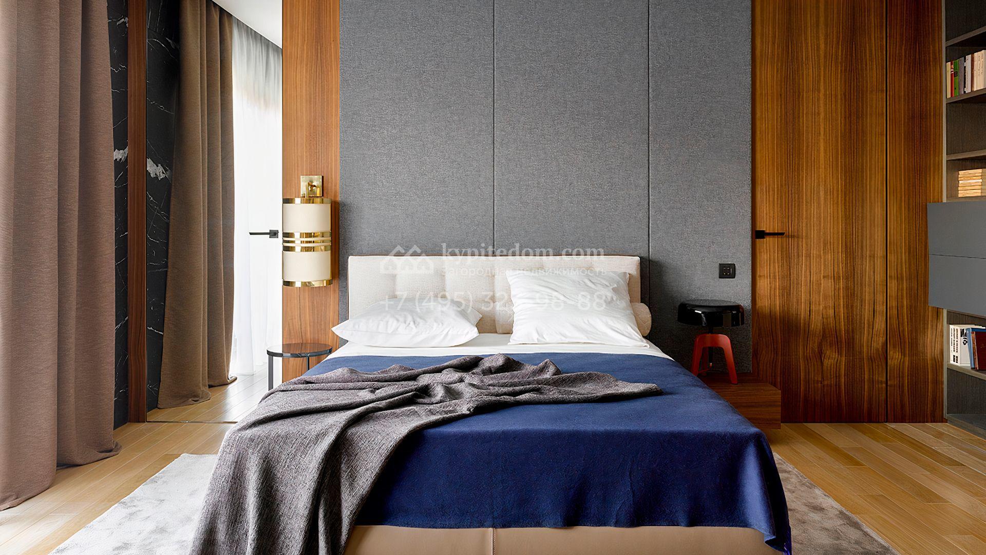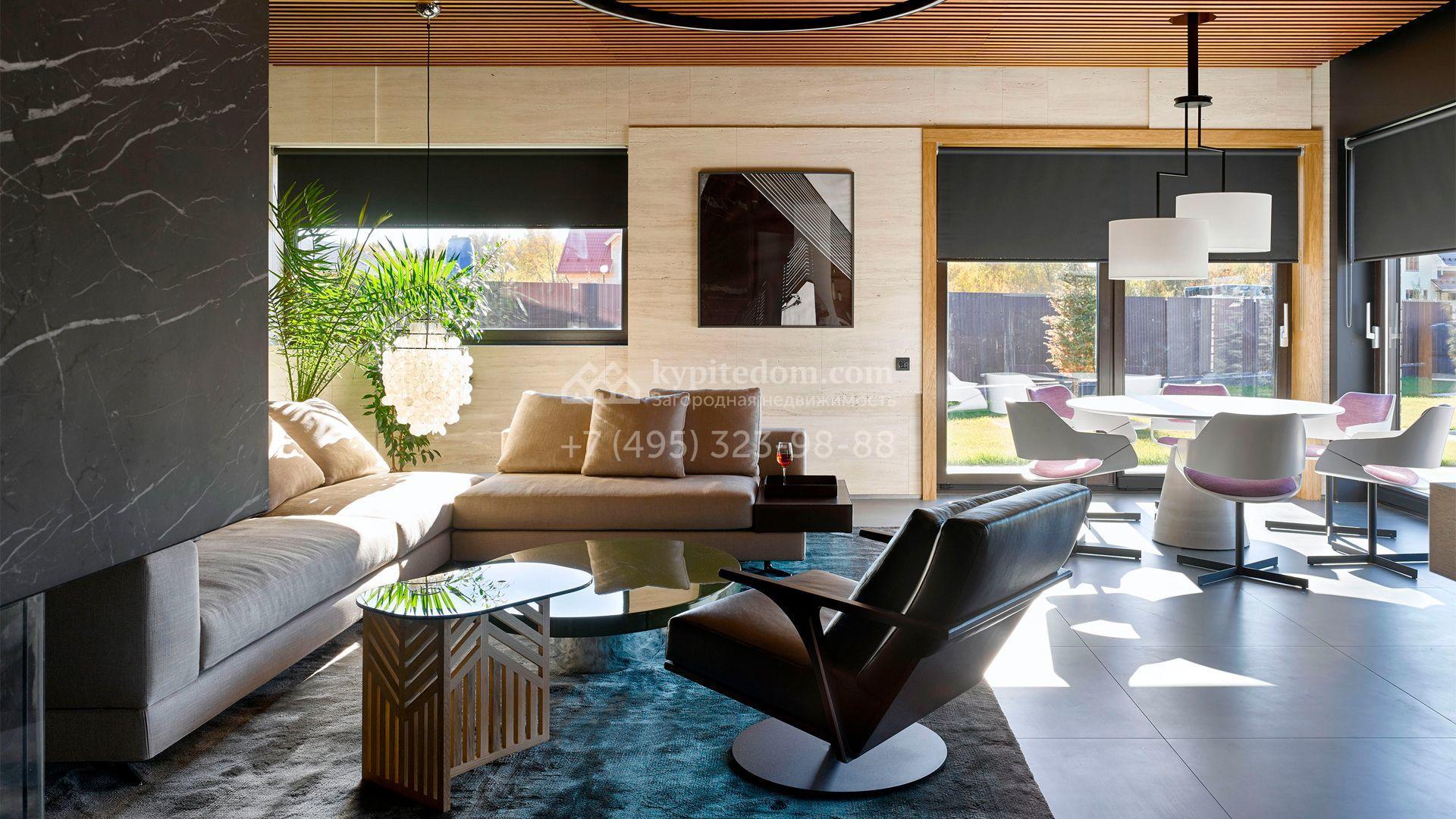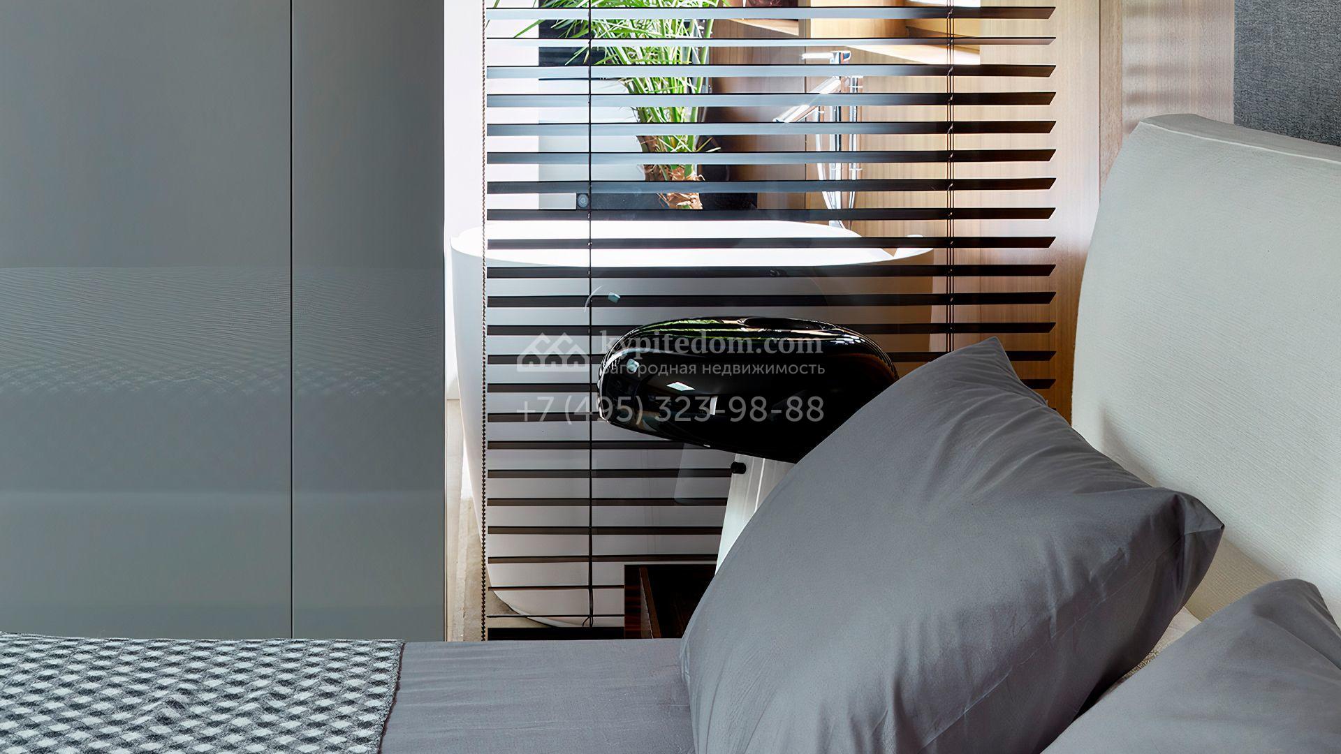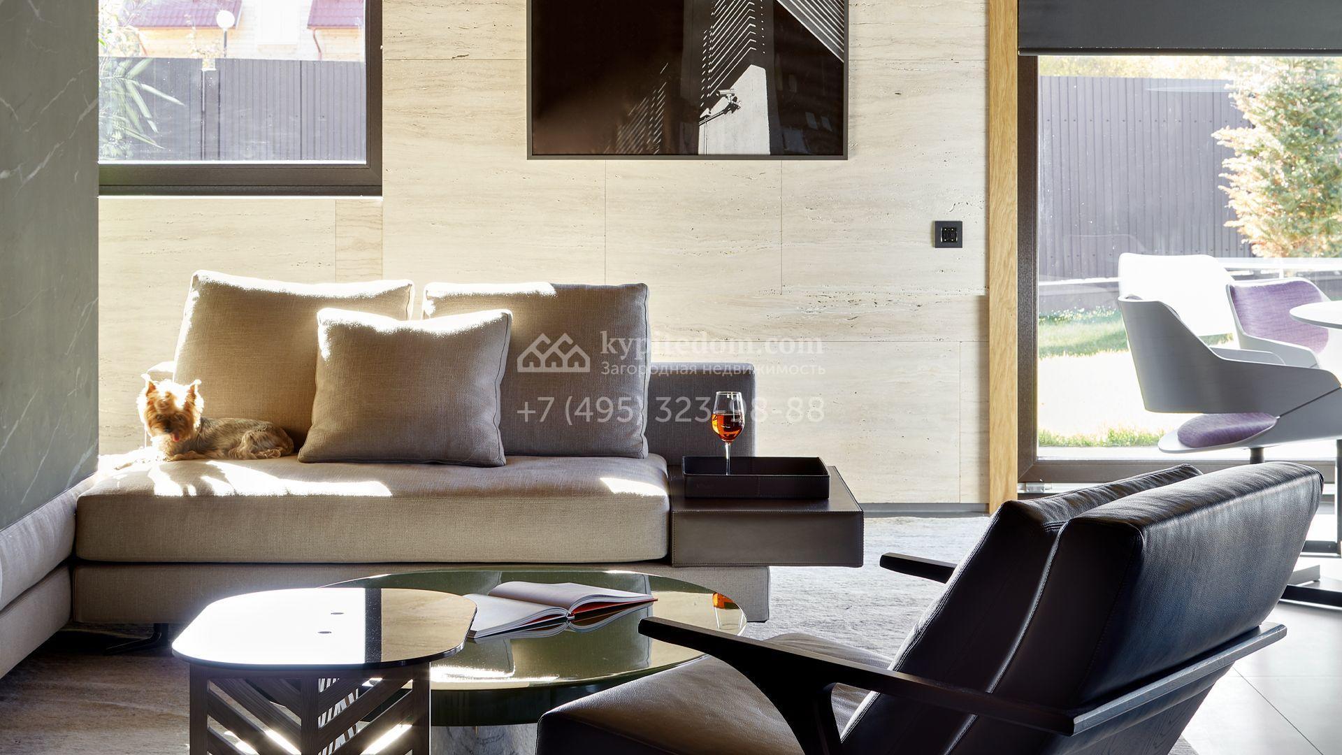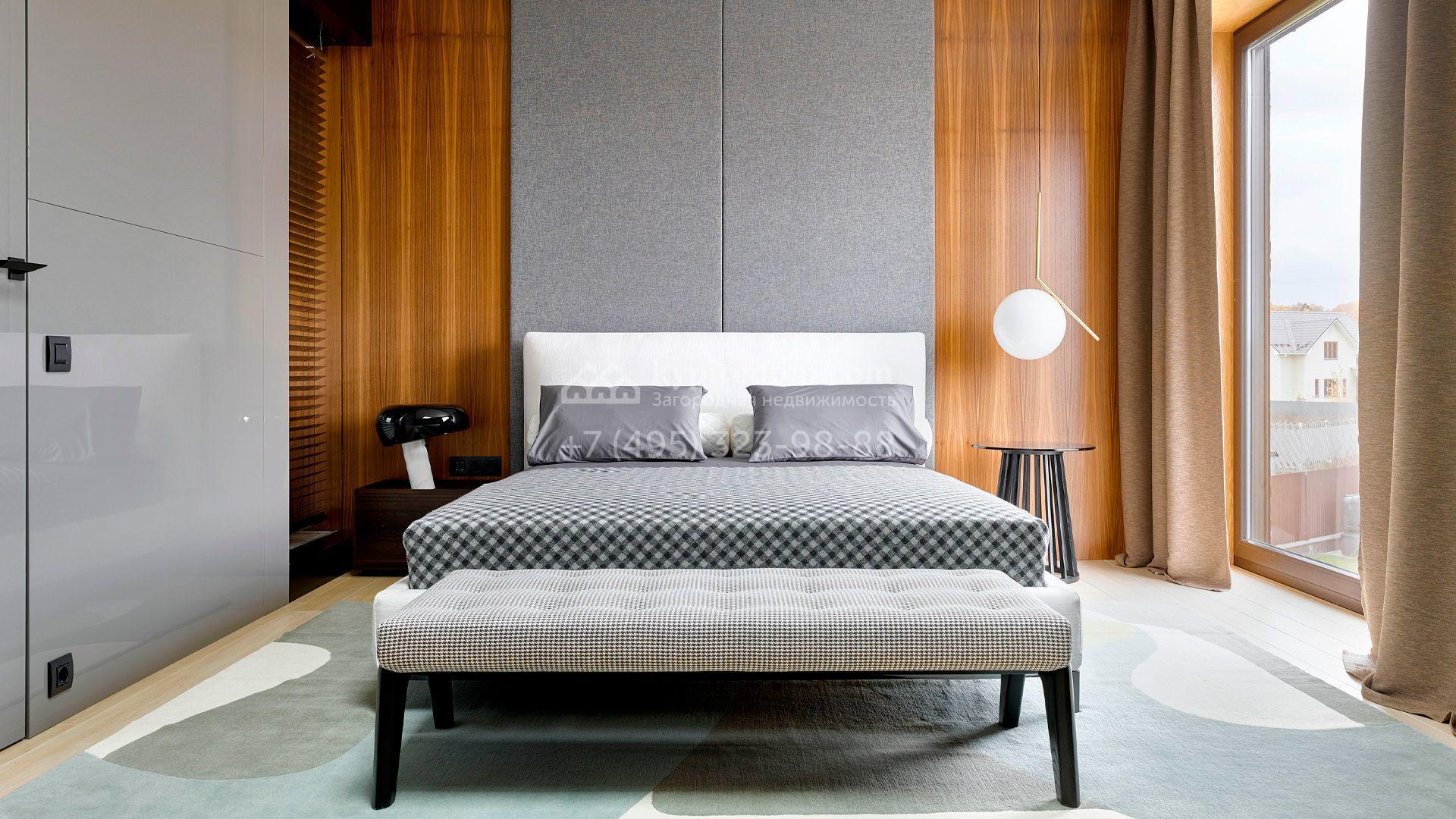 Загородная резиденция с системой «умный дом» площадью 300 м² расположена на участке 16 соток с выходом в лес и к Истринскому водохранилищу. Дом построен по датской технологии Danhaus. На панорамных окнах установлены рольставни. Интерьер выполнен по проекту дизайнера Макса Касимова в приглушенных оттенках в современном стиле. Коттедж полностью меблирован, декорирован коврами и аксессуарами Minotti, Okha, установлена итальянская сантехника. Внутри спланировали 4 спальни, кухню-гостиную с камином и террасу. На территории предусмотрены хозяйственный блок с гаражом, сауна с летней кухней и бассейн с подогревом. На участке вымощены дорожки из гранита, оборудована система полива.