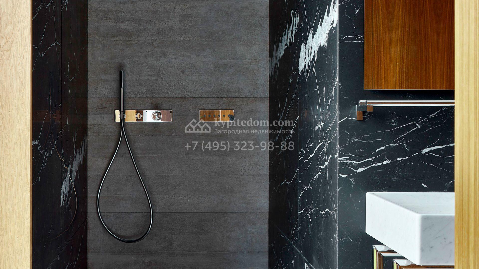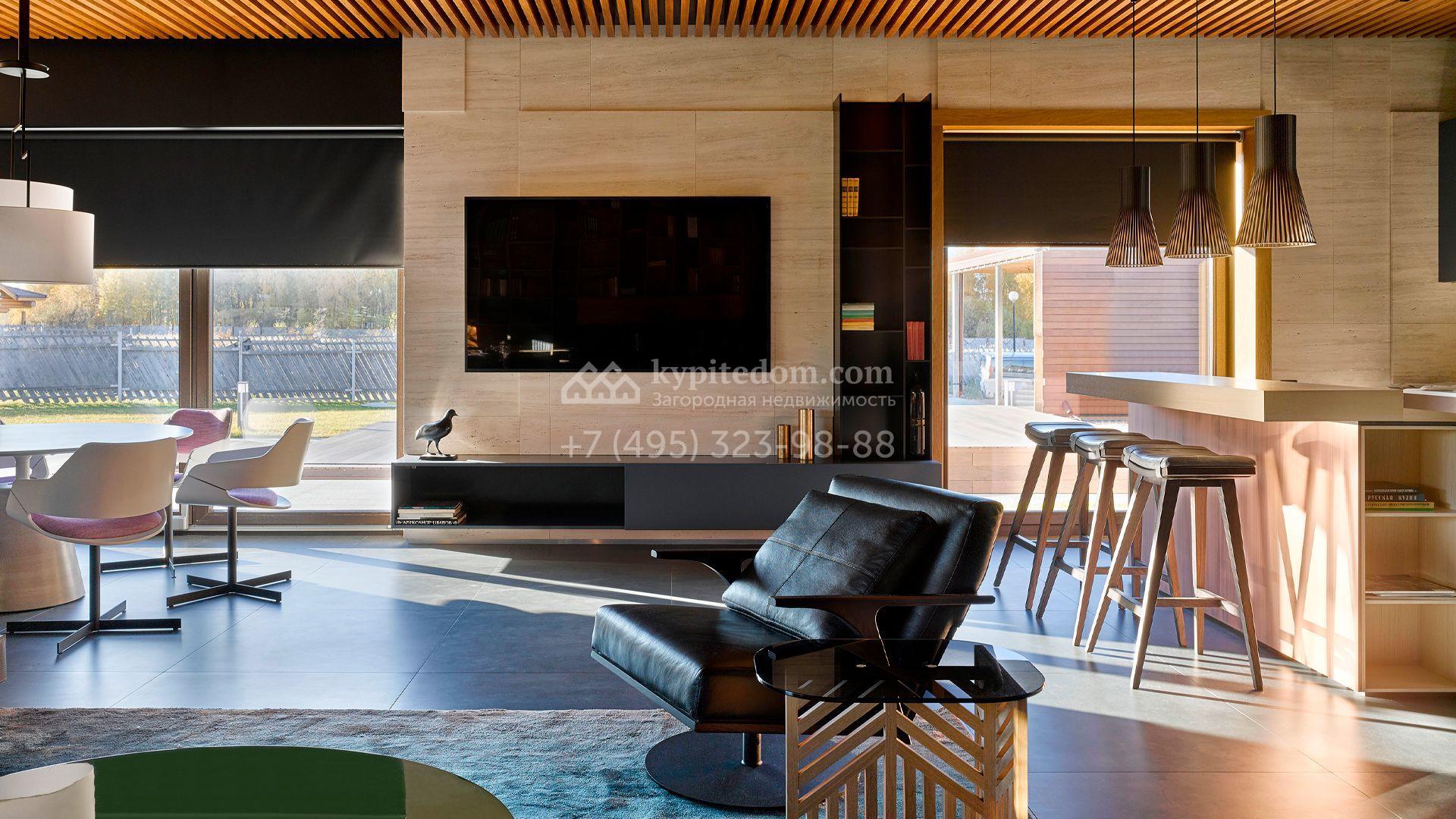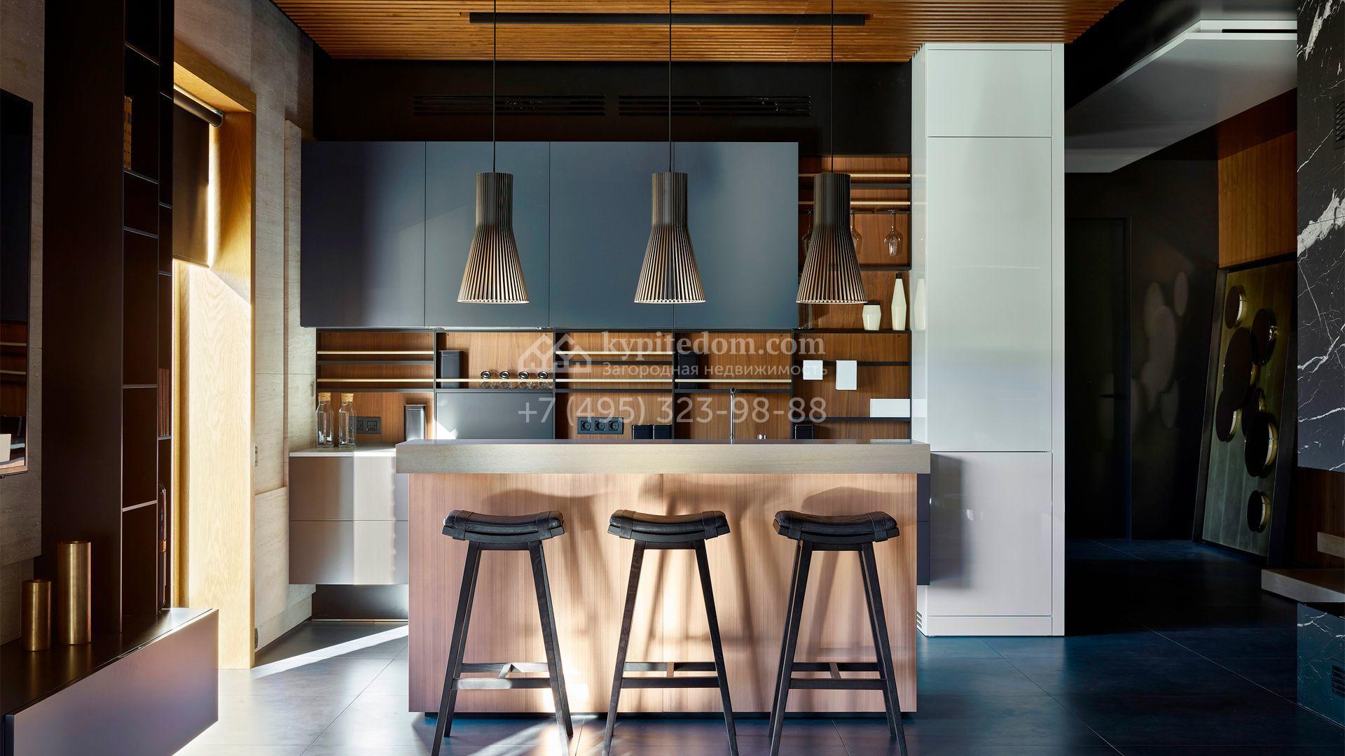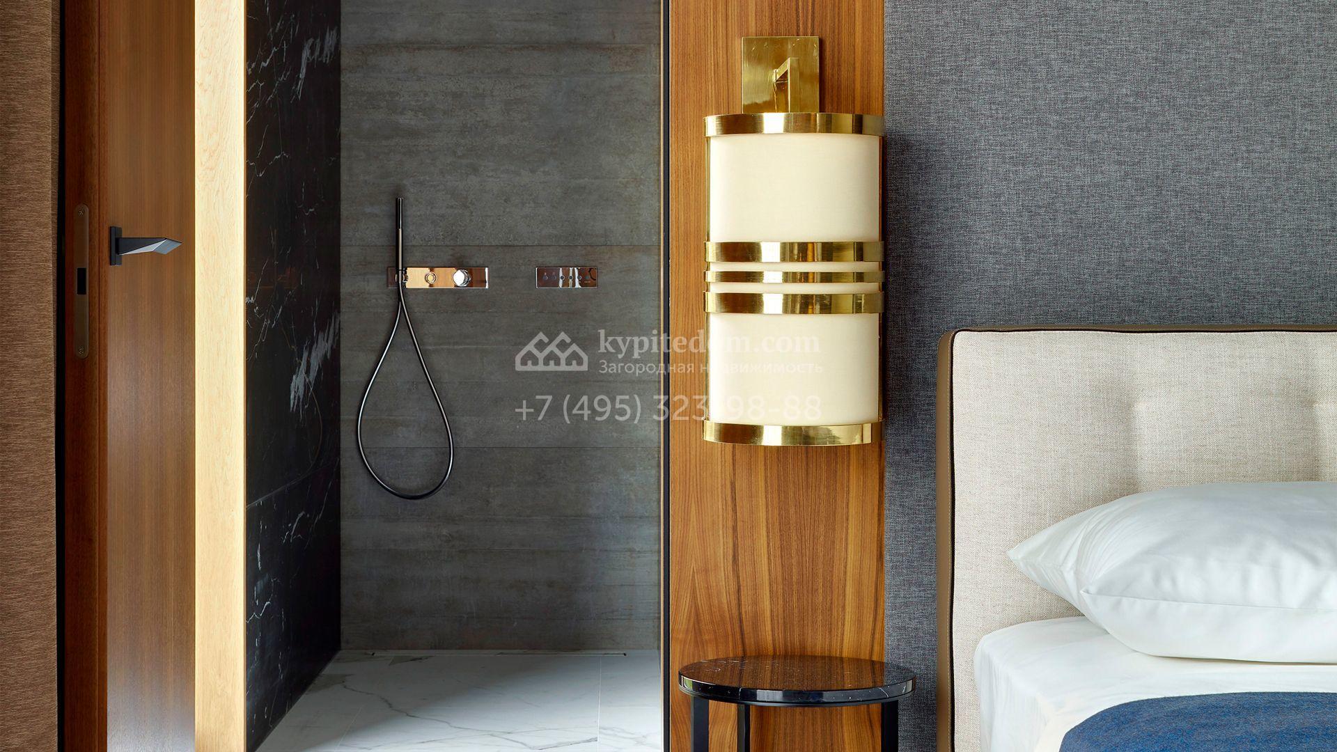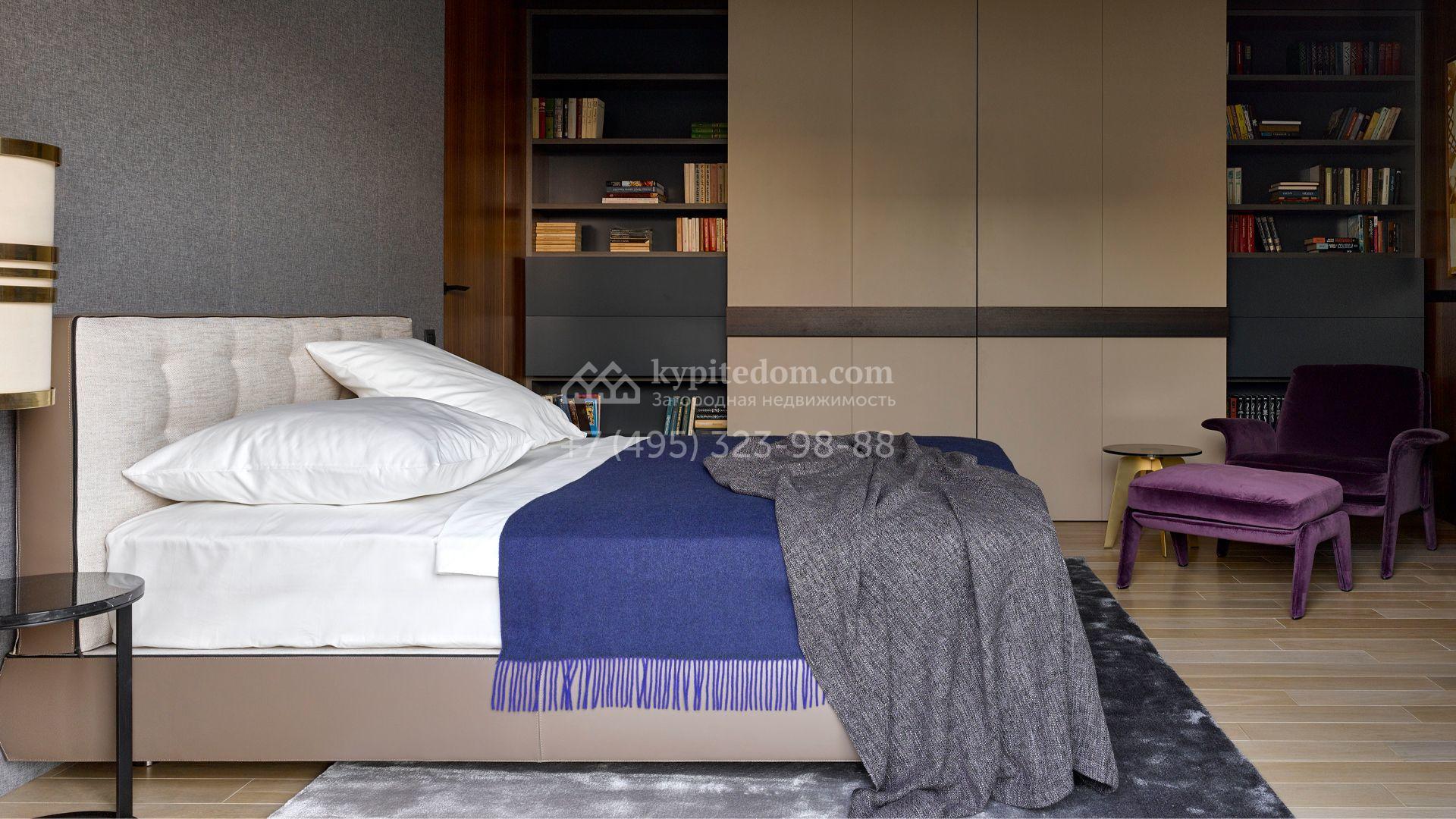 Загородная резиденция с системой «умный дом» площадью 300 м² расположена на участке 16 соток с выходом в лес и к Истринскому водохранилищу. Дом построен по датской технологии Danhaus. На панорамных окнах установлены рольставни. Интерьер выполнен по проекту дизайнера Макса Касимова в приглушенных оттенках в современном стиле. Коттедж полностью меблирован, декорирован коврами и аксессуарами Minotti, Okha, установлена итальянская сантехника. Внутри спланировали 4 спальни, кухню-гостиную с камином и террасу. На территории предусмотрены хозяйственный блок с гаражом, сауна с летней кухней и бассейн с подогревом. На участке вымощены дорожки из гранита, оборудована система полива.