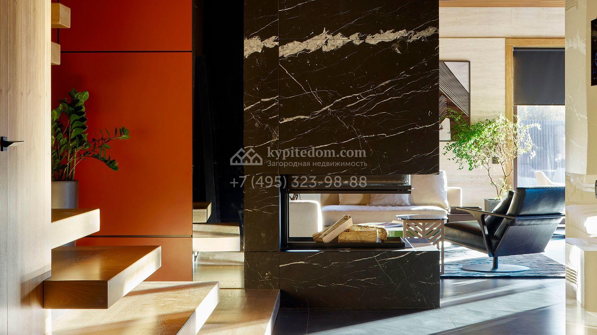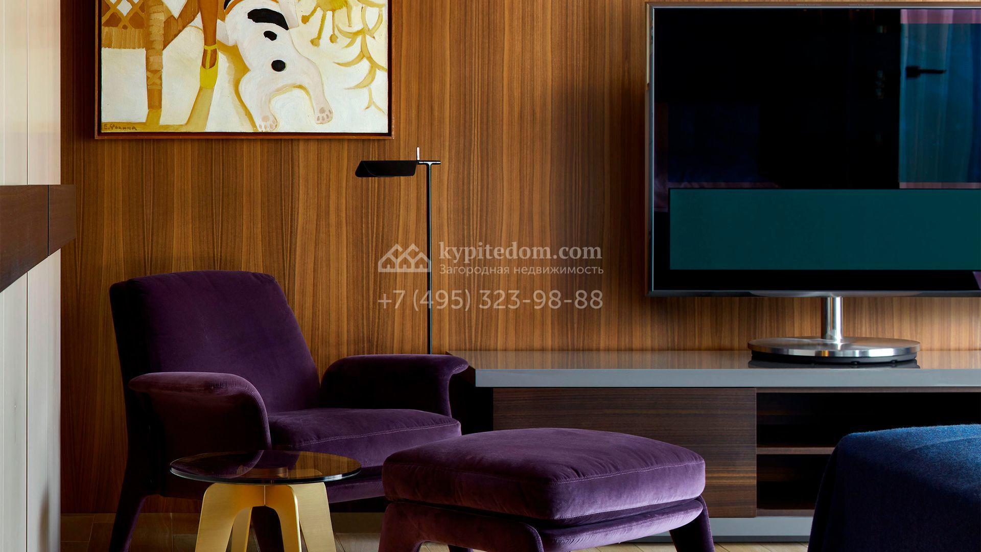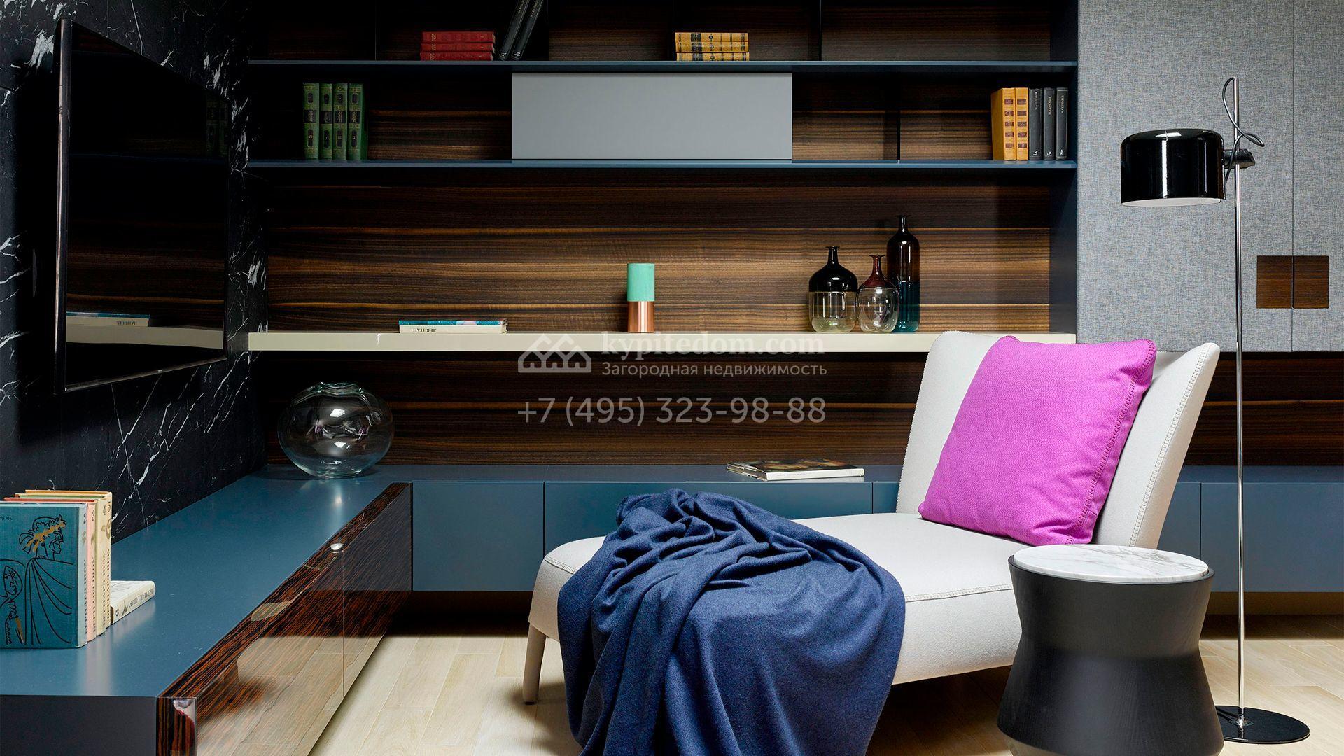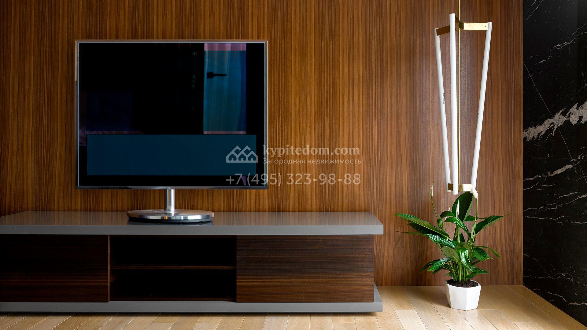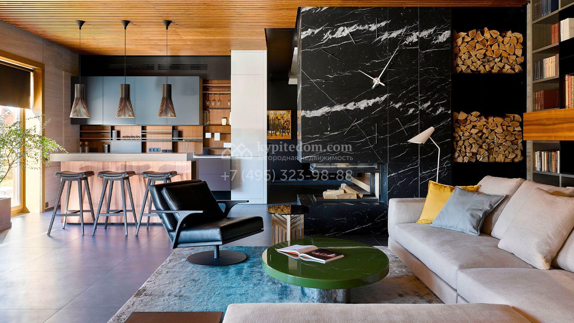 Загородная резиденция с системой «умный дом» площадью 300 м² расположена на участке 16 соток с выходом в лес и к Истринскому водохранилищу. Дом построен по датской технологии Danhaus. На панорамных окнах установлены рольставни. Интерьер выполнен по проекту дизайнера Макса Касимова в приглушенных оттенках в современном стиле. Коттедж полностью меблирован, декорирован коврами и аксессуарами Minotti, Okha, установлена итальянская сантехника. Внутри спланировали 4 спальни, кухню-гостиную с камином и террасу. На территории предусмотрены хозяйственный блок с гаражом, сауна с летней кухней и бассейн с подогревом. На участке вымощены дорожки из гранита, оборудована система полива.