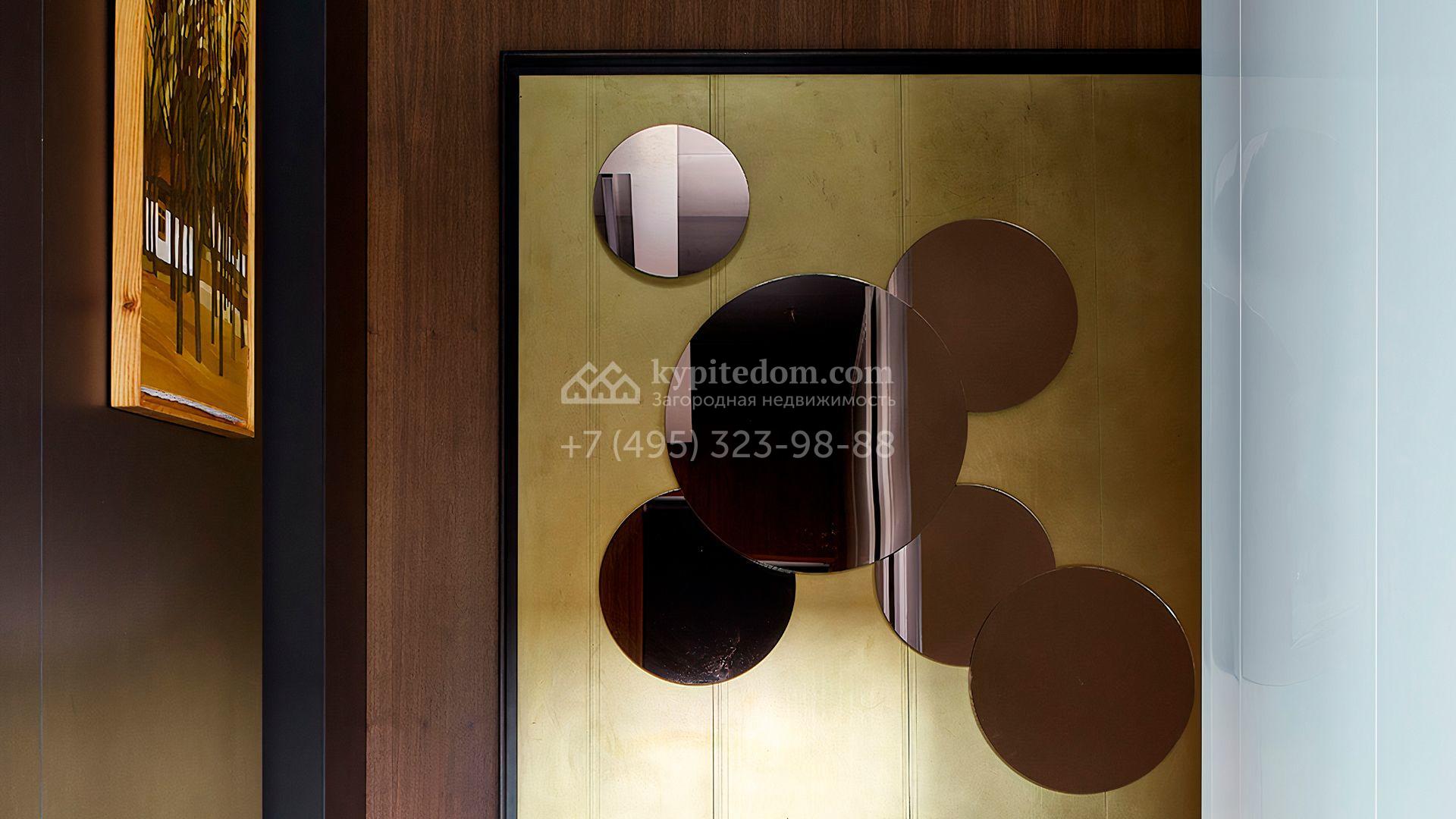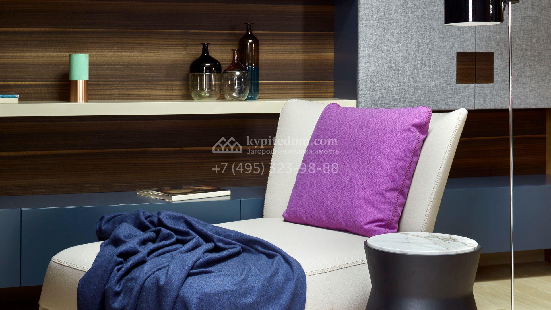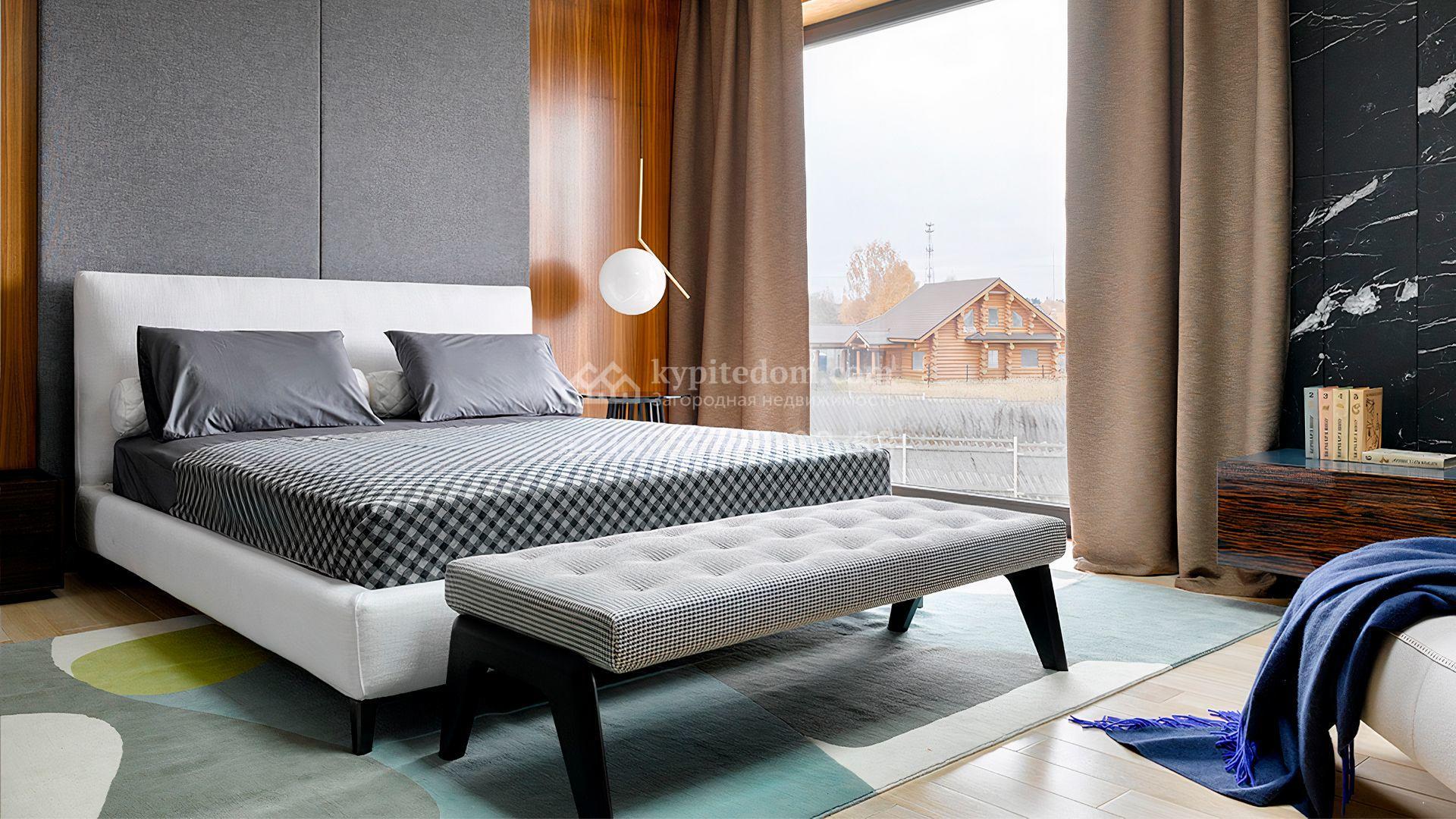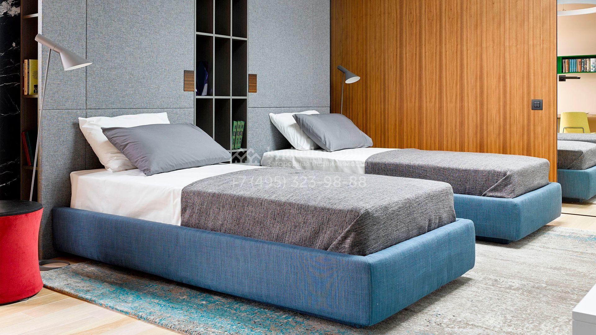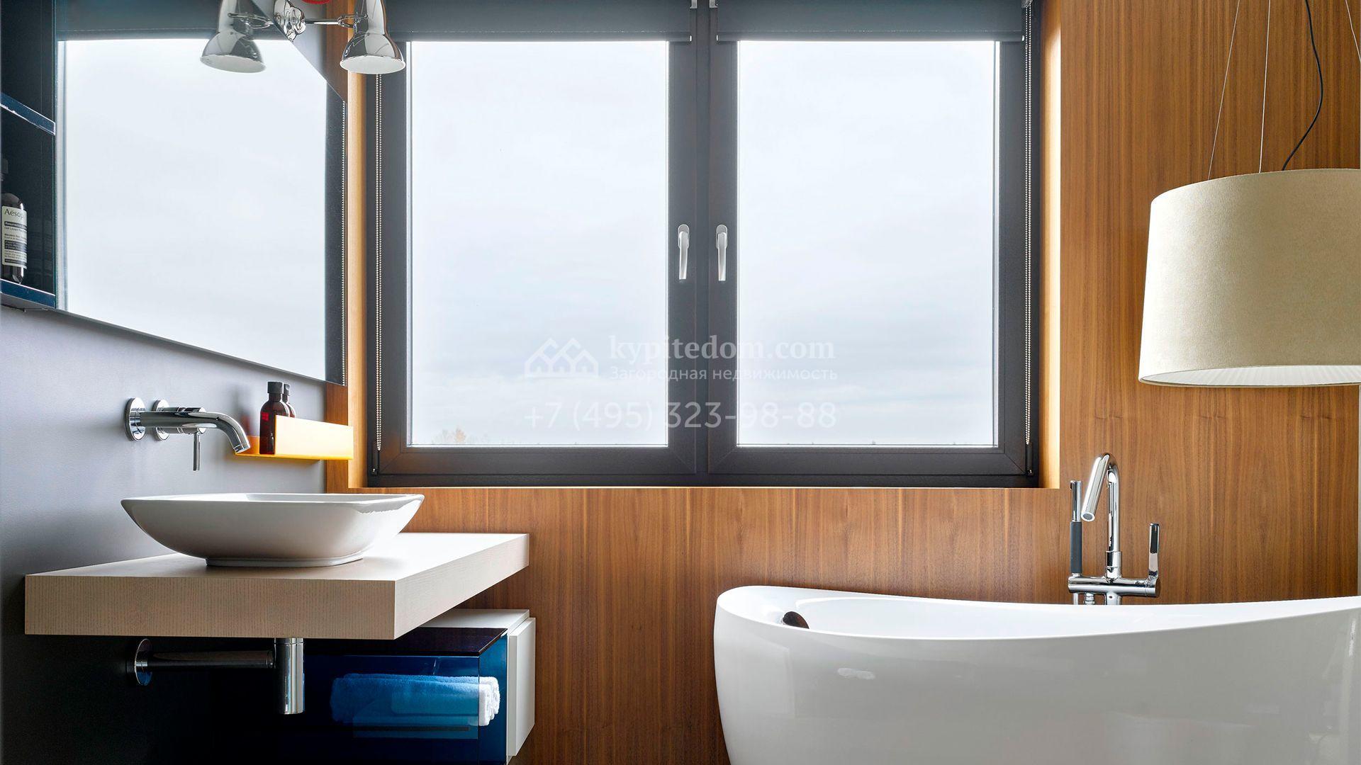 Загородная резиденция с системой «умный дом» площадью 300 м² расположена на участке 16 соток с выходом в лес и к Истринскому водохранилищу. Дом построен по датской технологии Danhaus. На панорамных окнах установлены рольставни. Интерьер выполнен по проекту дизайнера Макса Касимова в приглушенных оттенках в современном стиле. Коттедж полностью меблирован, декорирован коврами и аксессуарами Minotti, Okha, установлена итальянская сантехника. Внутри спланировали 4 спальни, кухню-гостиную с камином и террасу. На территории предусмотрены хозяйственный блок с гаражом, сауна с летней кухней и бассейн с подогревом. На участке вымощены дорожки из гранита, оборудована система полива.