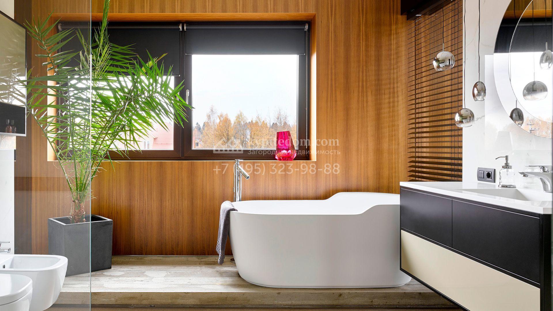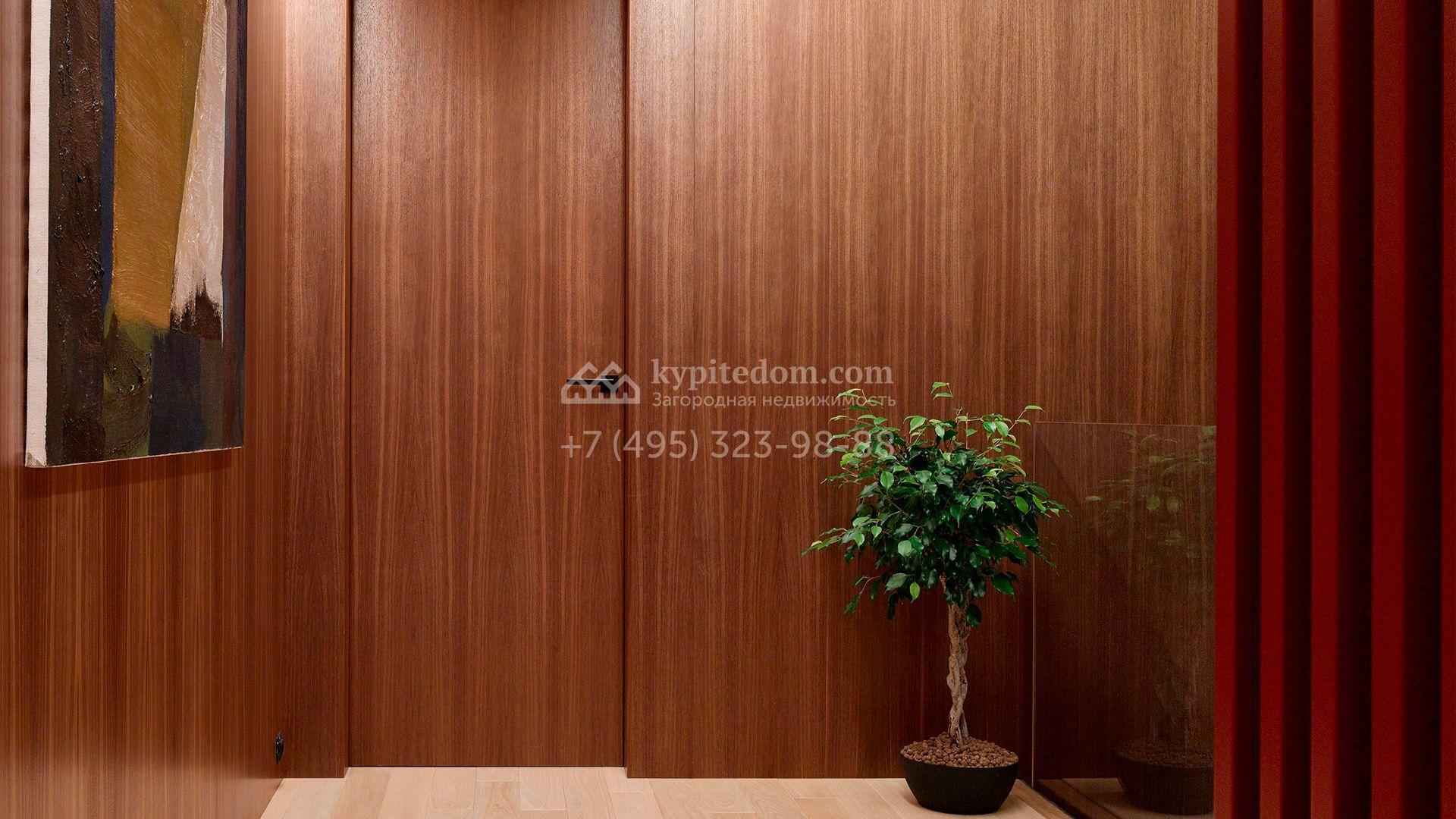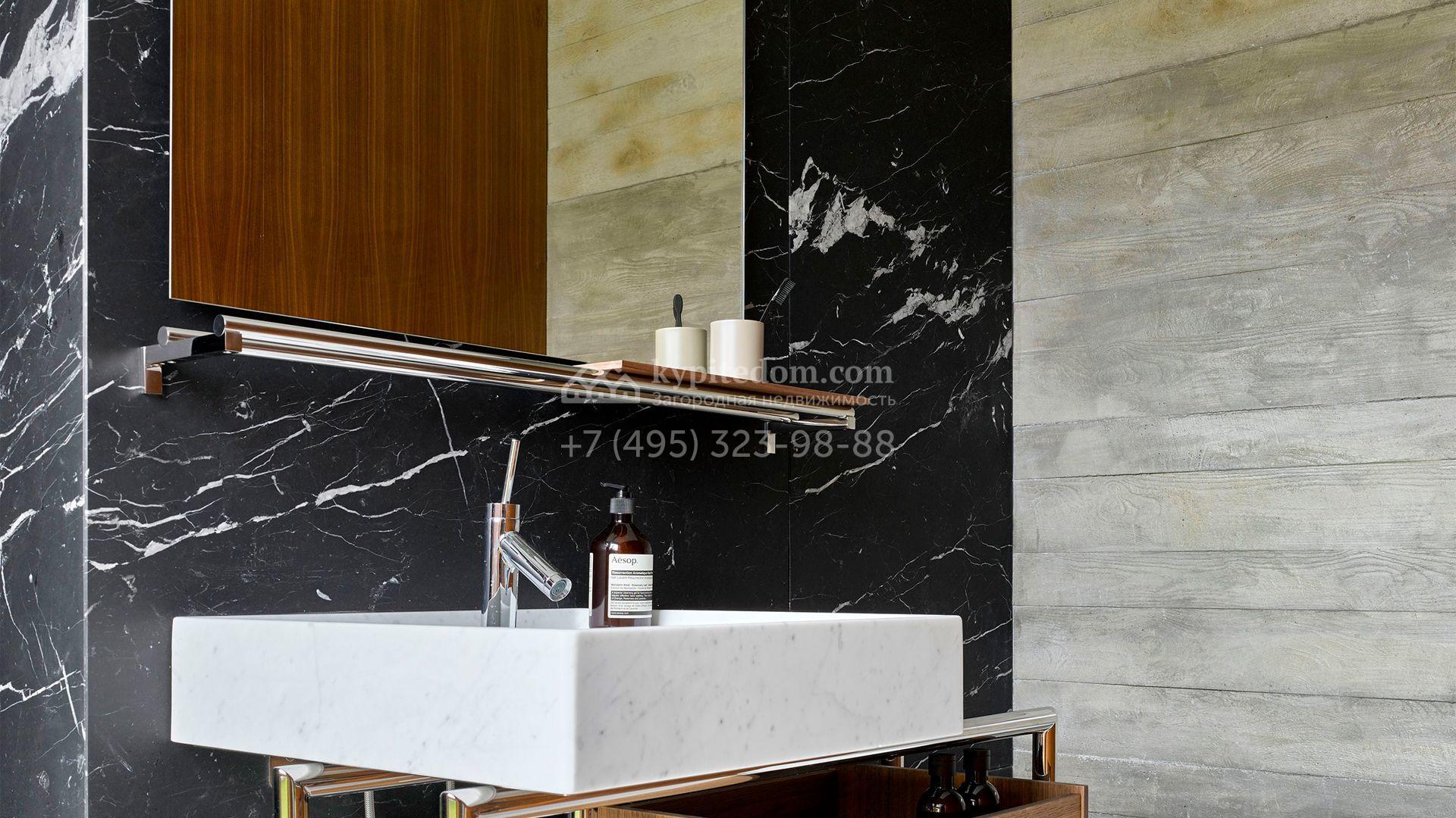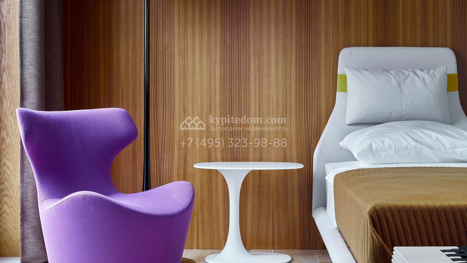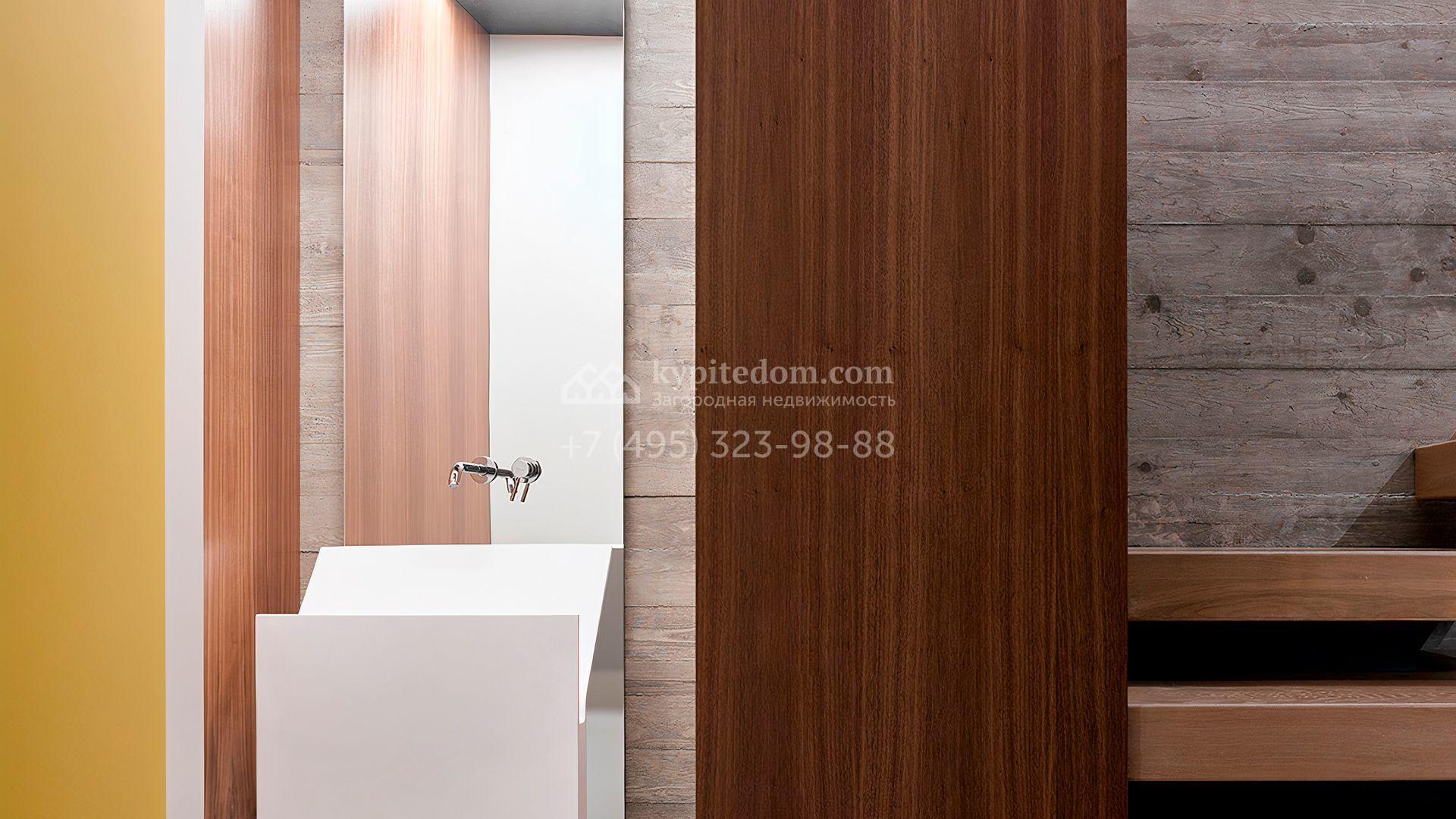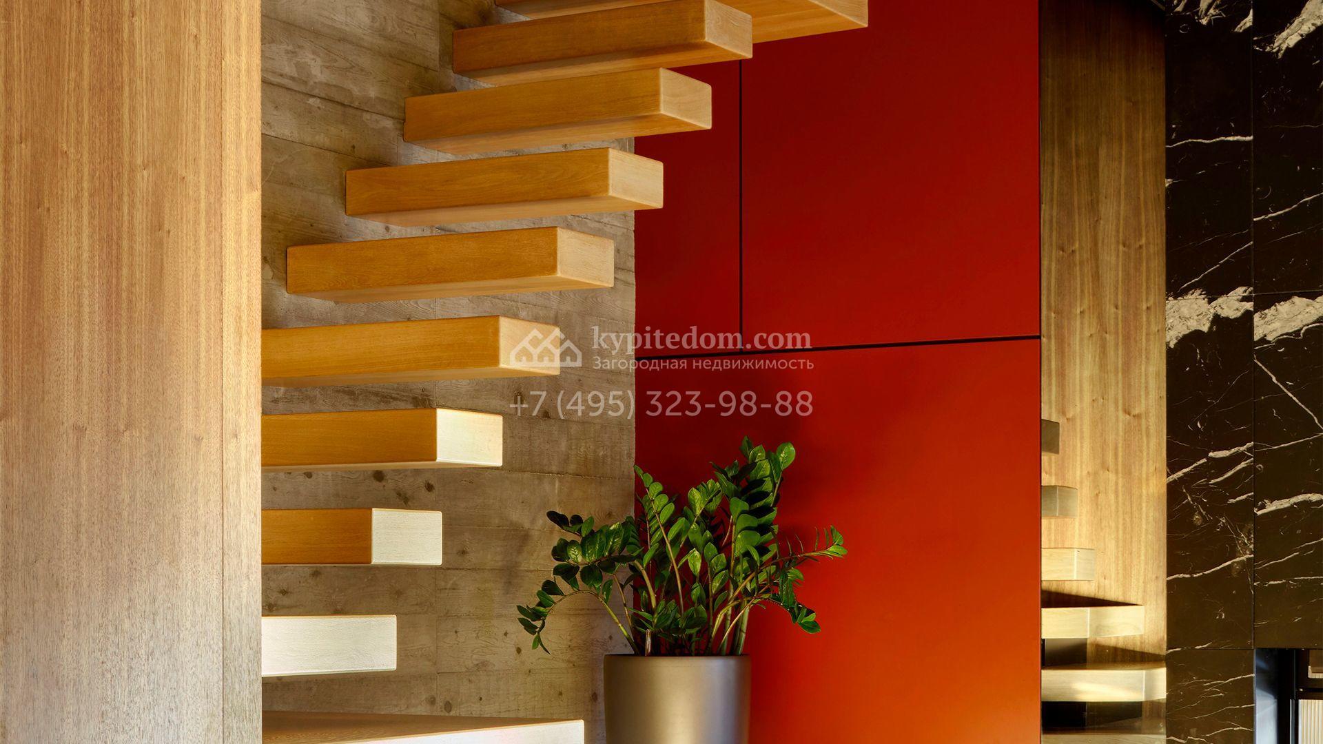 Загородная резиденция с системой «умный дом» площадью 300 м² расположена на участке 16 соток с выходом в лес и к Истринскому водохранилищу. Дом построен по датской технологии Danhaus. На панорамных окнах установлены рольставни. Интерьер выполнен по проекту дизайнера Макса Касимова в приглушенных оттенках в современном стиле. Коттедж полностью меблирован, декорирован коврами и аксессуарами Minotti, Okha, установлена итальянская сантехника. Внутри спланировали 4 спальни, кухню-гостиную с камином и террасу. На территории предусмотрены хозяйственный блок с гаражом, сауна с летней кухней и бассейн с подогревом. На участке вымощены дорожки из гранита, оборудована система полива.